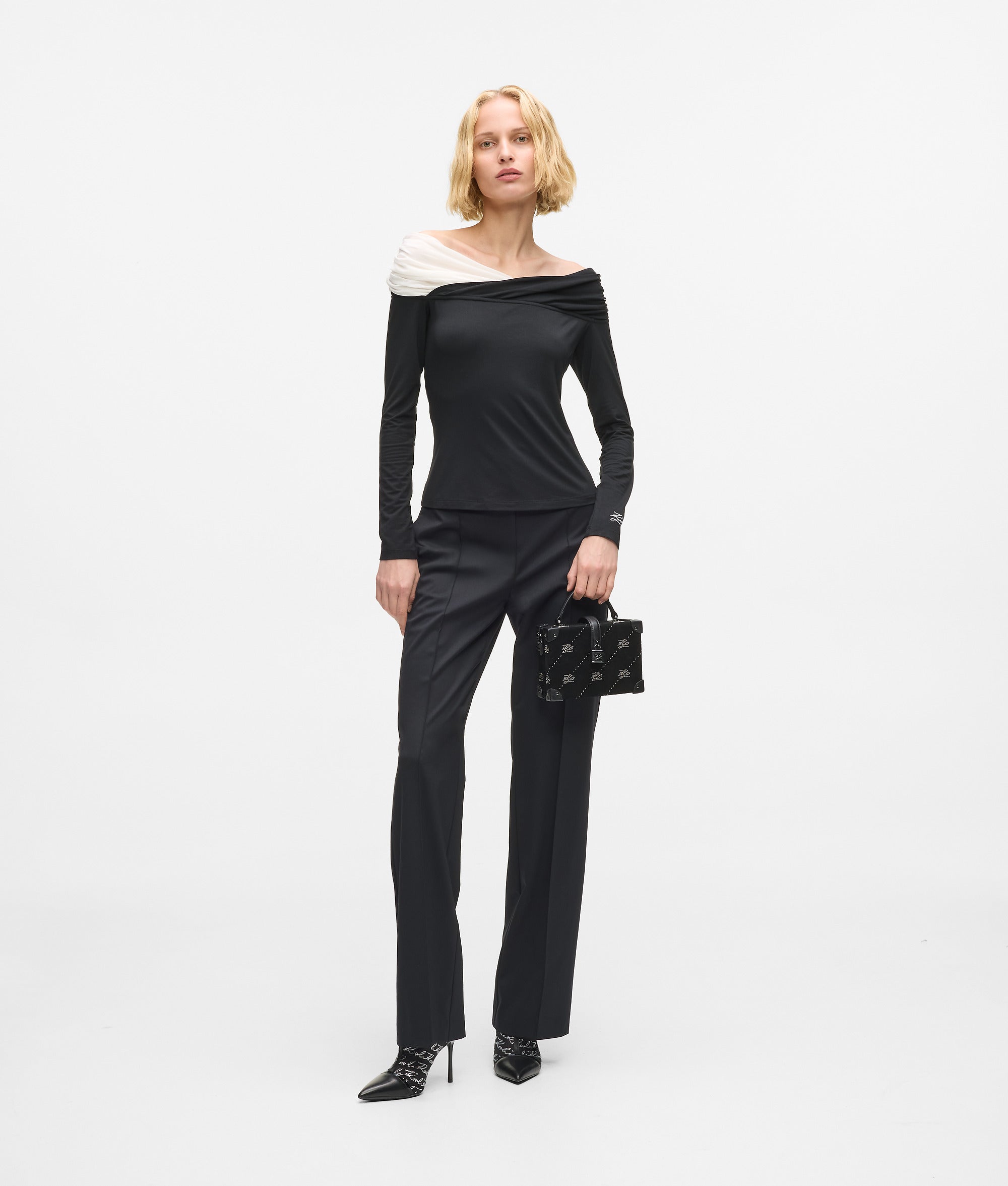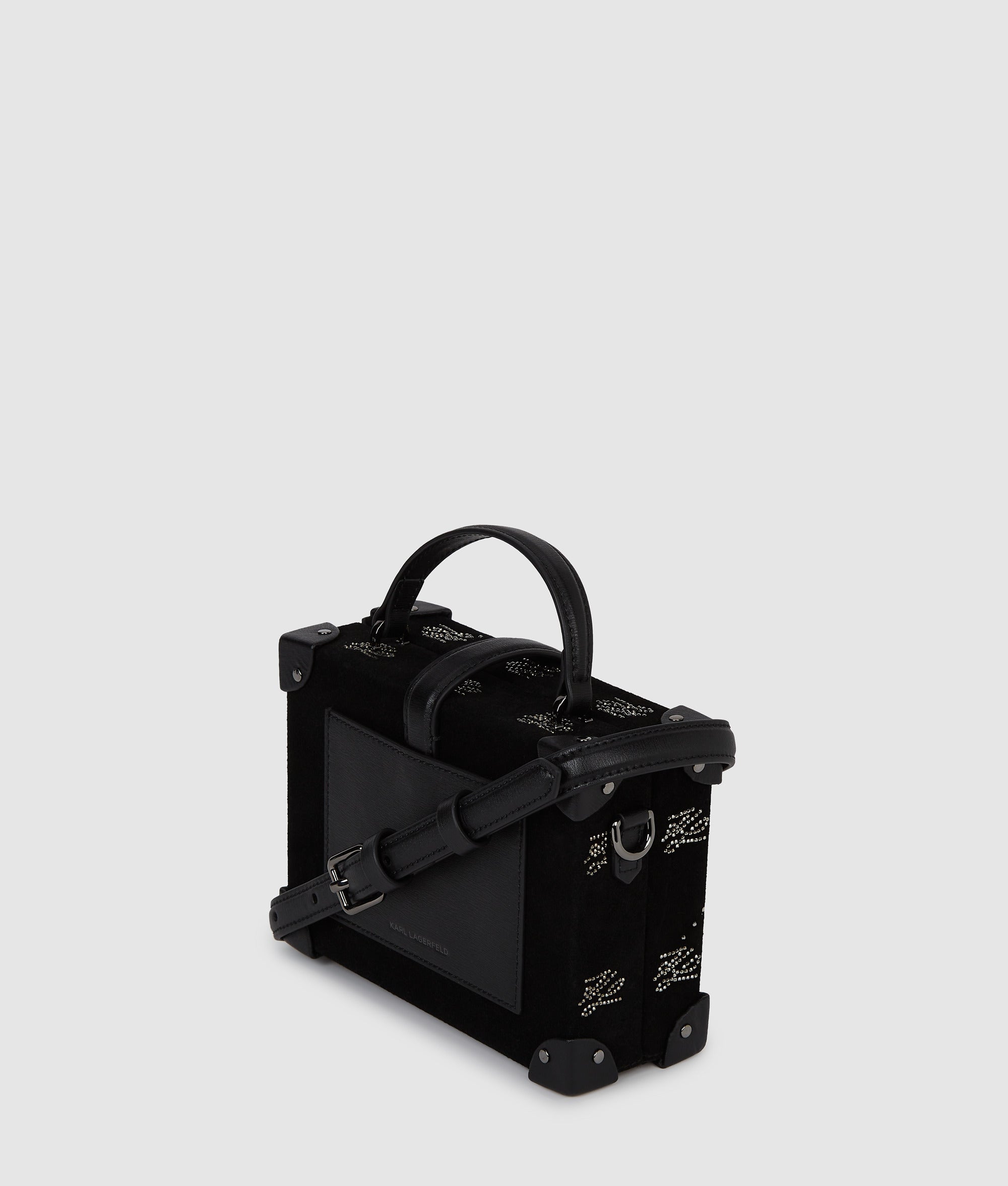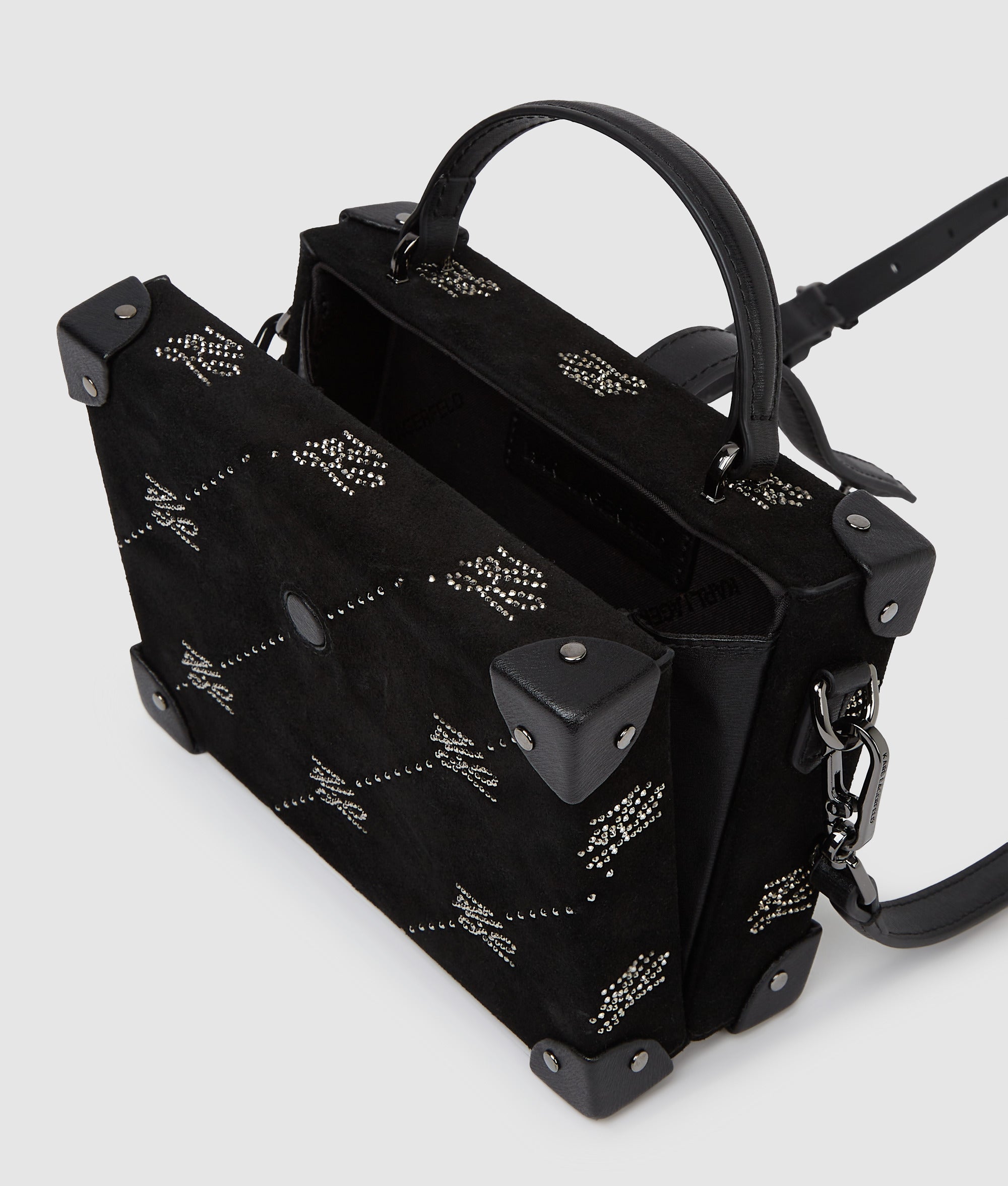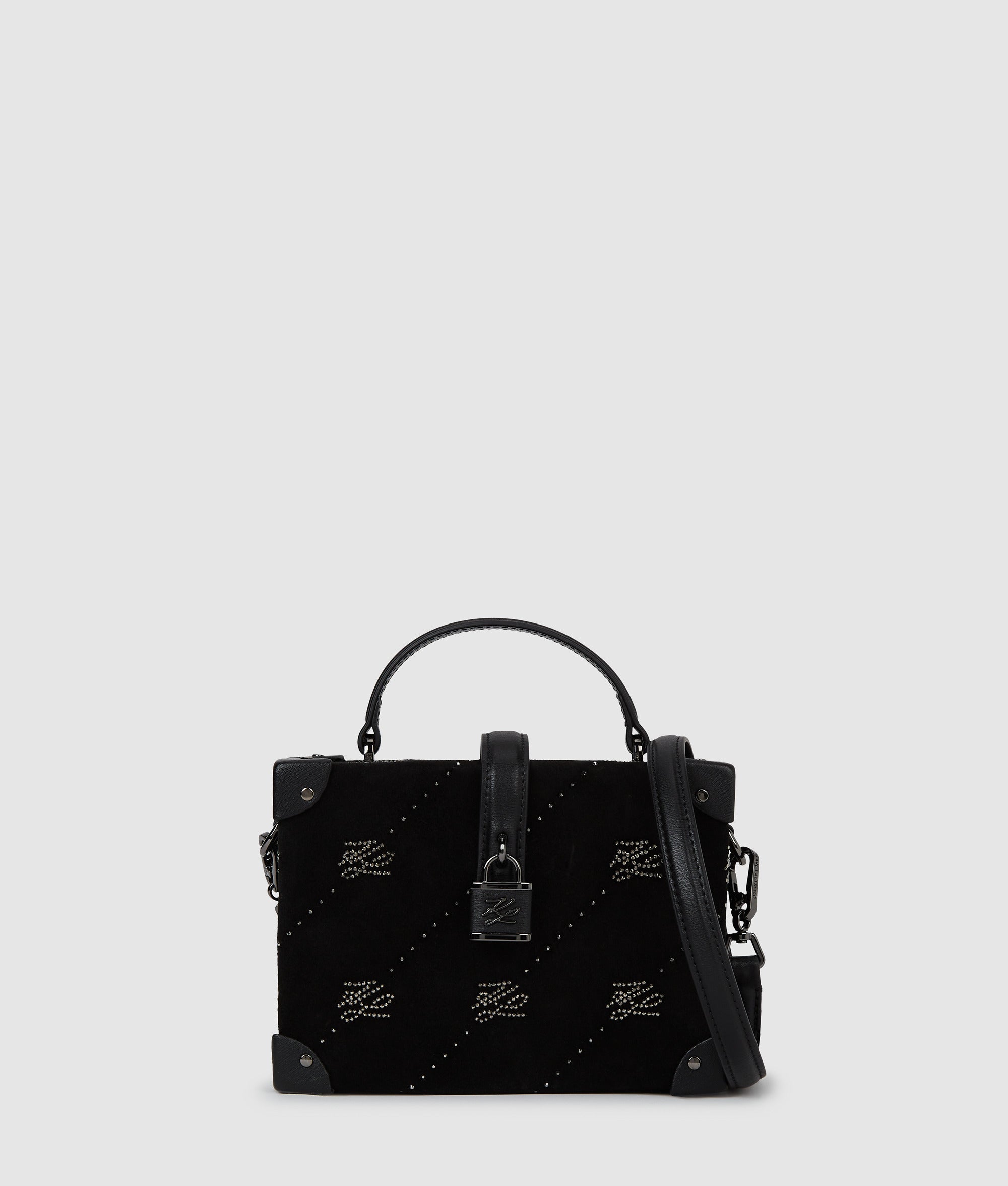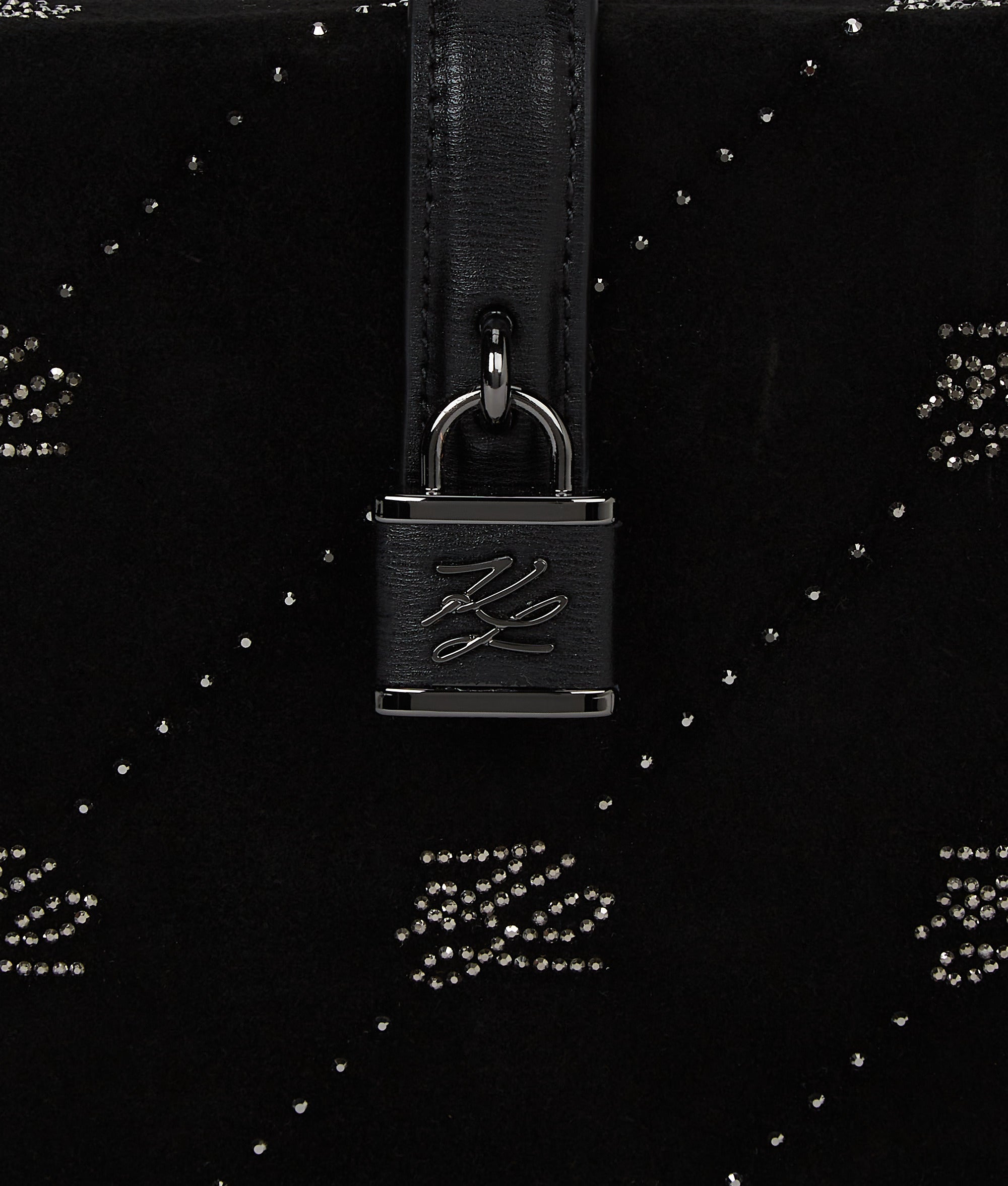 Vintage details meet modern-day elegance in top handle bag, with a soft velvet finish and all-over shimmering rhinestones. Its trunk-inspired silhouette features a delicate Karl Autograph padlock.