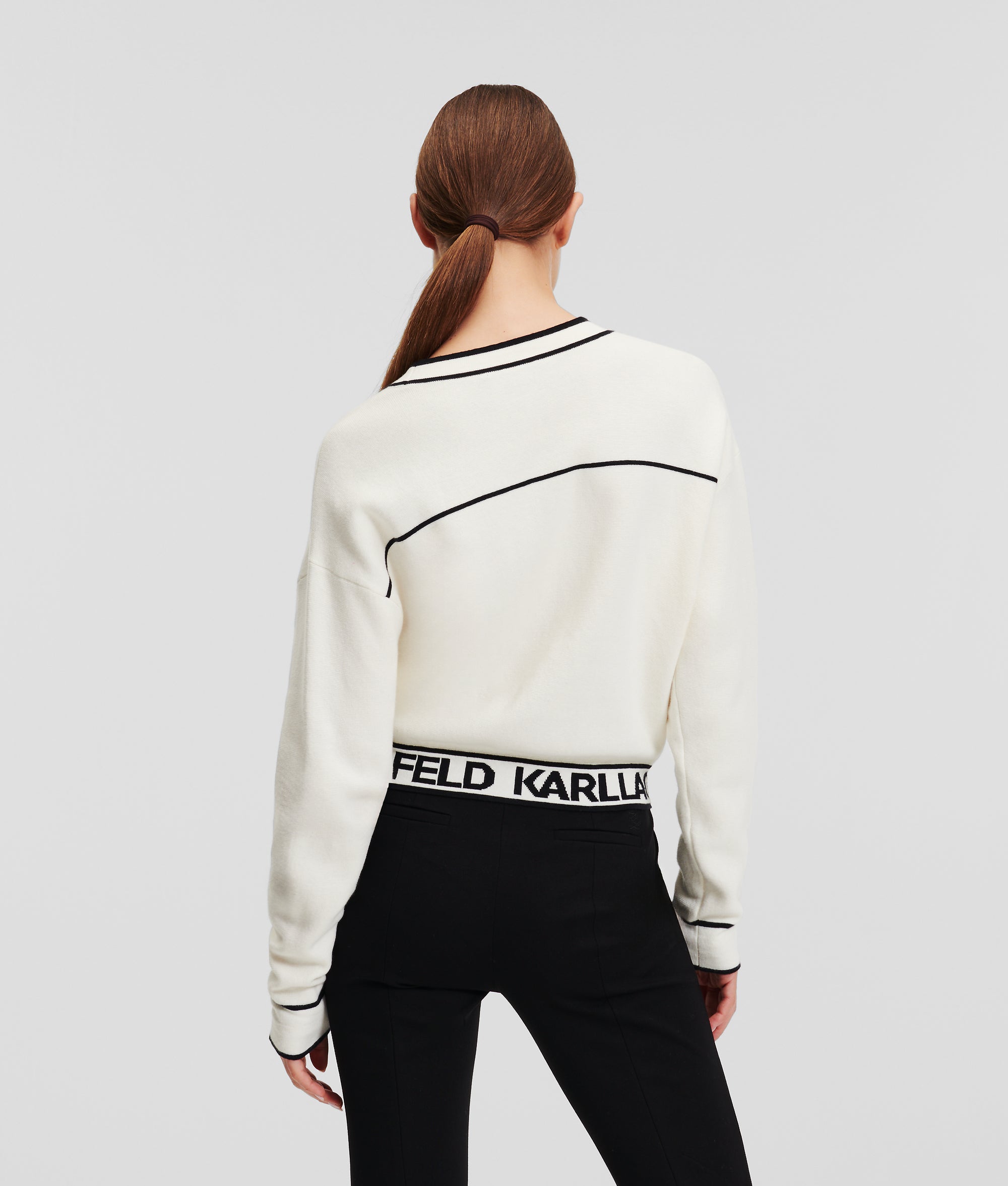 A cinched KARL logo waistband and contrasting piping enrich this cropped-length cardigan. The preppy style is made from a soft wool blend and features twin pockets at the front chest.