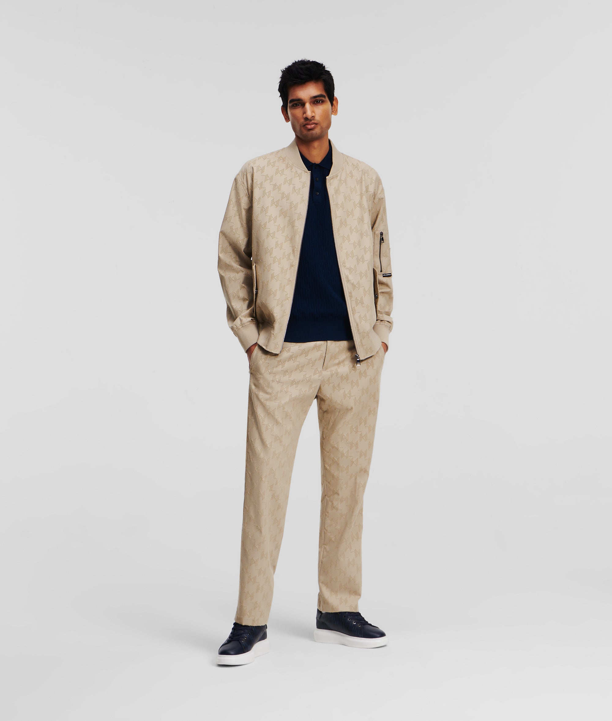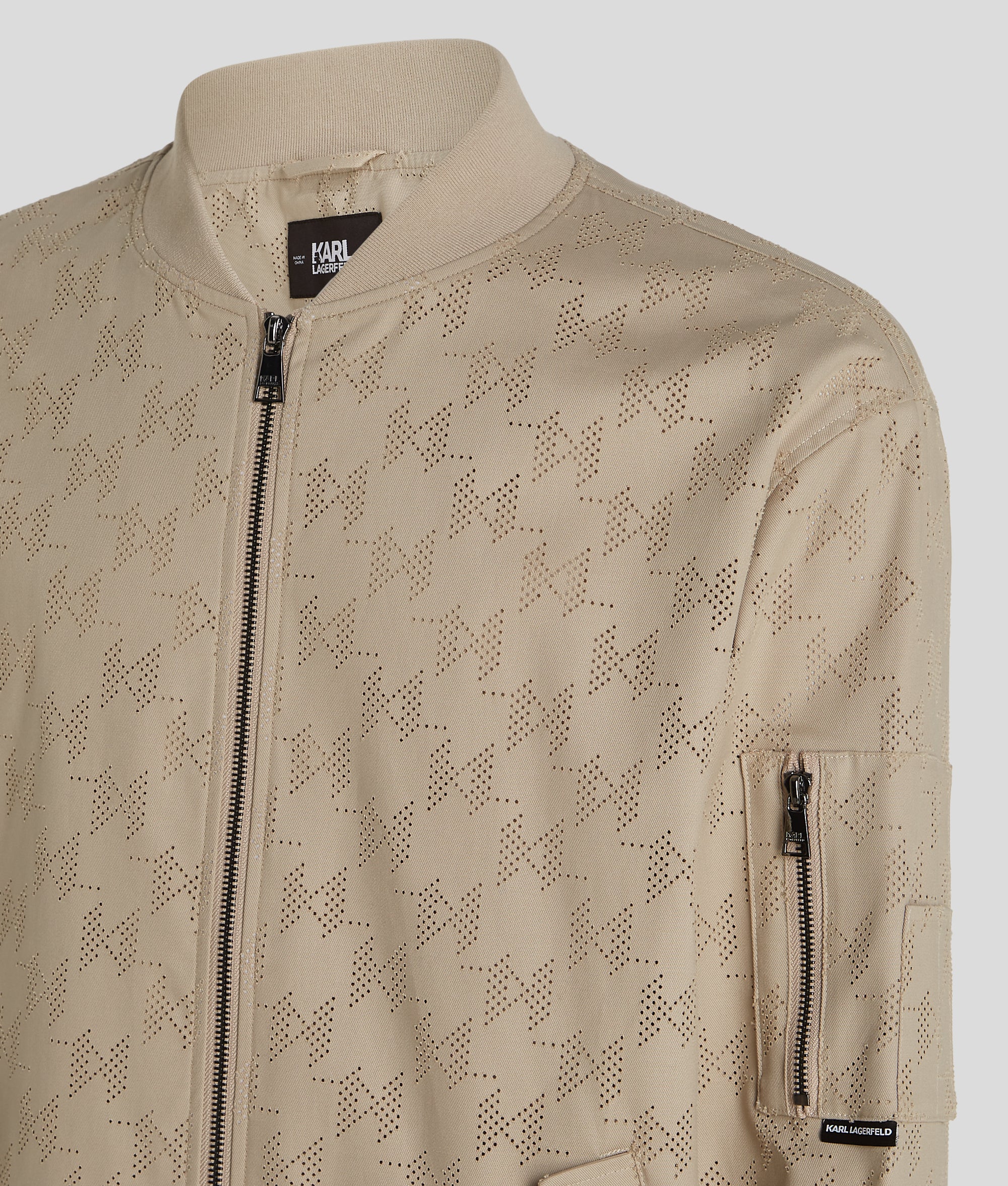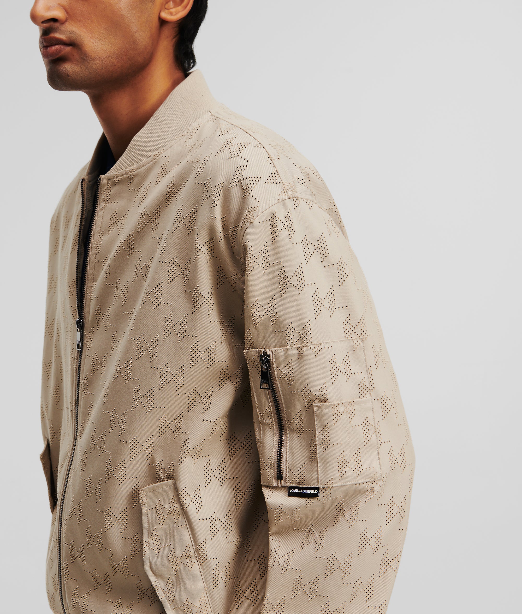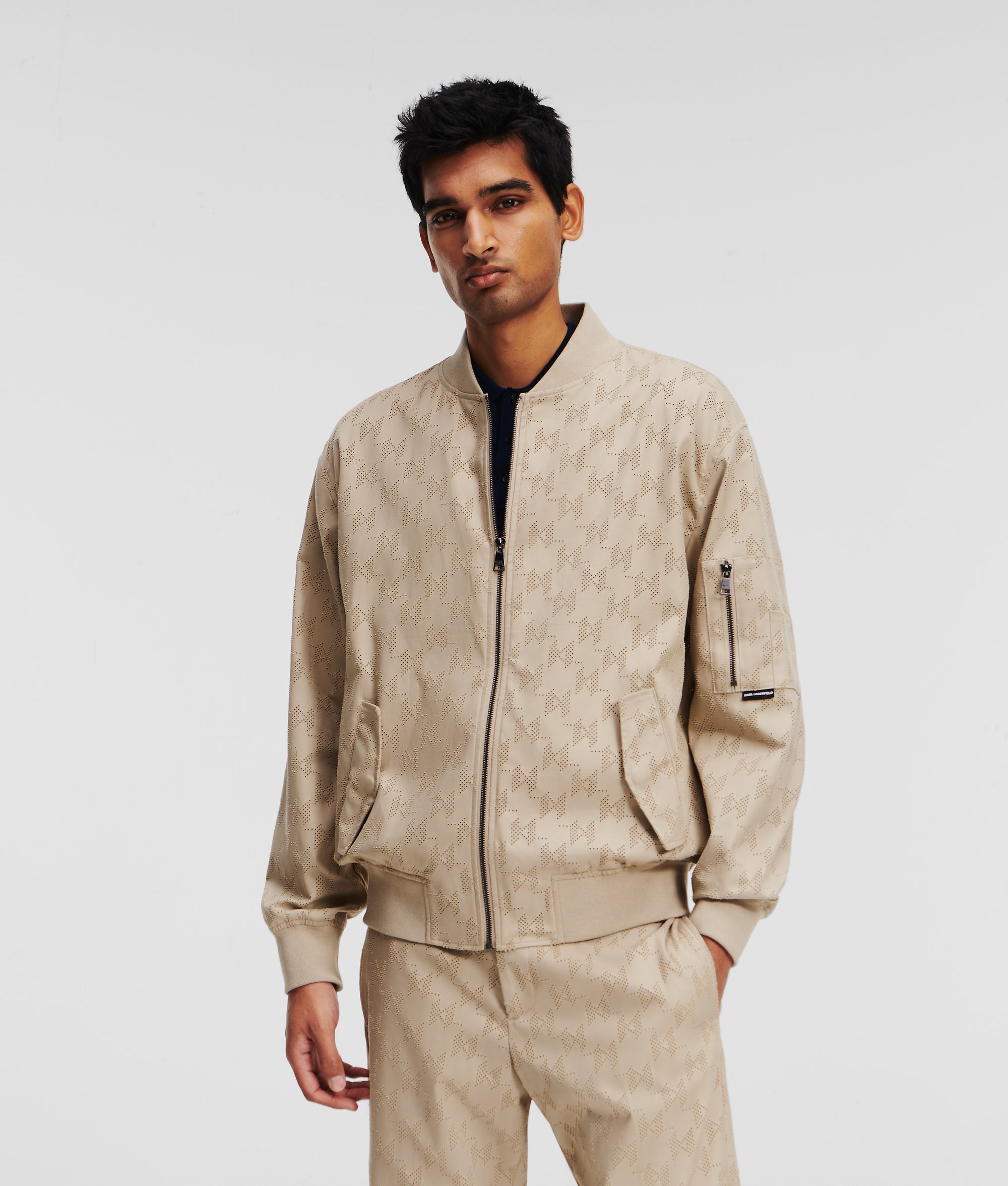 Channeling '80s streetstyle, this statement-making bomber jacket has been hand-picked by KARL Design Director Hun Kim as a hero piece for the season. The classic silhouette features a lightweight cotton construction and is enriched with an all-over monogram motif in a perforated finish for a quintessential KARL aesthetic.