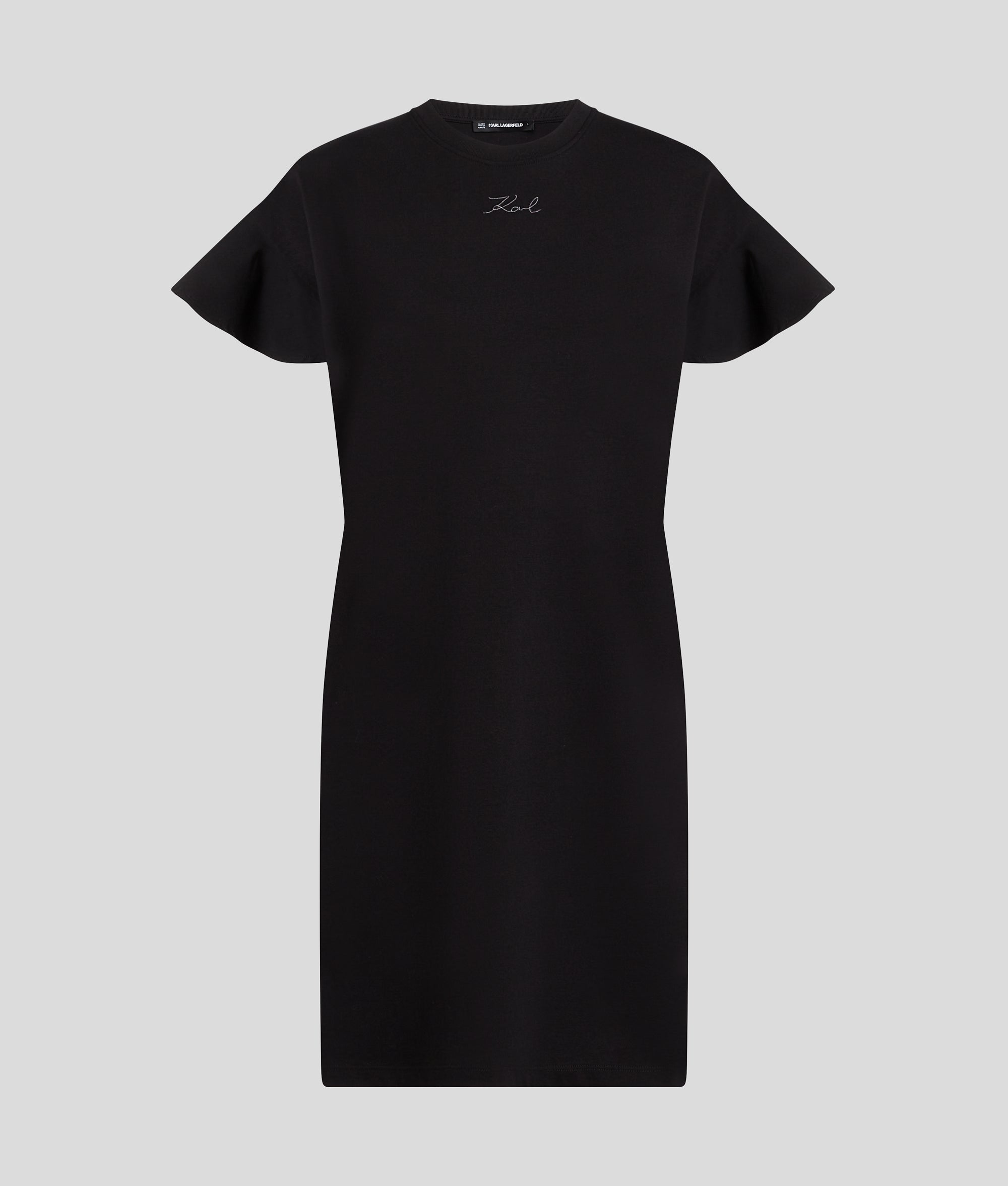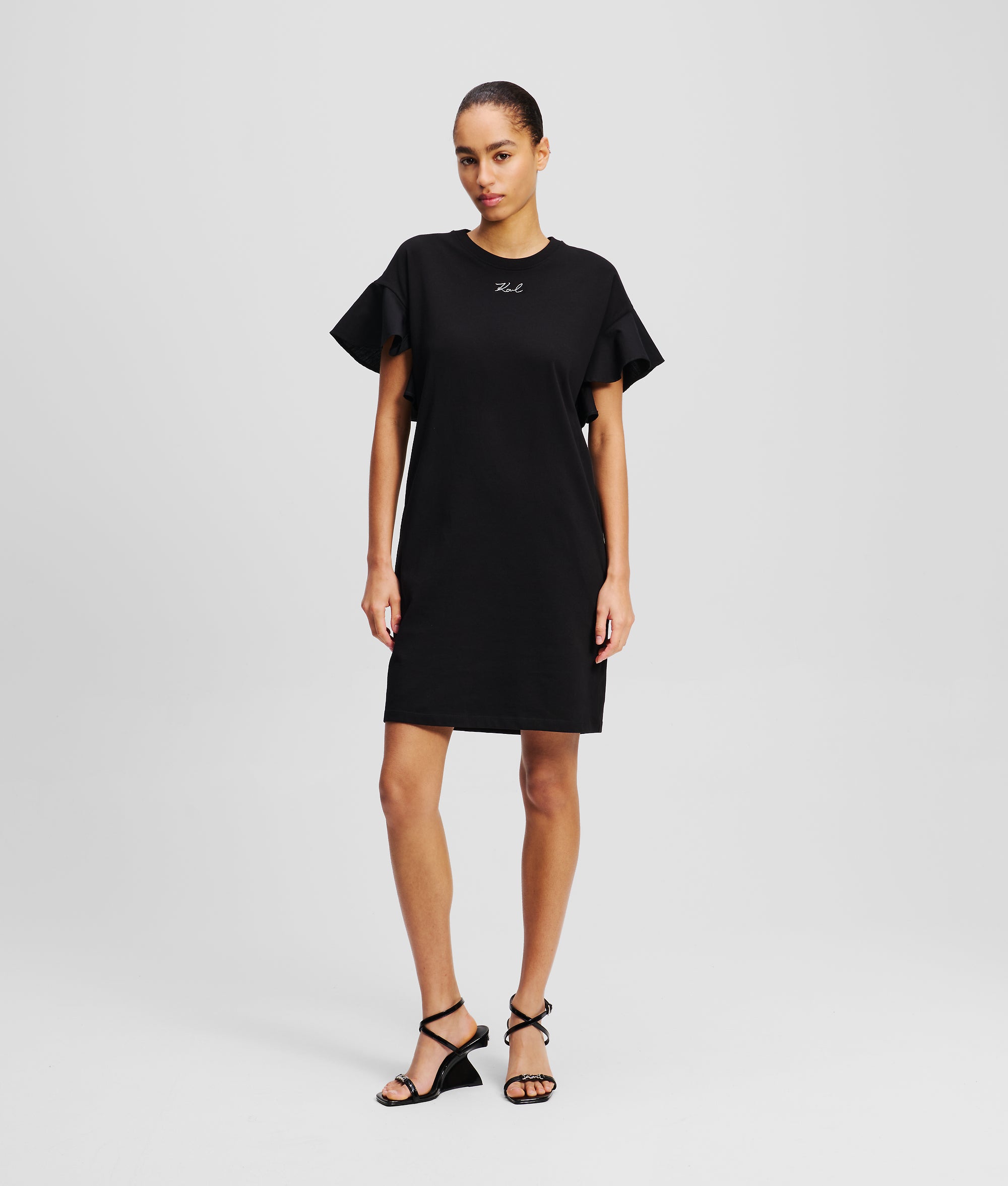 A playful fusion of comfort and style, this T-shirt dress features a classic ribbed crew neck and charming short sleeves adorned with poplin ruffles. The KARL Signature logo adds a chic finish, making it a standout piece for effortless everyday wear.