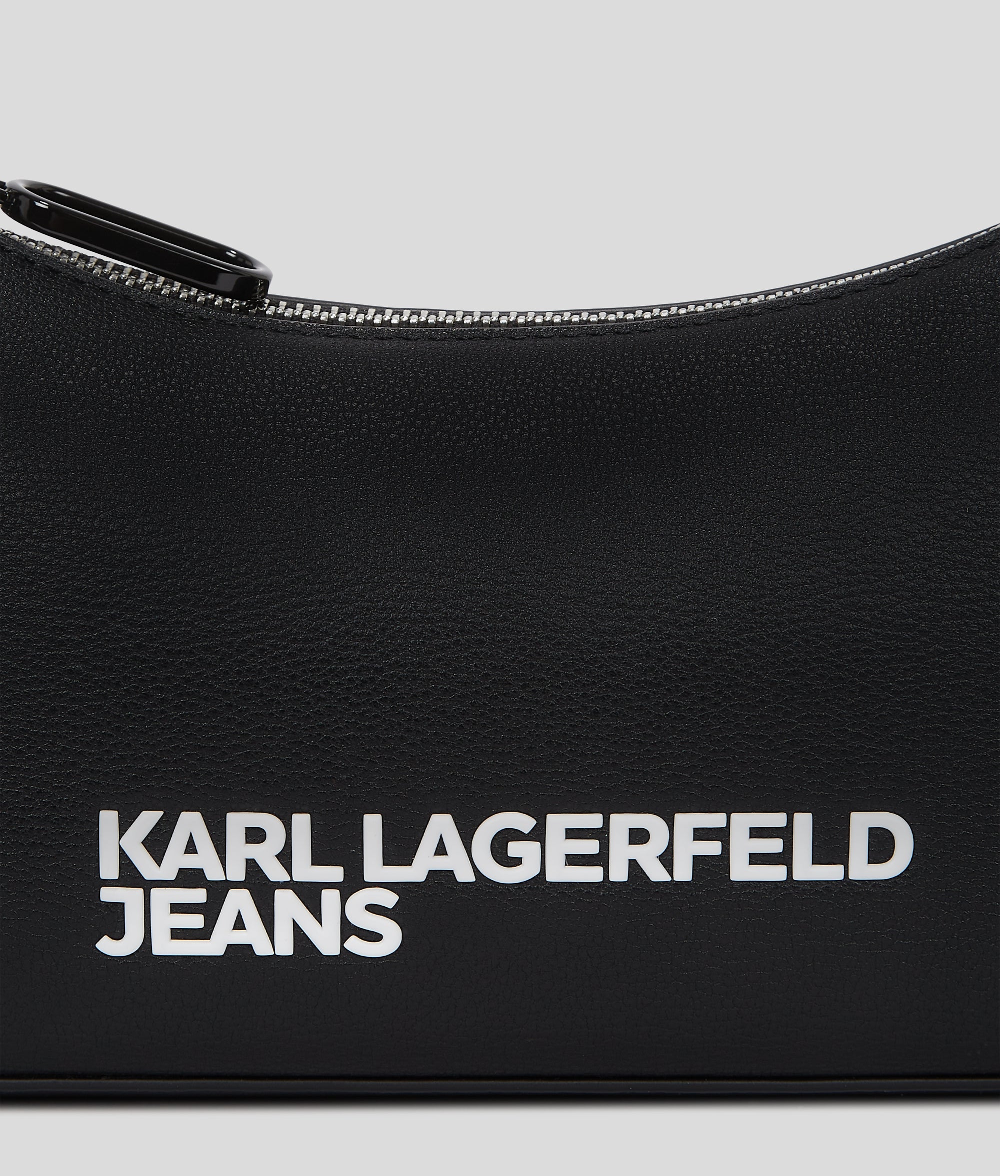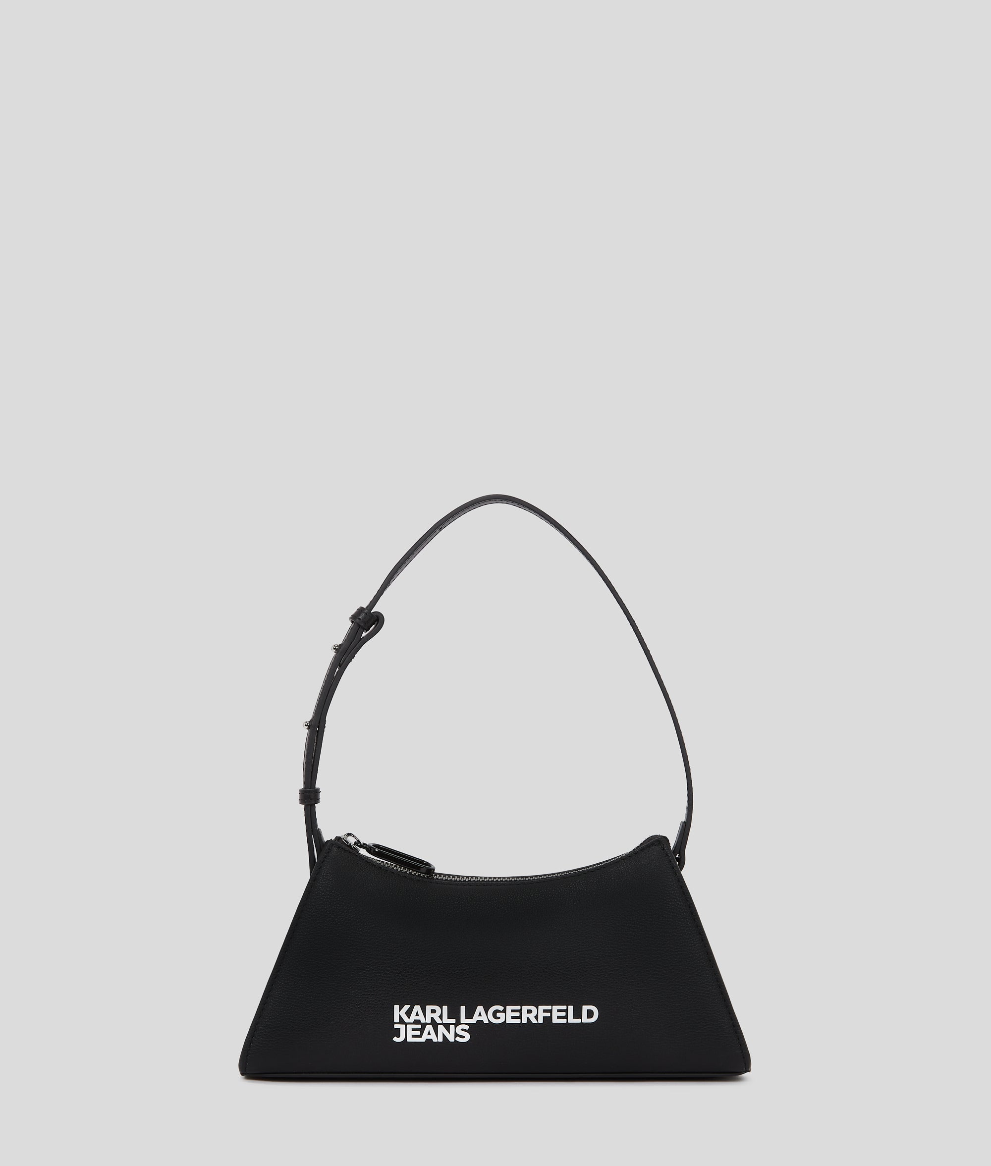 An edgy geometric silhouette defines this small shoulder bag, perfect for adding a uniquely bold touch to any outfit. The zip-top opening features a distinctive oval pull, while an adjustable strap allows for personalized styling. The statement KARL LAGERFELD JEANS logo completes the standout piece.
