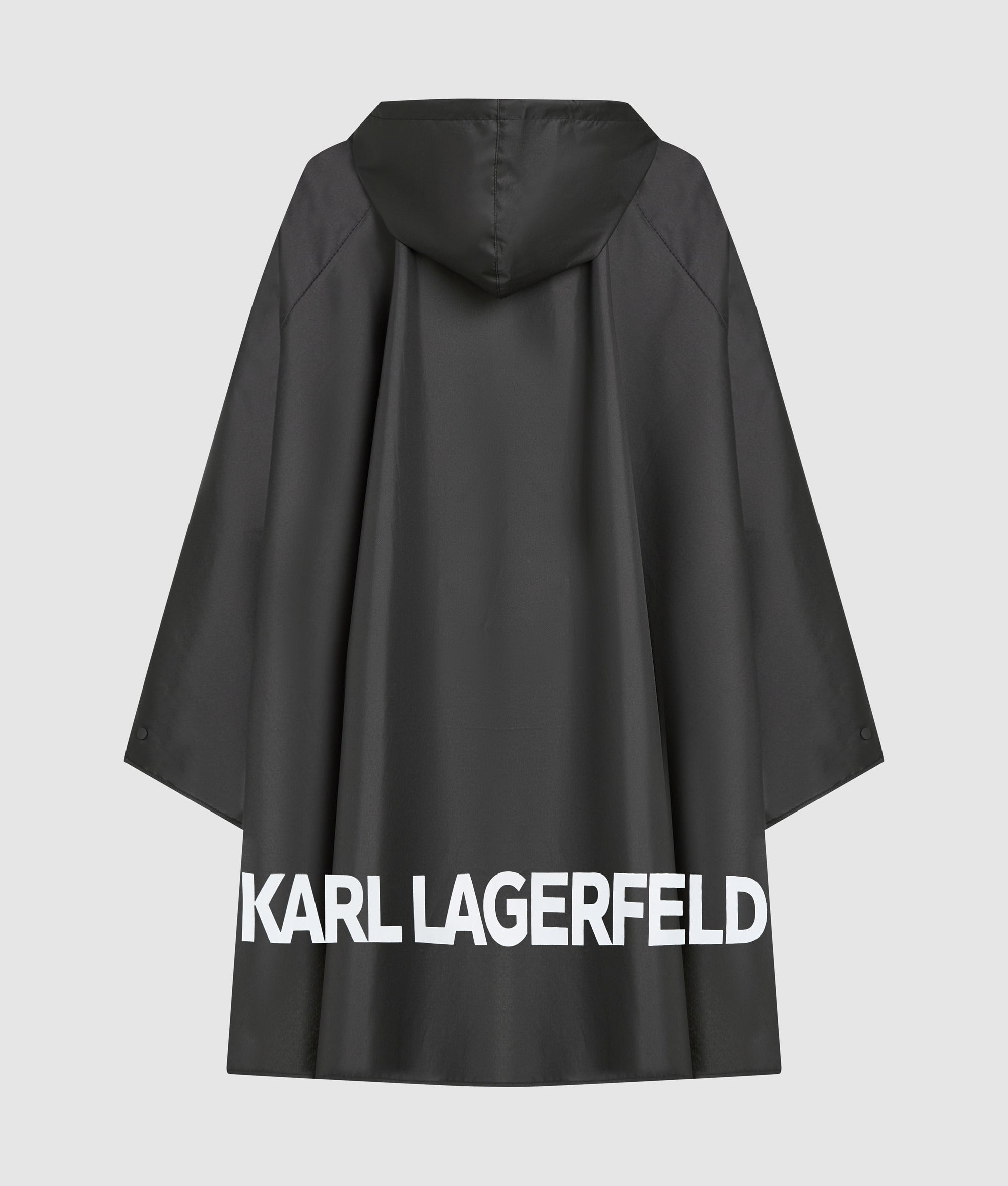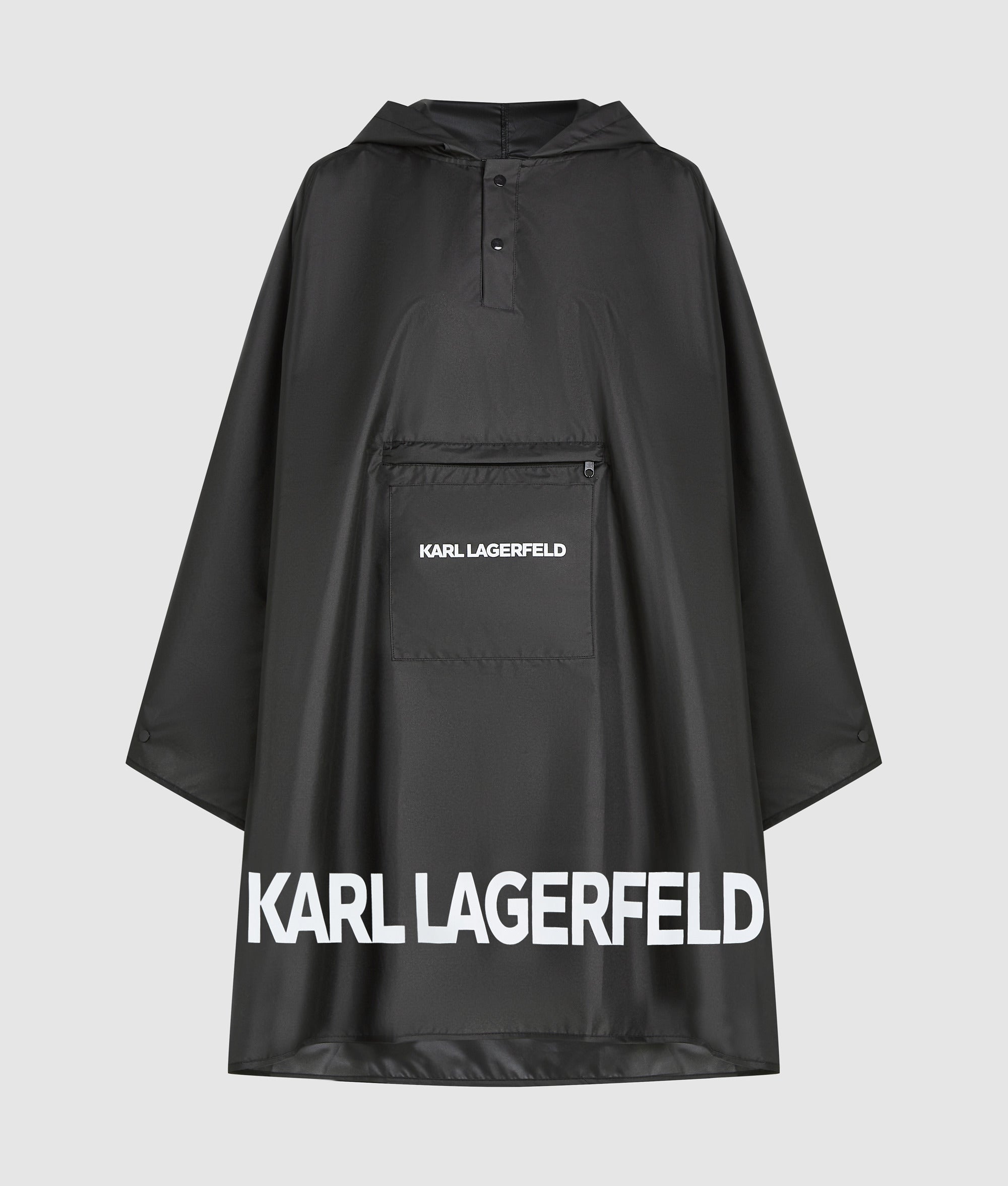 Perfect for the changing seasons, this long, roomy poncho is crafted from a lightweight, water-resistant fabric. Featuring a press button placket and a hood, it offers both style and practicality. The front pocket cleverly transforms into a compact case, while the bold KARL LAGERFELD logo at the hem adds a touch of flair.