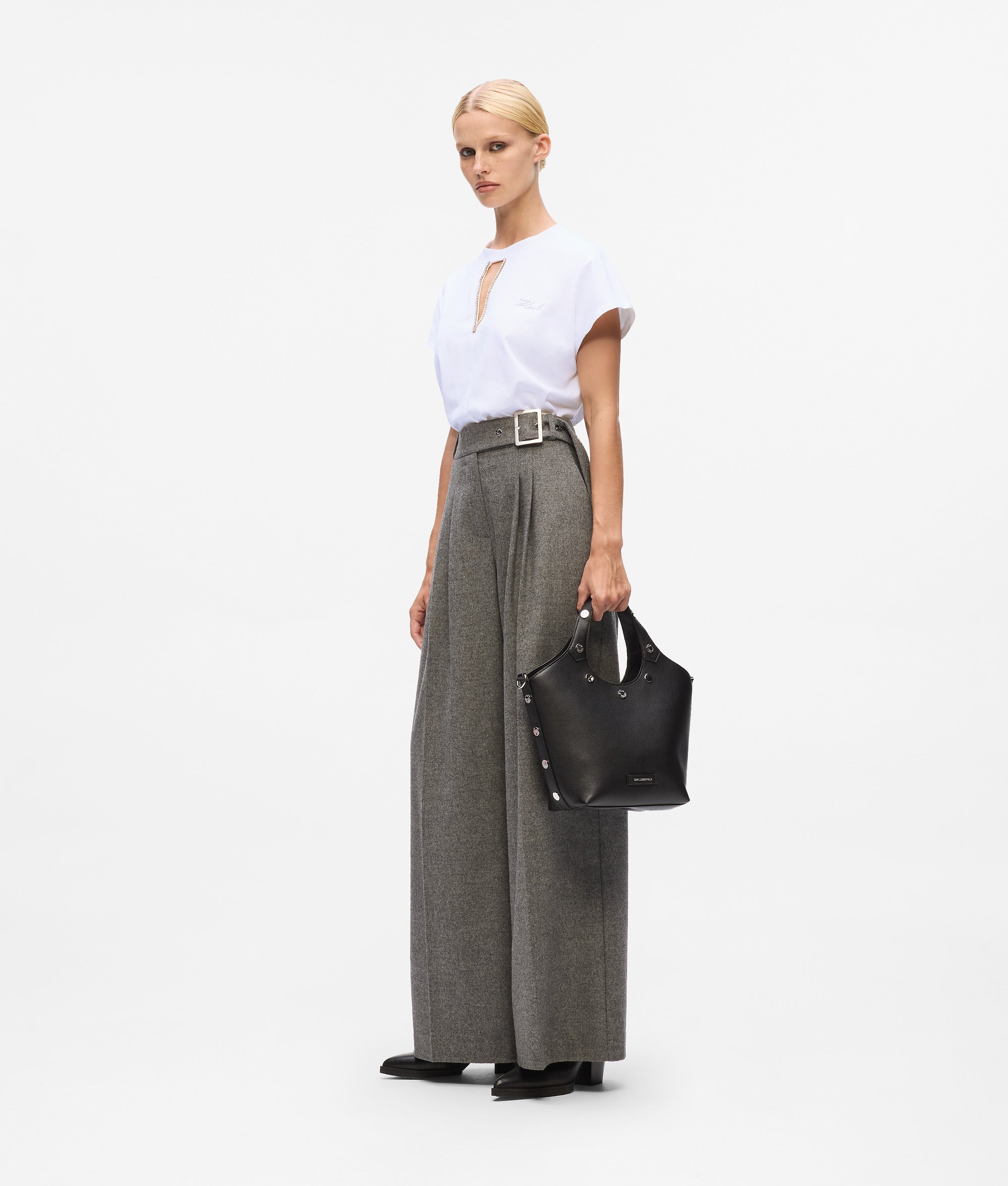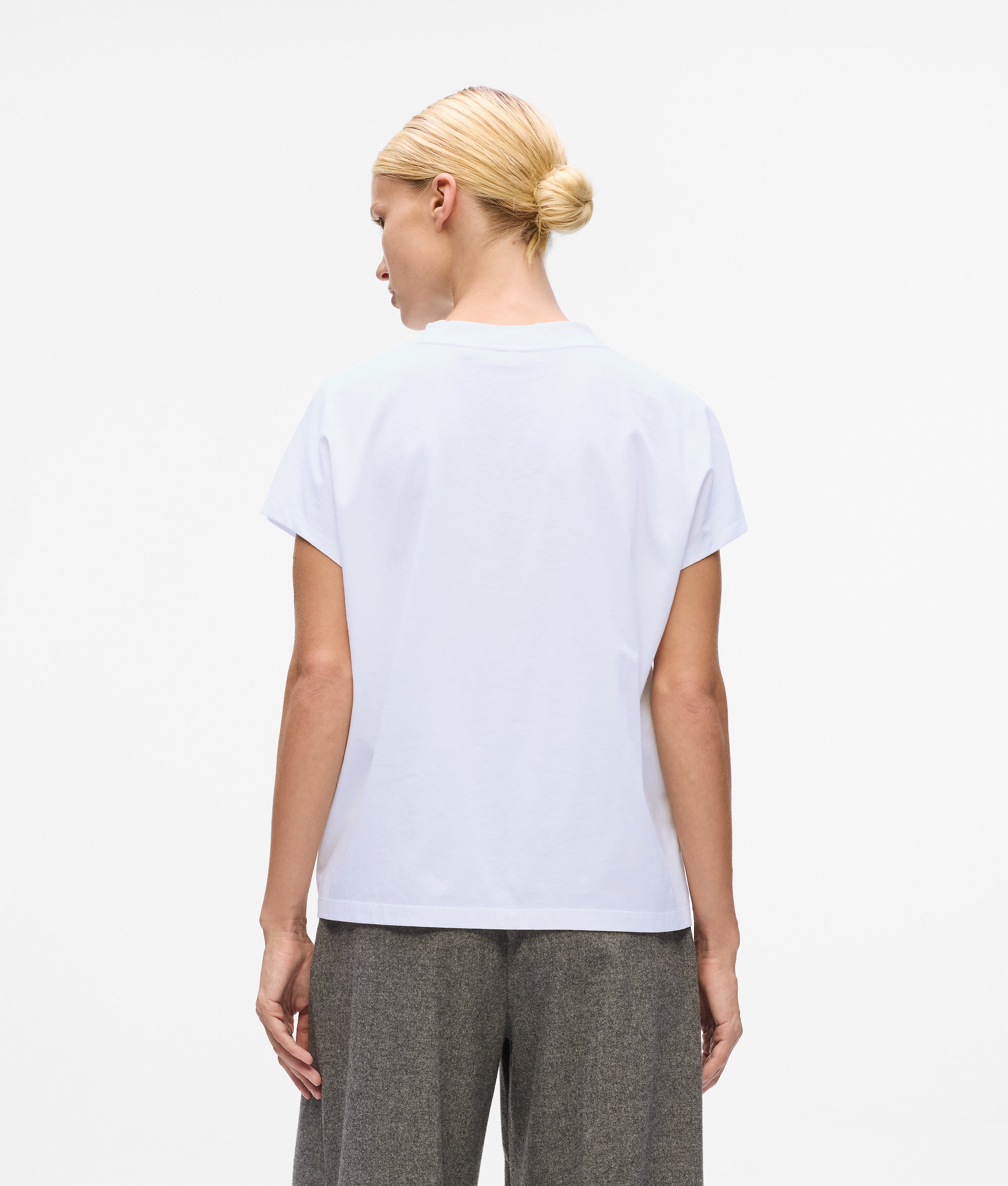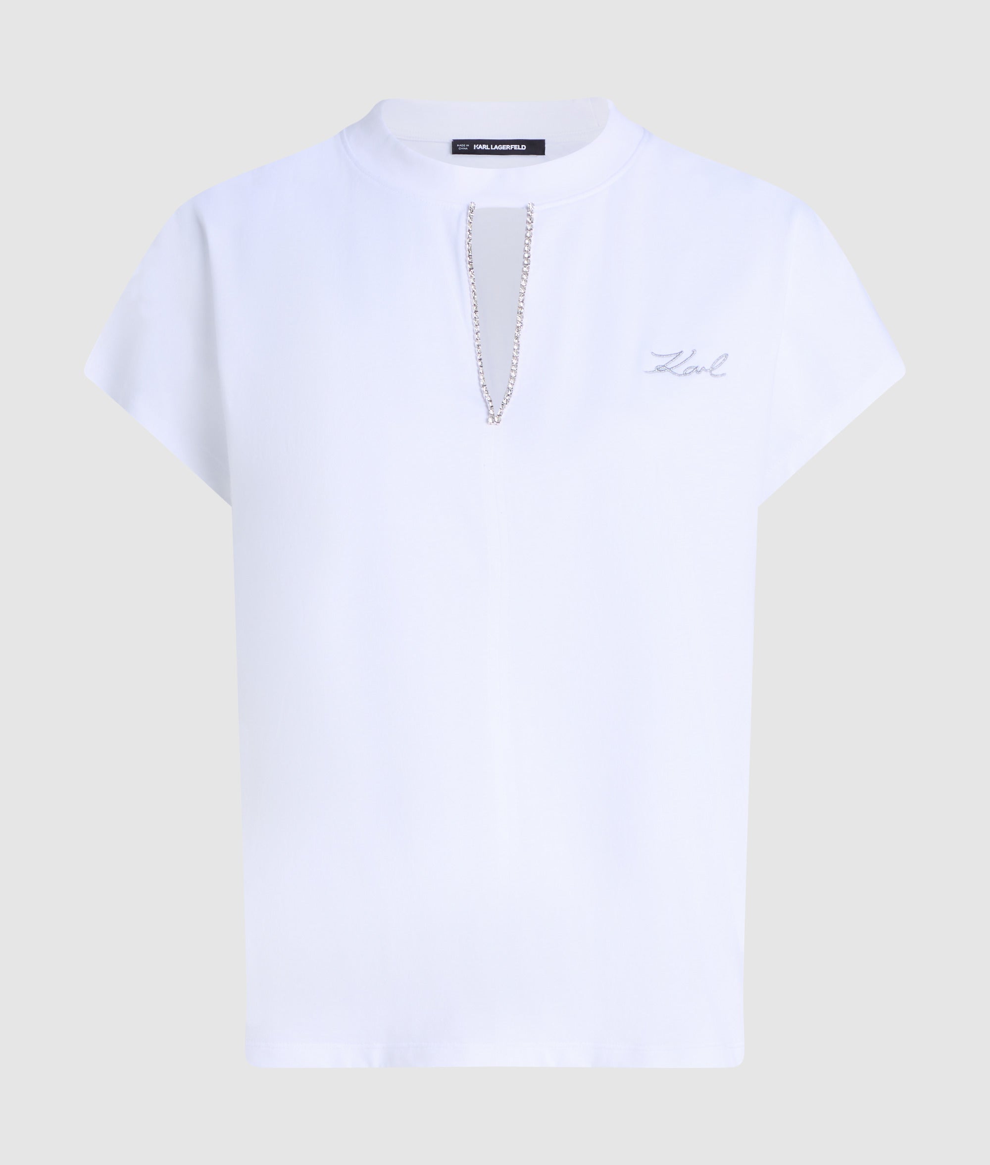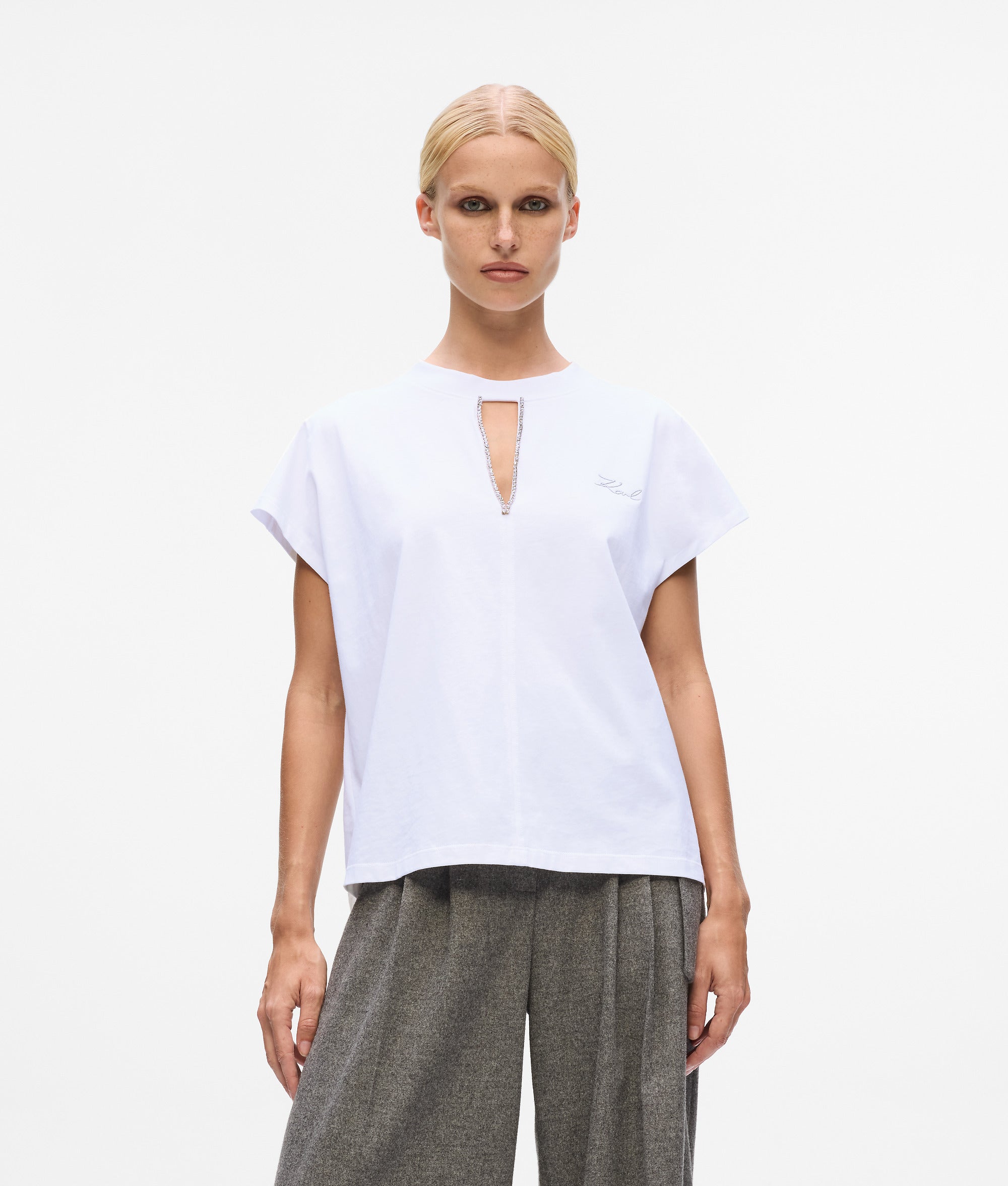 A bold, boxy T-shirt made from soft organic cotton, featuring a striking triangle rhinestone cutout at the chest and a sleek silver logo embroidery—perfect for making a statement.