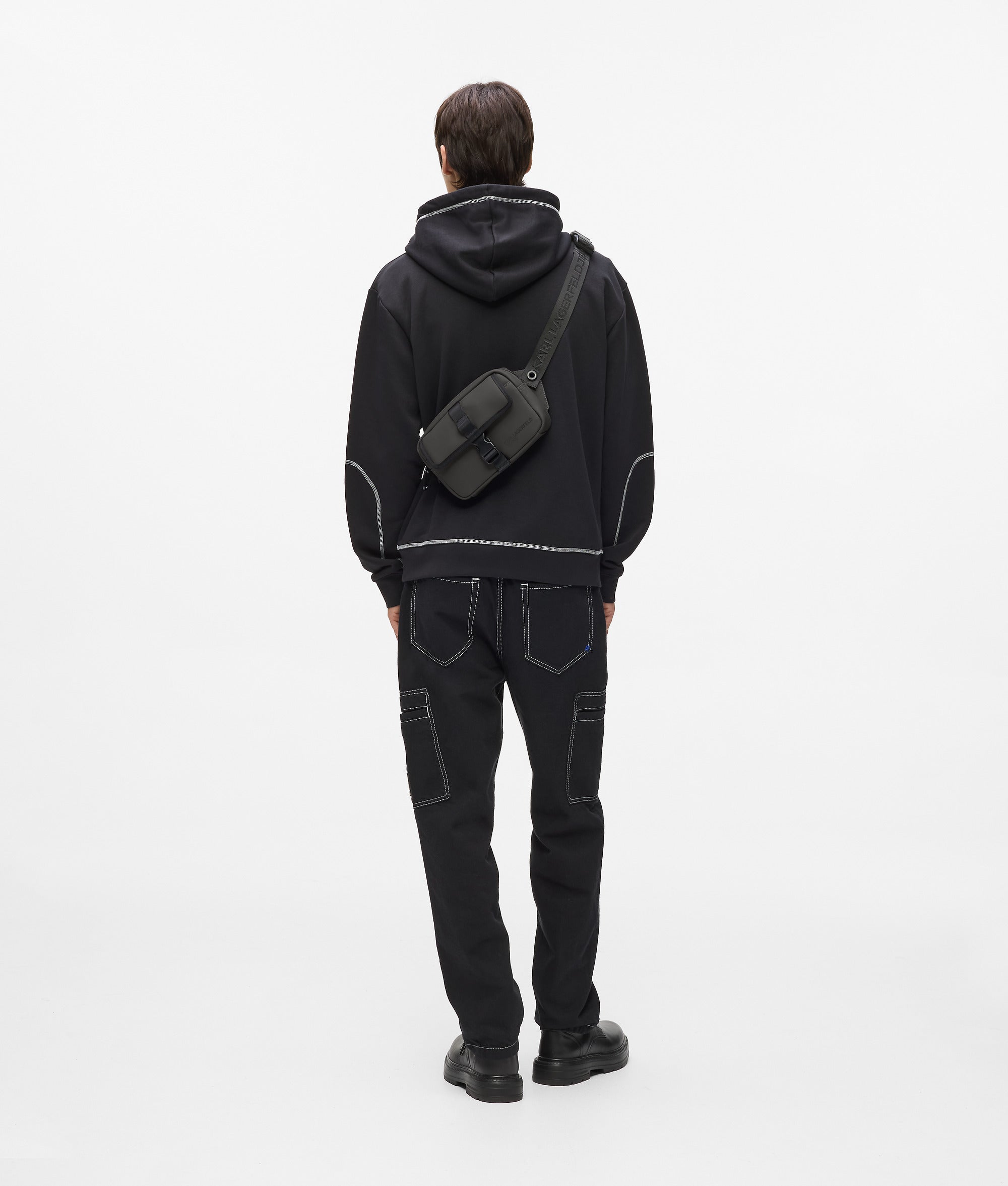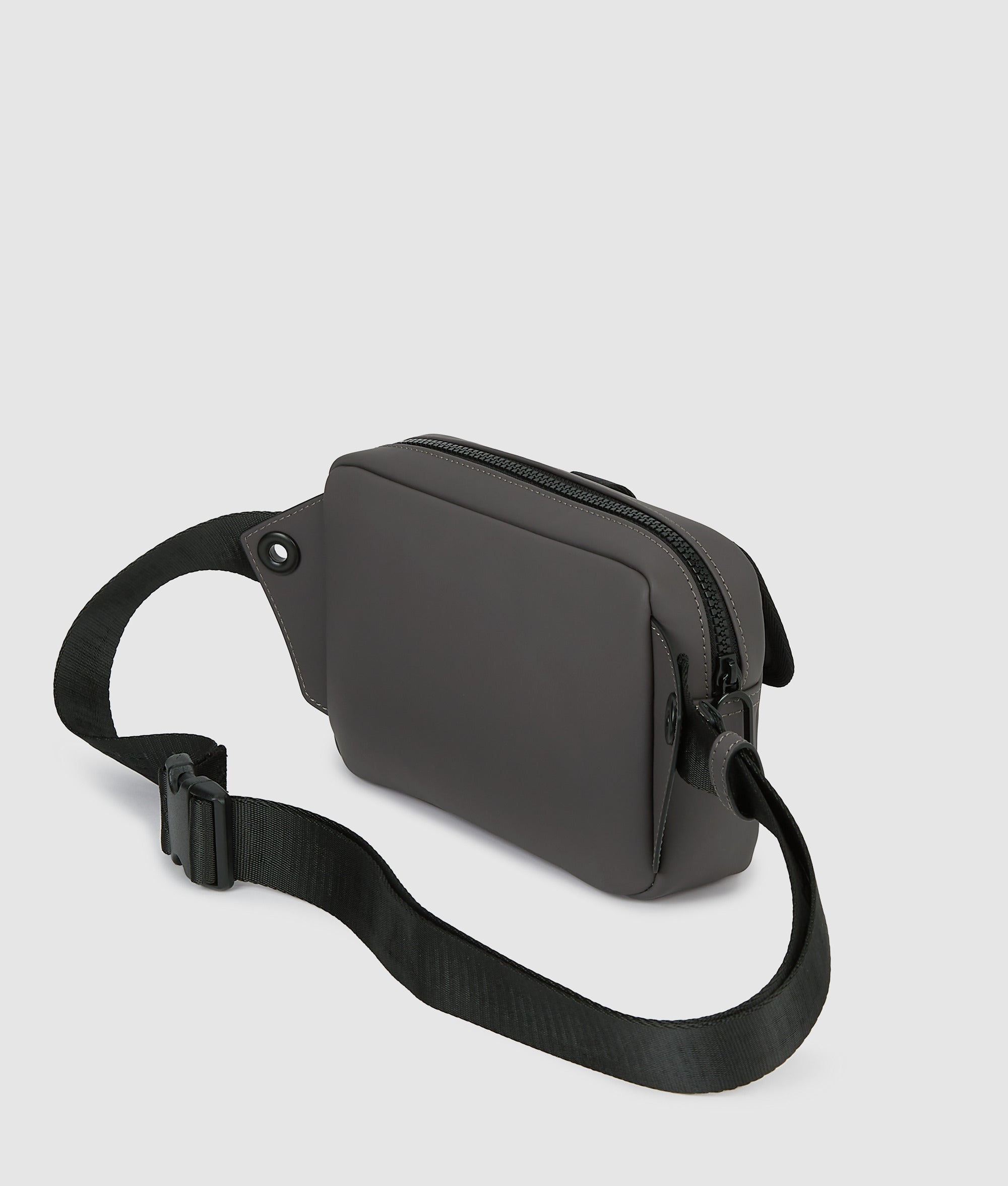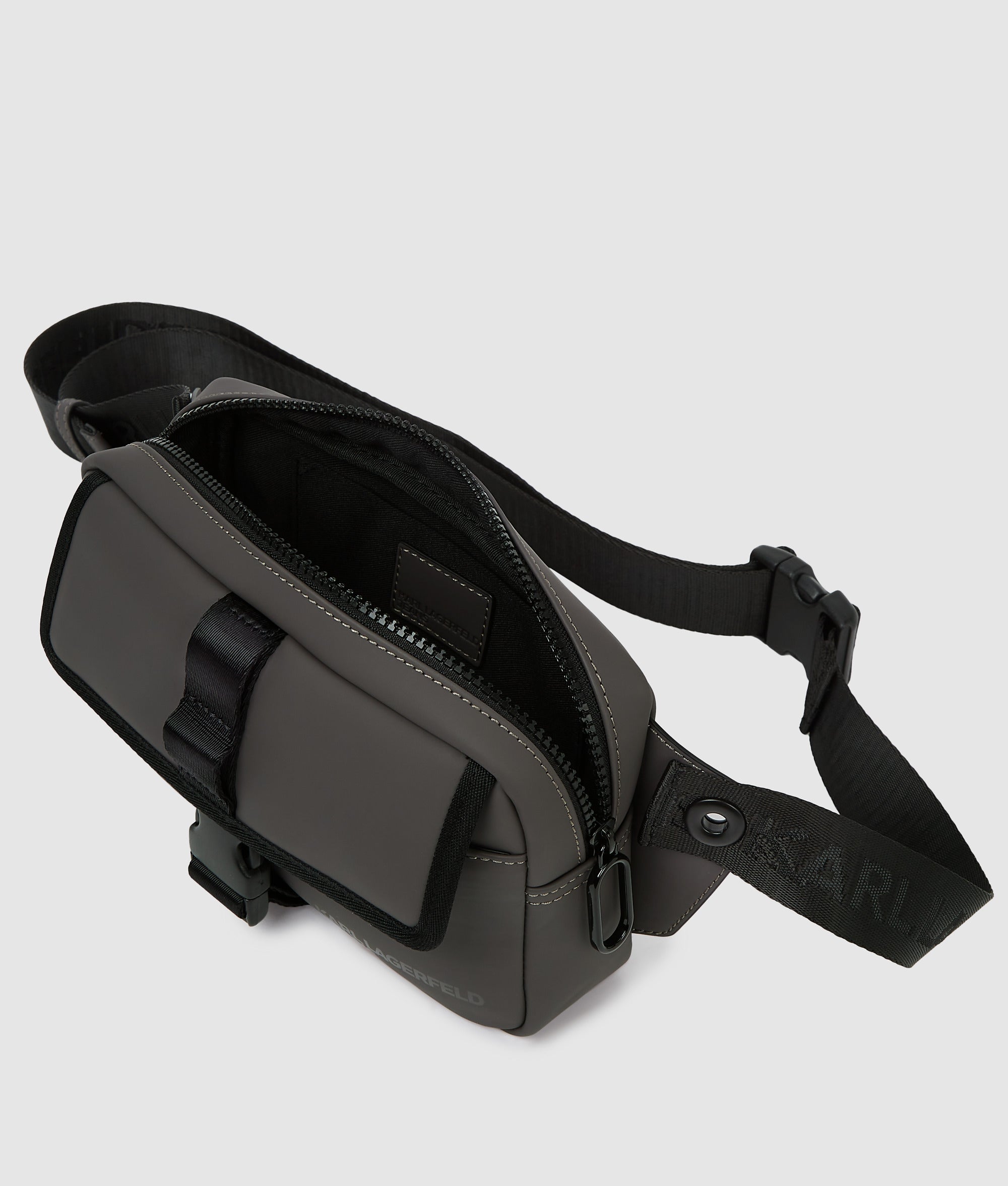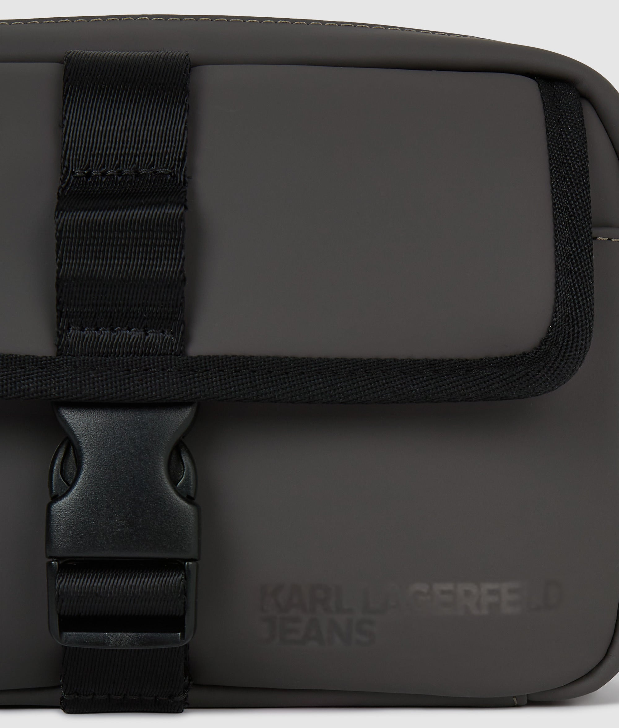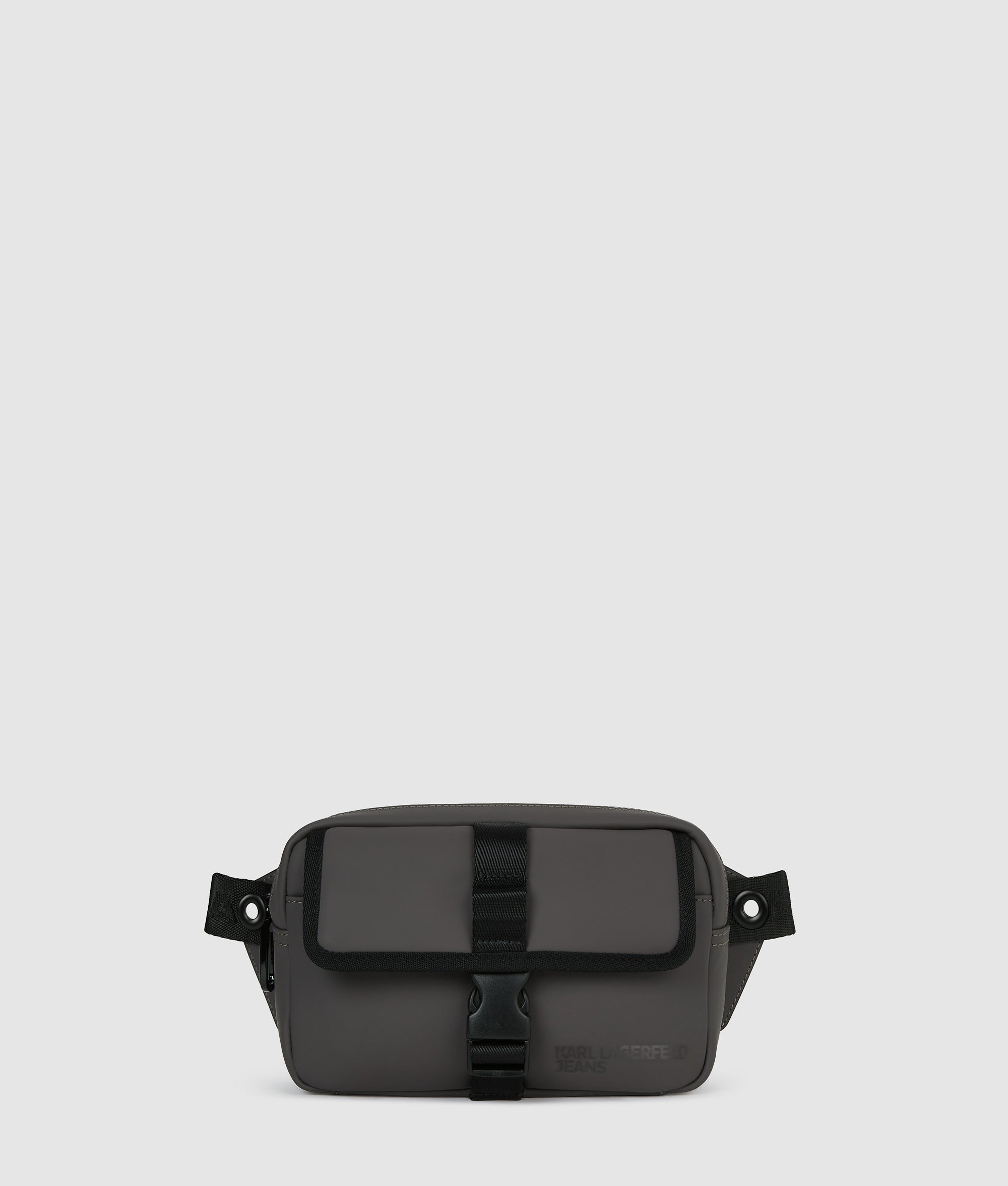 Statement strap detailing adds edge to this belt bag, with a soft shine KARL LAGERFELD JEANS logo. Wear across the body or at the waist, while a zip closure and pocket keep items safe and organized.