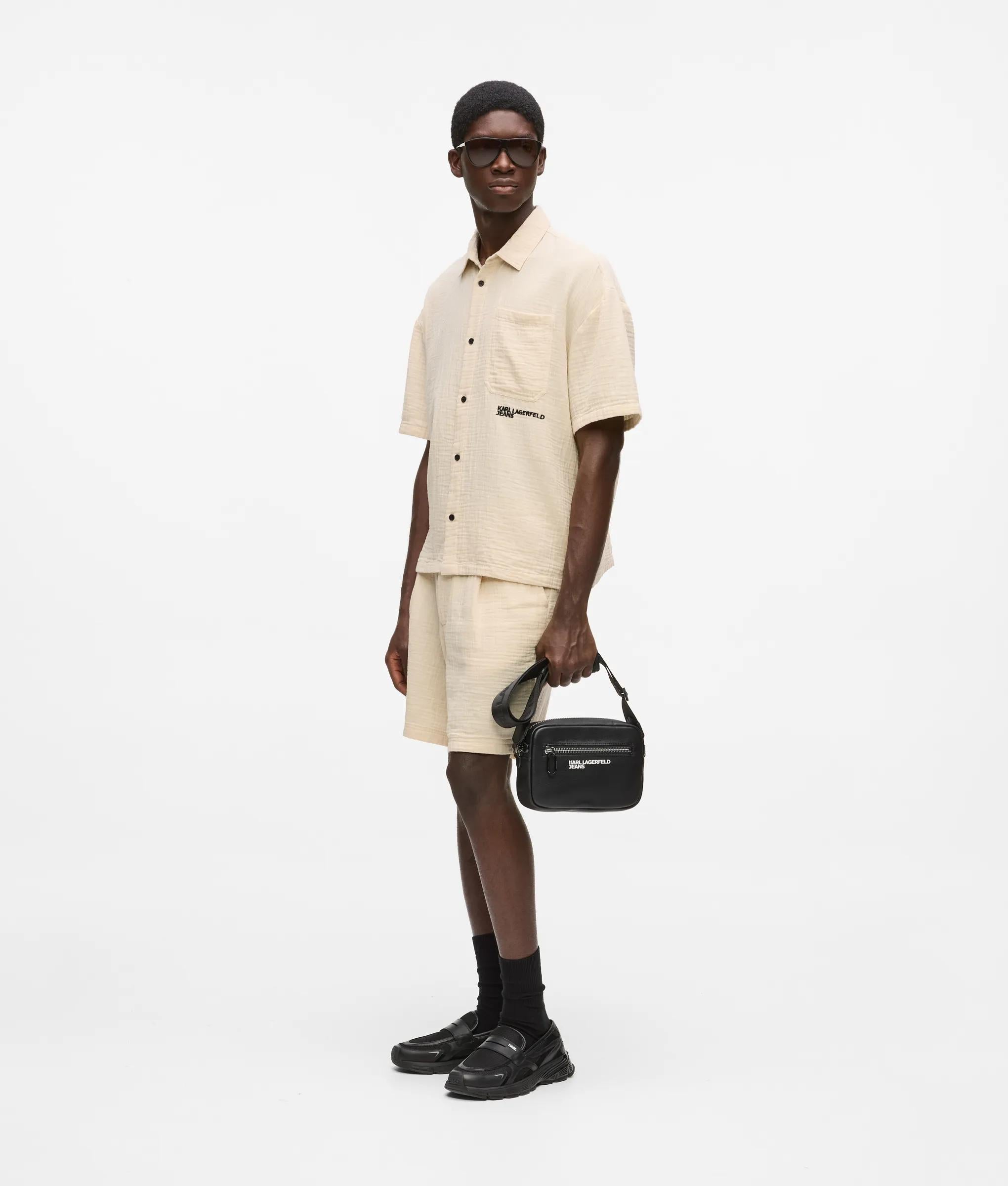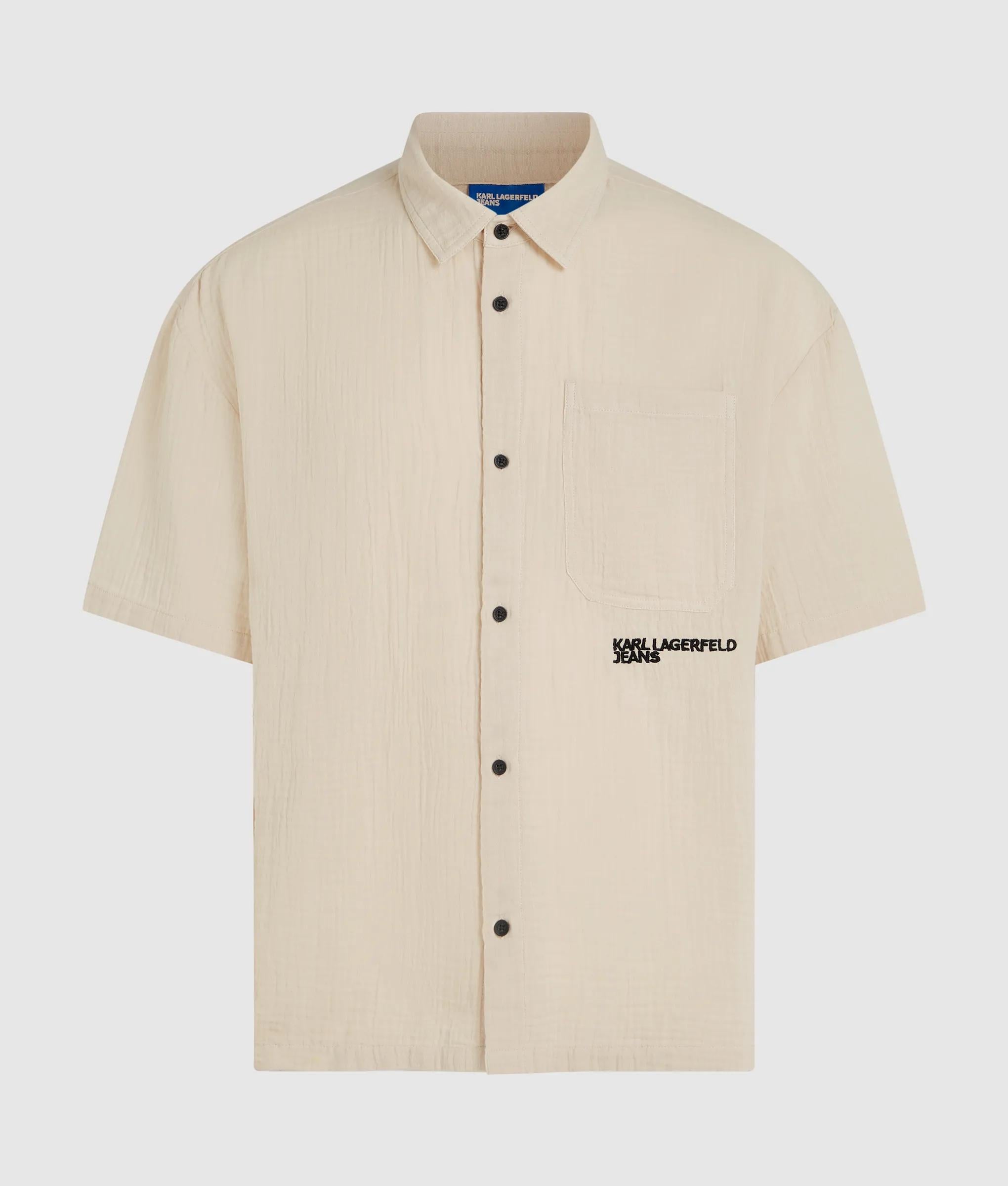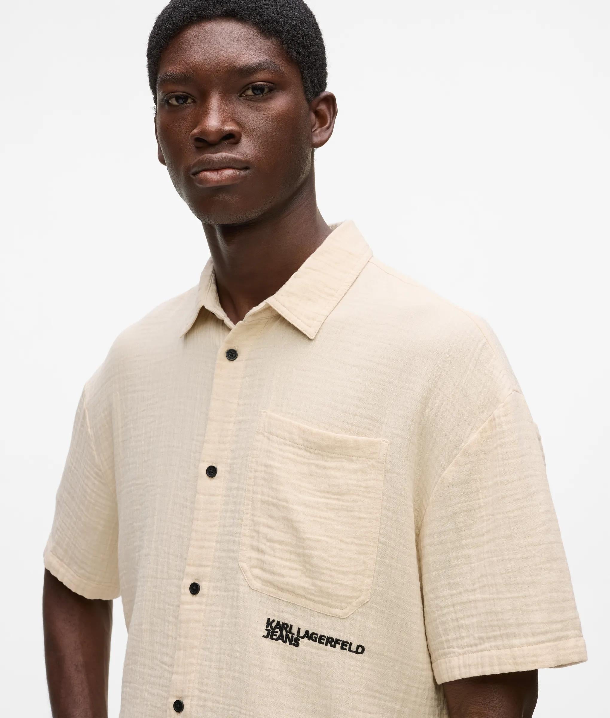 A short-sleeved shirt with a tactile crinkled texture and sharp button-front closure, punctuated by a bold logo at the chest pocket for a confident, modern edge.