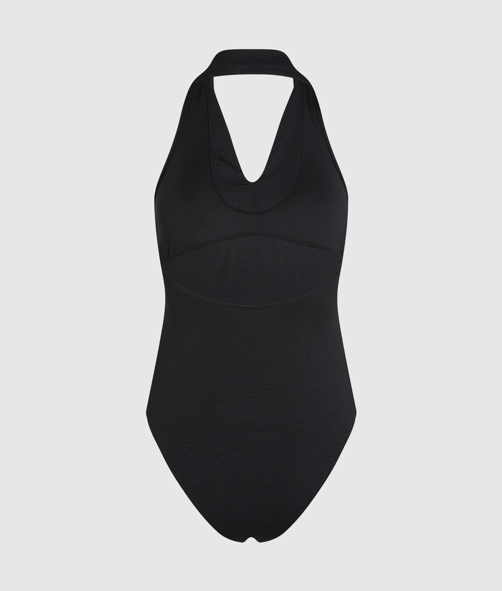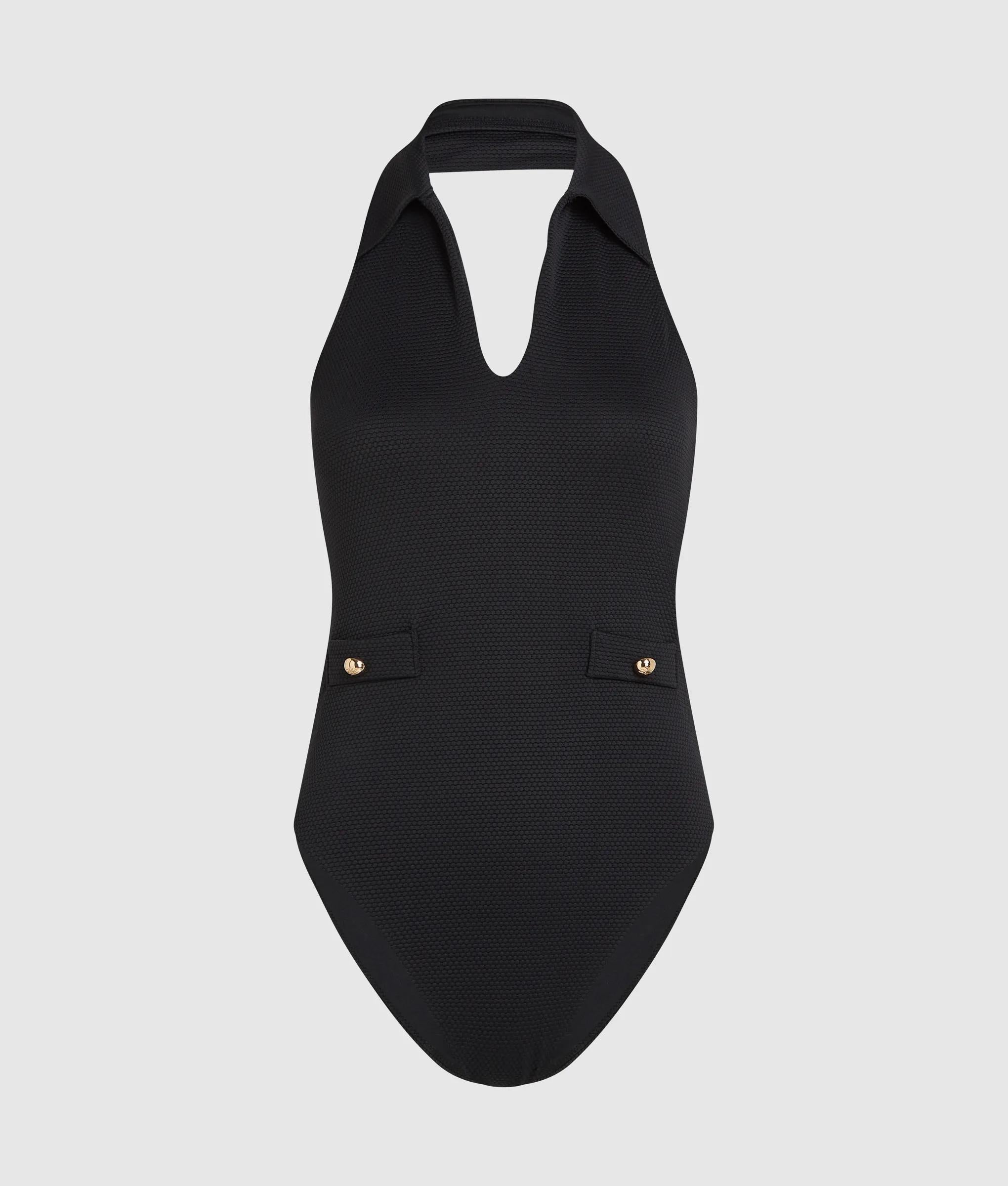 A halterneck swimsuit elevated by a sharp collar detail at the plunging V-neck, echoing Karl Lagerfeld’s iconic style. High-cut and sleek, it’s finished with gold-buttoned welt pockets for subtle luxury.