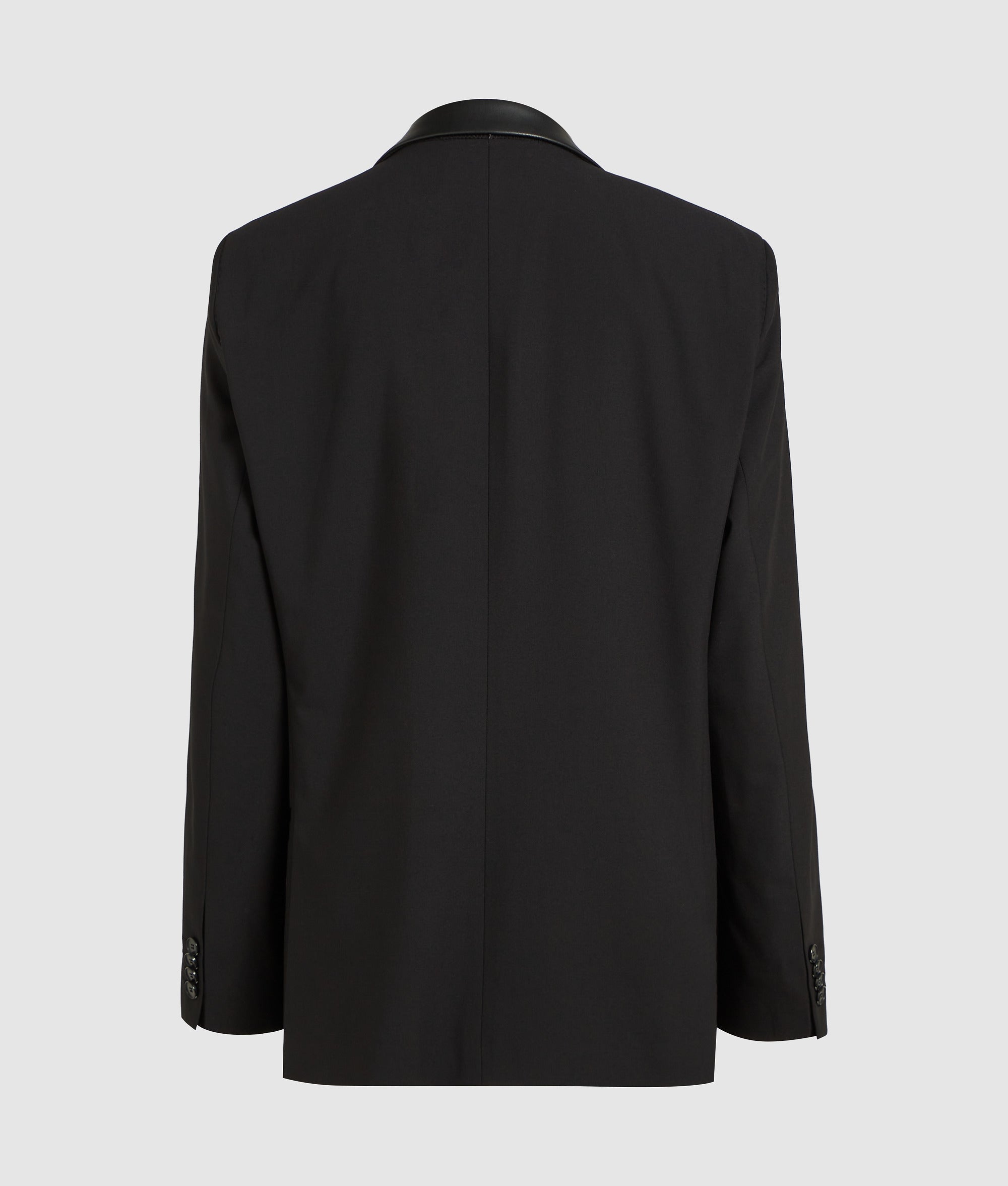 This blazer, with a streamlined, single-breasted fit, is accented by subtle faux-leather piping. The two-button closure and Kameo-embellished lining add quiet sophistication.