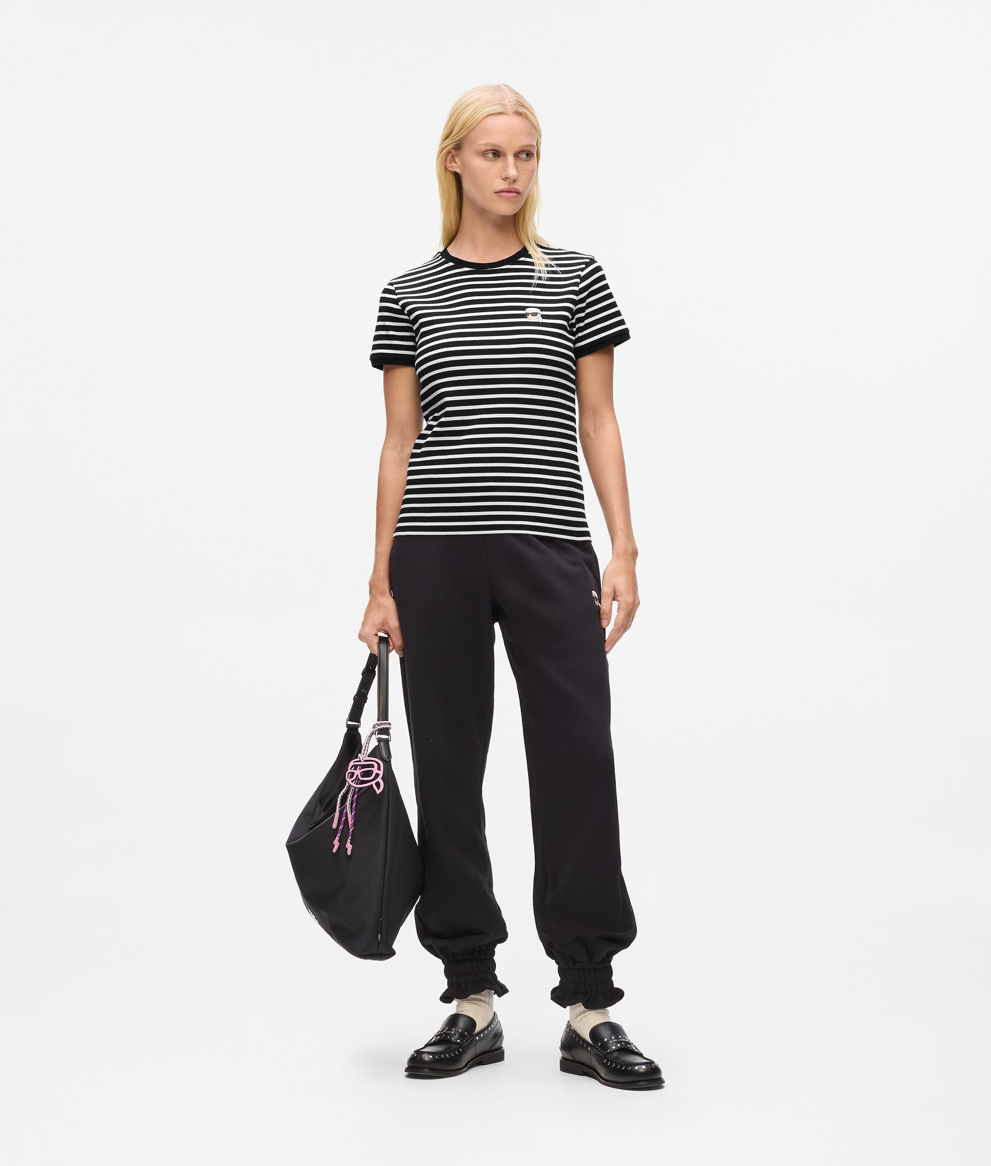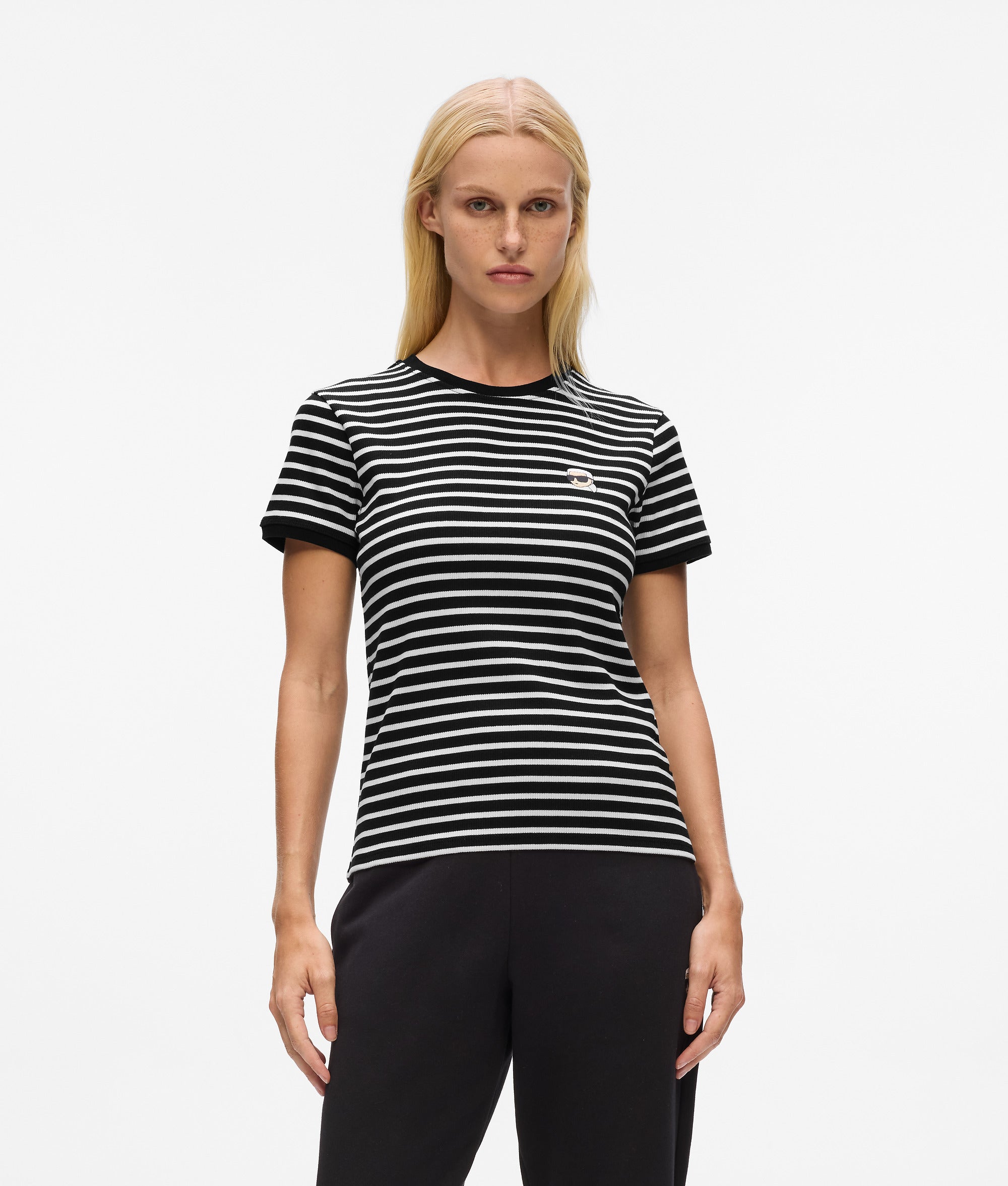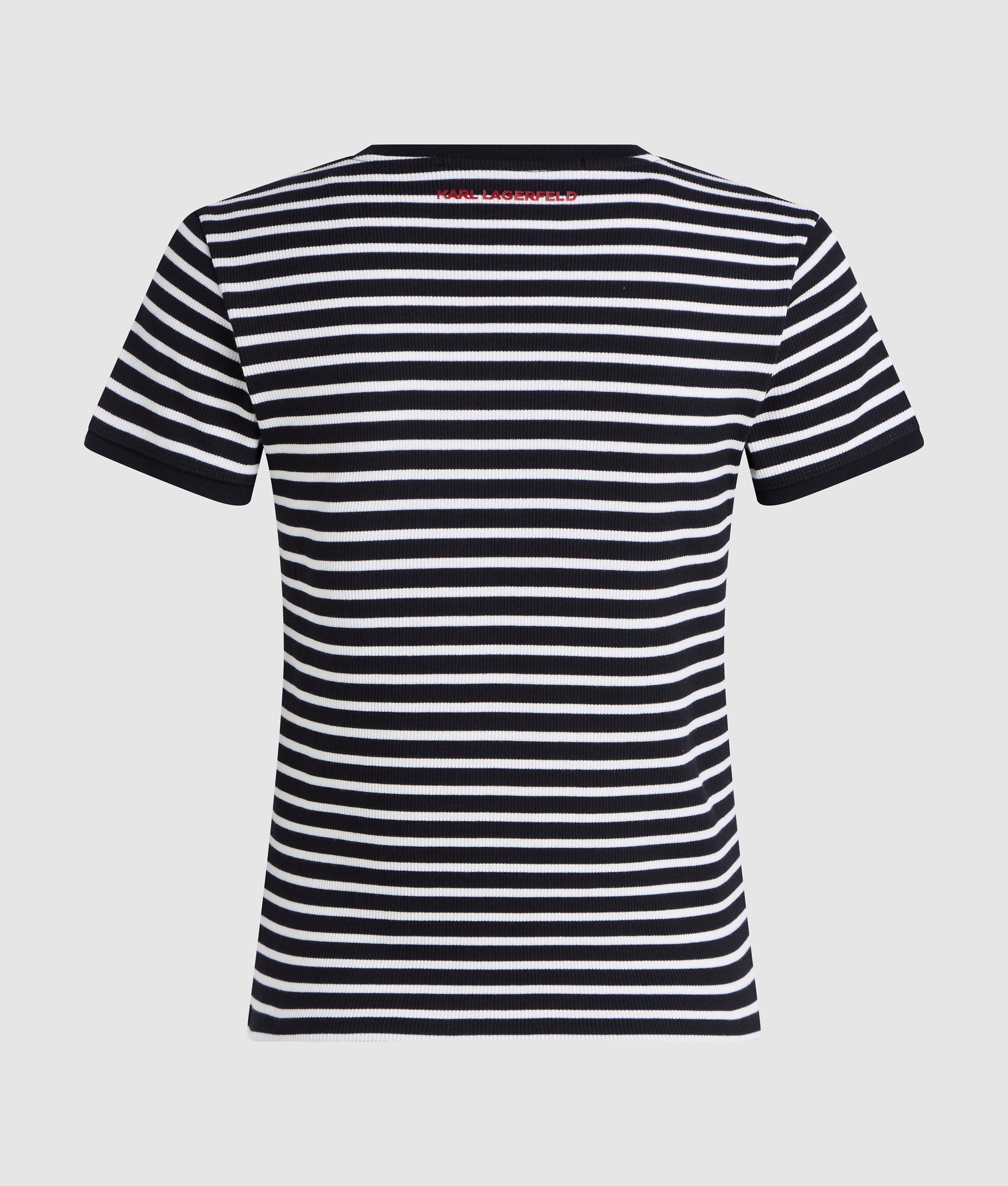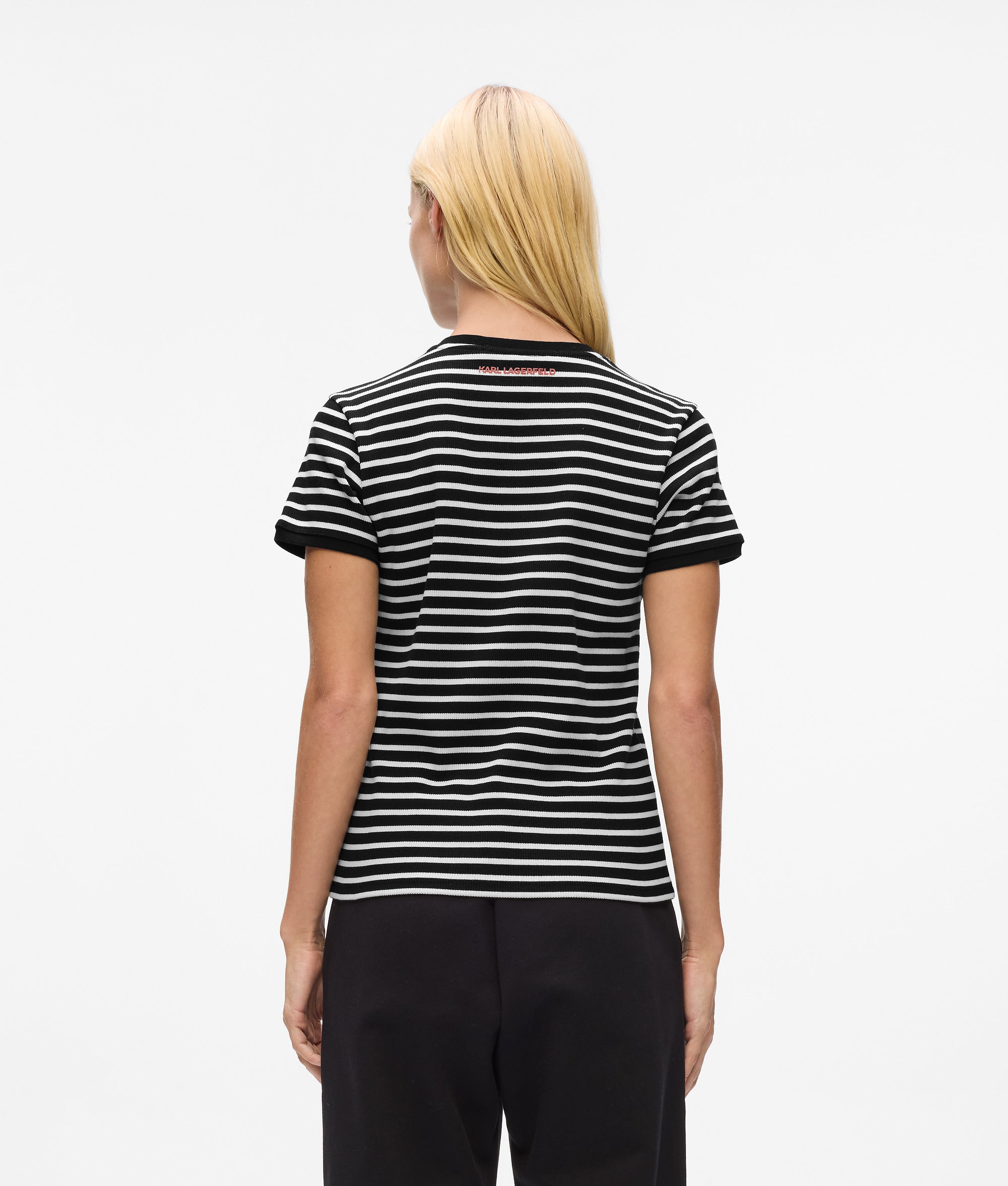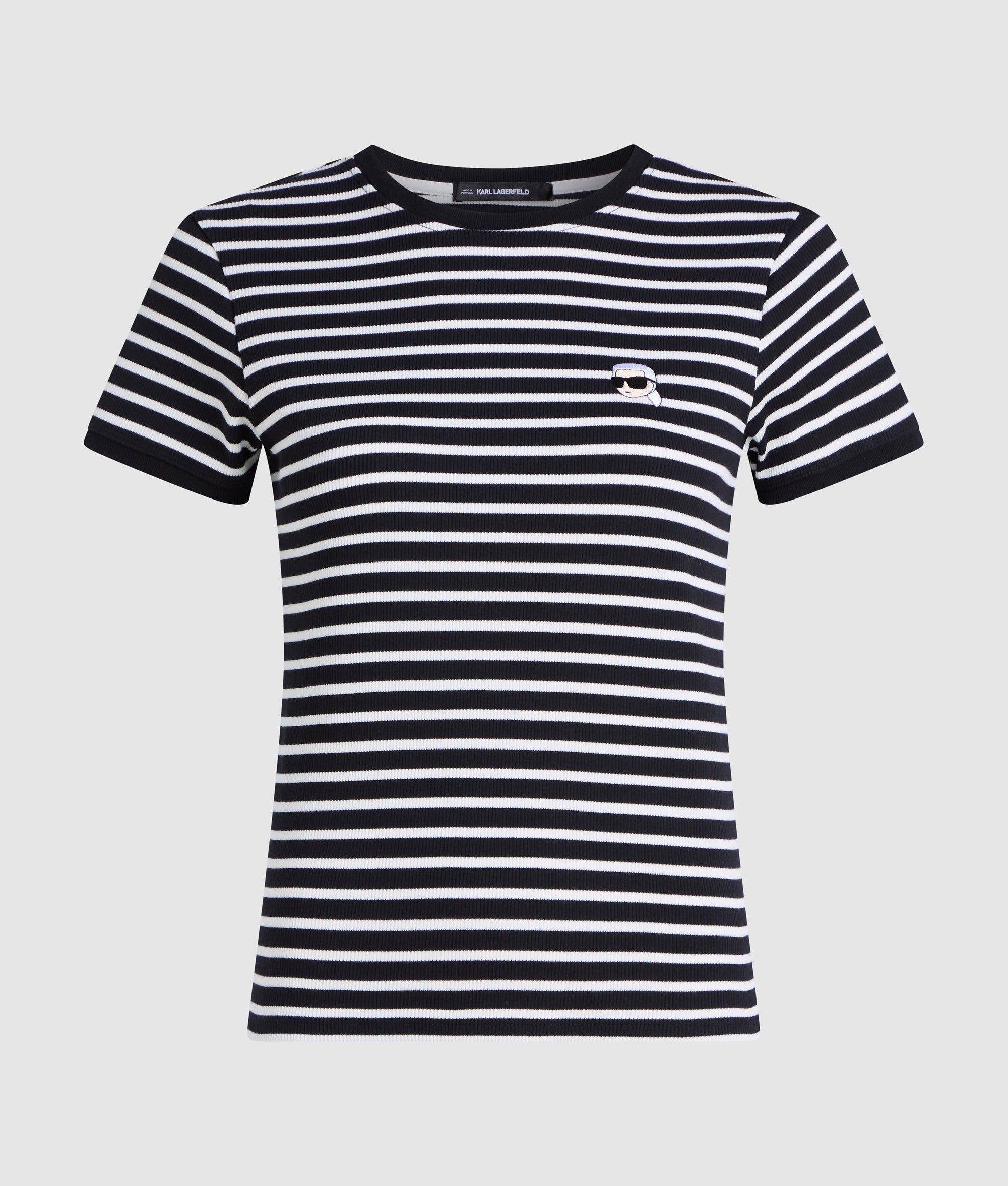This organic cotton T-shirt features a striped design elevated by a figure-skimming fit, classic crew neck, and contrast piping The Ikon Karl artwork patch adds a playful finish.