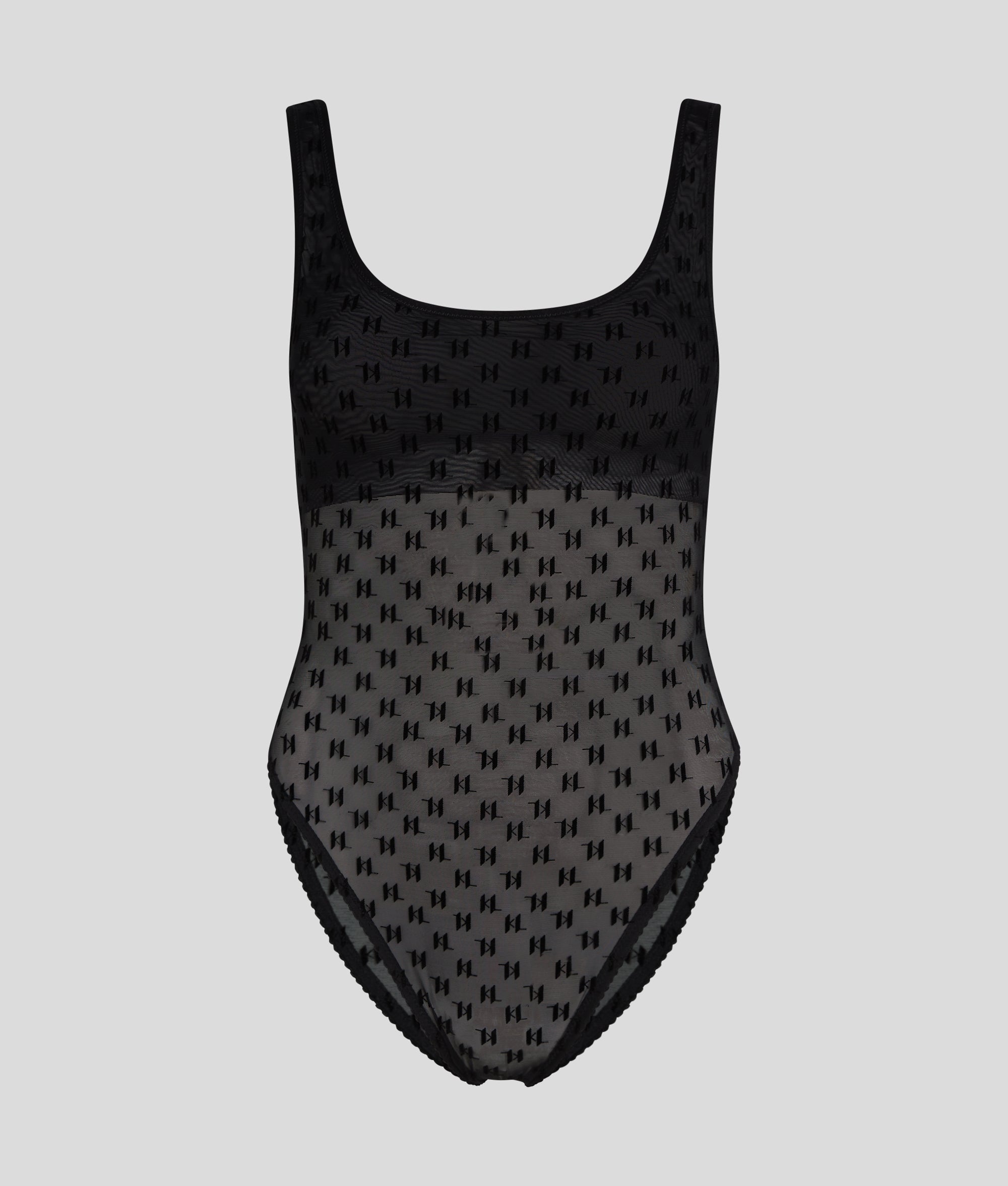 Descubre la comodidad y el estilo de este sensual y lujoso body de KARL LAGERFELD. Esta elegante prenda de malla transparente con el monograma tiene un diseño de pierna alta y espalda baja muy favorecedor.