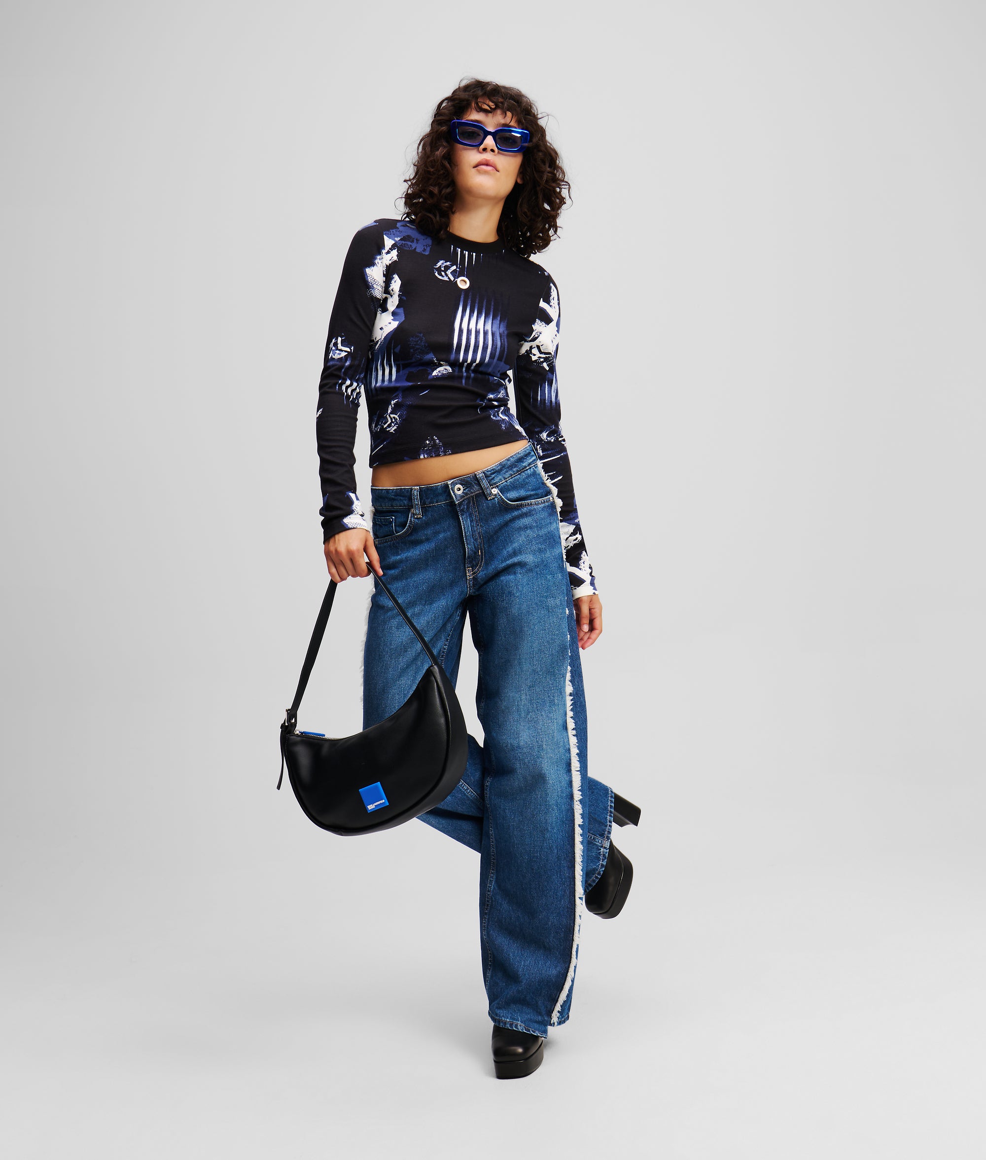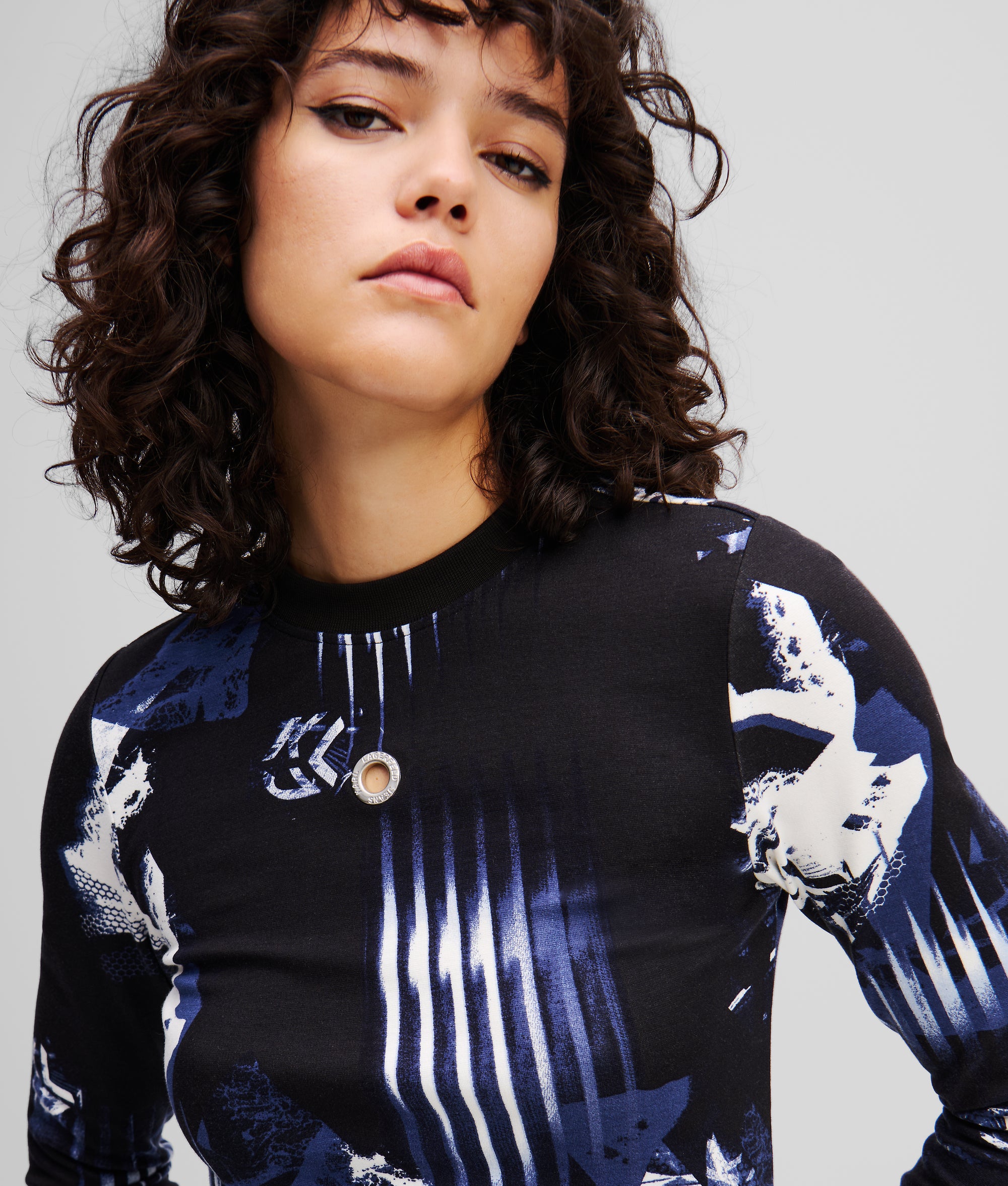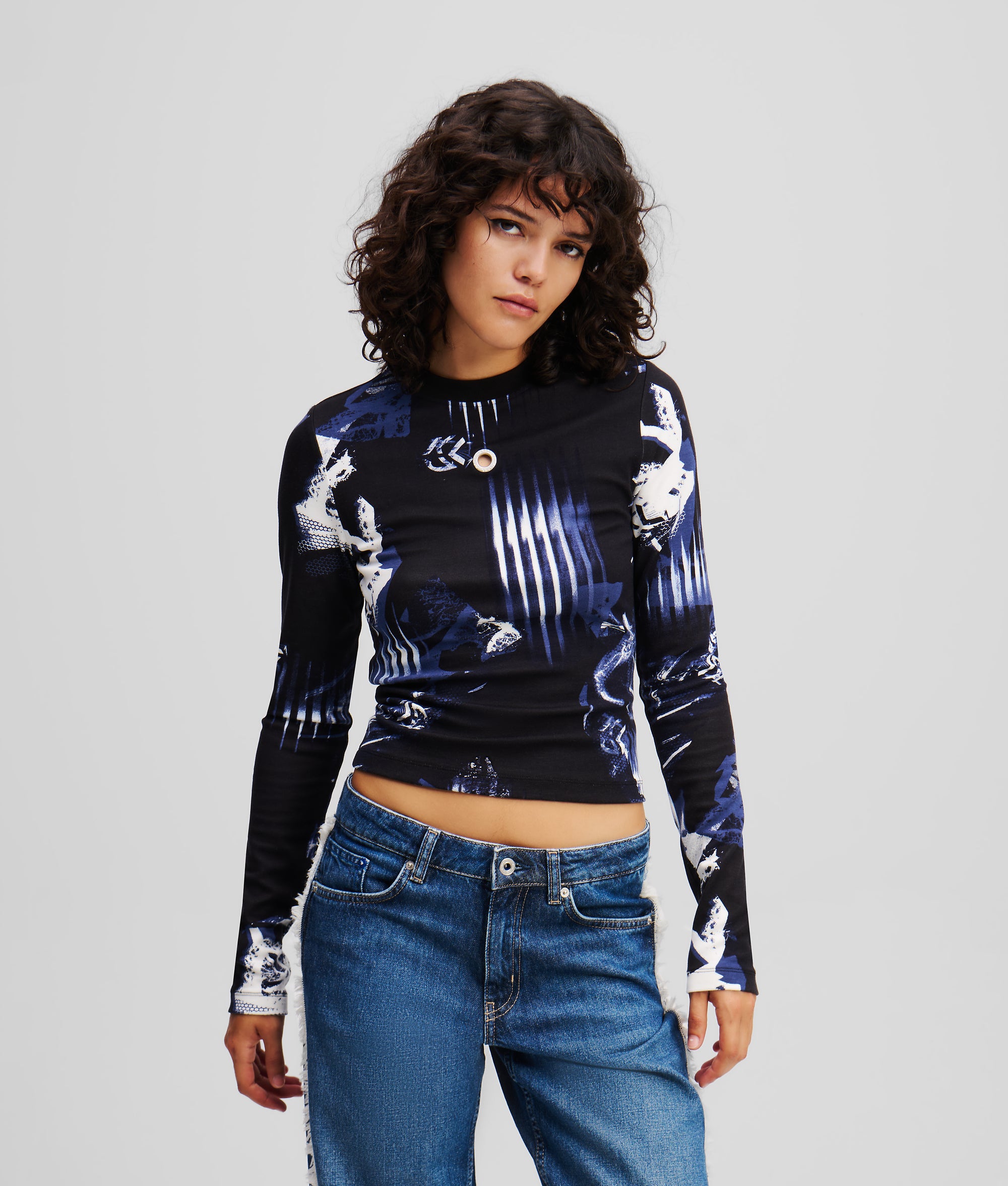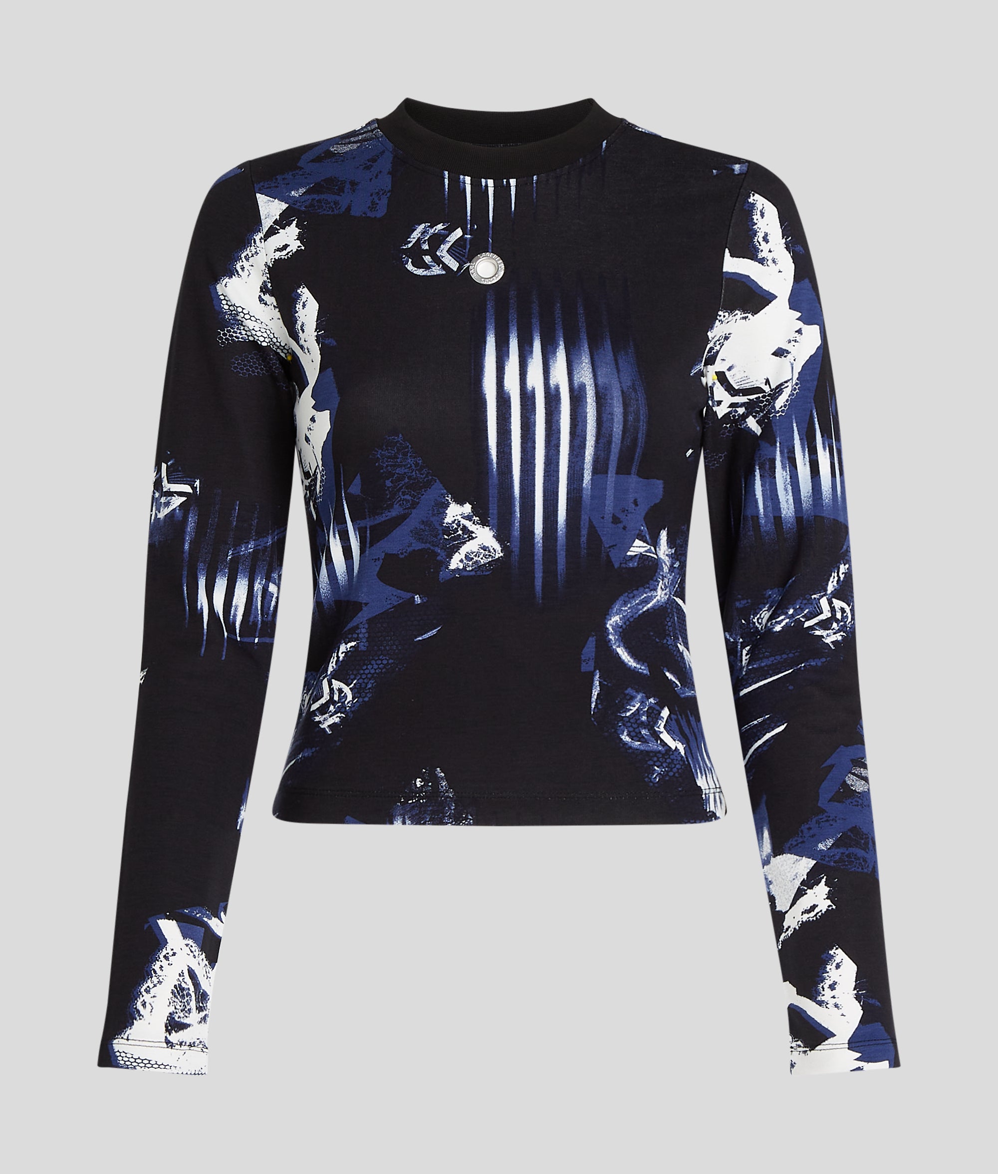 Este llamativo top de manga larga diseñado para urbanitas presenta un diseño ceñido con un estampado gráfico con efecto glitch. También incluye un cuello redondo de canalé y el logotipo de KARL LAGERFELD JEANS que añade personalidad.