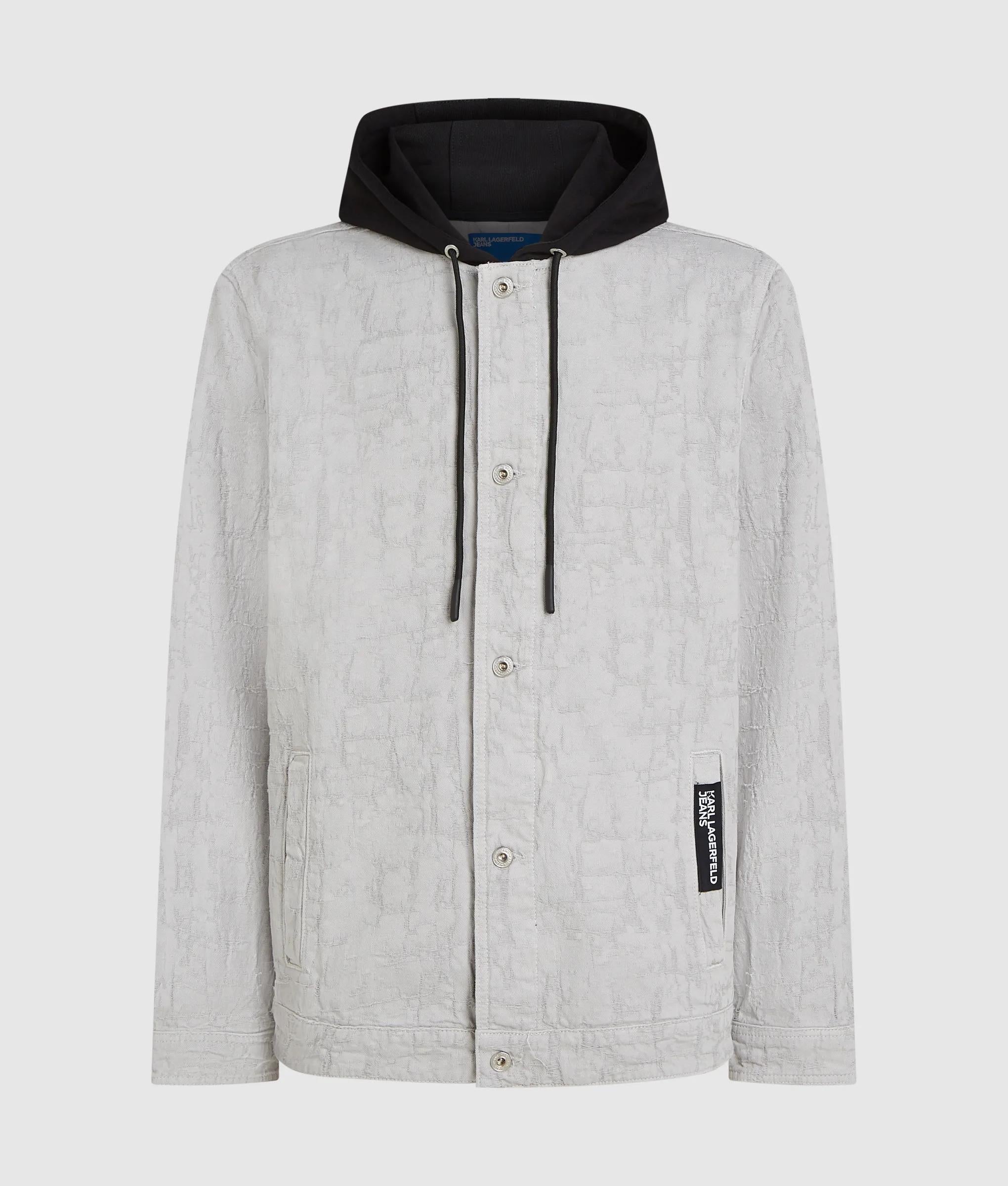 This 2-in-1 silhouette pairs a structured jacket with a contrasting jersey hood for a layered look without the bulk. Branded silver shank buttons sharpen the design with iconic KARL LAGERFELD JEANS detailing.