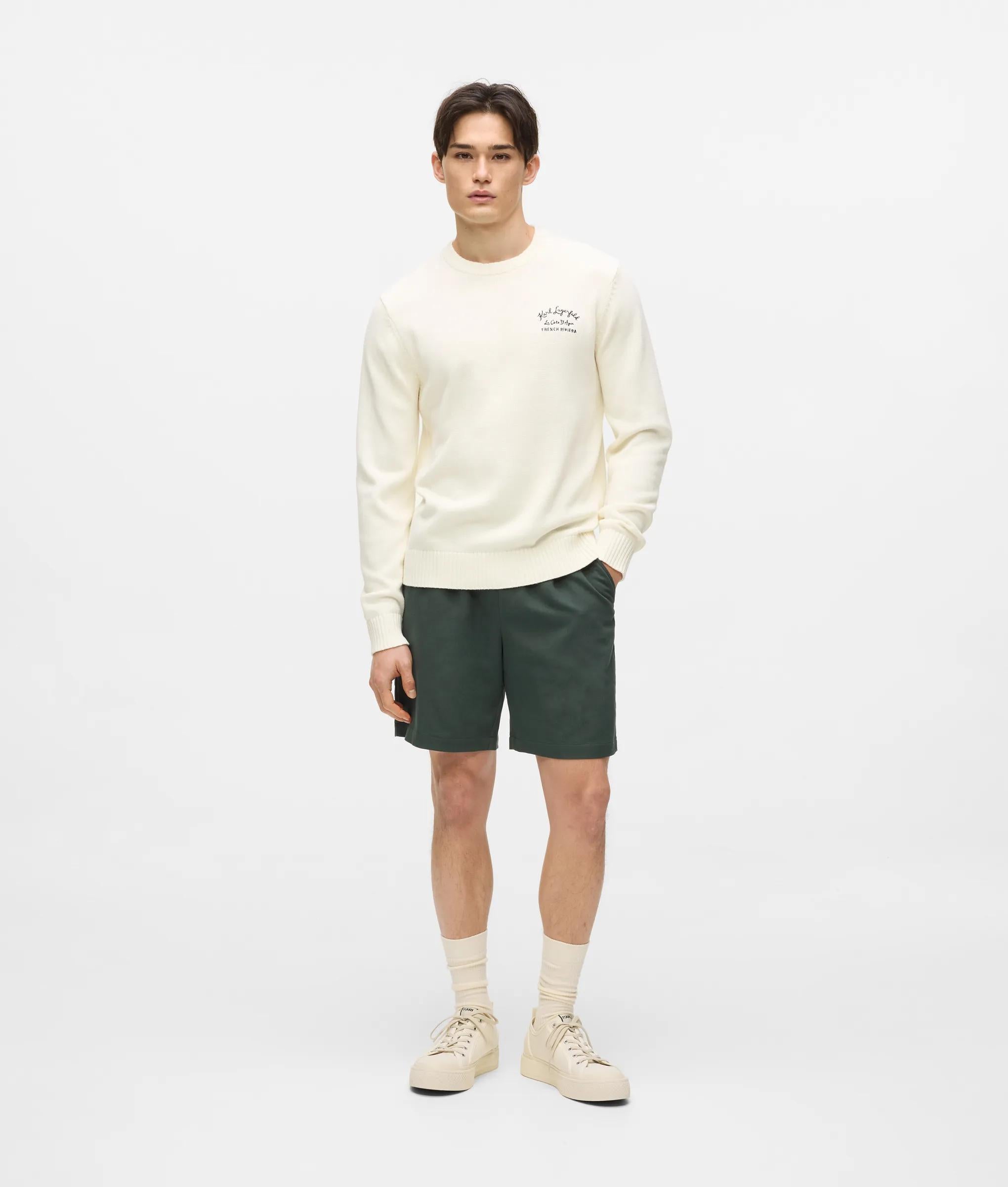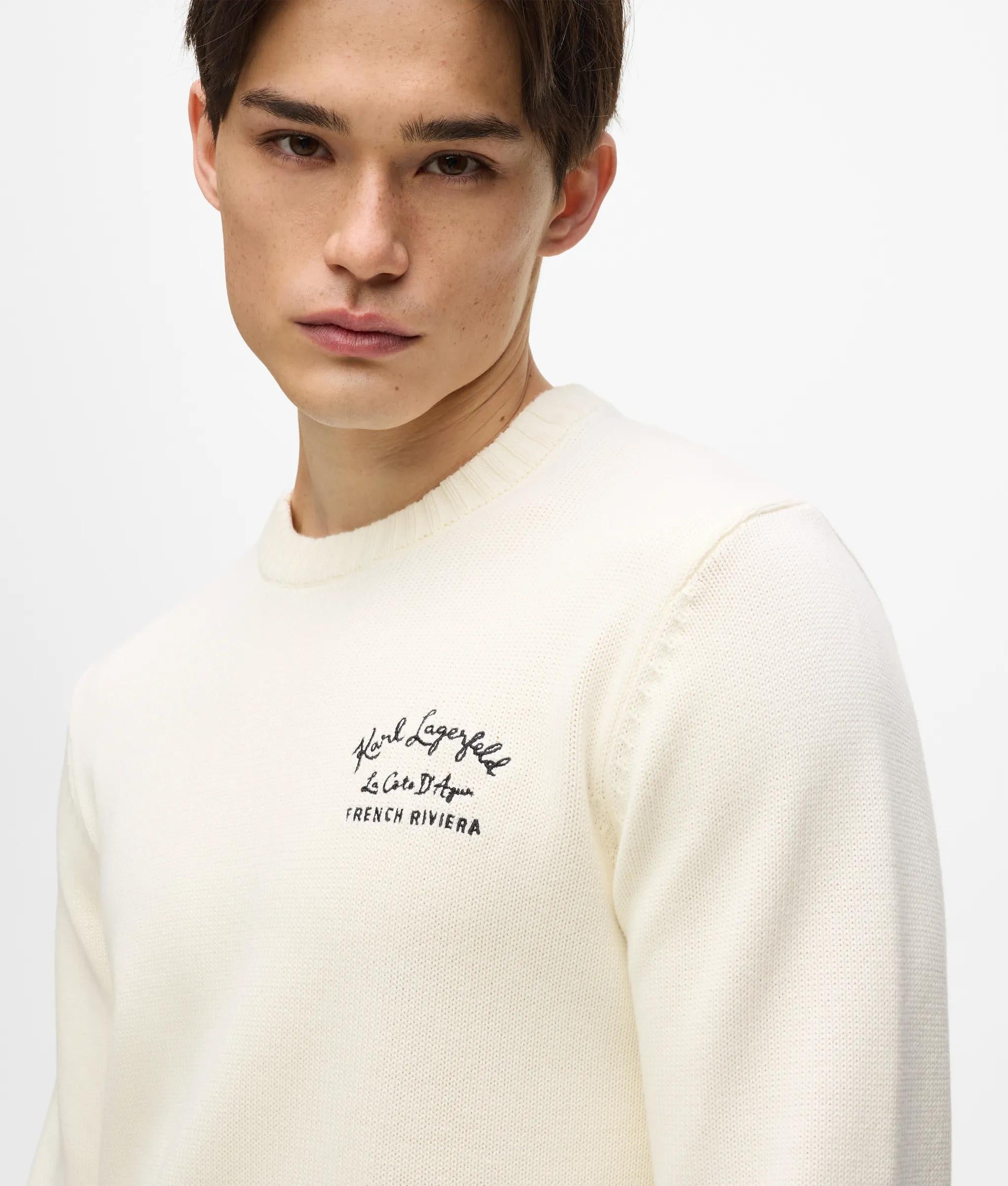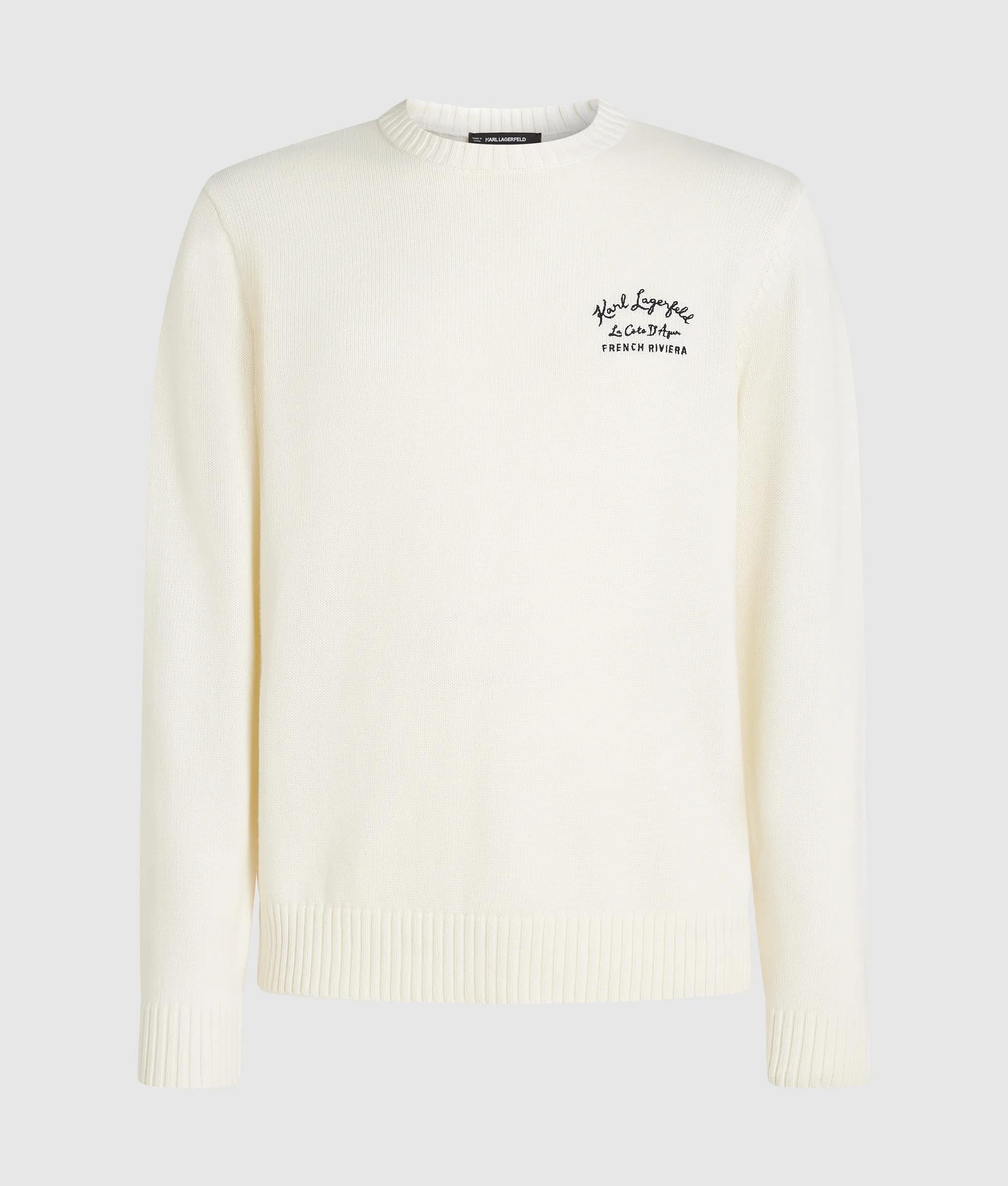 Este clásico jersey de cuello redondo está confeccionado en suave algodón y presenta un sutil canalé en los bordes. El diseño bordado añade un toque refinado que eleva las prendas de punto de uso diario.