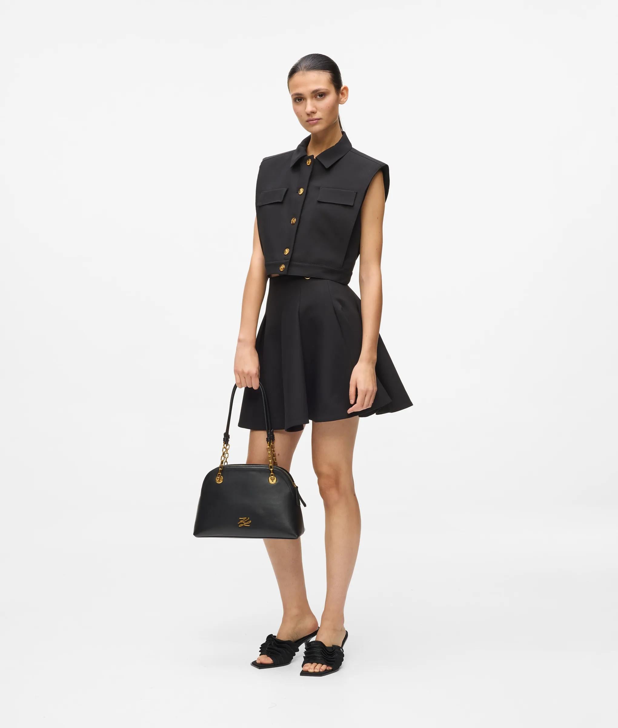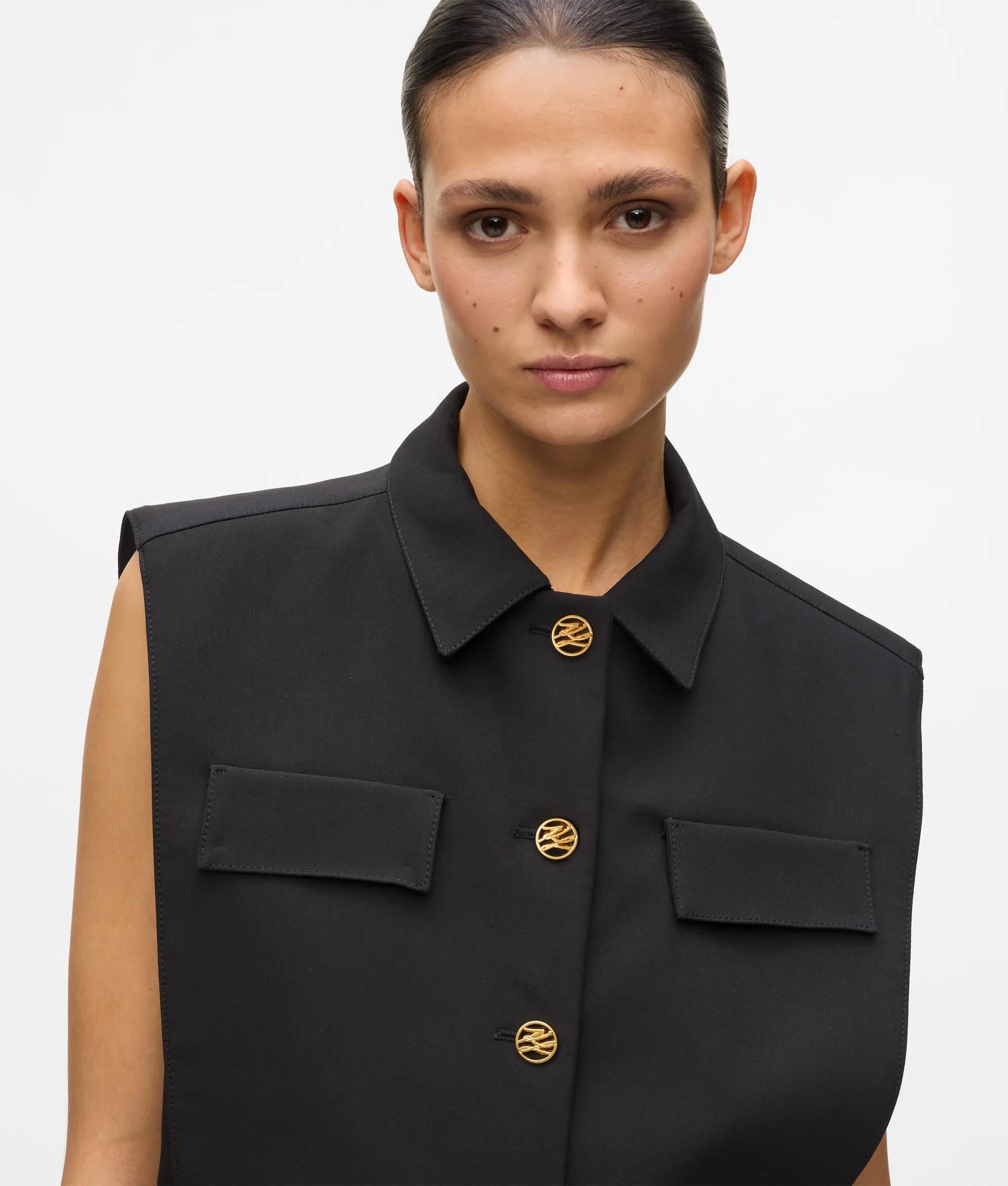 Llamativo y cuadrado, este chaleco corto aporta personalidad a un estilo sastre para lucir en climas cálidos. Combínelo con la minifalda acampanada a juego y cree un elegante conjunto de dos piezas para los soleados días de verano.