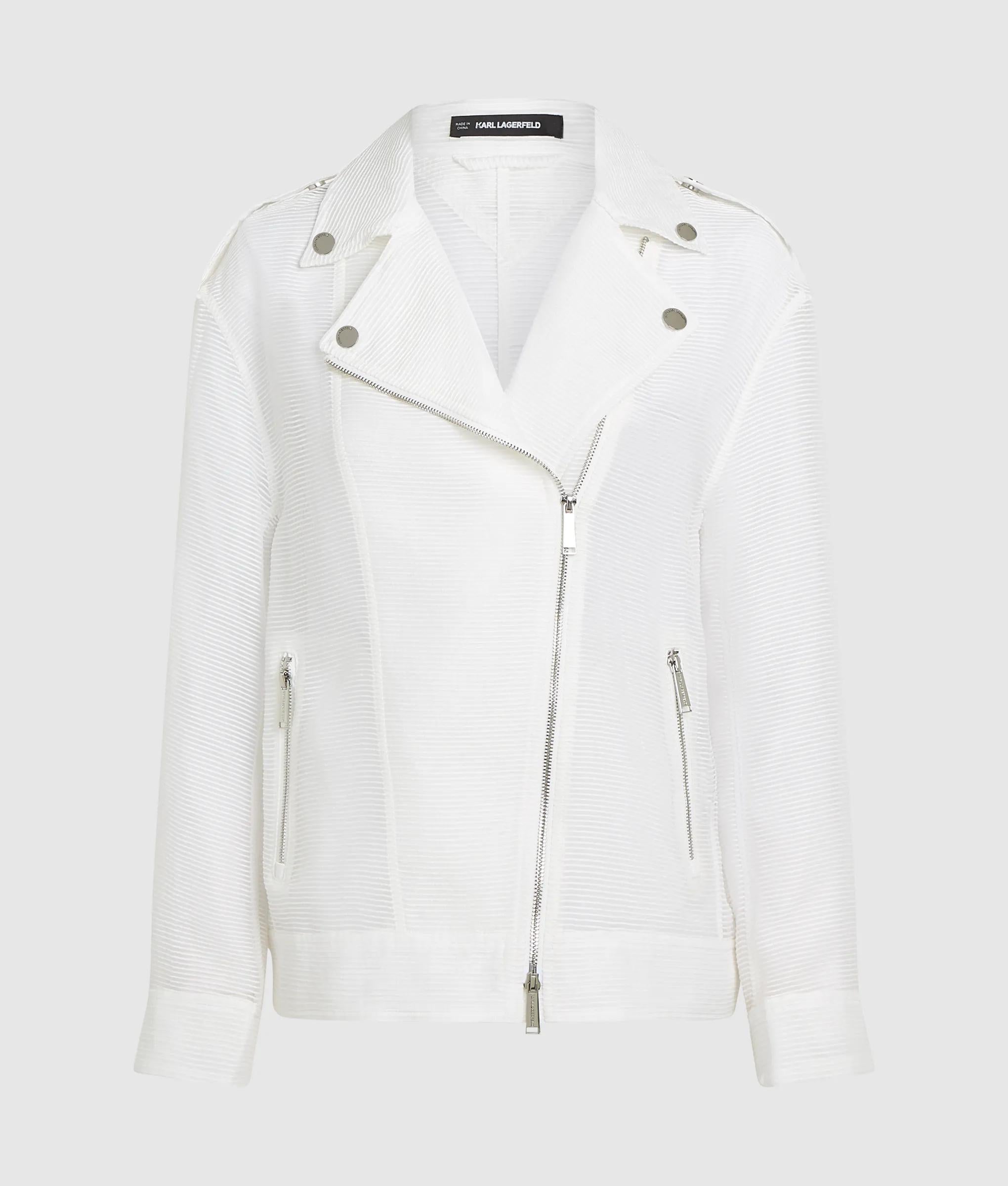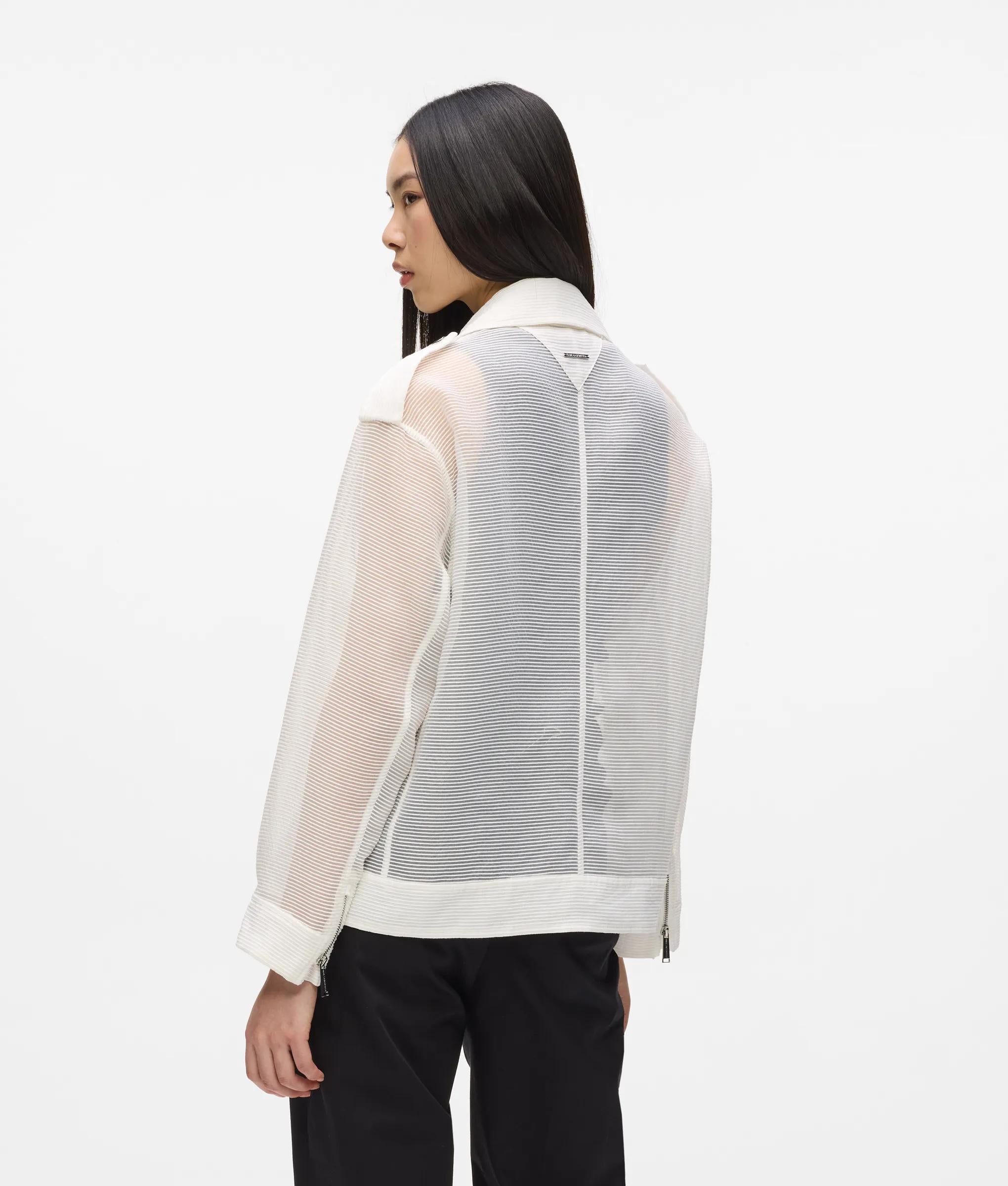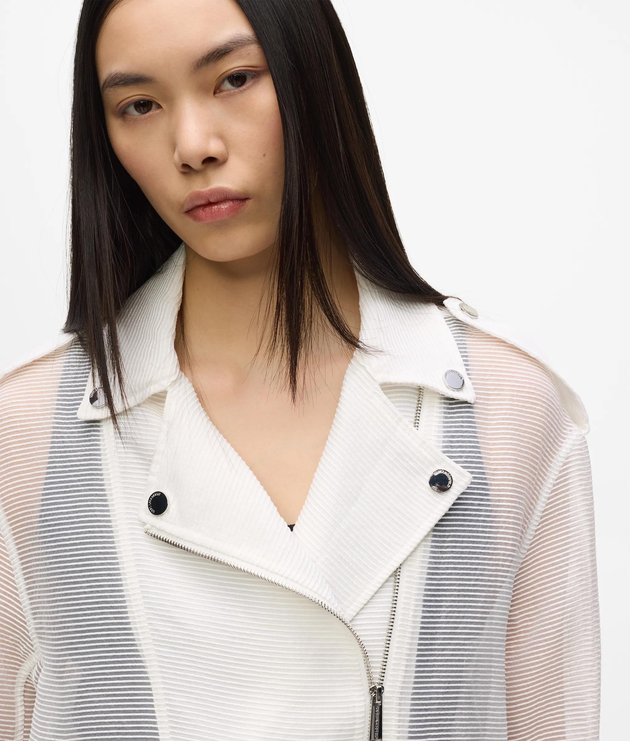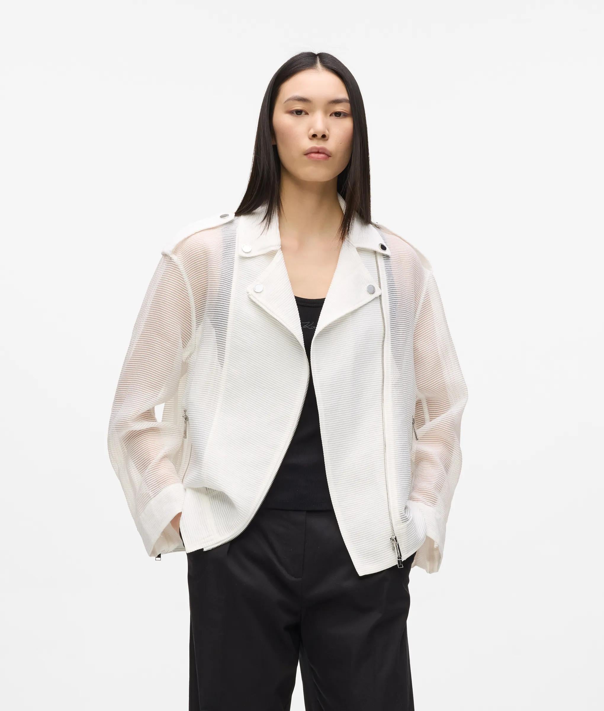 Unas franjas transparentes ondulan en esta chaqueta biker de organza, con una cremallera asimétrica y charreteras estructuradas que marcan su estilo. Los bolsillos con cremallera y los detalles de botones a presión rematan su estética.