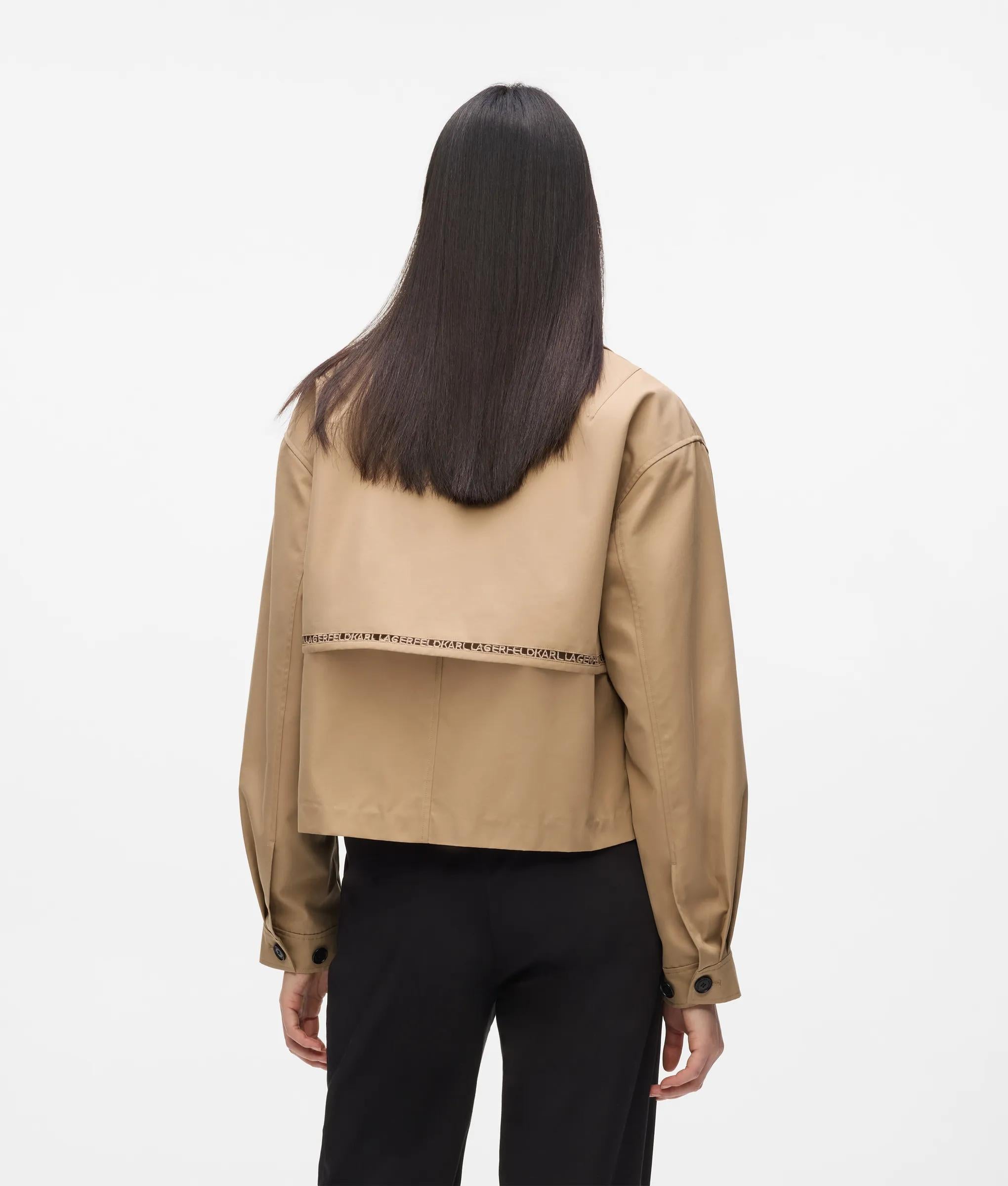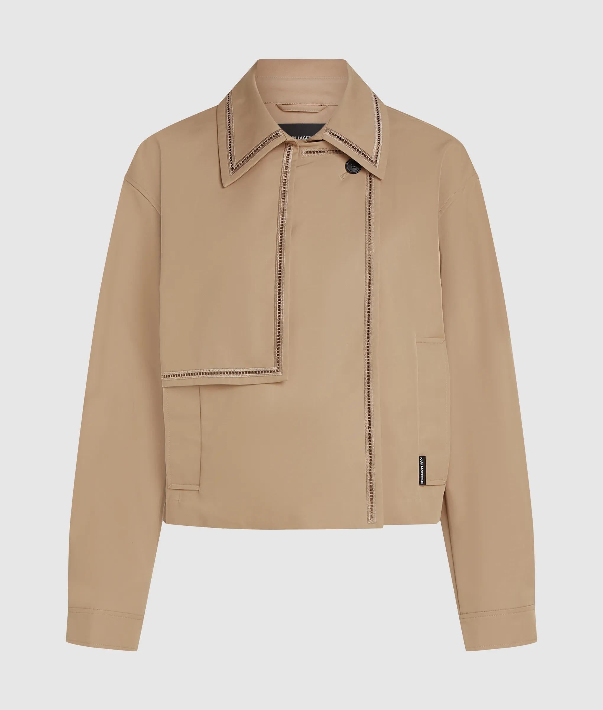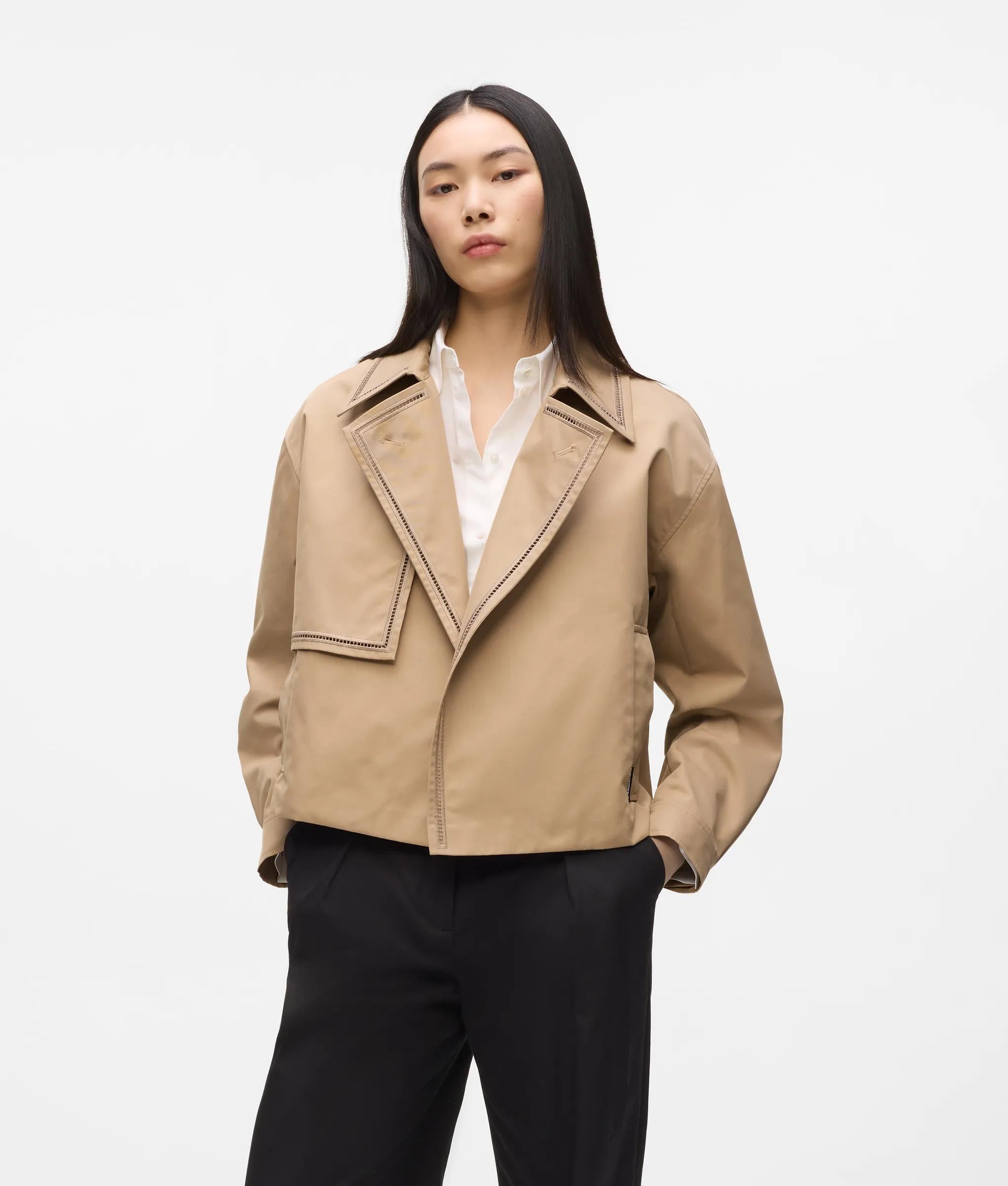 Esta gabardina corta y ligeramente estructurada cuenta con delicadas aberturas con encaje. Los puños de las mangas ajustables aportan un acabado de estilo sastre al elegante diseño.