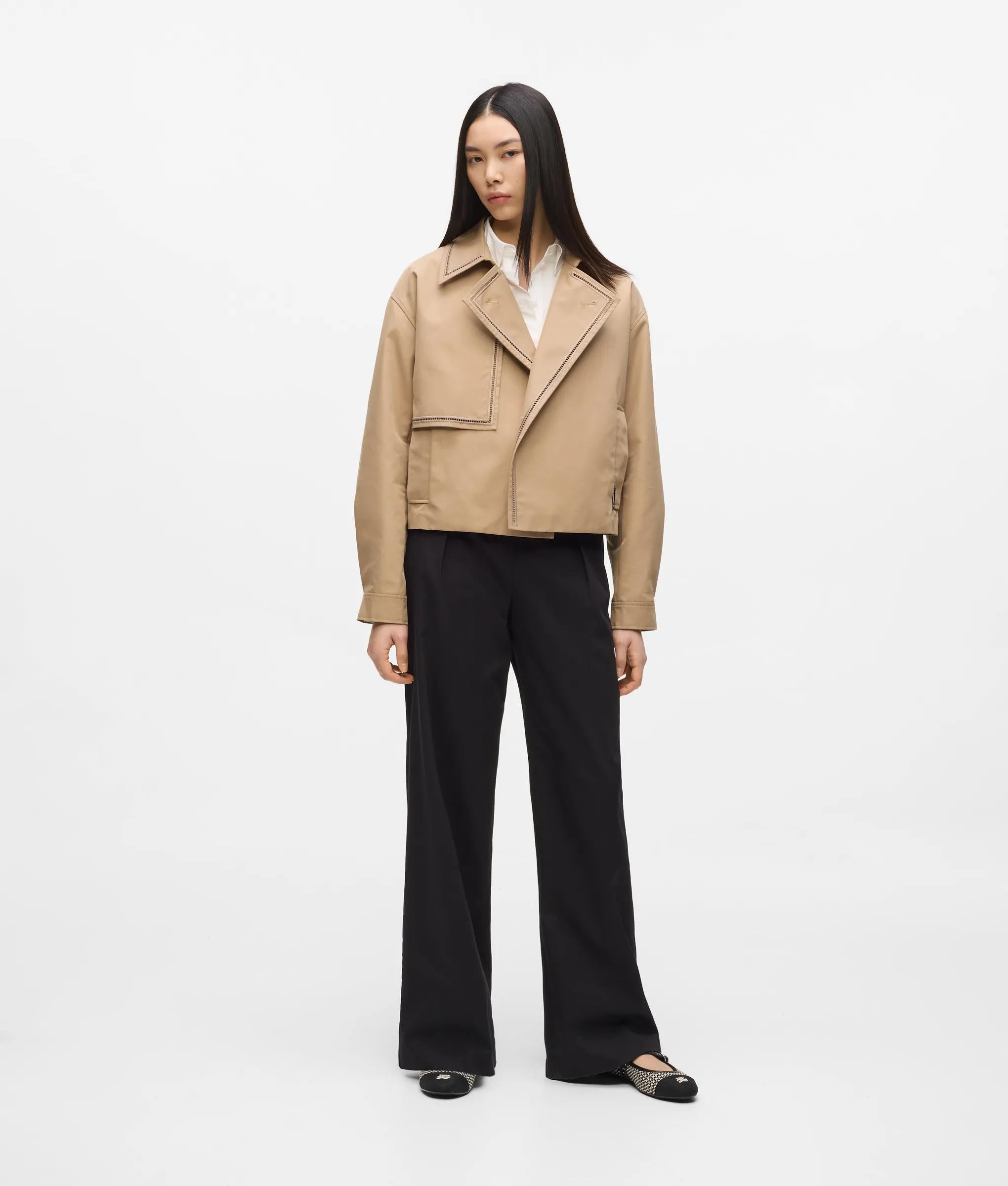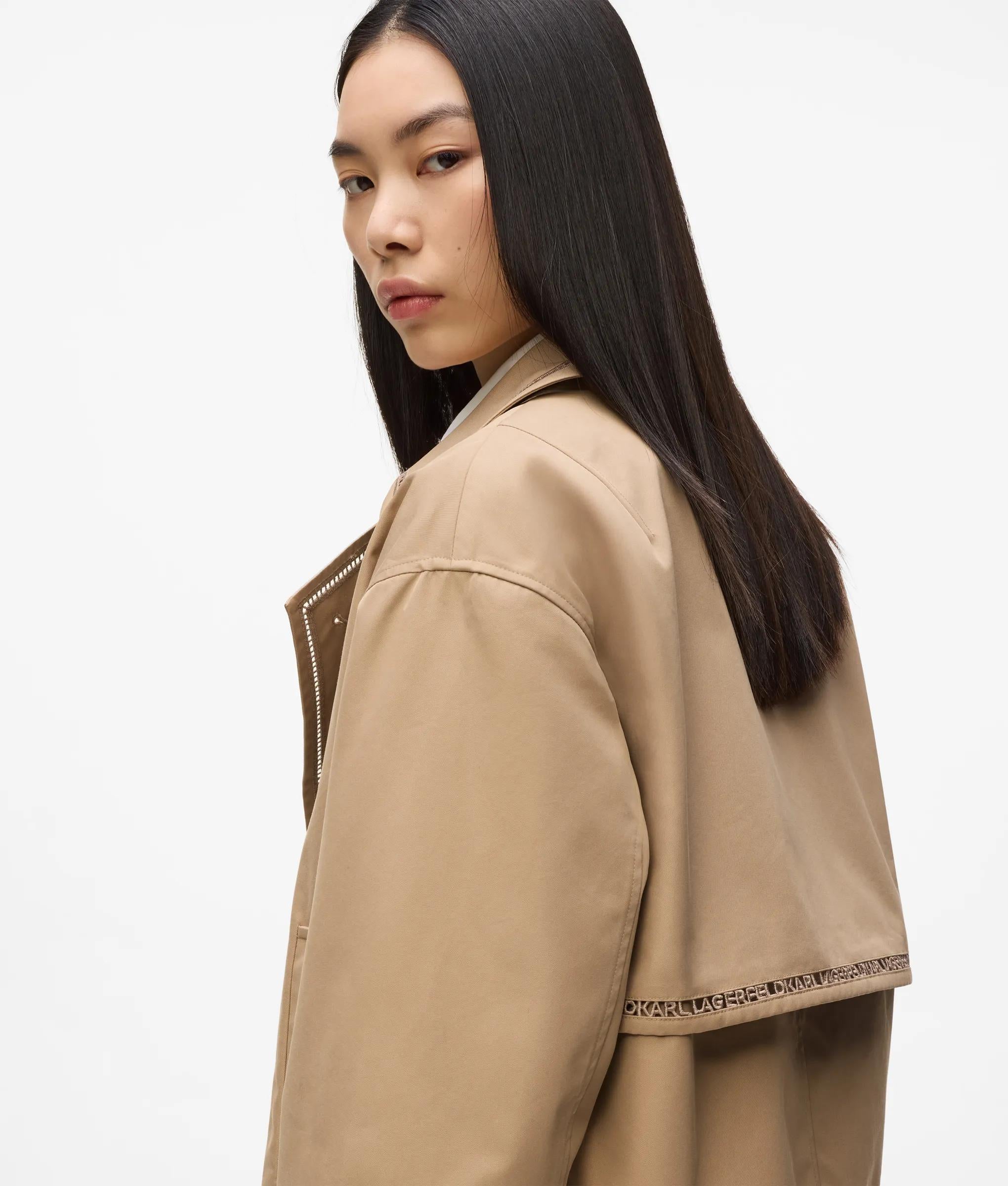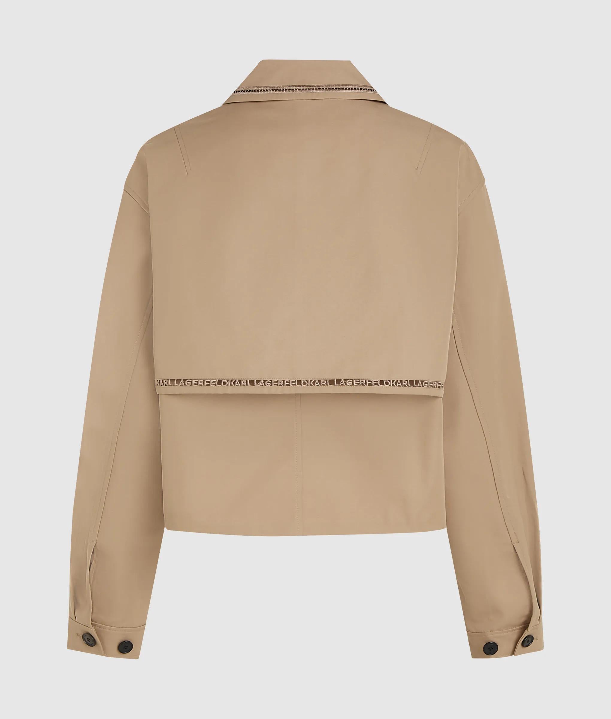 Esta gabardina corta y ligeramente estructurada cuenta con delicadas aberturas con encaje. Los puños de las mangas ajustables aportan un acabado de estilo sastre al elegante diseño.