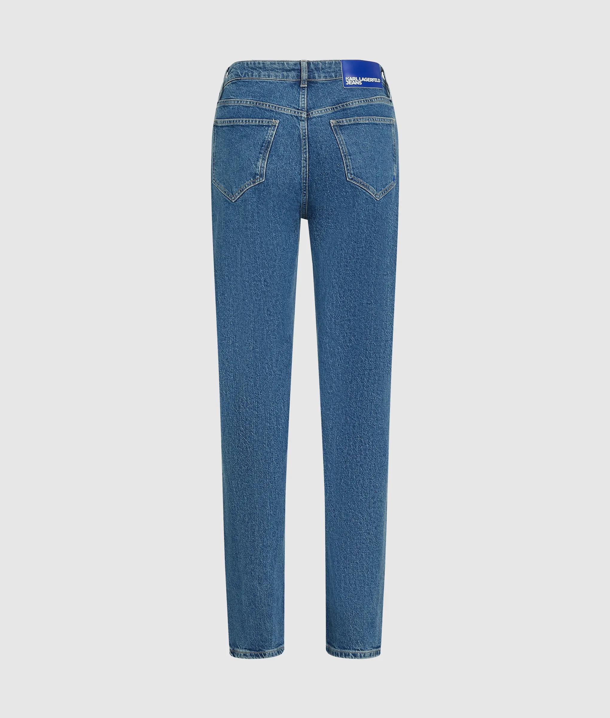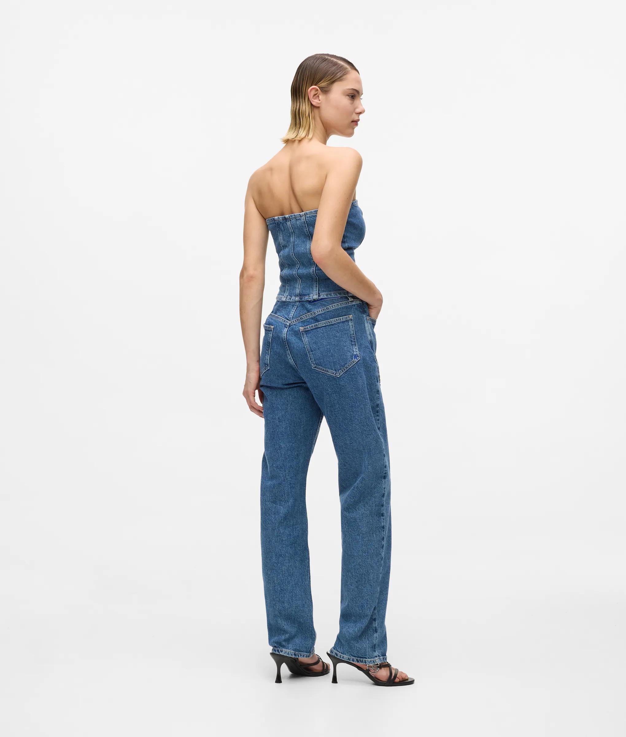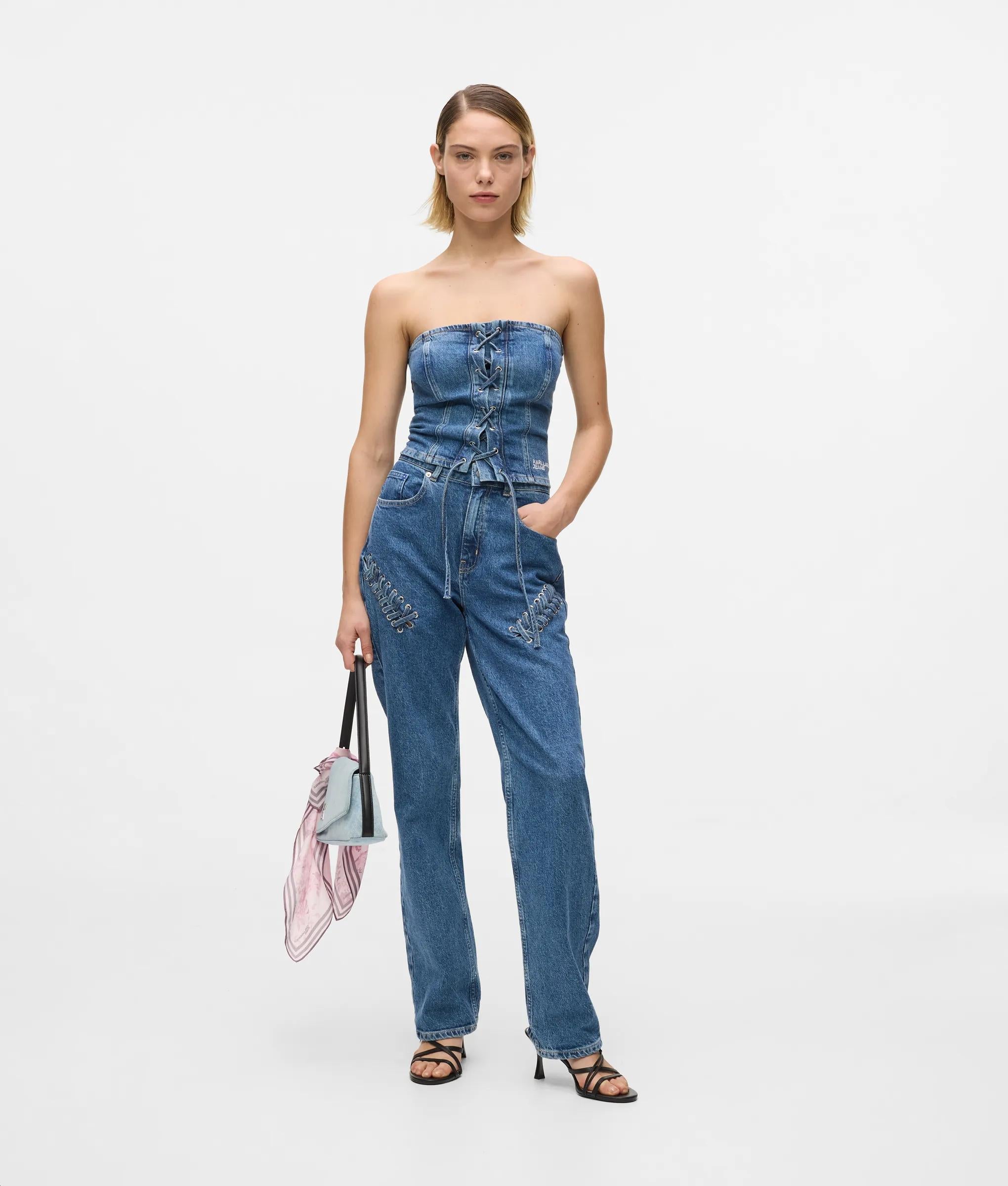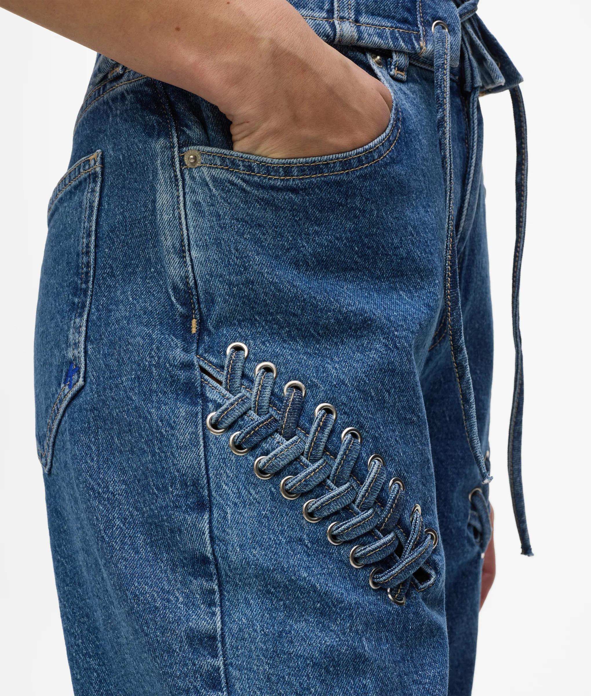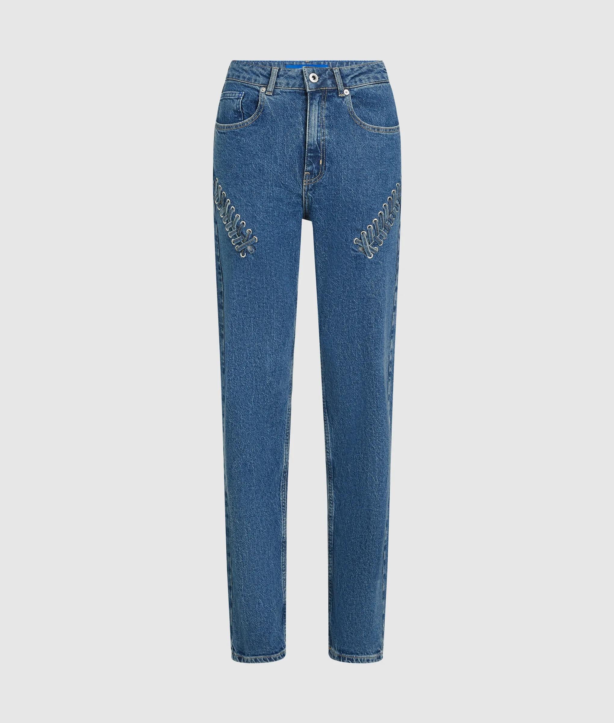 Unos cordones anudados adornan estos vaqueros de talle alto y pierna recta, combinando detalles vistosos con un diseño de líneas limpias.