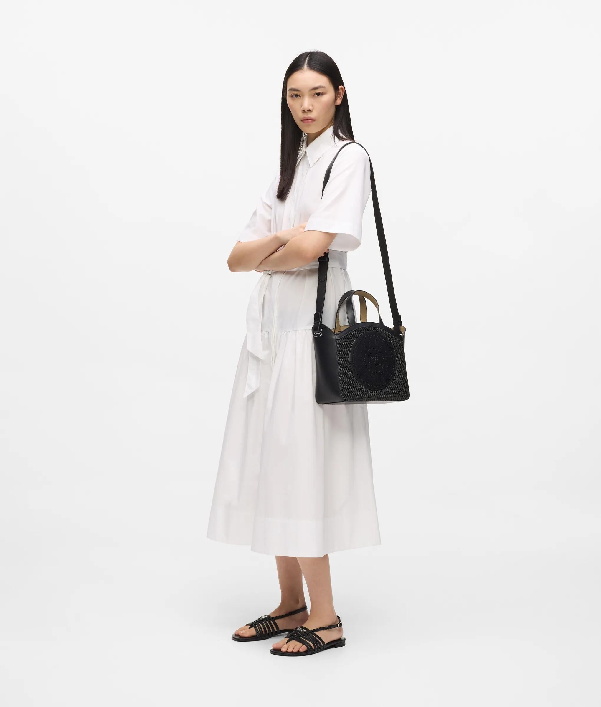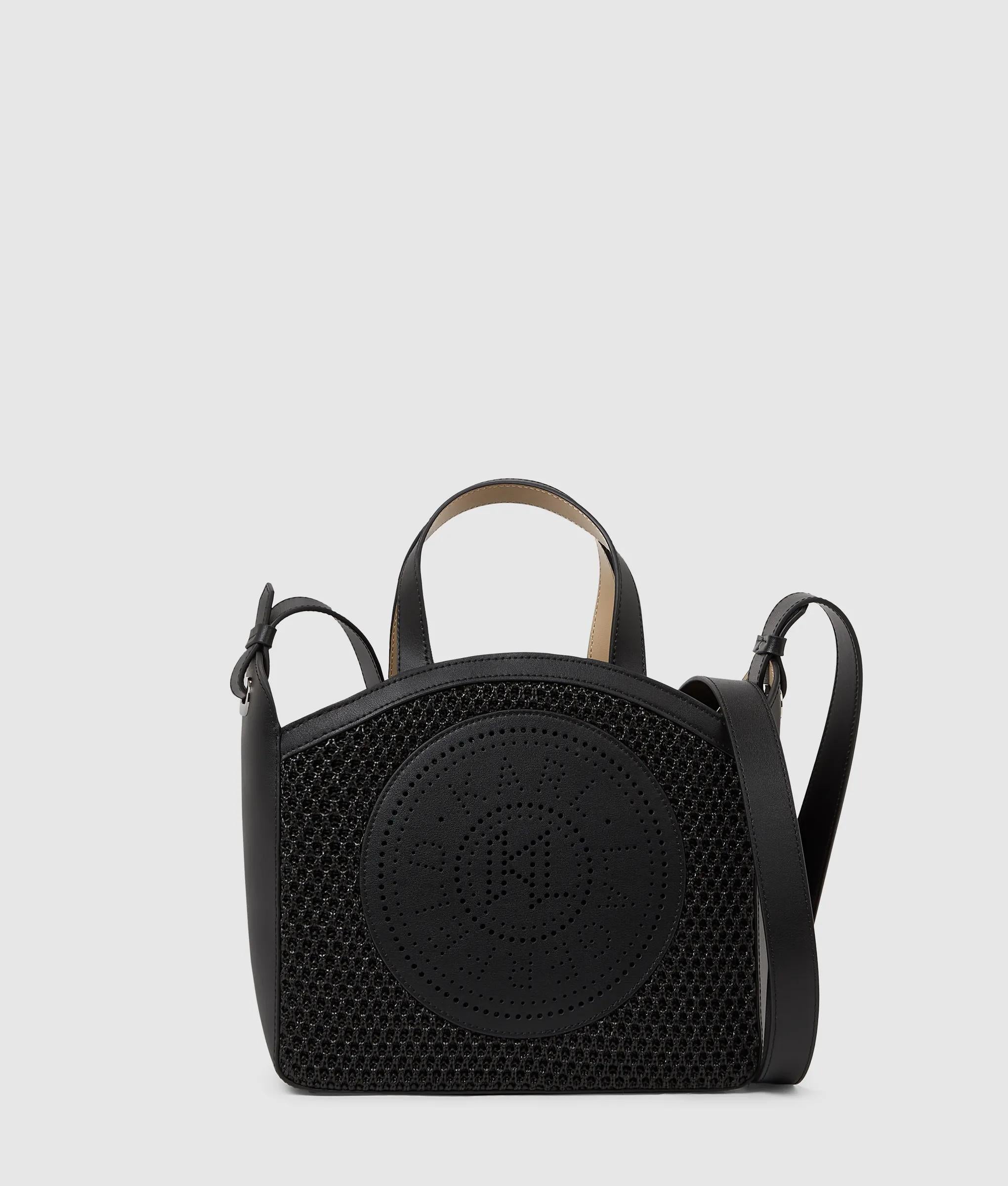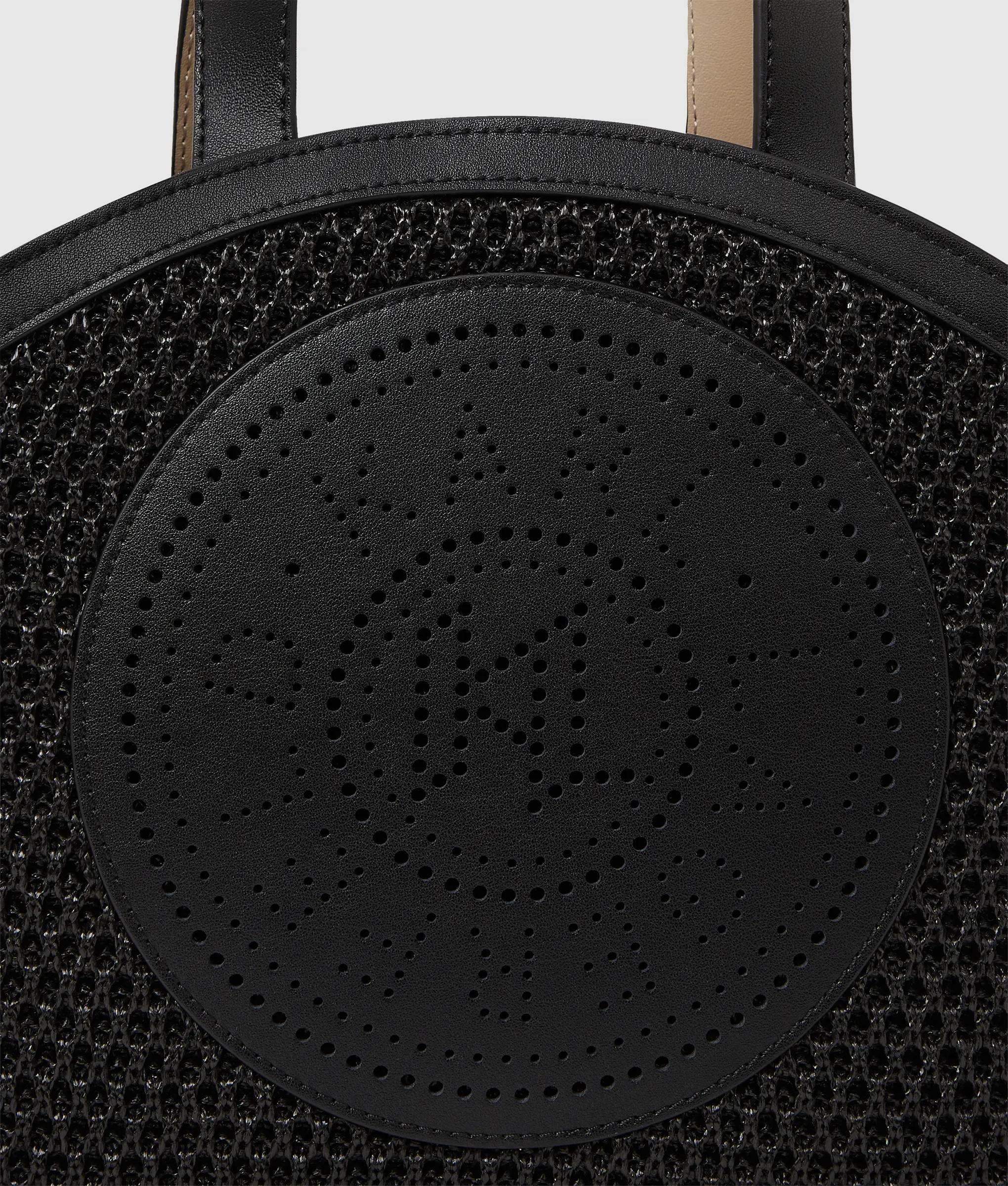 Un acabado de malla tejida le da un toque especial a este pequeño bolso tote adornado con el icónico diseño perforado Circle. Su versátil correa cruzada permite lucir un estilo desenfadado, de día o de noche.