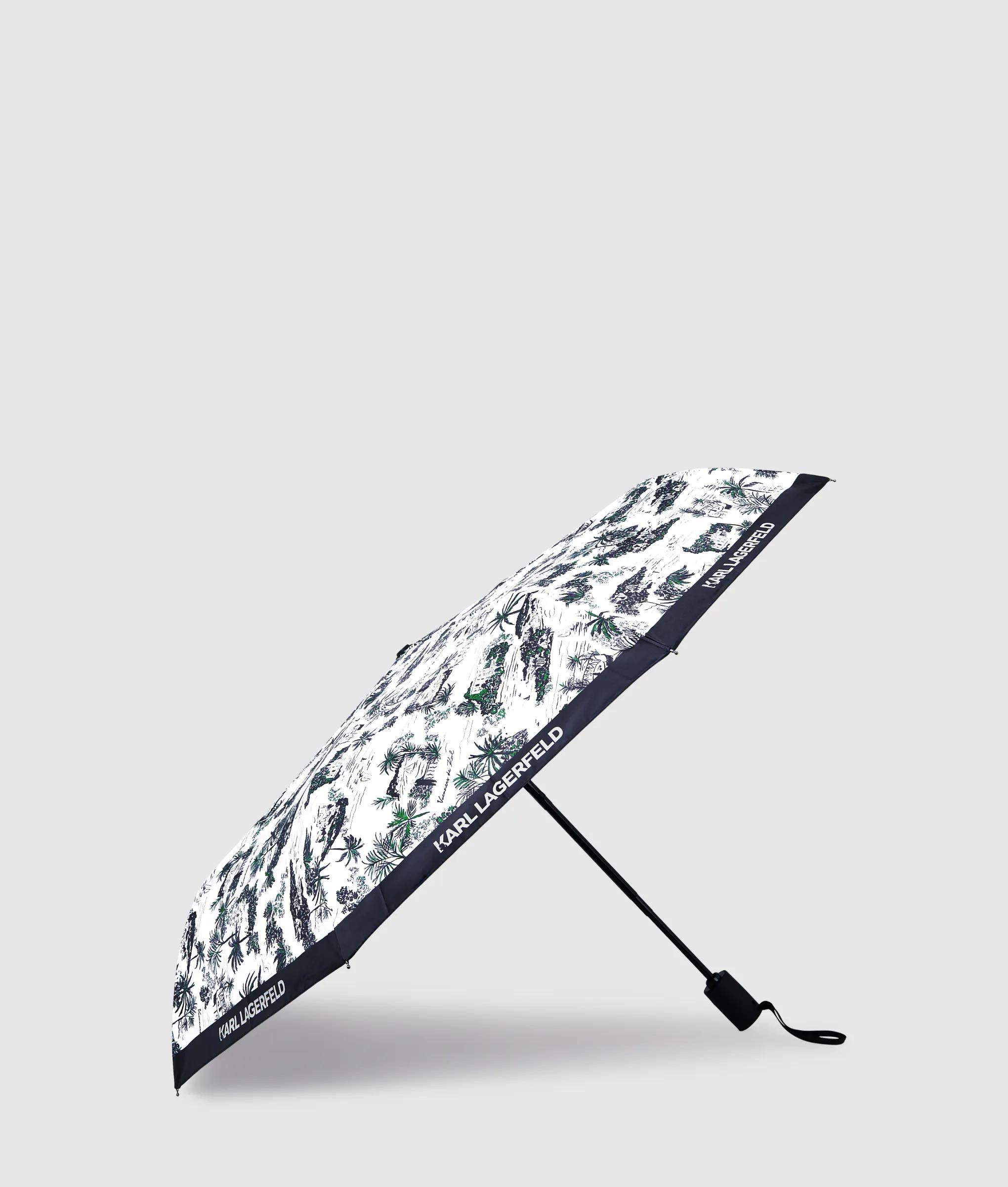 Un paraguas pequeño con fácil apertura automática, adornado con un exuberante estampado de jardín tropical y un discreto logotipo KARL LAGERFELD. Perfecto para darle estilo a los días lluviosos con un encanto refinado.