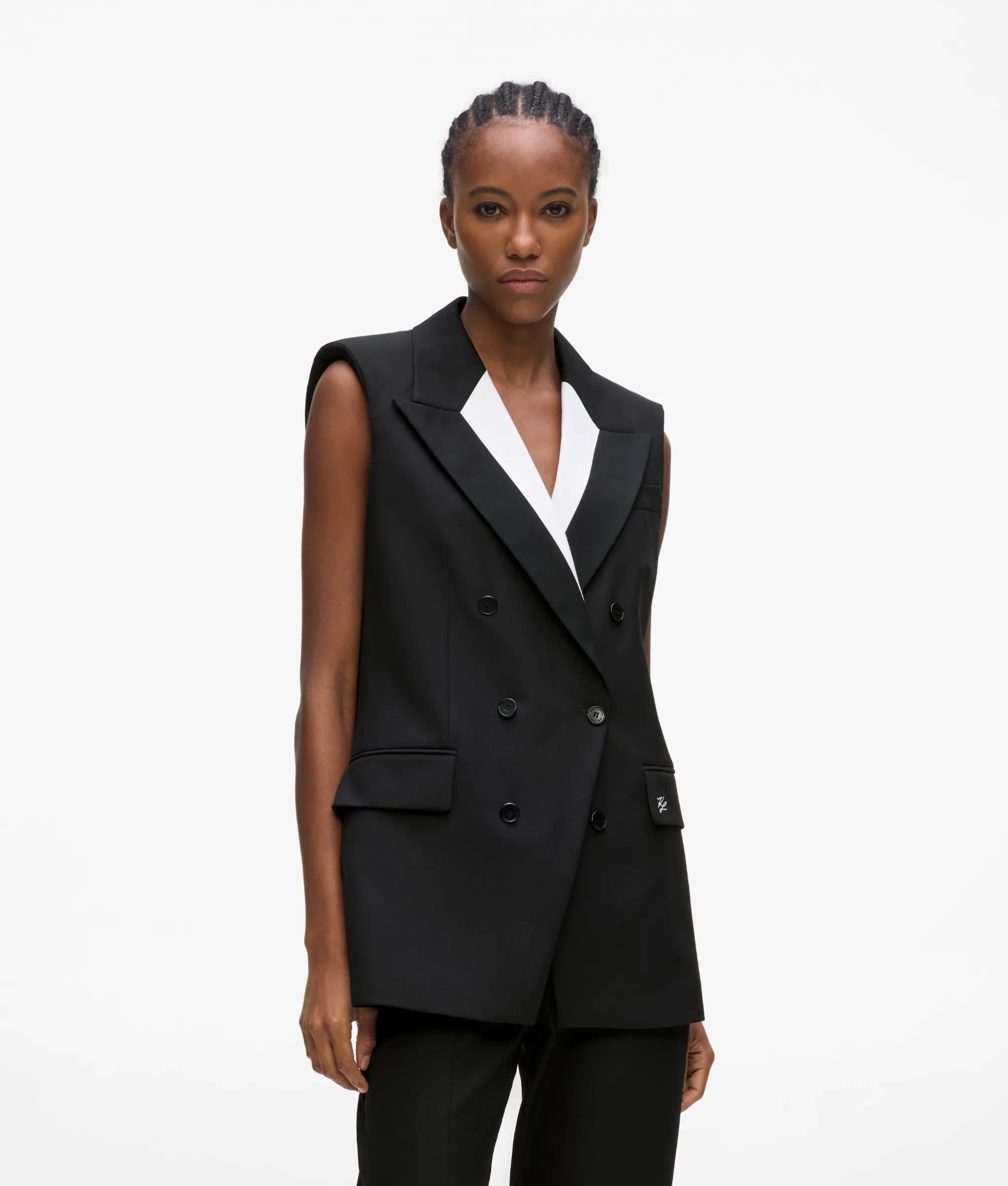 este chaleco es la esencia de KARL LAGERFELD. Los hombros acolchados le dan una forma definida, mientras que los detalles blancos en contraste resaltan el diseño.
