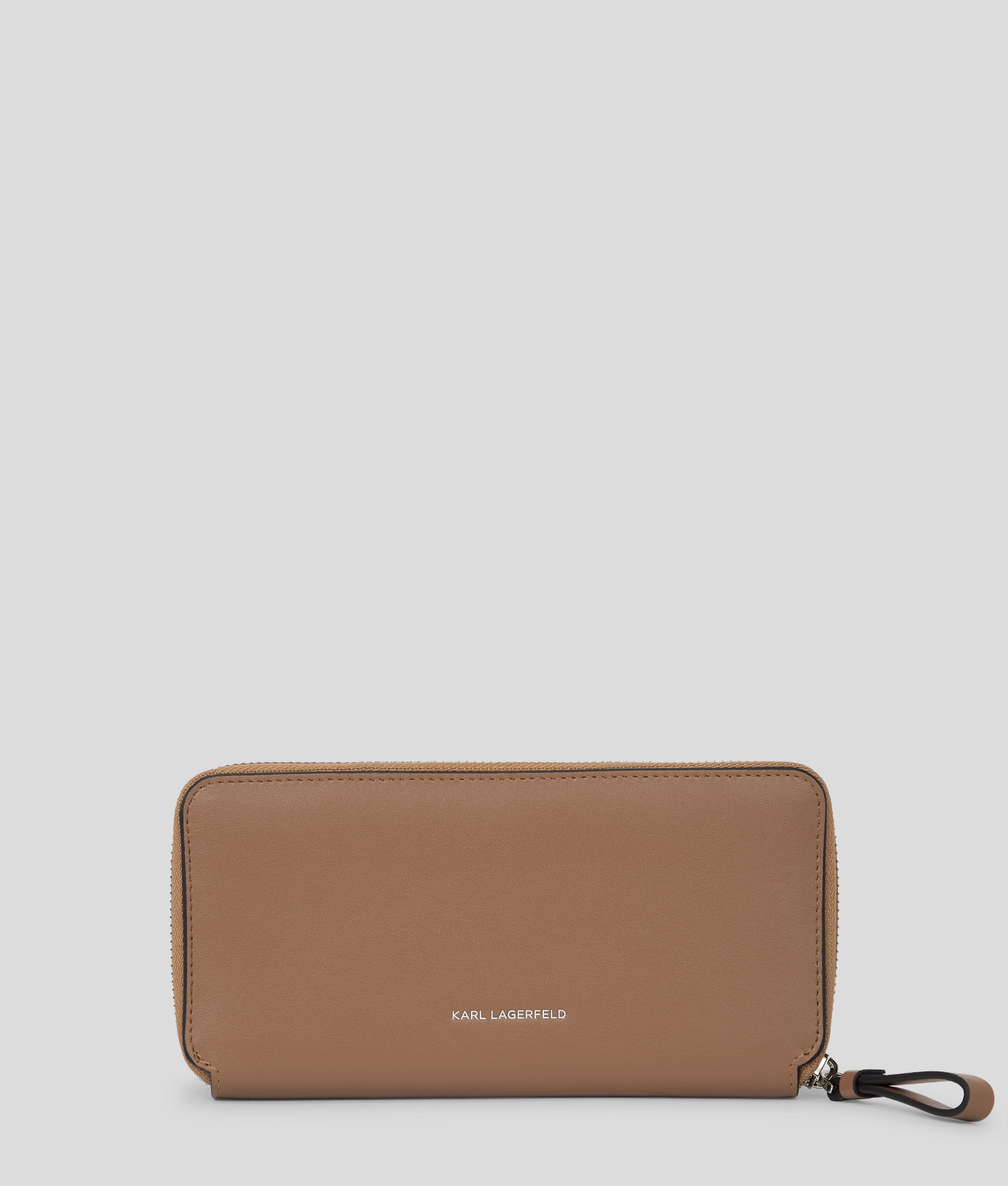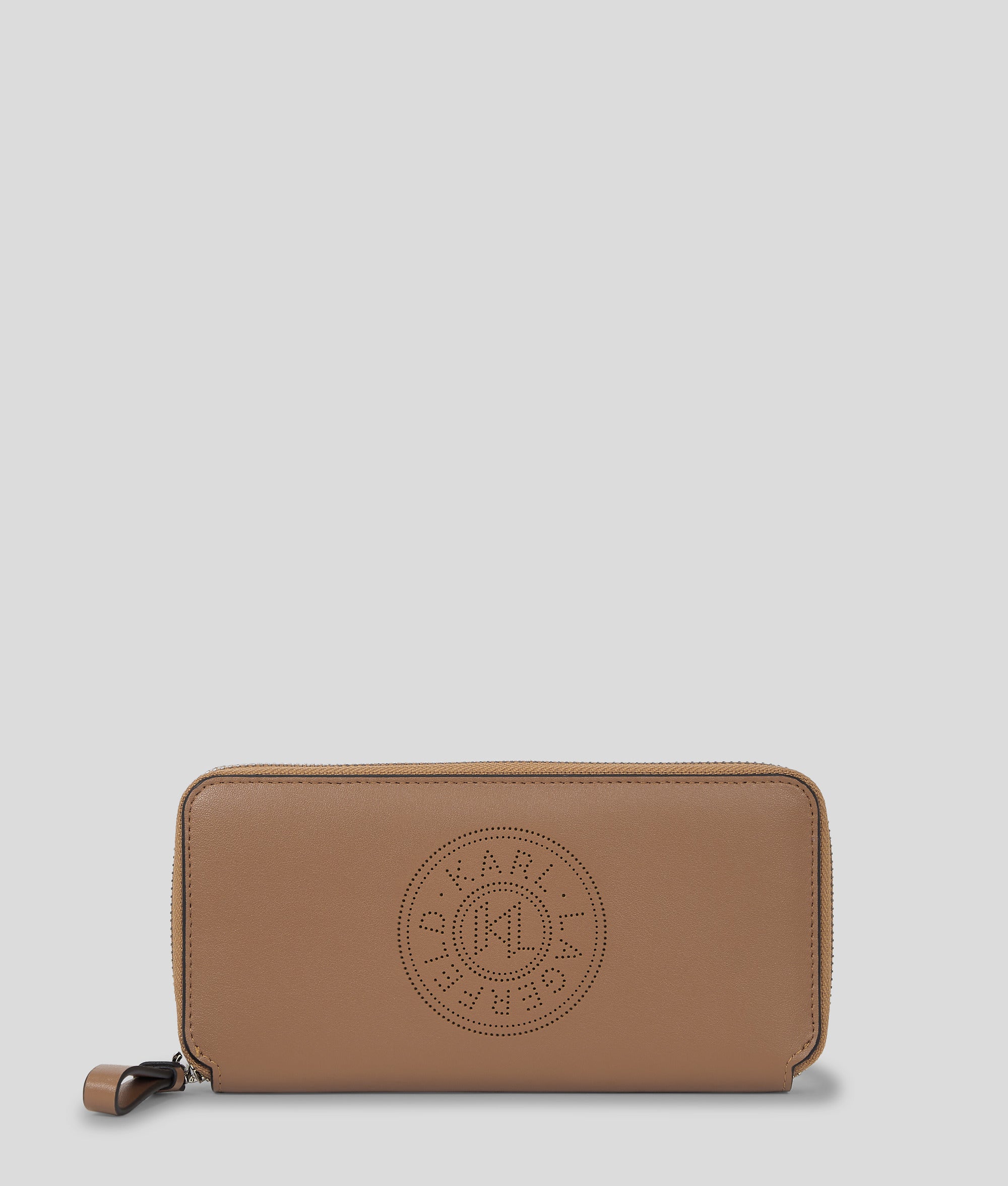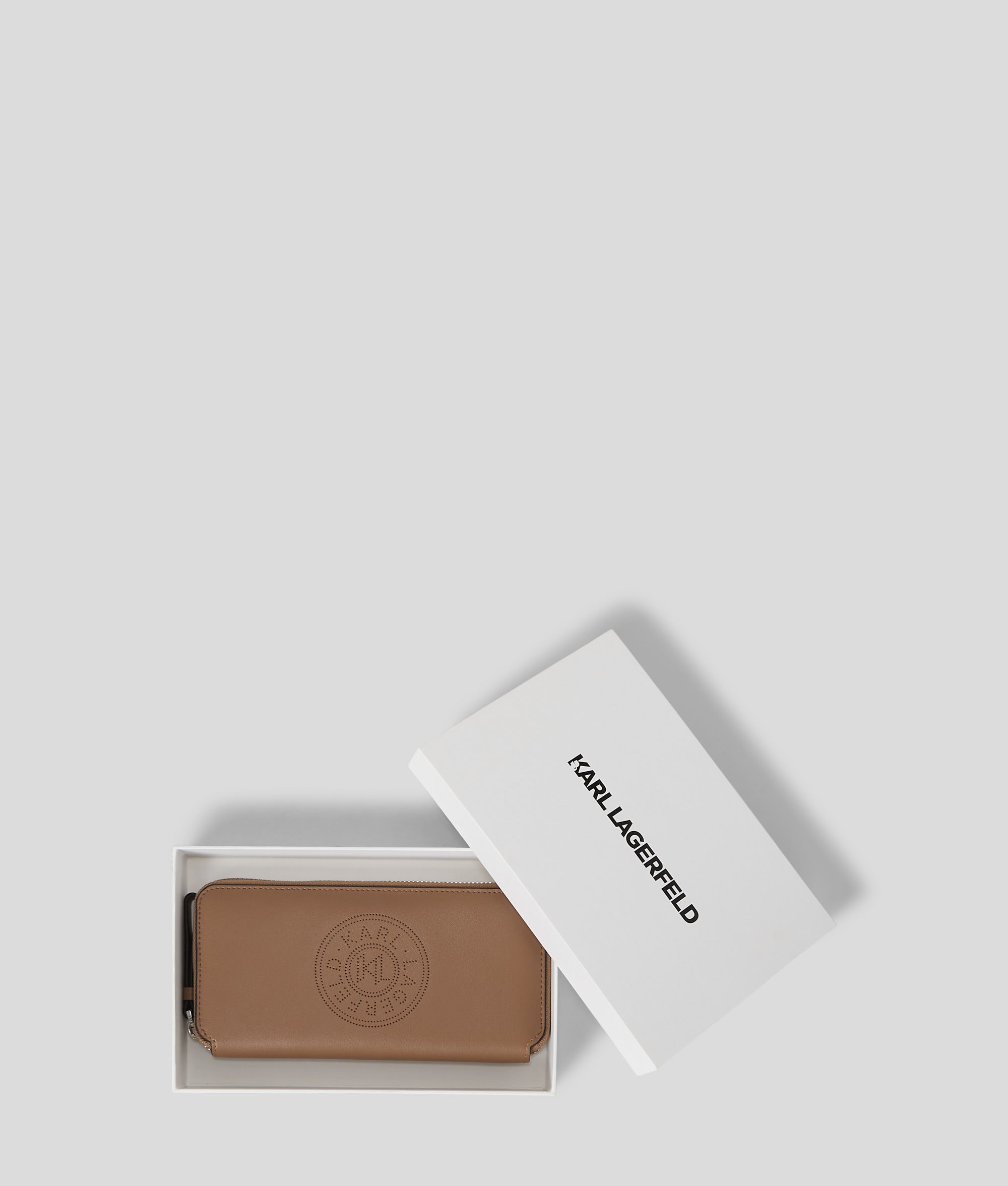 Élégant et fonctionnel, ce portefeuille à deux volets est doté d'une fermeture à glissière sur tout le tour pour un rangement sécurisé. L'organisation est sans effort avec plusieurs compartiments intérieurs et fentes pour cartes, tandis que le logo KARL Circle perforé ajoute une touche de style distinctif.