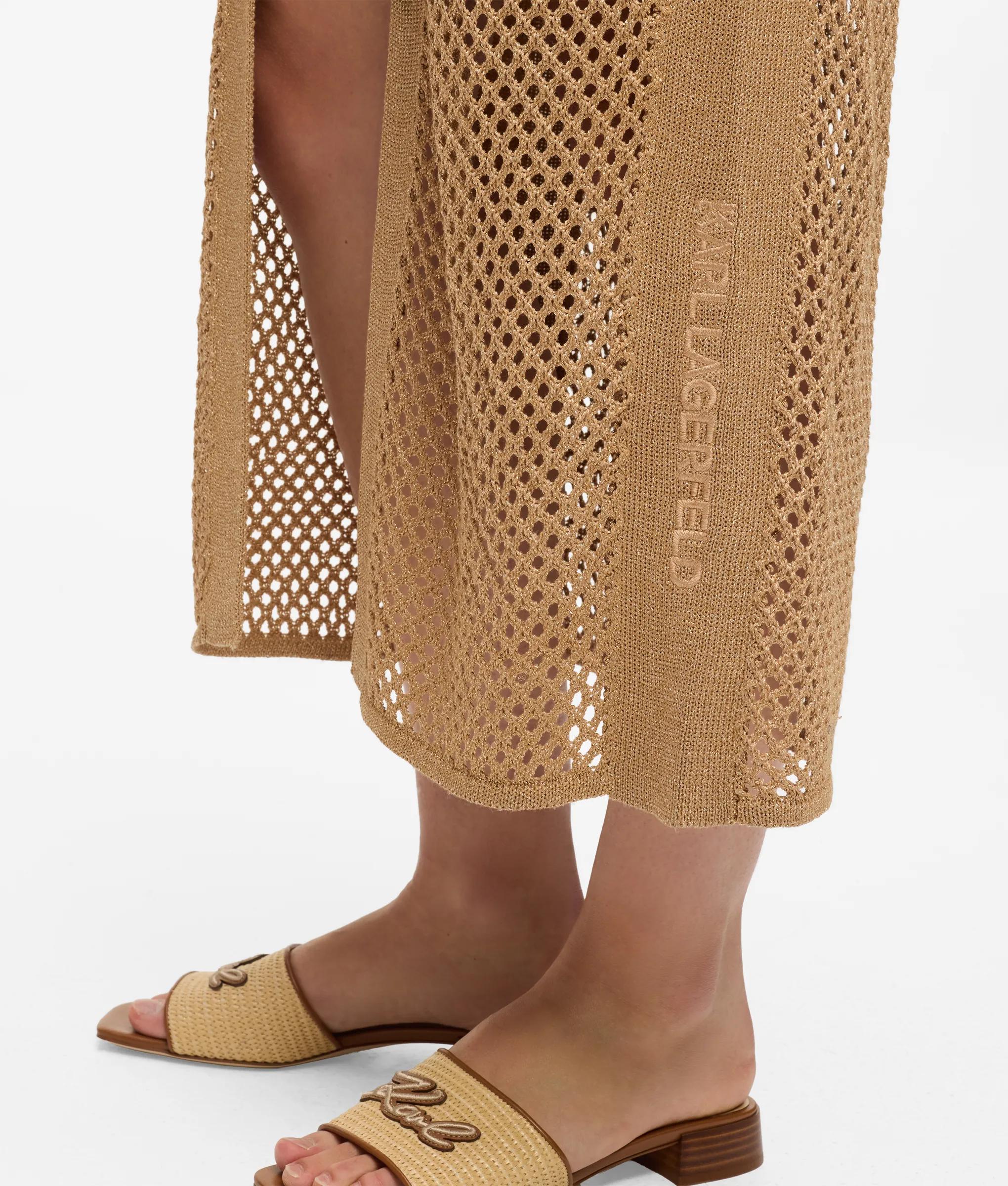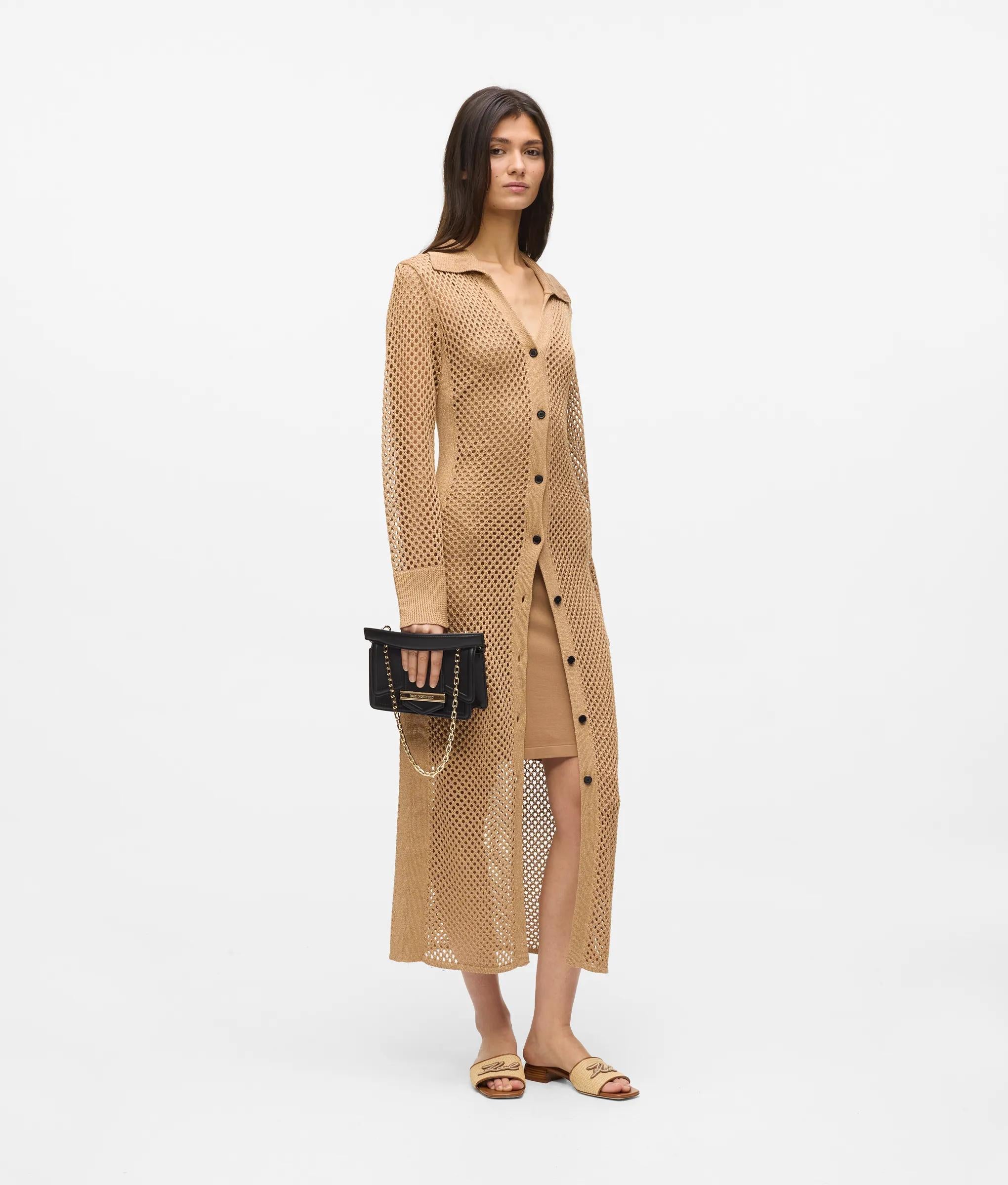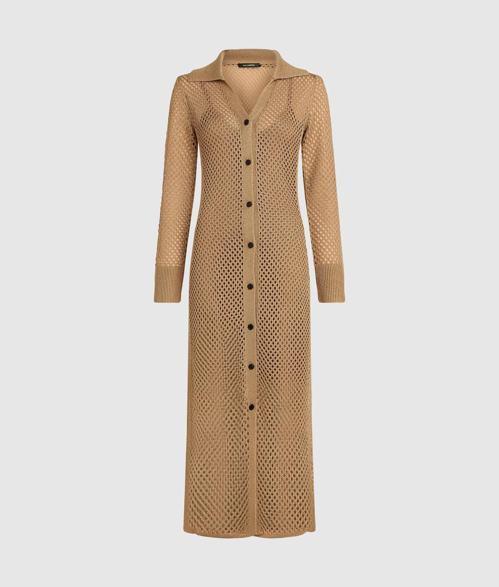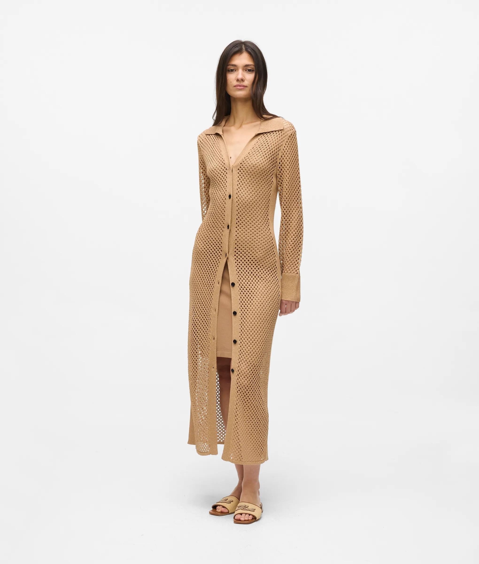 Scintillante à chaque mouvement, cette robe en crochet métallisé captera l'éclat des soirées d'été sur la Côte d'Azur. Ce modèle à manches longues se porte en superposition sur une robe nuisette amovible, tandis que les boutons contrastés et la broderie à logo Signature lui ajoutent des finitions raffinées.