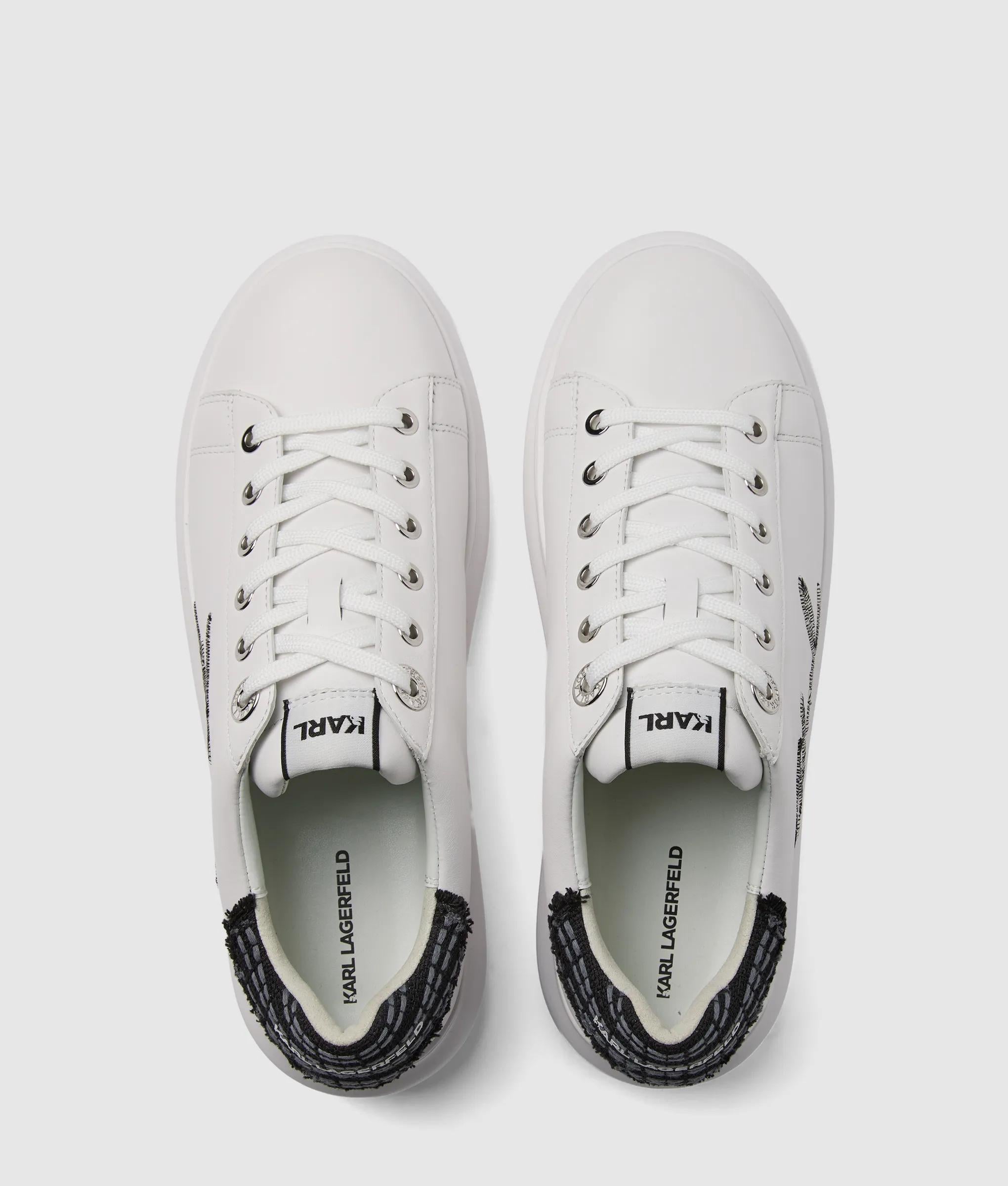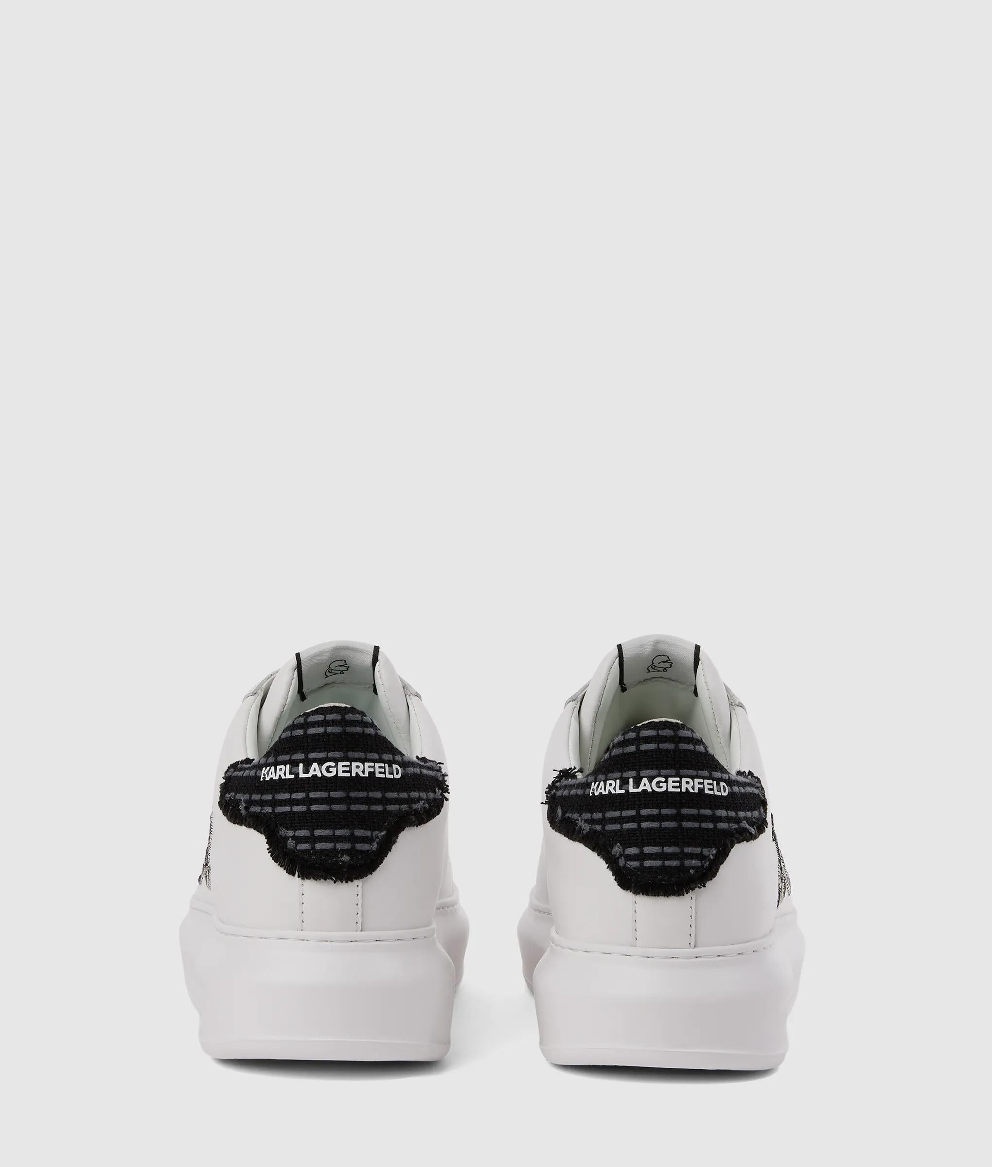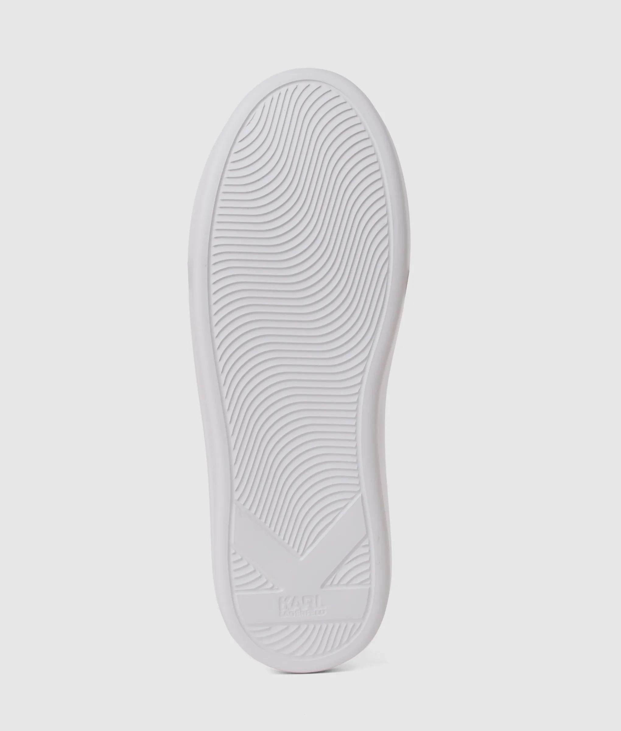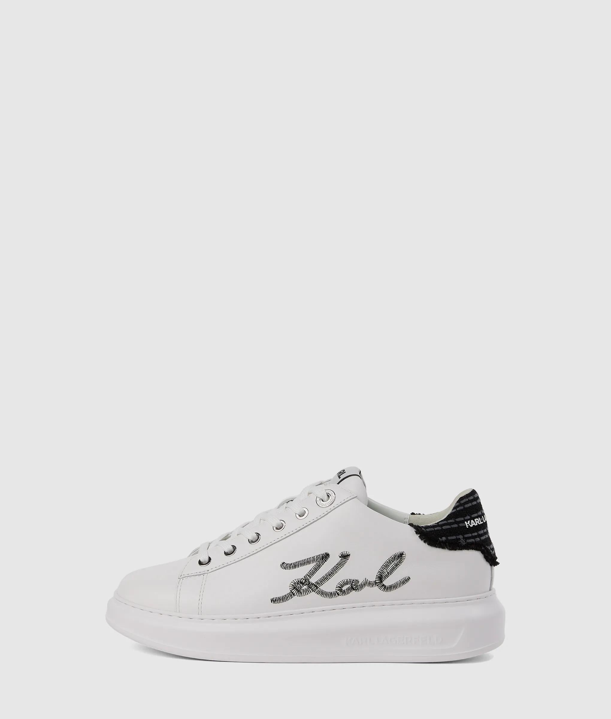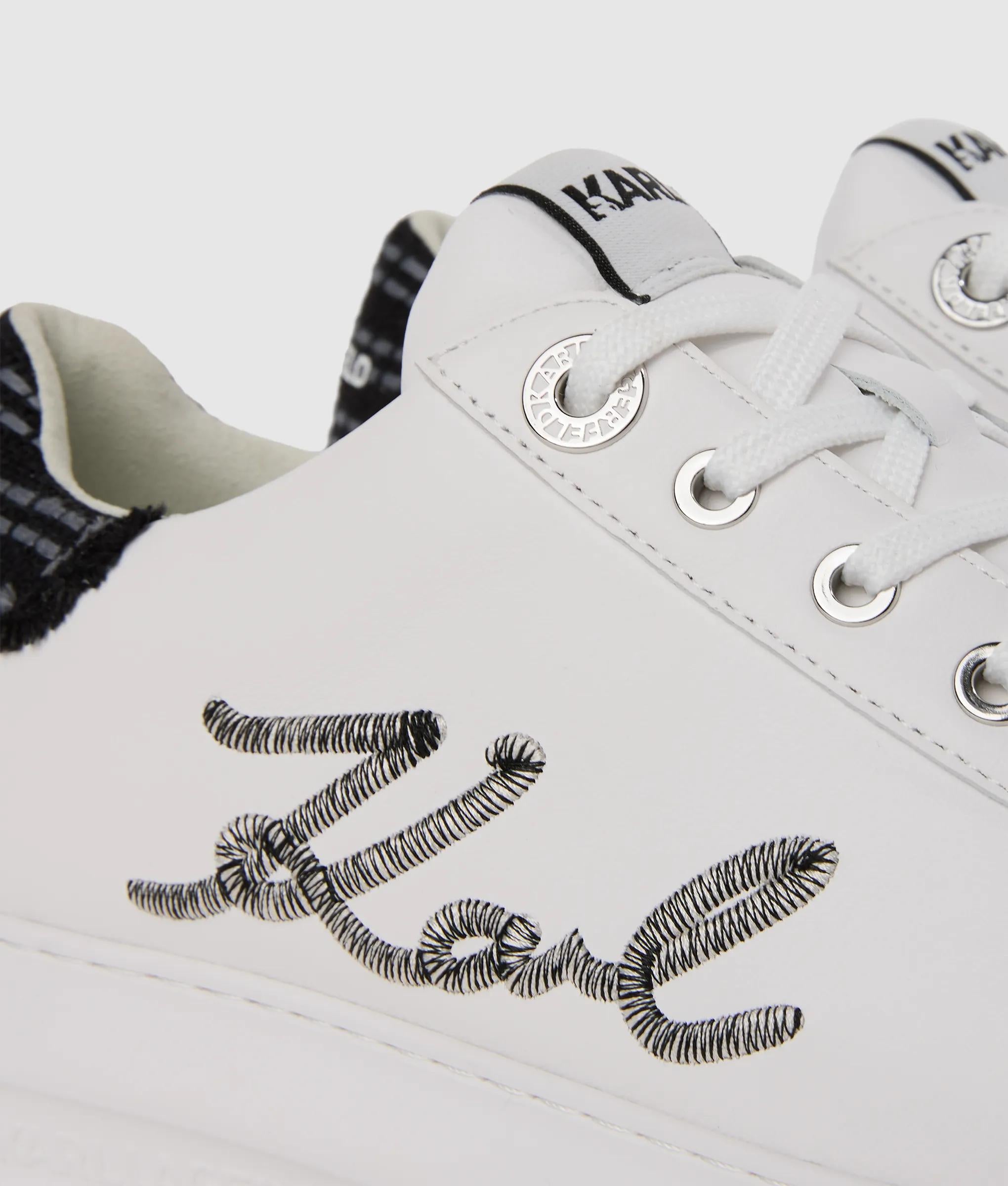 Ces baskets à lacets redéfinissent le chic décontracté avec un talon en bouclé texturé et une broderie audacieuse signée Karl signature. Le cuir lisse ajoute une touche raffinée à un style urbain remarquable.