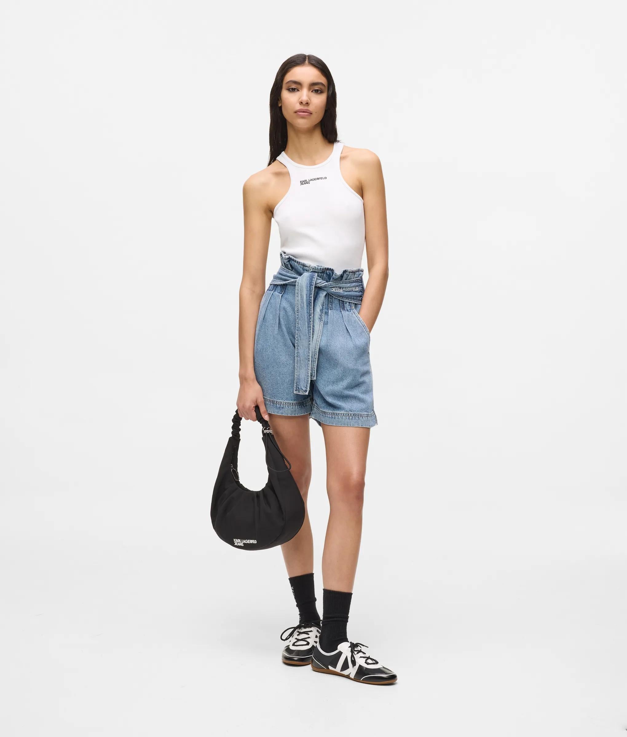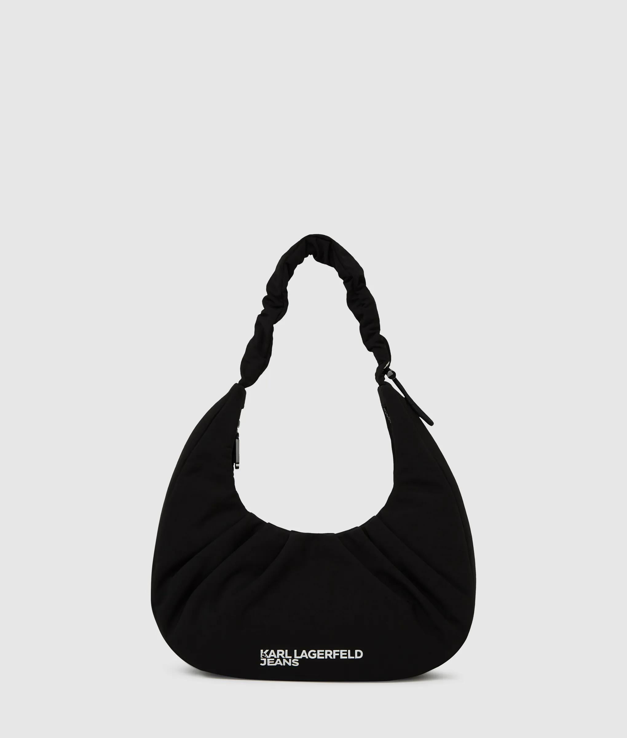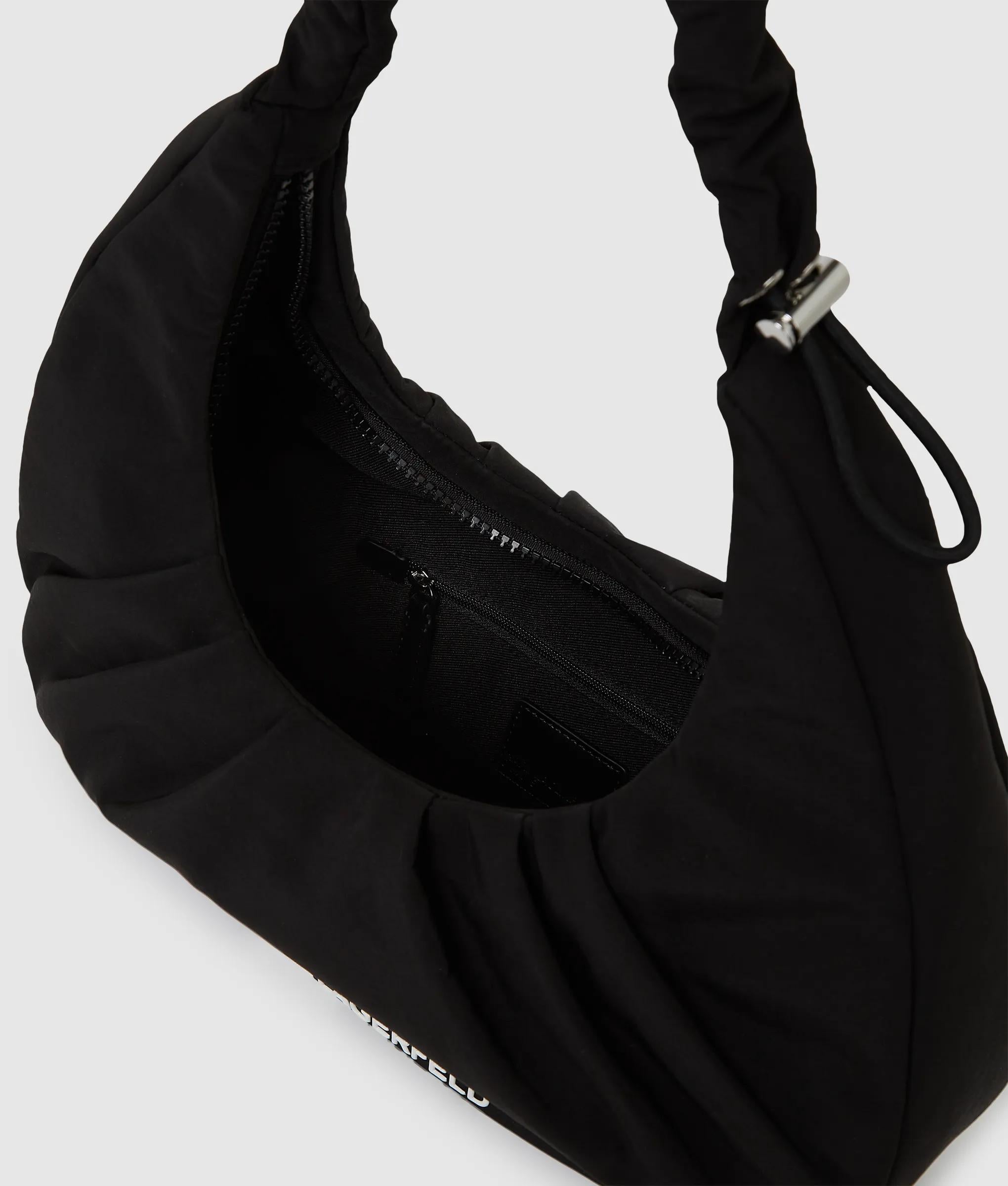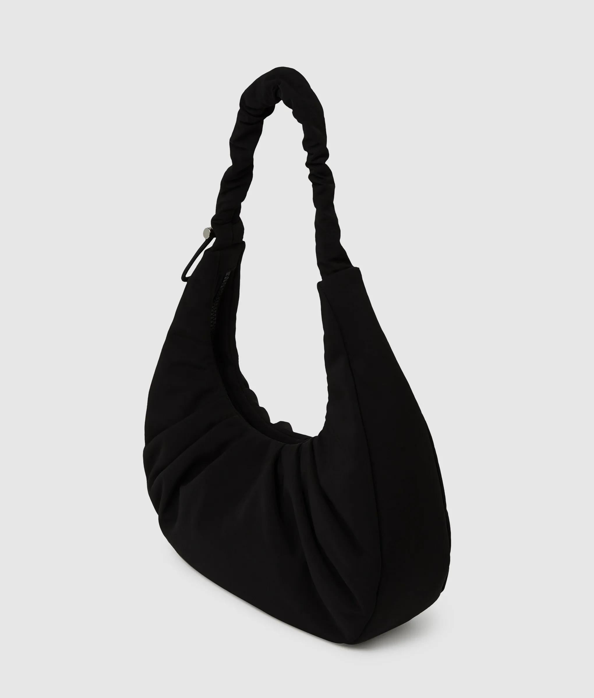 Alliant raffinement et allure urbaine, ce sac hobo stylé présente un effet froncé dynamique et une sangle plissée avec un cordon de serrage élastique et une boucle métallique pour un ajustement parfait.