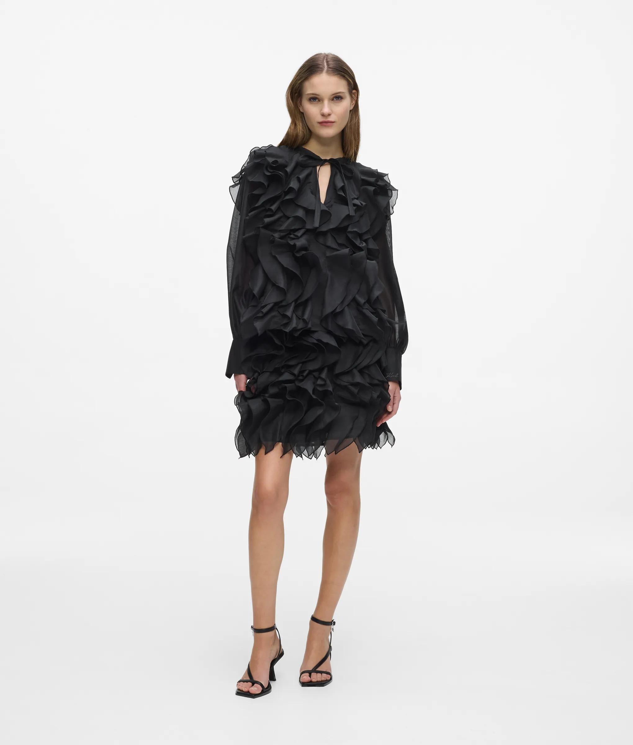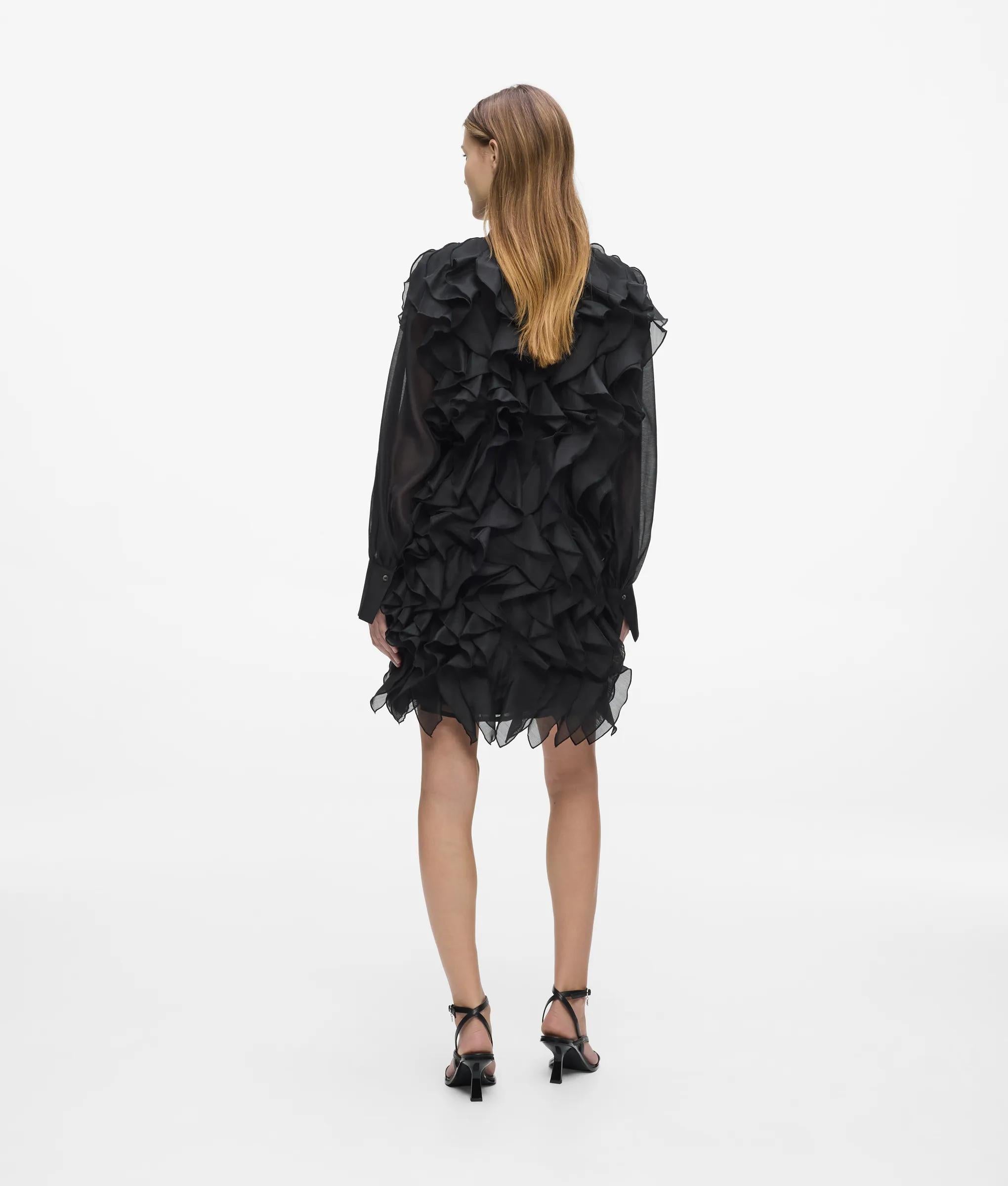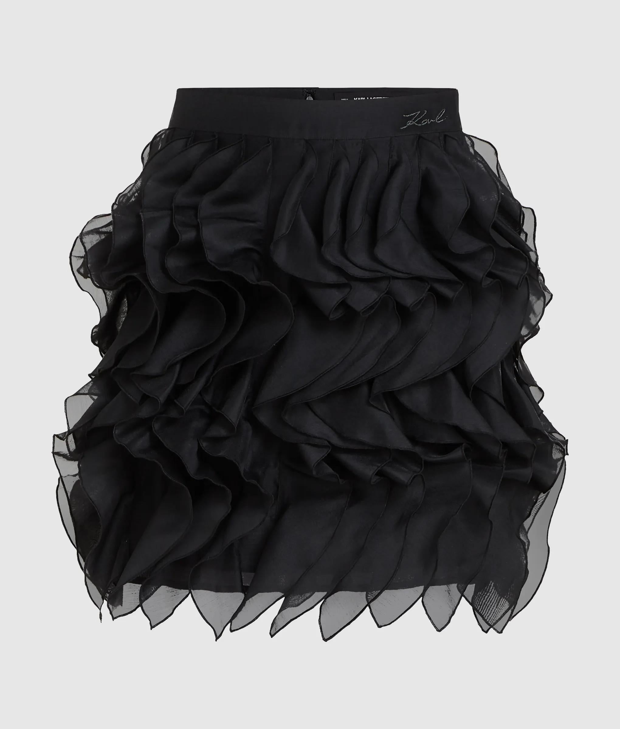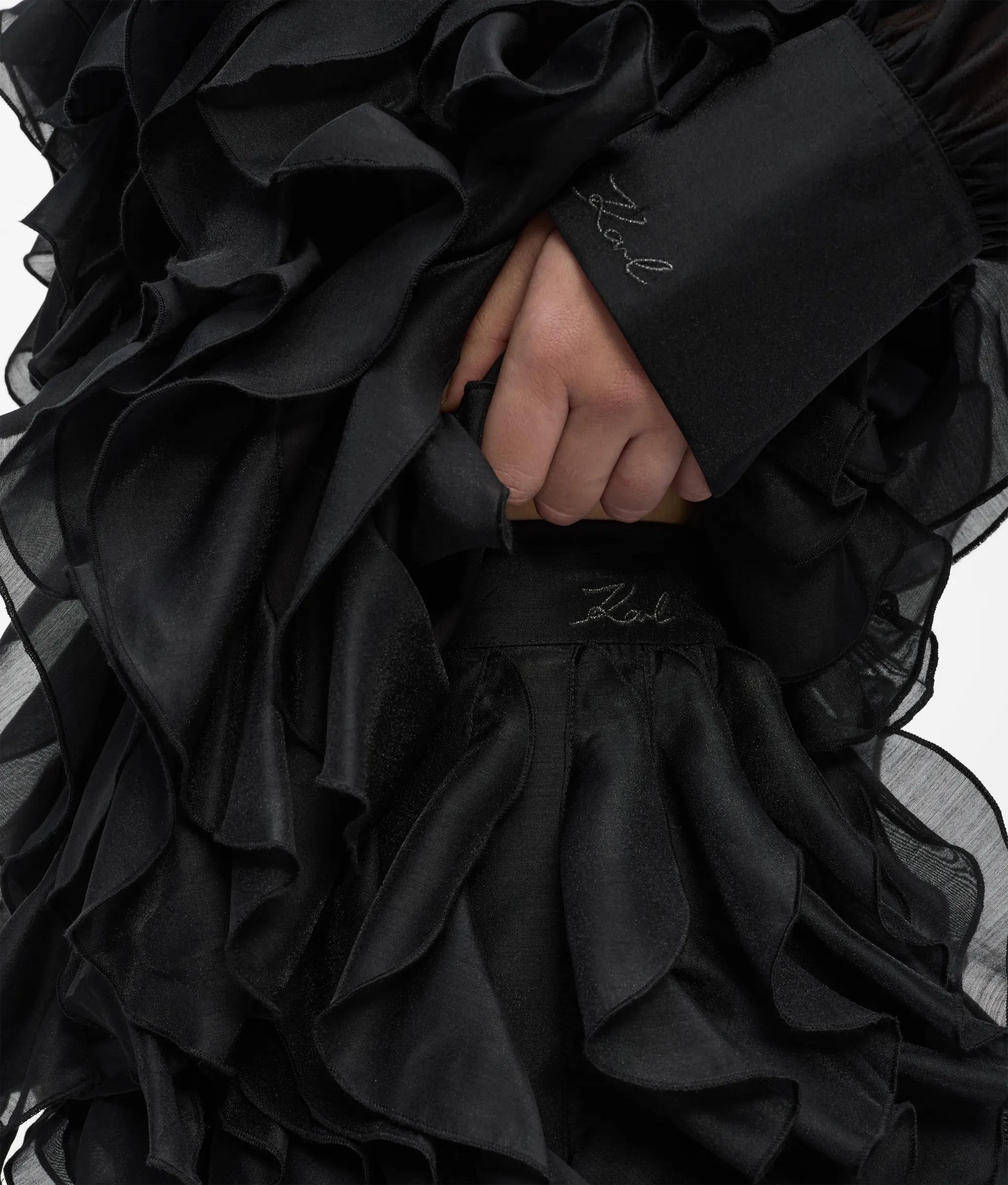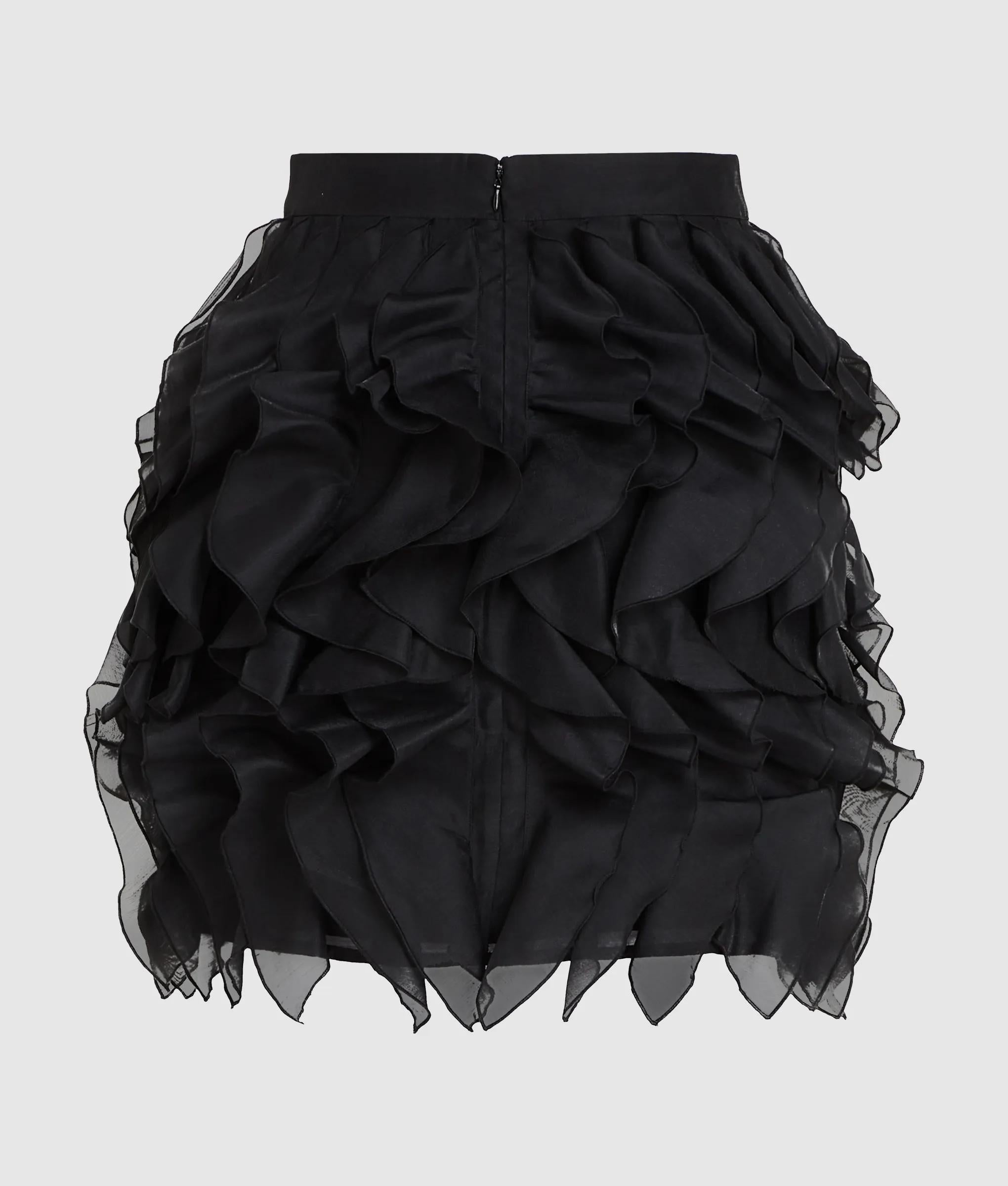 Cette mini-jupe qui attire tous les regards, ornée de cascades de volants en organza scintillants, apporte une théâtralité élégante à toutes les occasions. Portez-la avec une chemise blanche impeccable pour un look ludique et raffiné ou avec le chemisier assorti pour une allure emblématique.