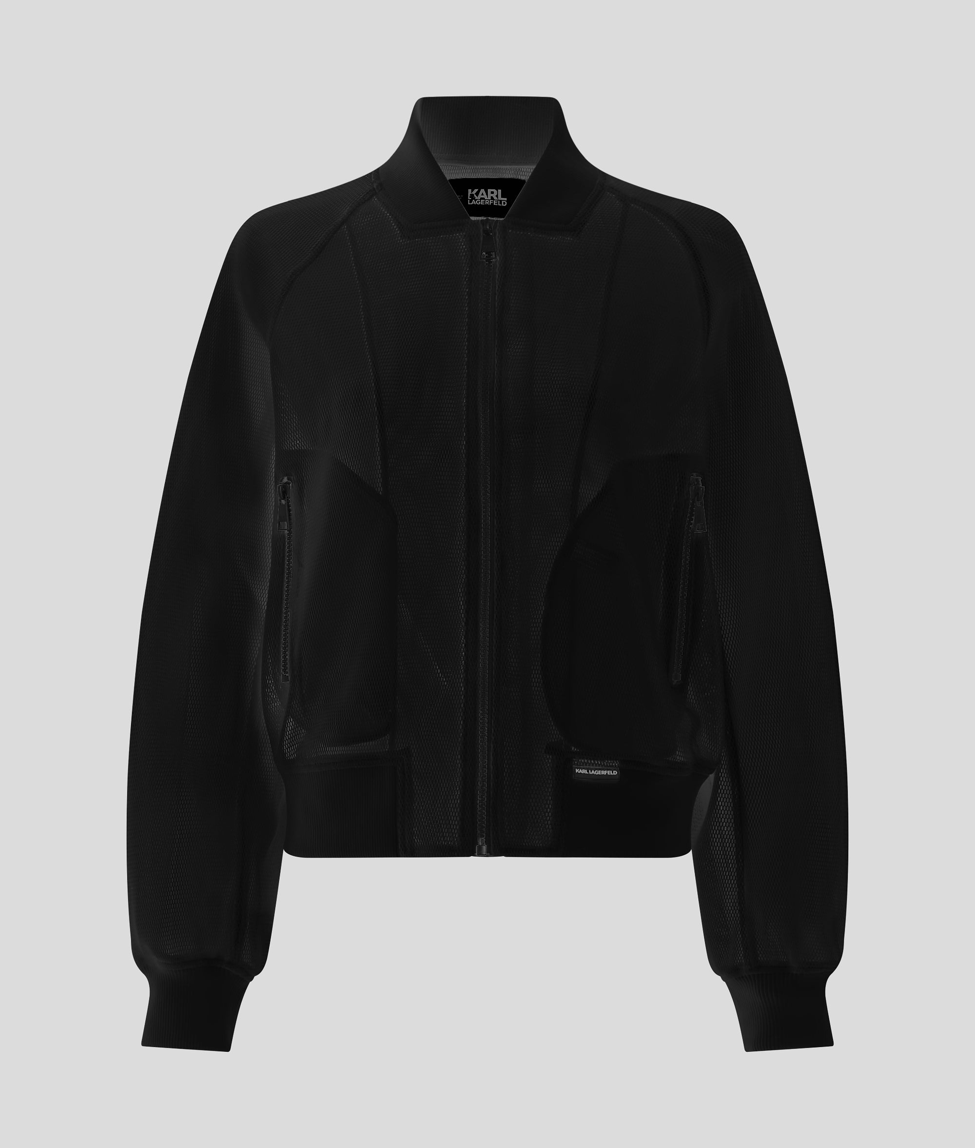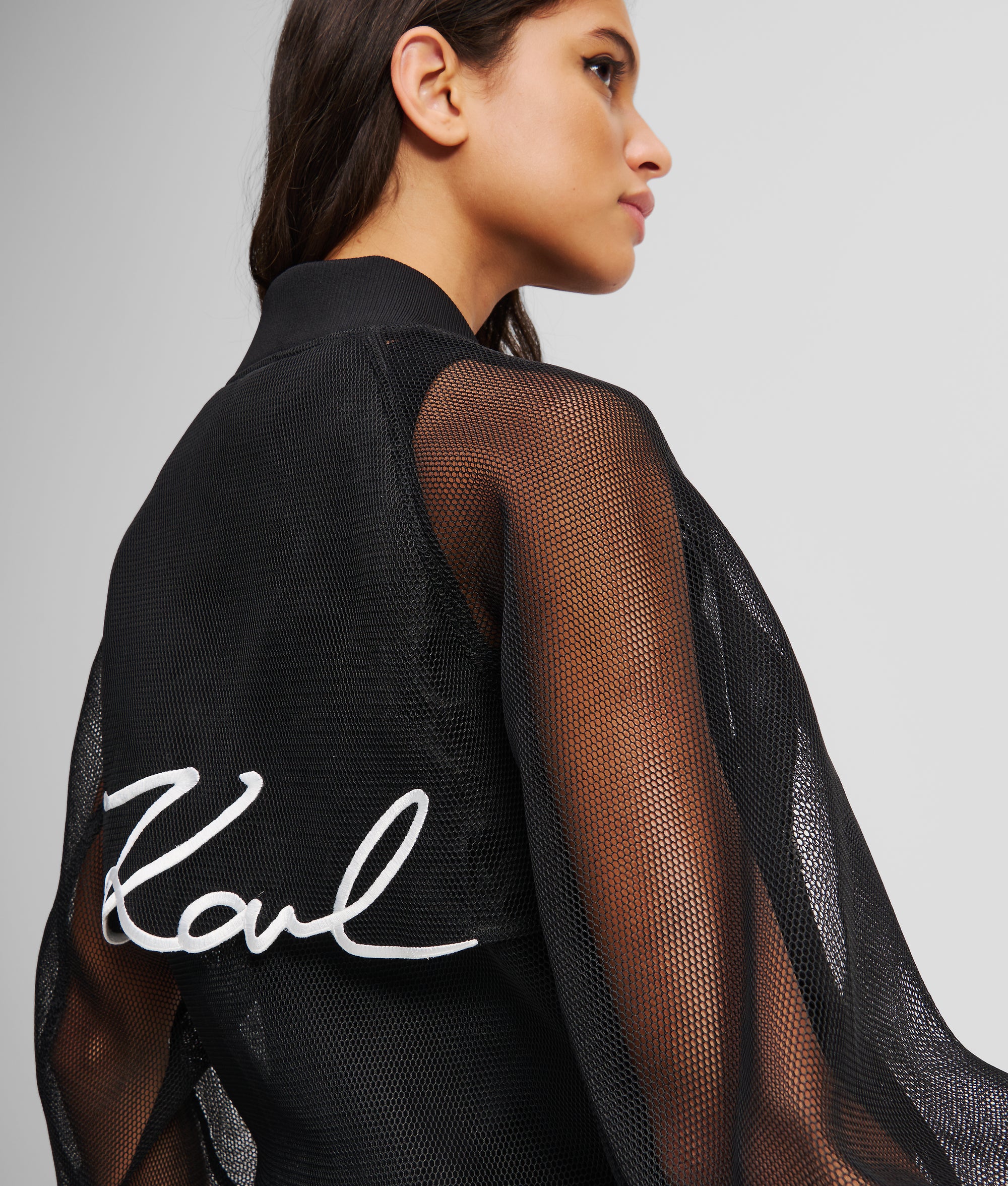 Une touche moderne et stylisée apportée au blouson bombardier classique avec ce design en tricot transparent. La fermeture éclair ton sur ton et le tricot côtelé ajoutent une touche décontractée, et logo KARL SIGNATURE une note de distinction.