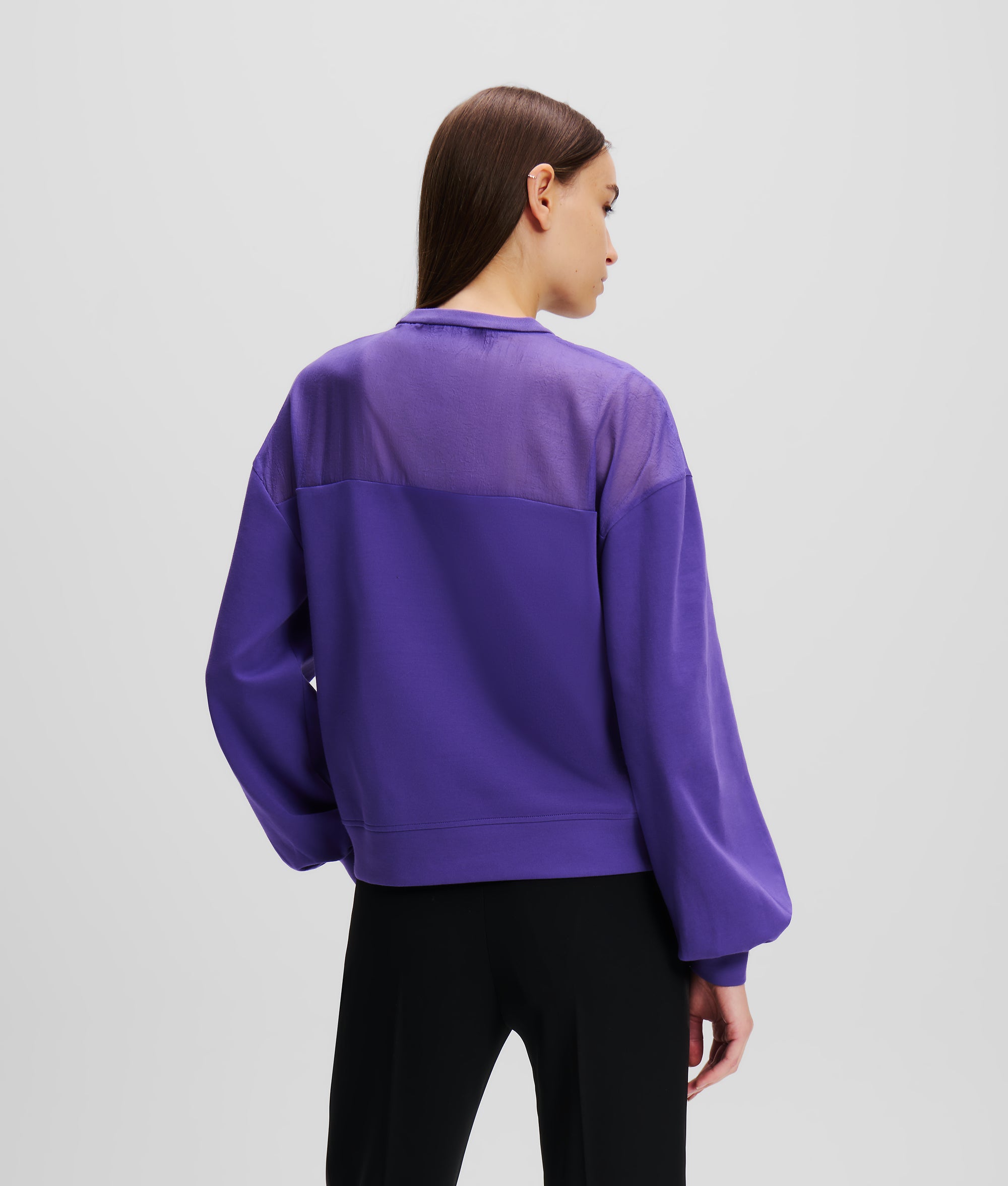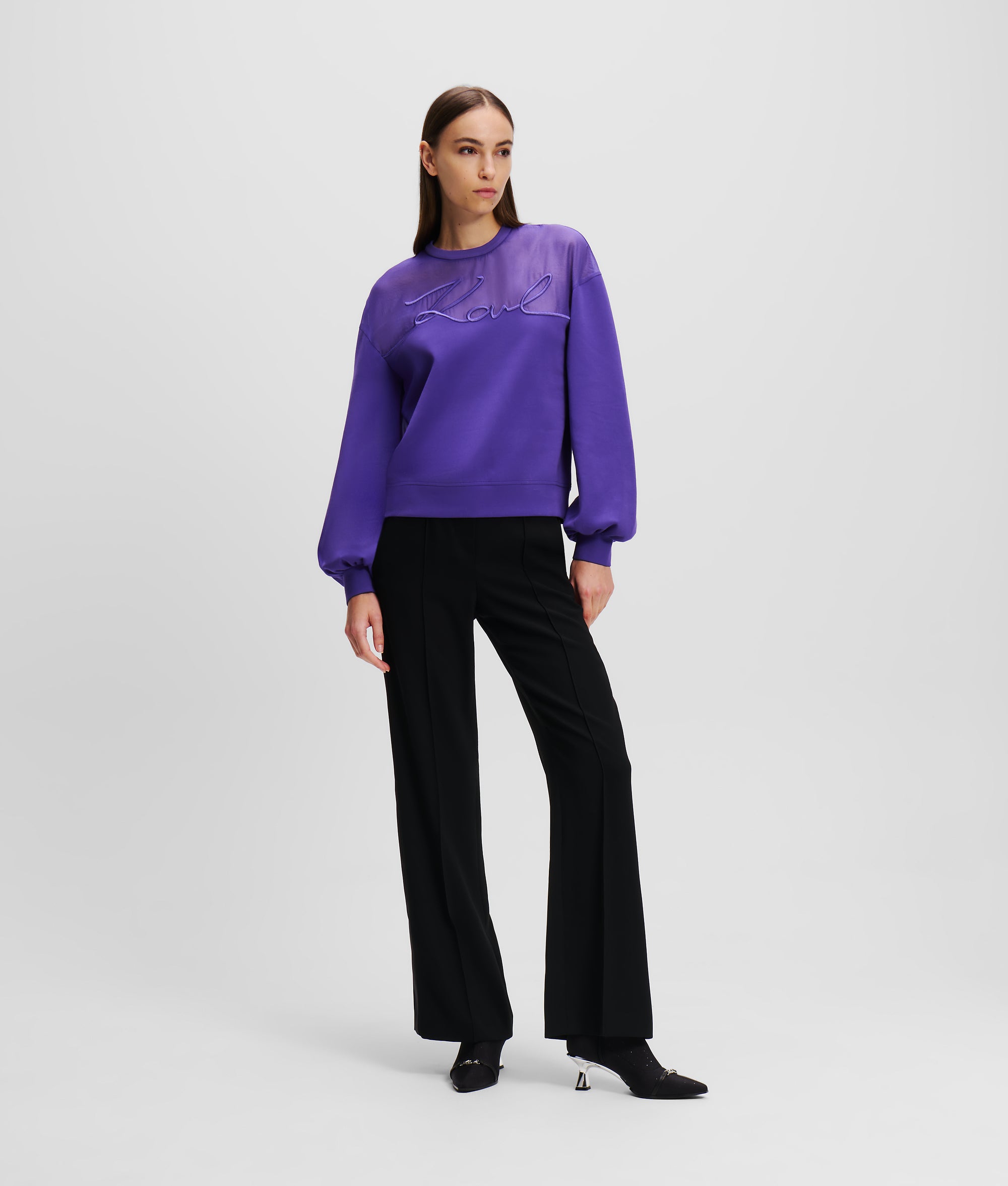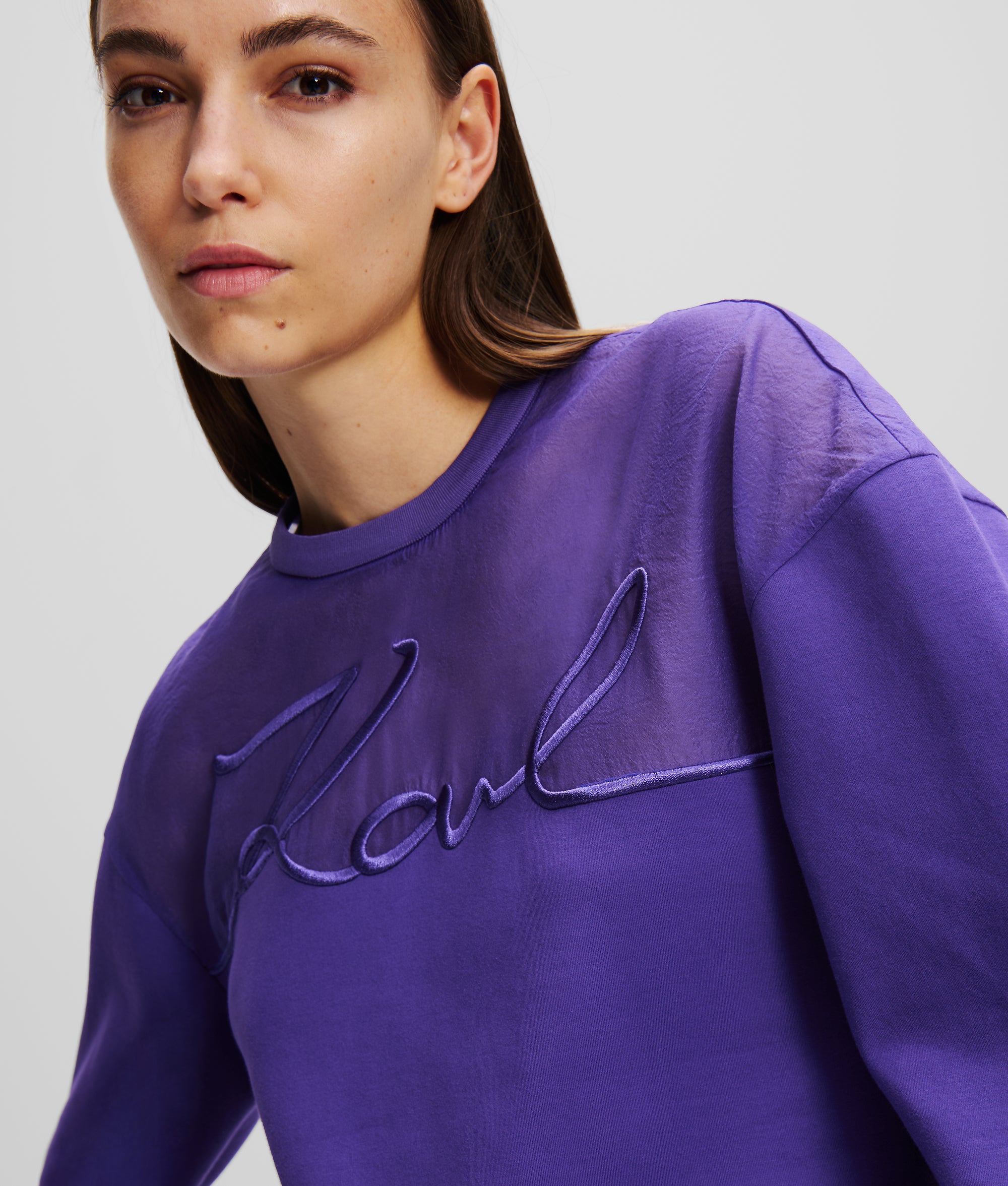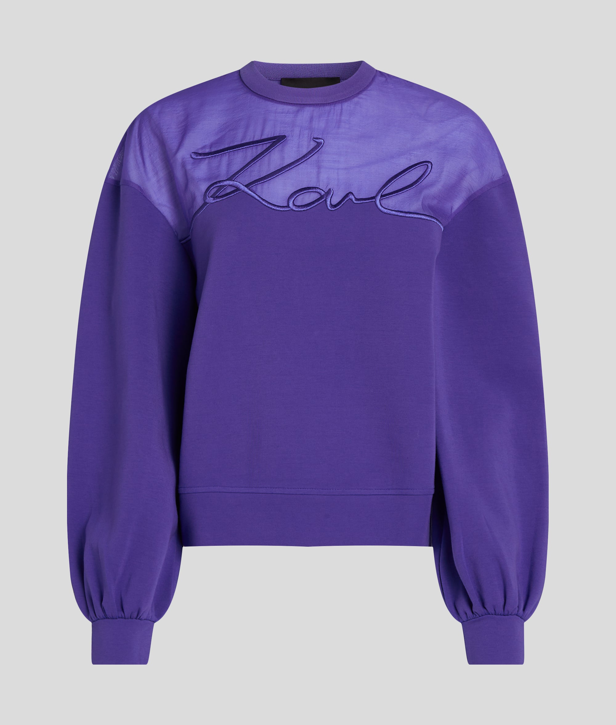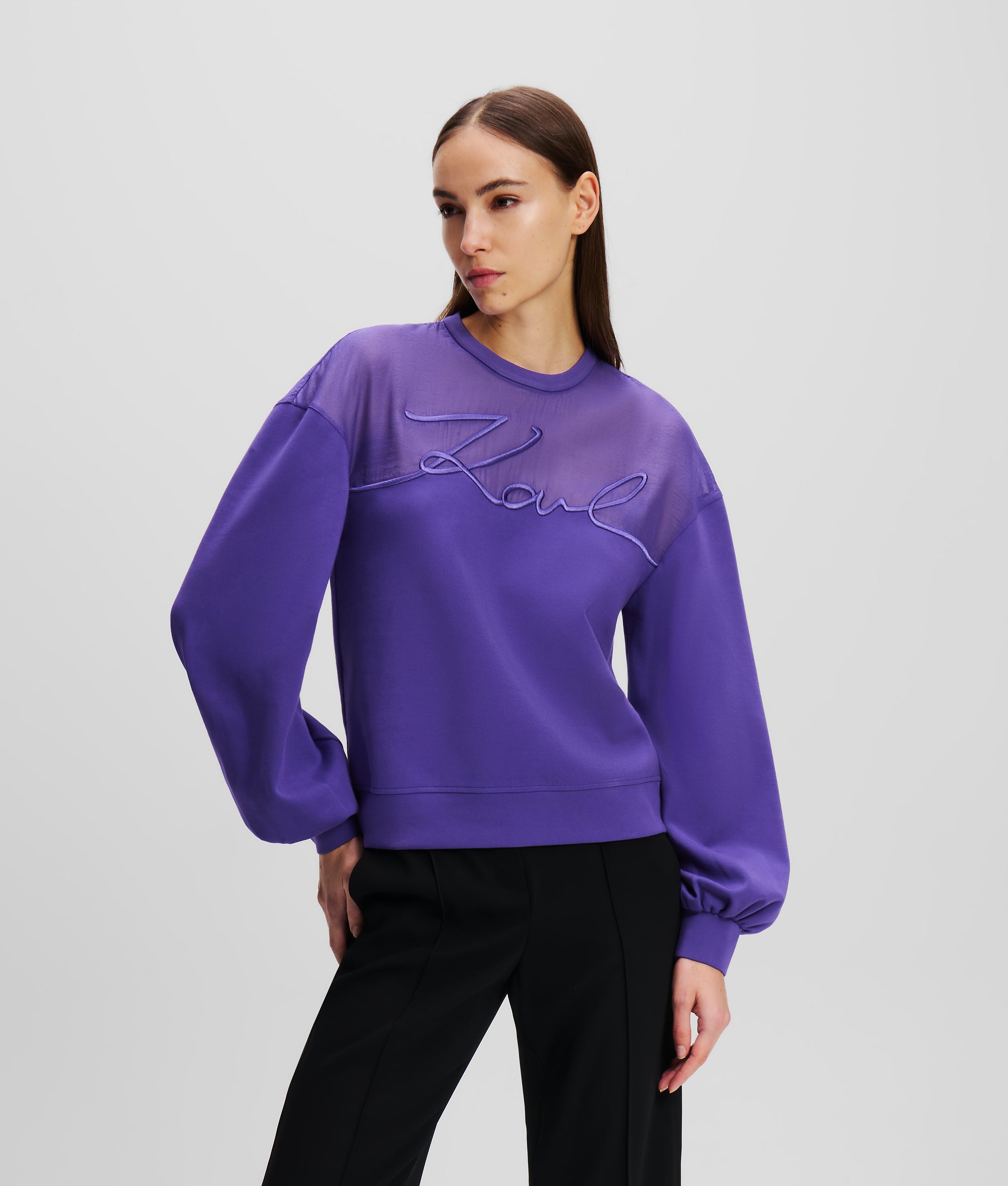 Donando un tocco di eleganza a un capo casual, questa versatile felpa presenta un inserto traspartente in organza e un iconico dettaglio KARL Signature. Elegante e confortevole, è perfetta per aggiungere un tocco casual ai look eleganti da giorno o da sera.