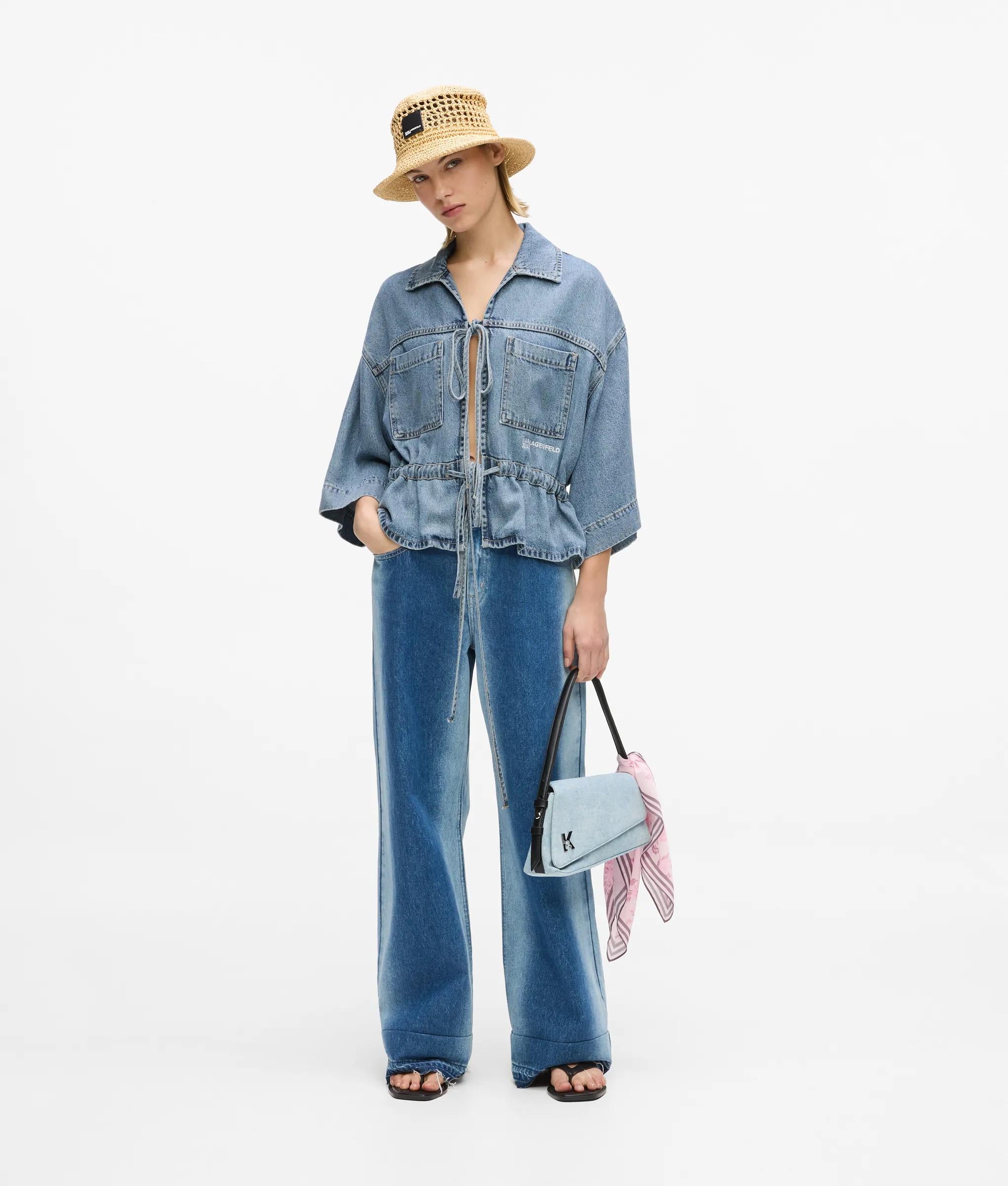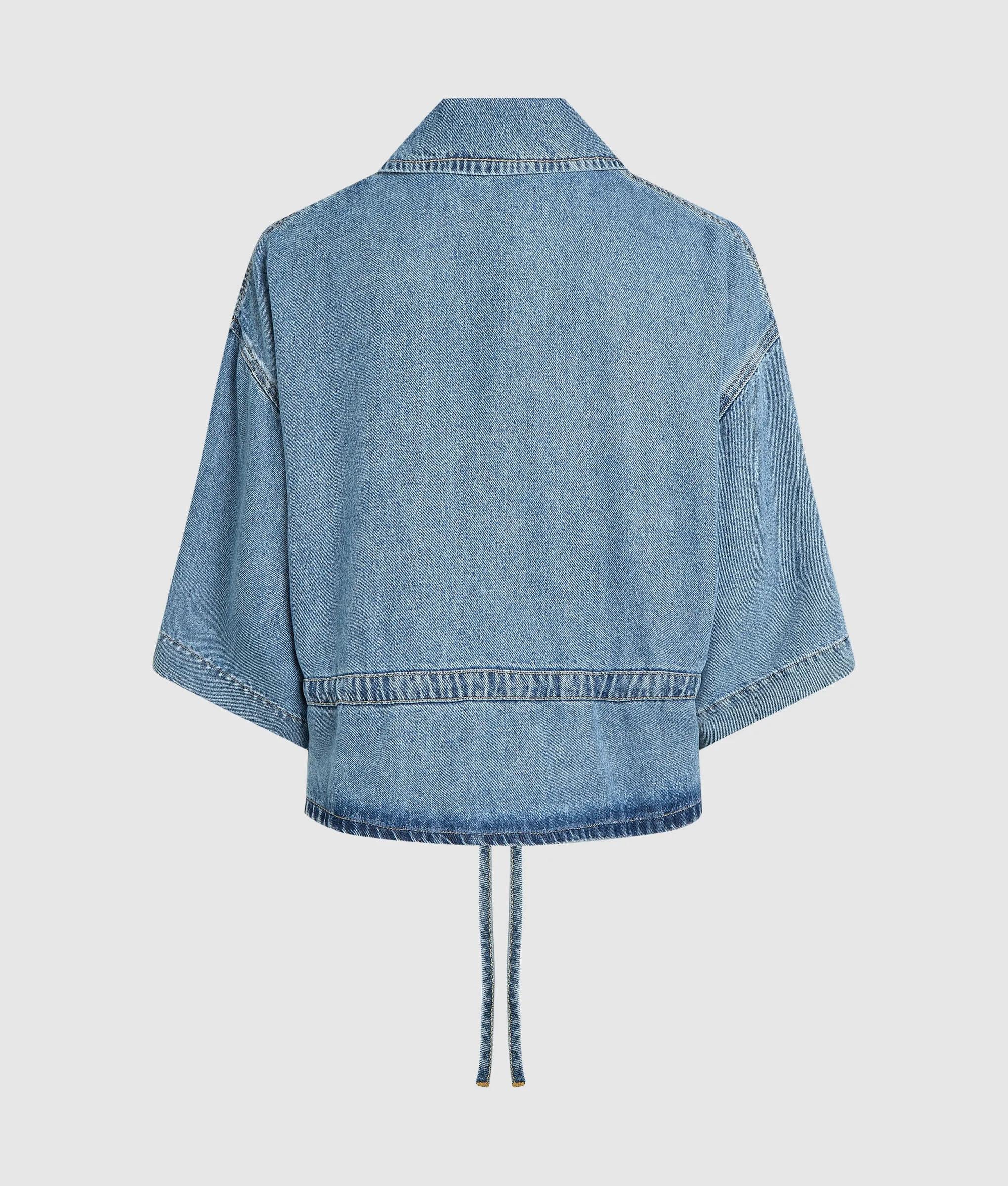 La classica camicia in denim rielaborata per le giornate estive. Questa camicia a maniche corte sostituisce i bottoni con le chiusure con laccetti sul davanti. Il laccetto inferiore regolabile stringe la silhouette, per cambiare look.