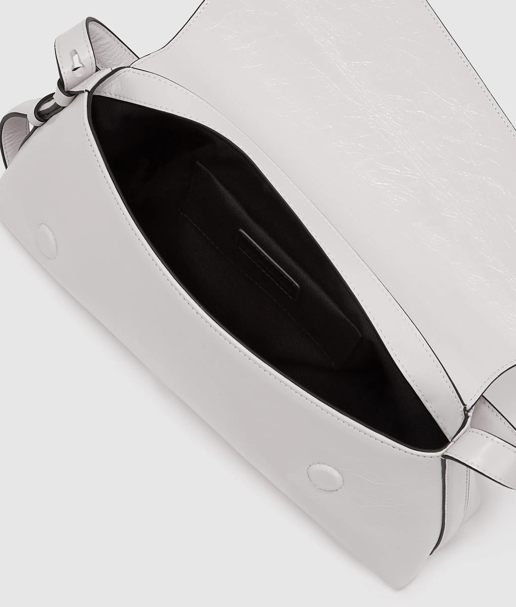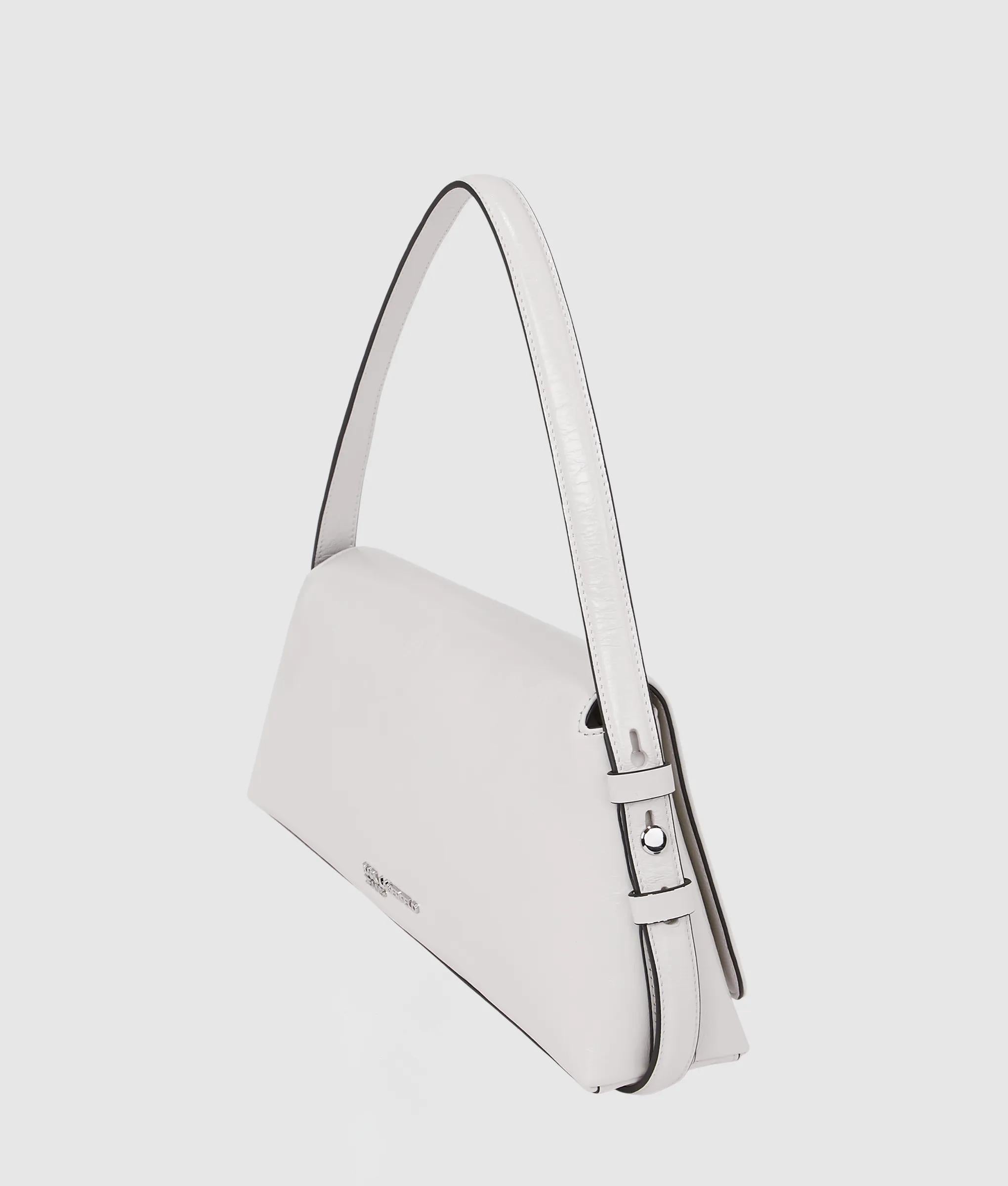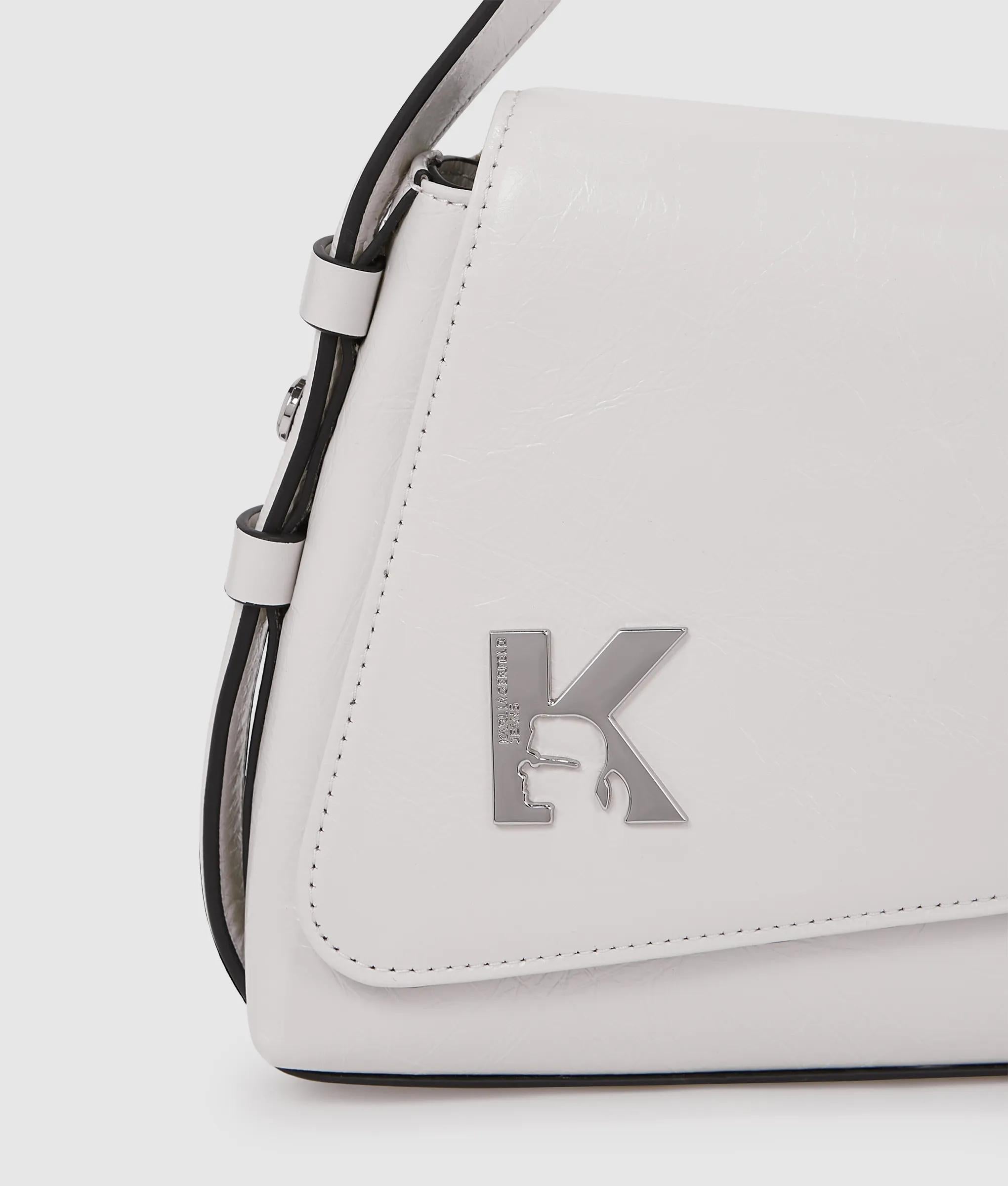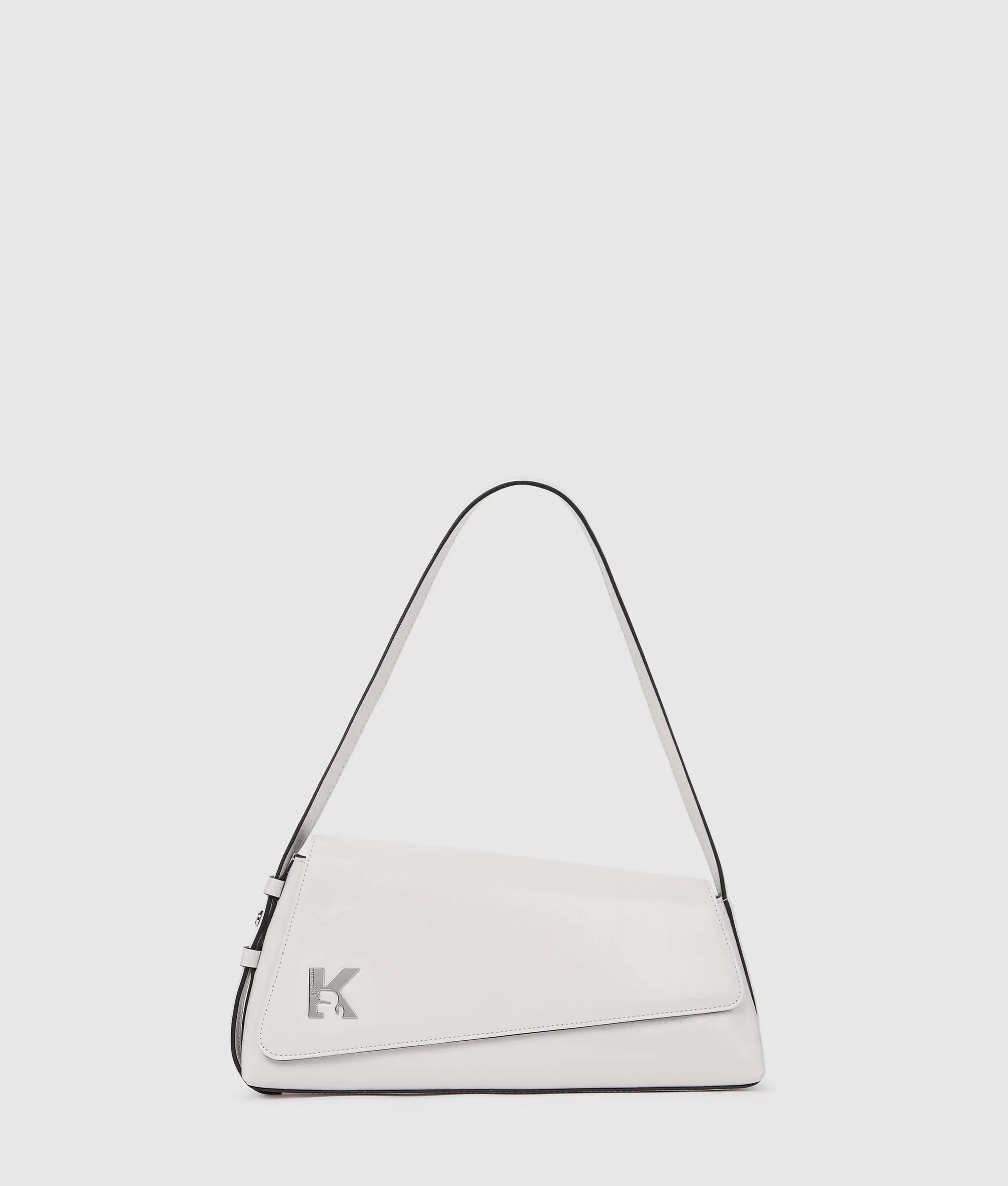 Raffinata e audace, questa borsa in pelle lucida presenta una silhouette geometrica di tendenza e una chiusura con patta asimmetrica. La tracolla regolabile e l'inconfondibile logo K in metallo completano questo capo di carattere.
