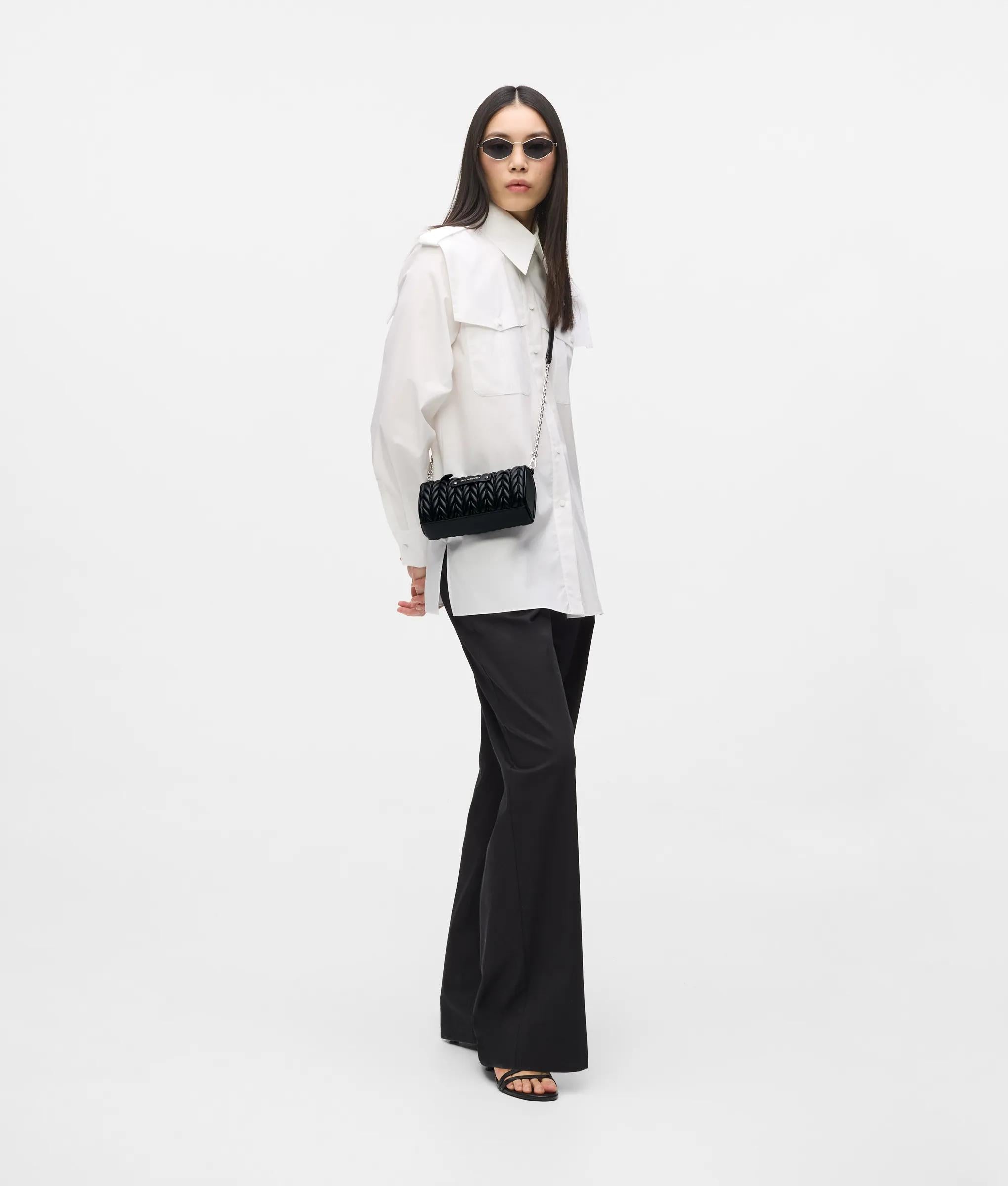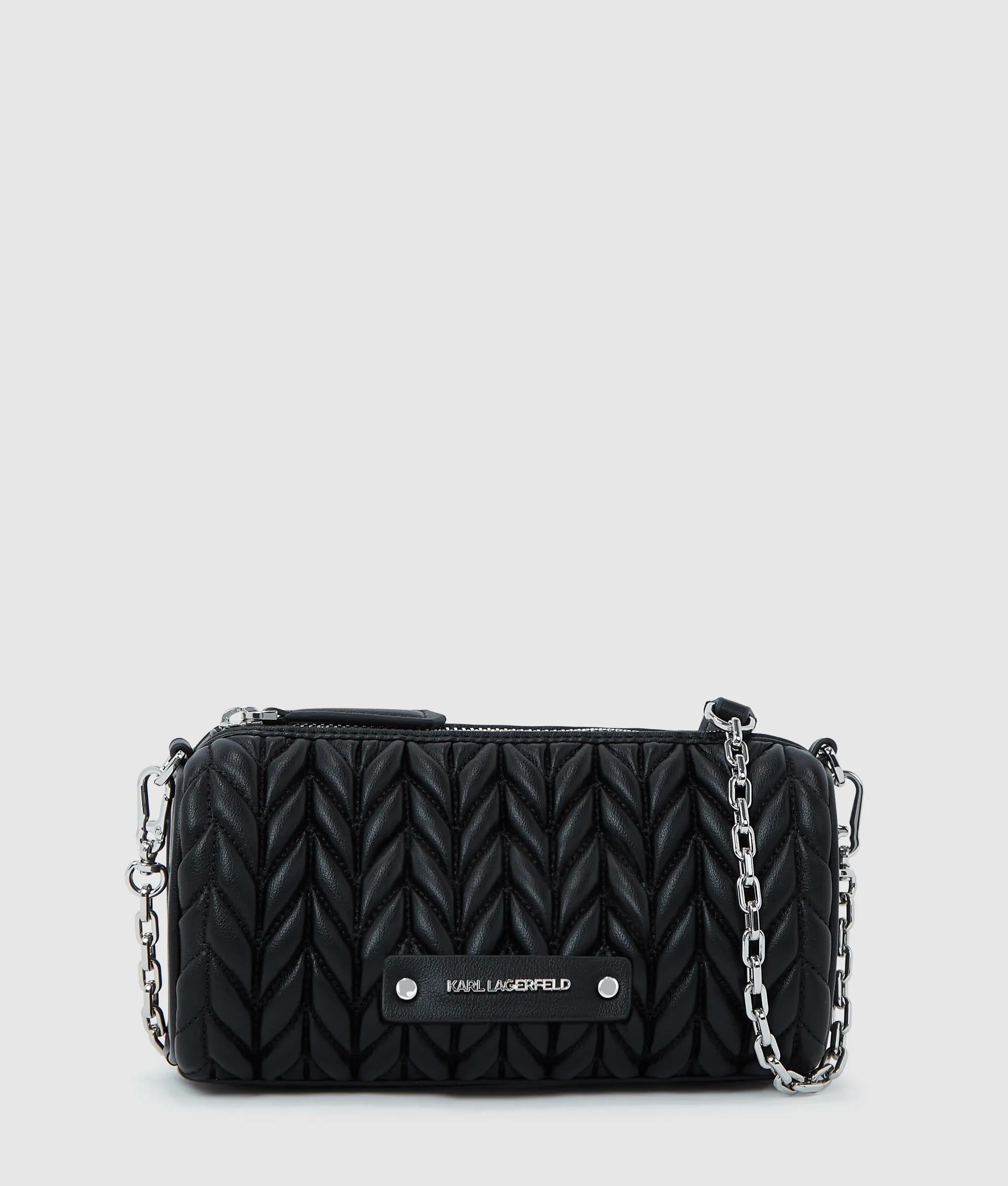 Minima ma inconfondibile, questa borsa a cilindro in pile presenta un caratteristico design intrecciato trapuntato e una tracolla in pelle tecnica e catena rock-chic. La chiusura superiore con zip mantiene gli articoli essenziali al sicuro con stile.