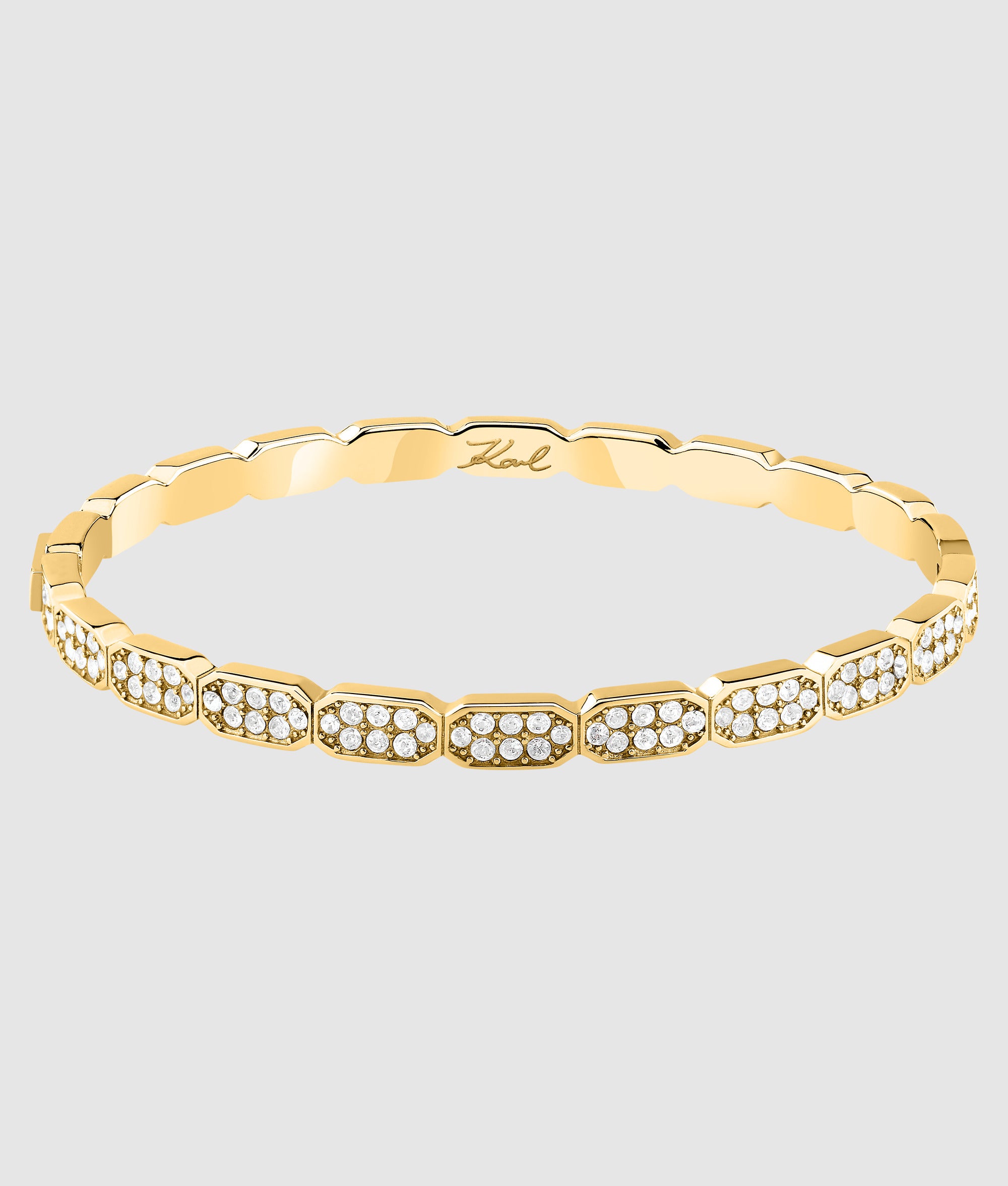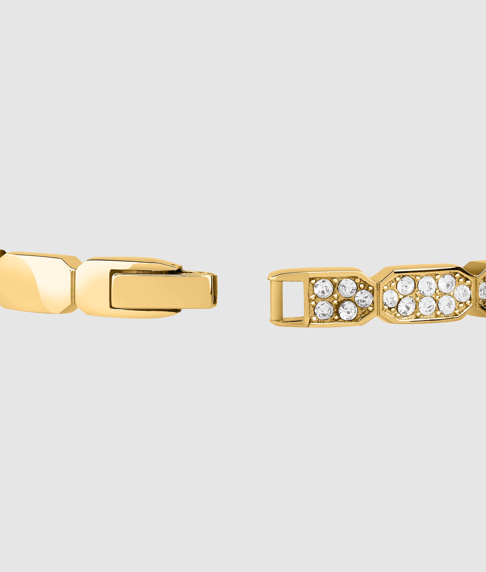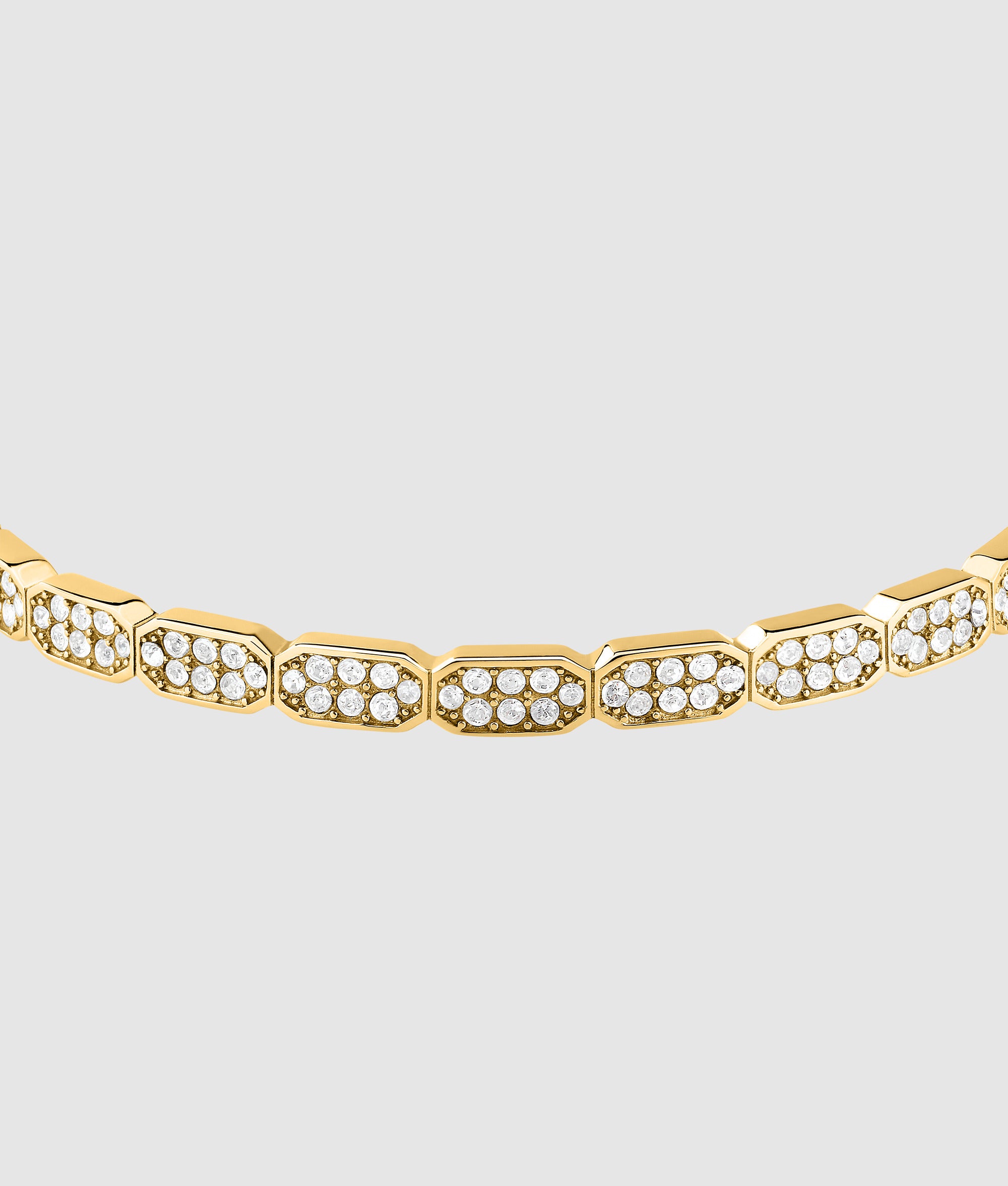 Progettato per brillare da solo o indossato con la collana abbinata, questo bracciale a catena color oro è impreziosito da charm in pavé di cristalli, per un'eleganza raffinata.