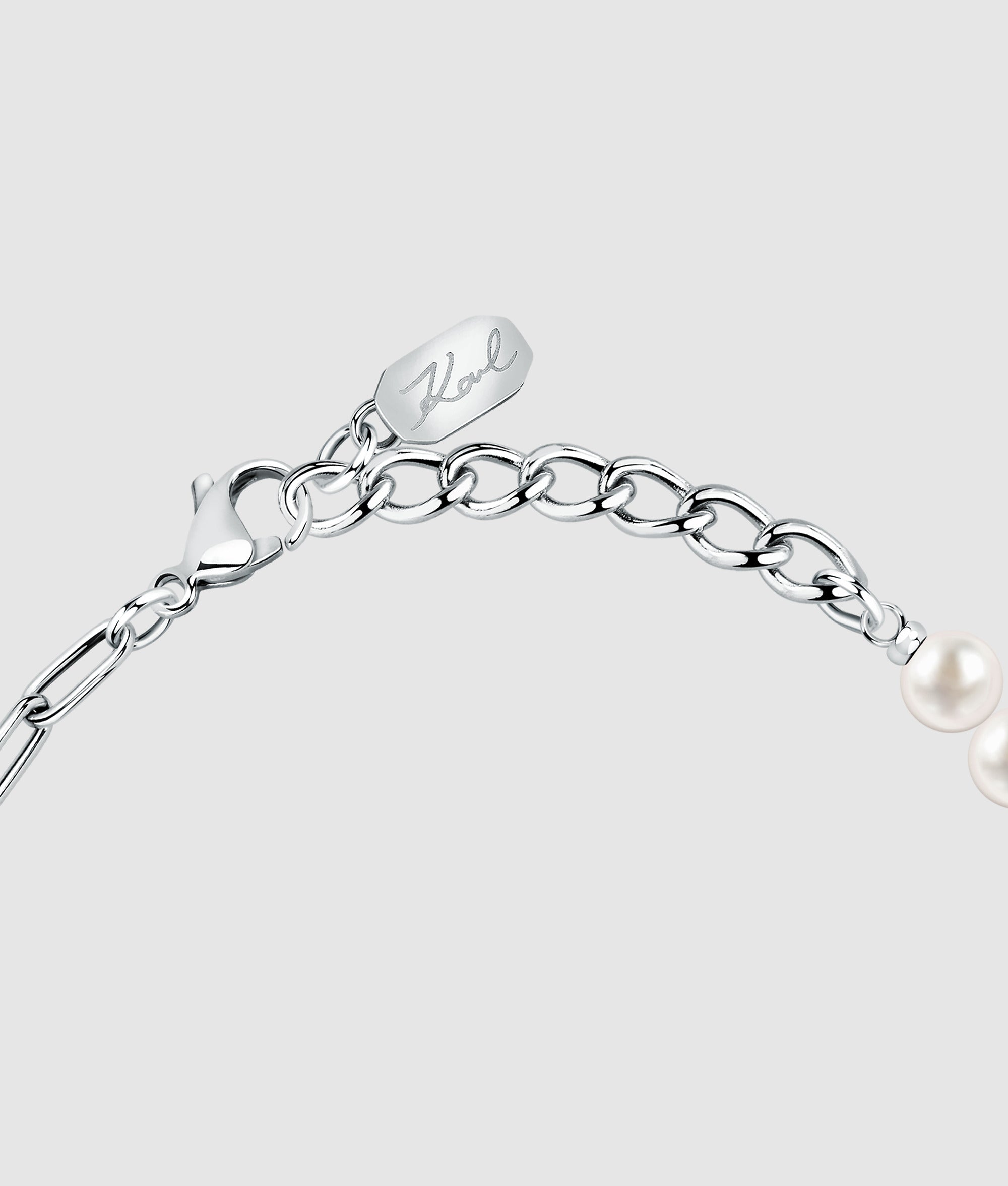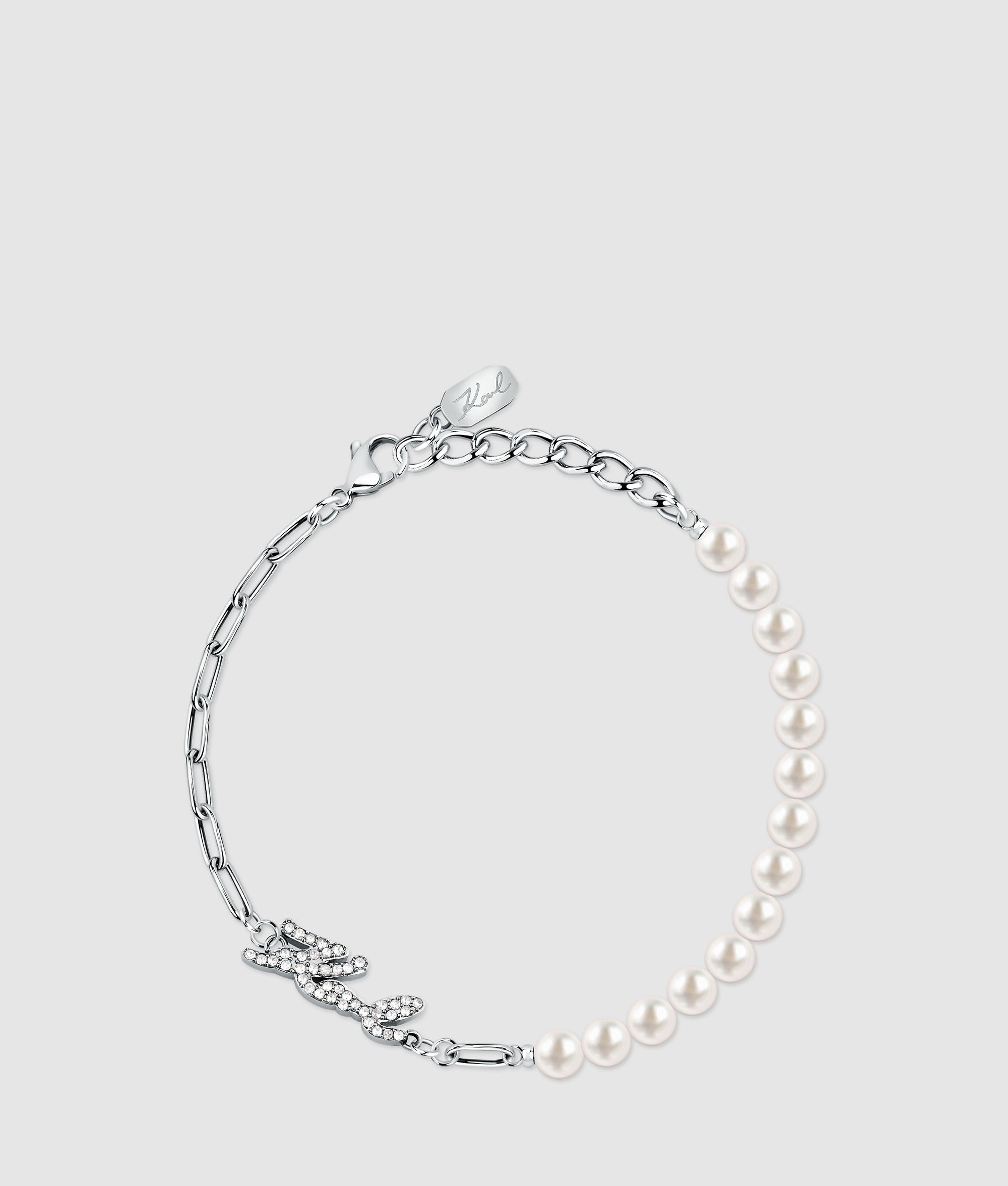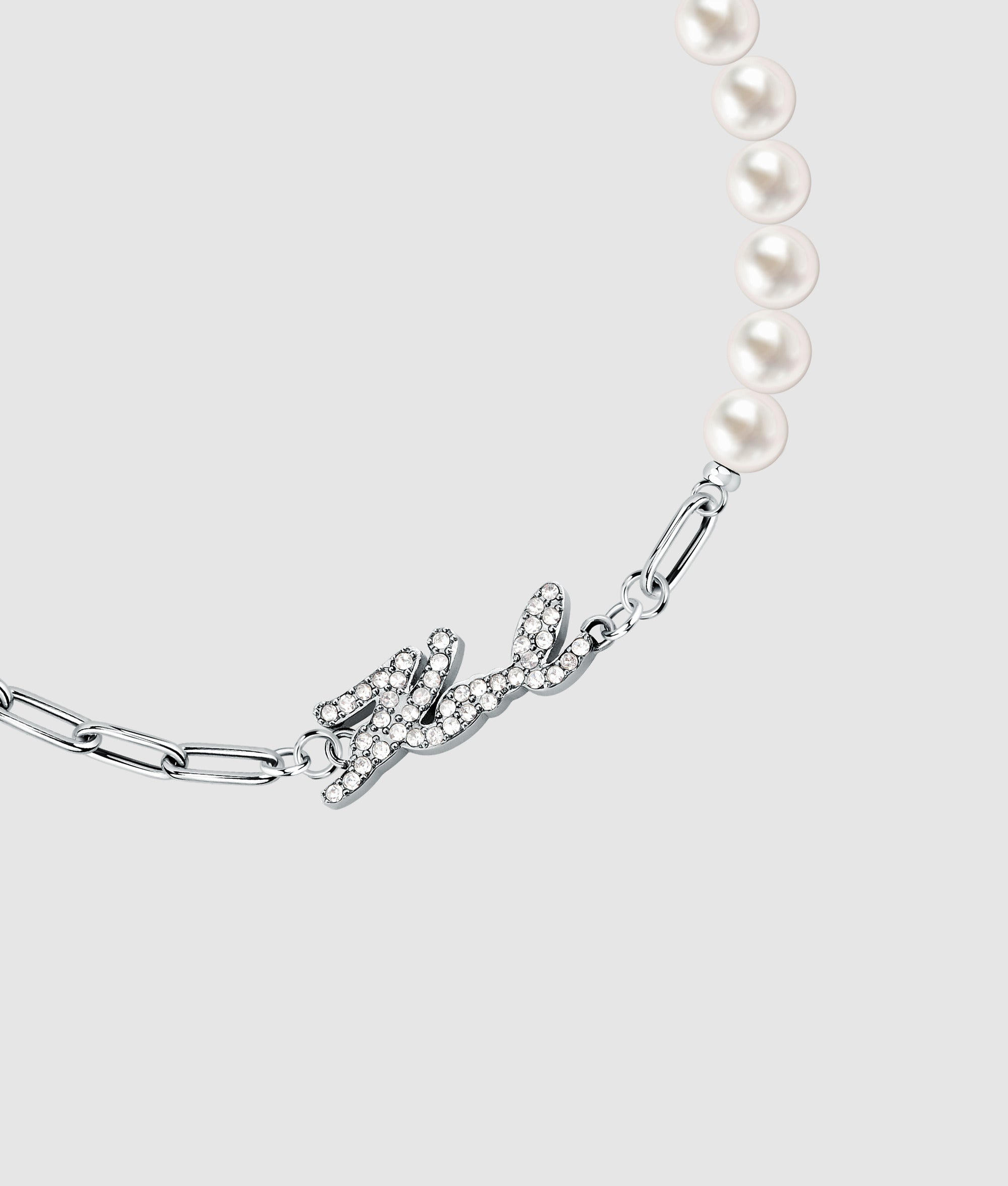 Compagno perfetto della collana abbinata, questo bracciale combina perle di conchiglia e charm Signature con logo impreziosito da pavé, per un impatto sontuoso.
