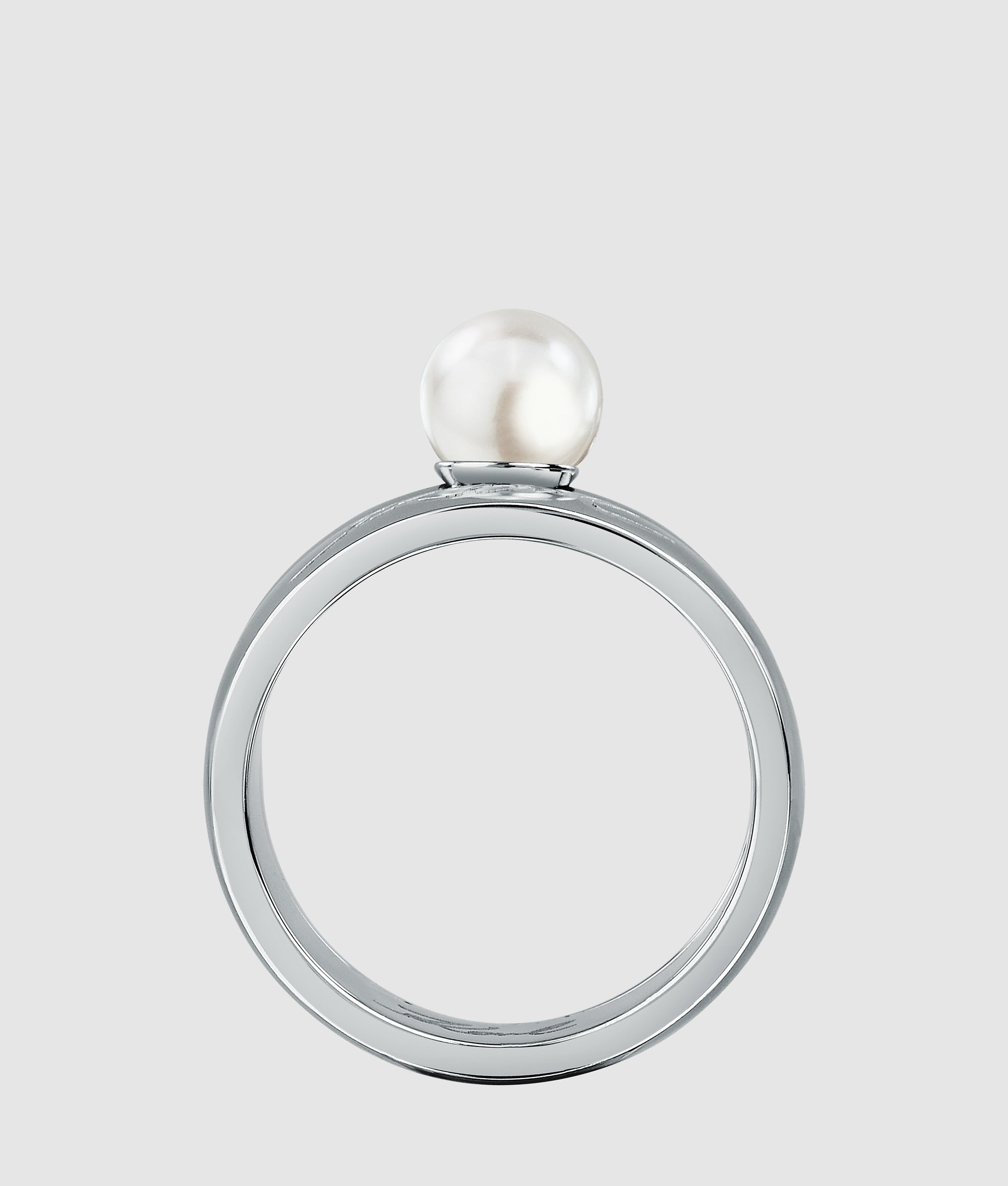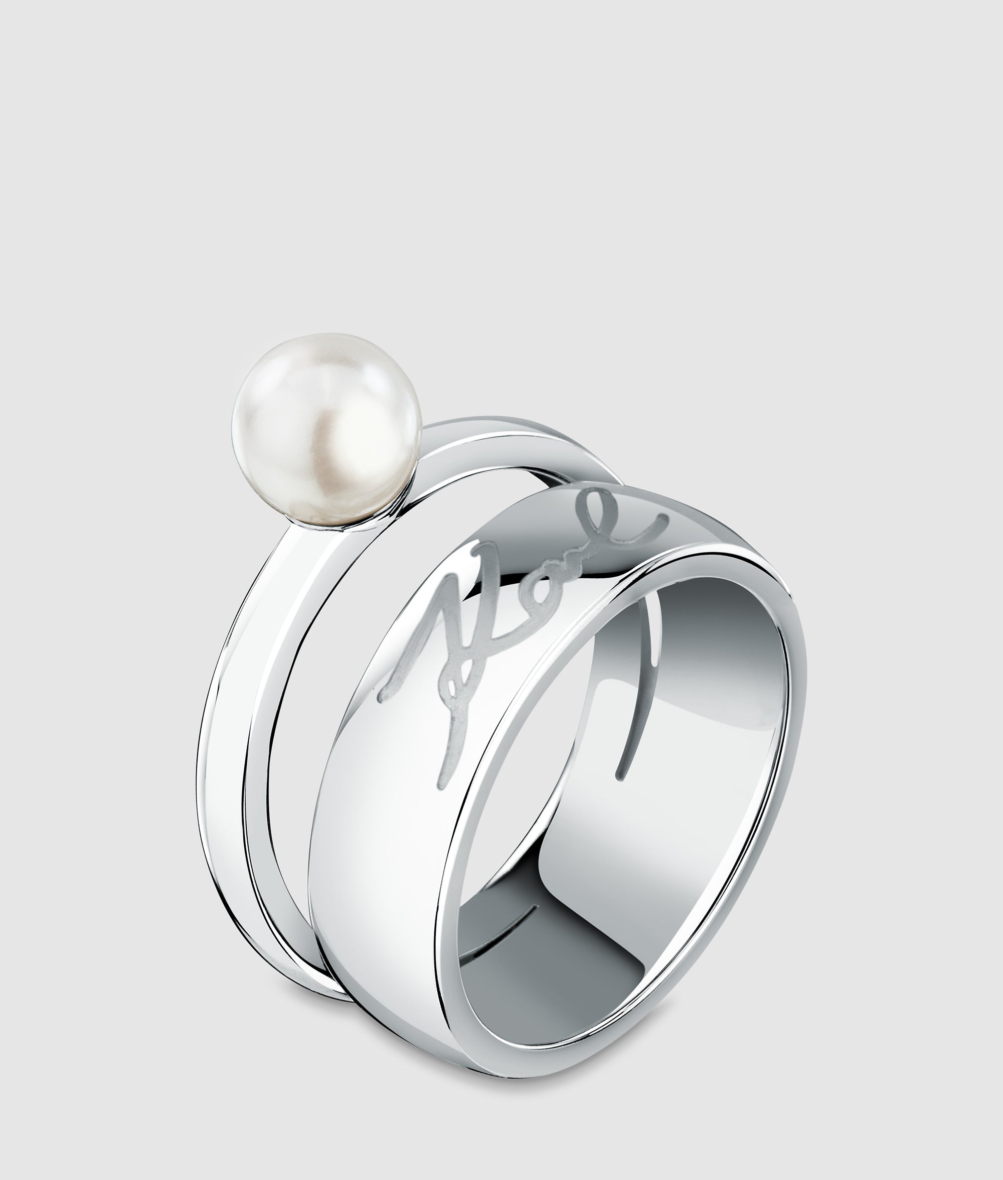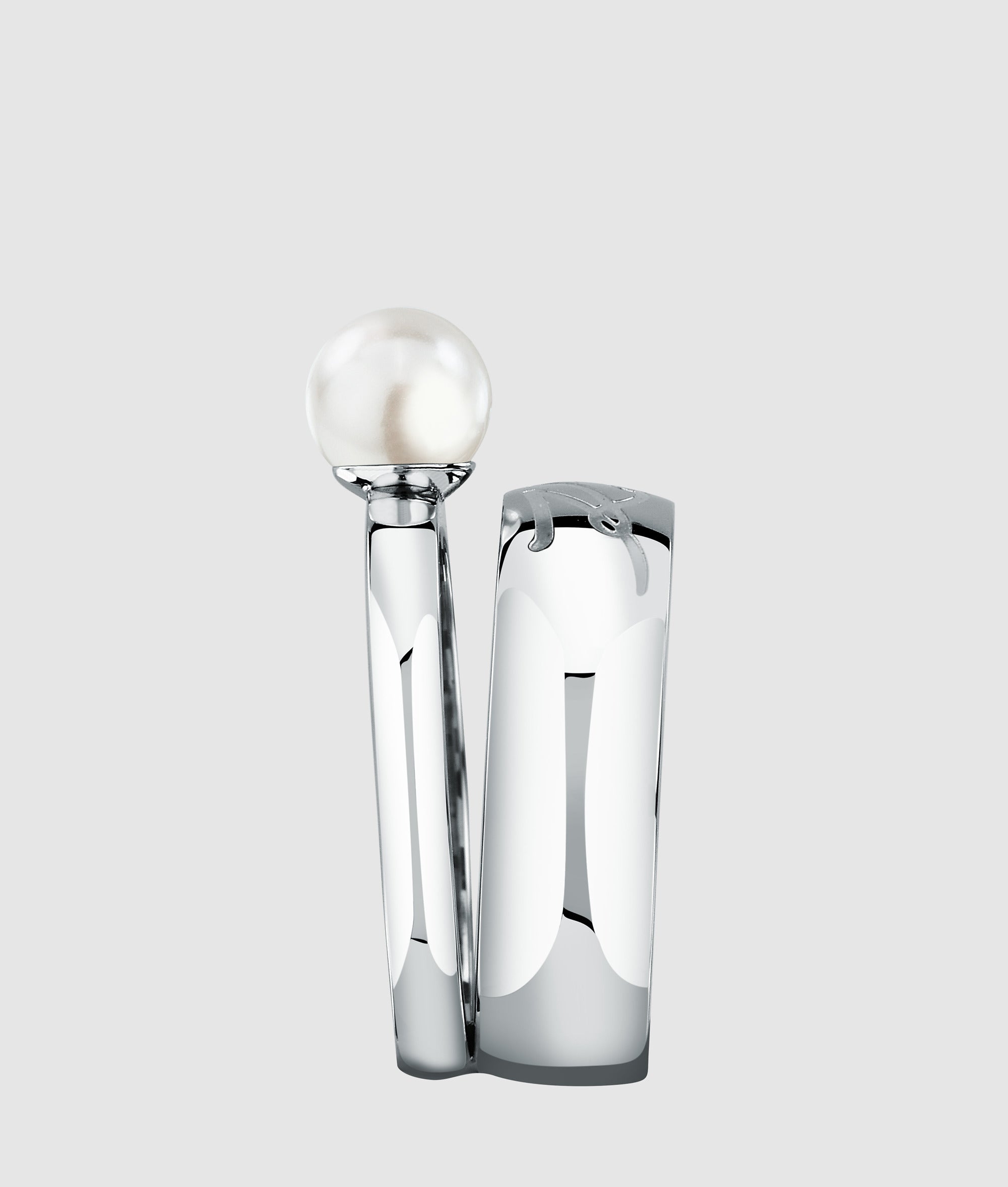 Questo anello a fasce sovrapposte combina una banda in argento lucido con un anello impreziosito da una delicata perla di conchiglia, creando un contrasto raffinato ma grintoso.