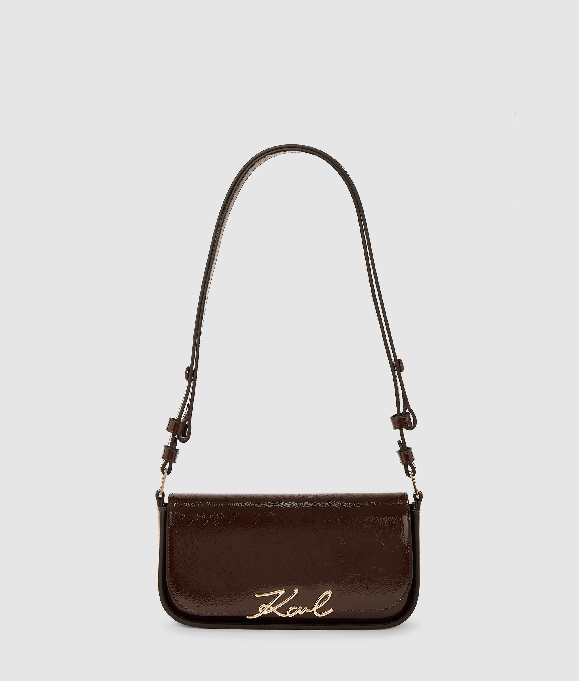 Quest'elegante borsa a tracolla è realizzata in pelle liscia con una finitura riflettente. La sua elegante chiusura con patta e dettaglio in metallo Karl Signature mantiene al sicuro gli articoli essenziali, mentre la tracolla regolabile offre un utilizzo versatile.
