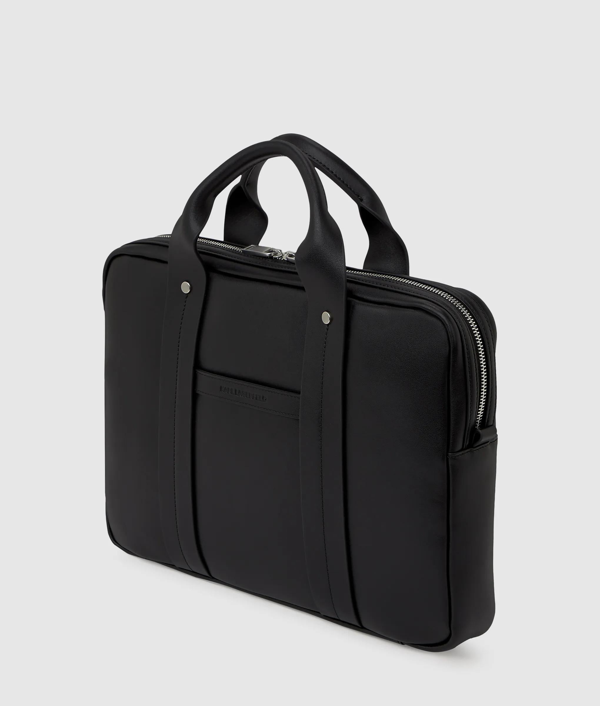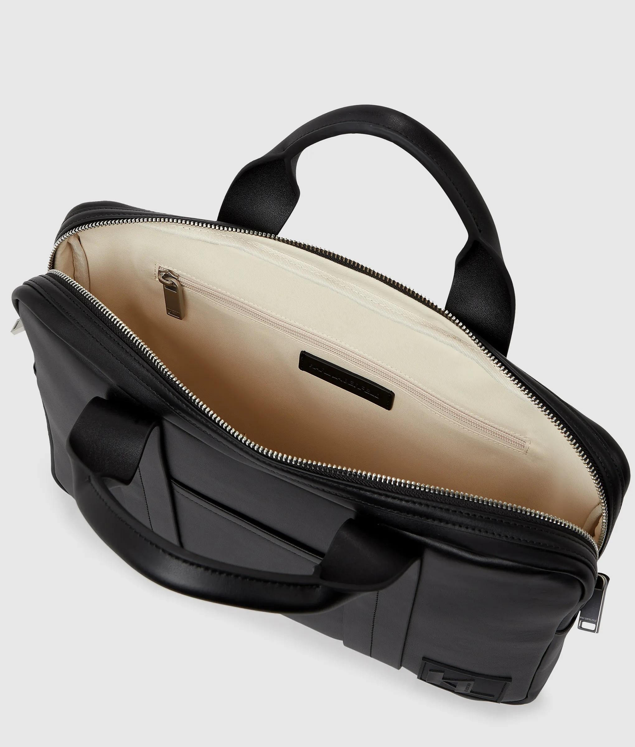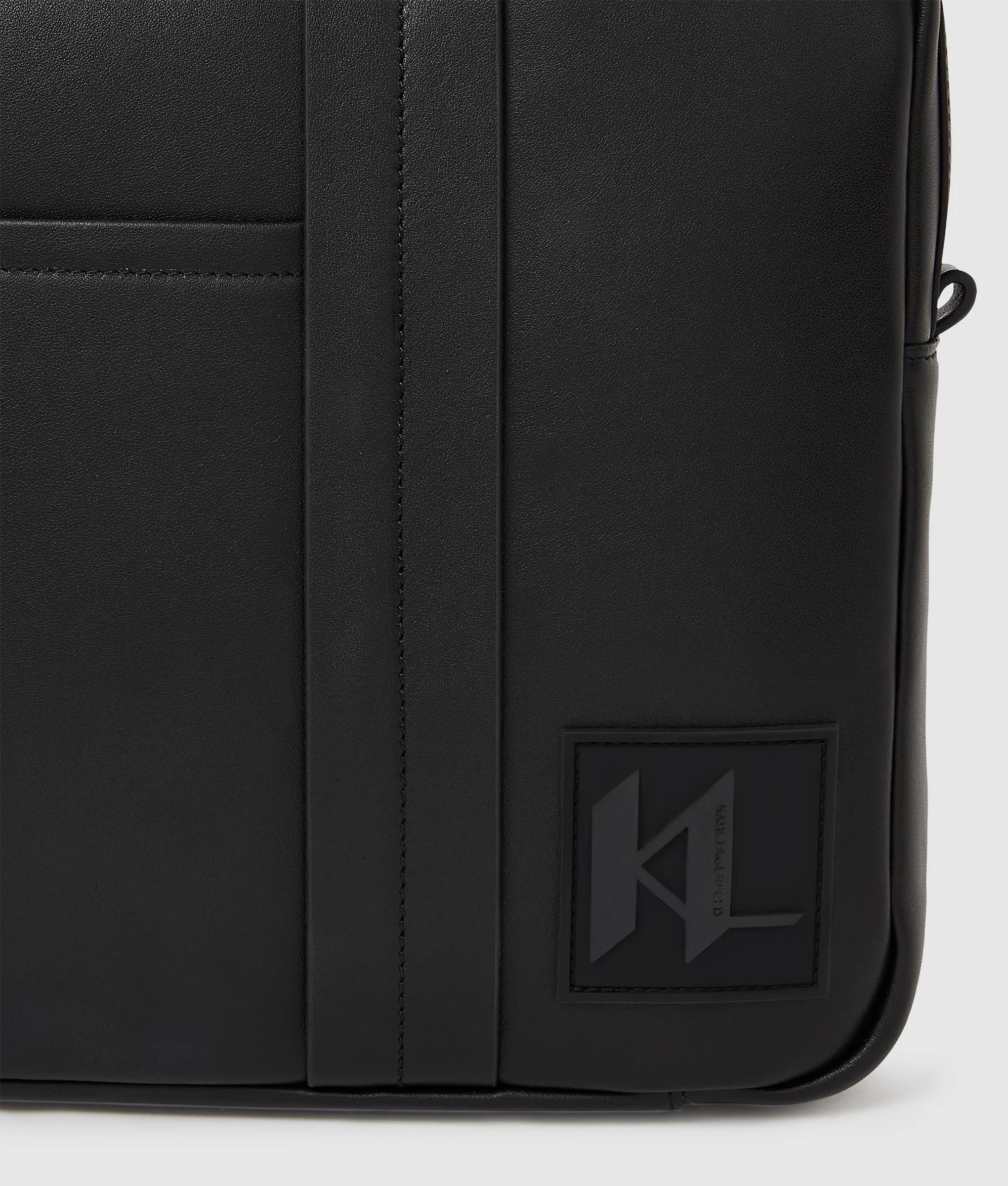 Questa valigetta con manico superiore abbina la morbida e lussuosa similpelle a una zip argento lucida, per una finitura raffinata. La toppa KL Monogram aggiunge una finitura grafica, perfetta da portare con sé dall'ufficio fino alla sera.