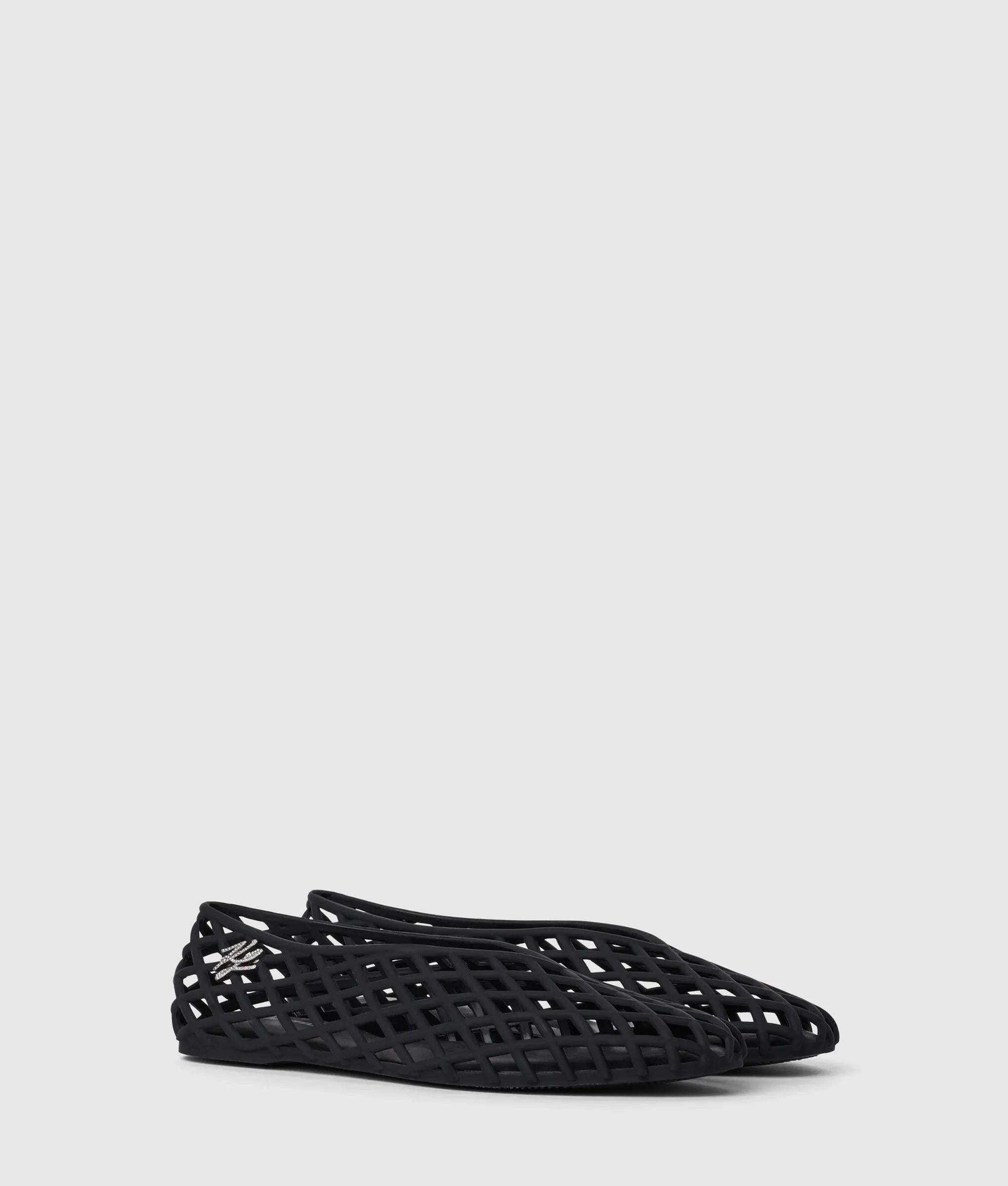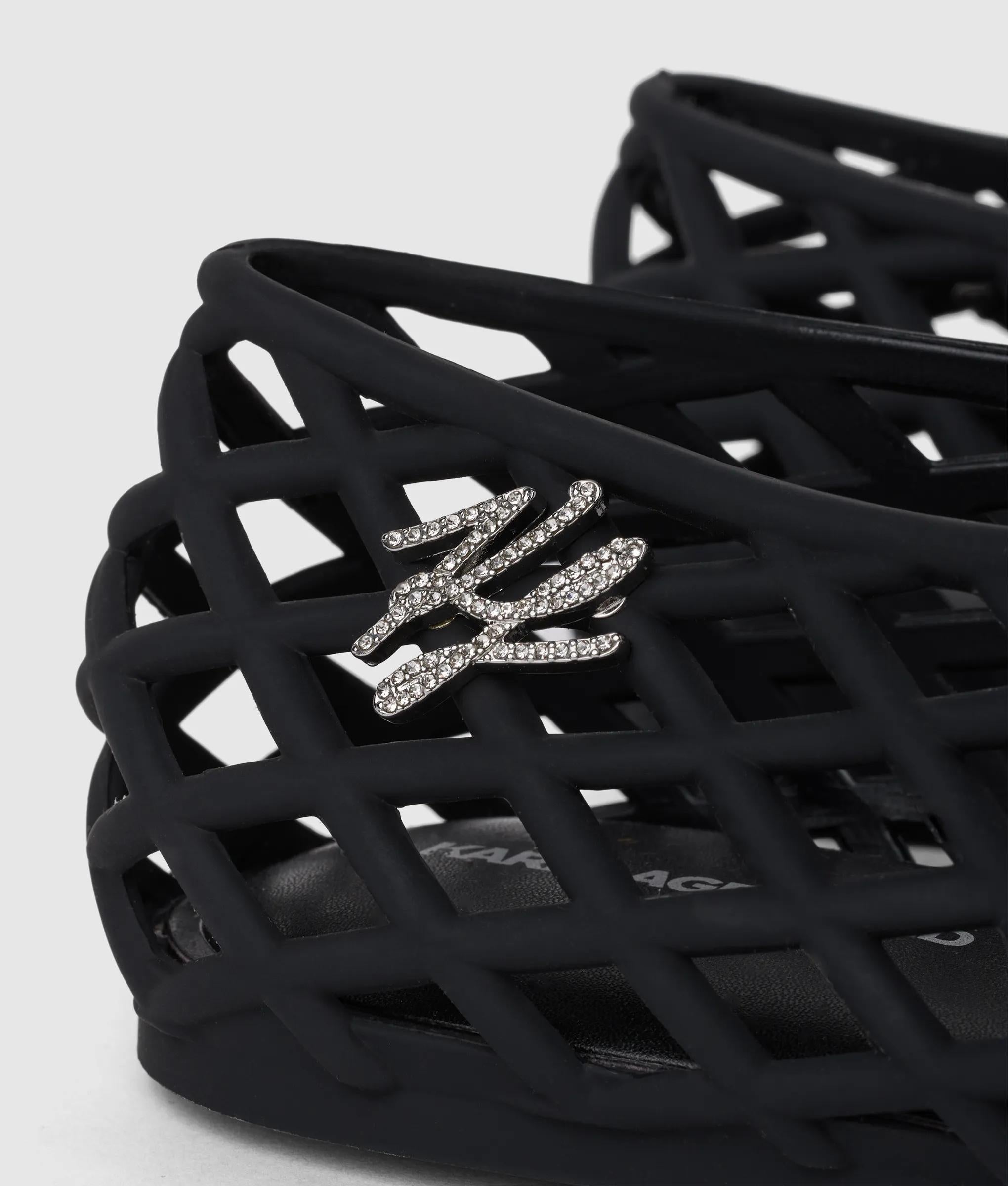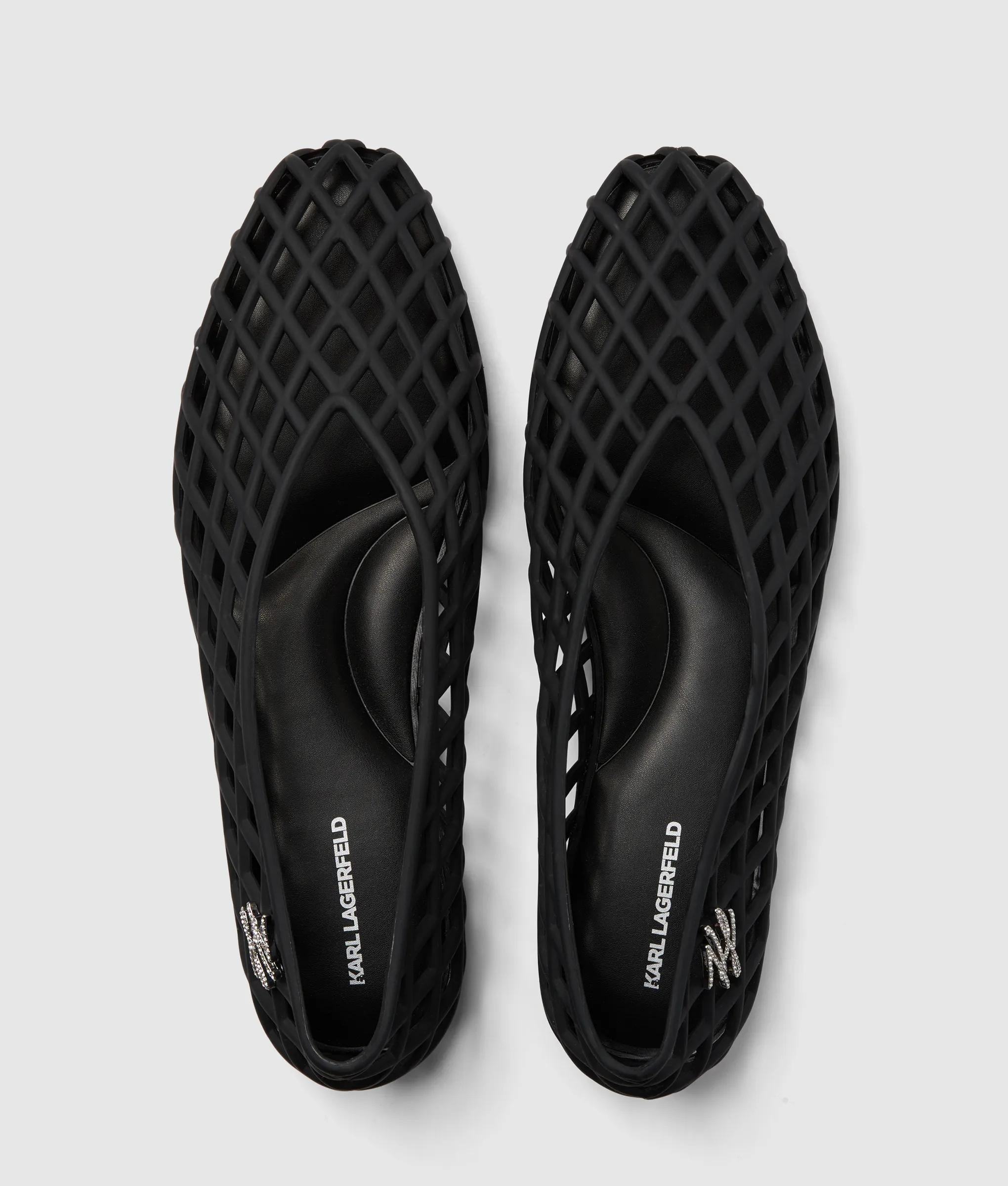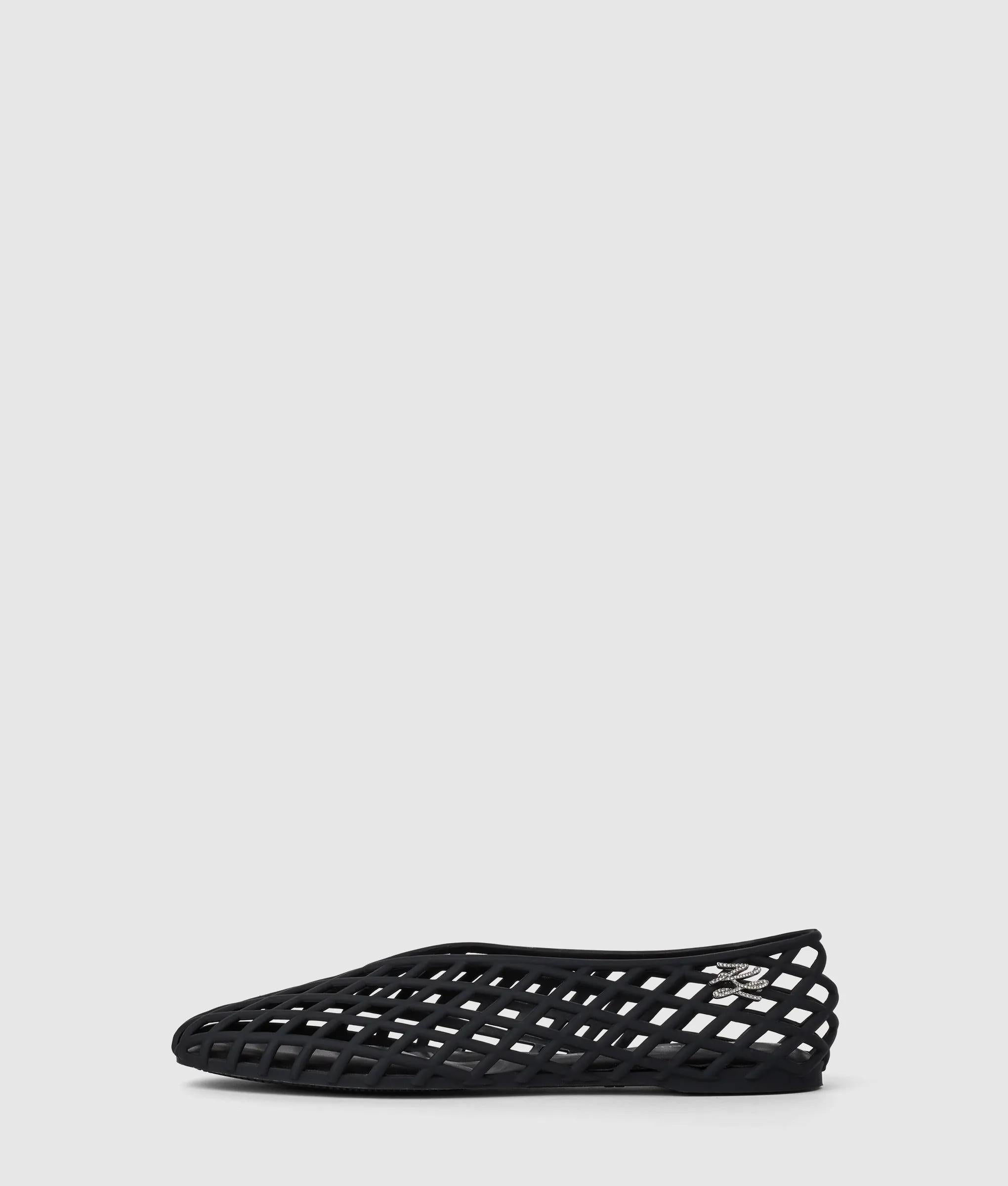 Una luccicante decorazione in strass Karl Signature aggiunge un'eleganza discreta a queste eleganti ballerine décolleté, realizzate in gomma opaca per un tocco urbano. Il sottopiede sagomato garantisce comfort per tutta la giornata.