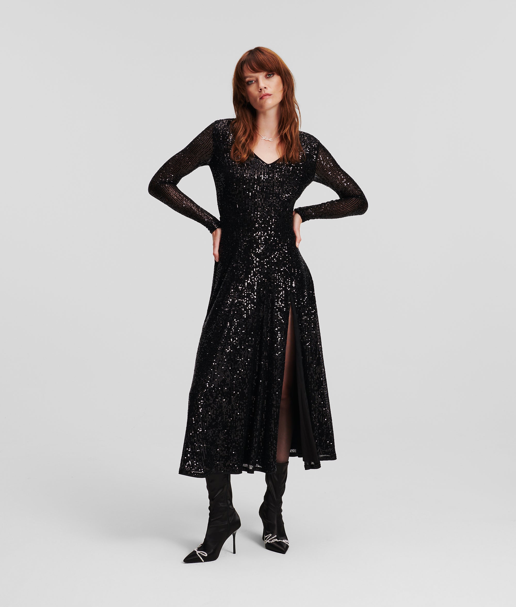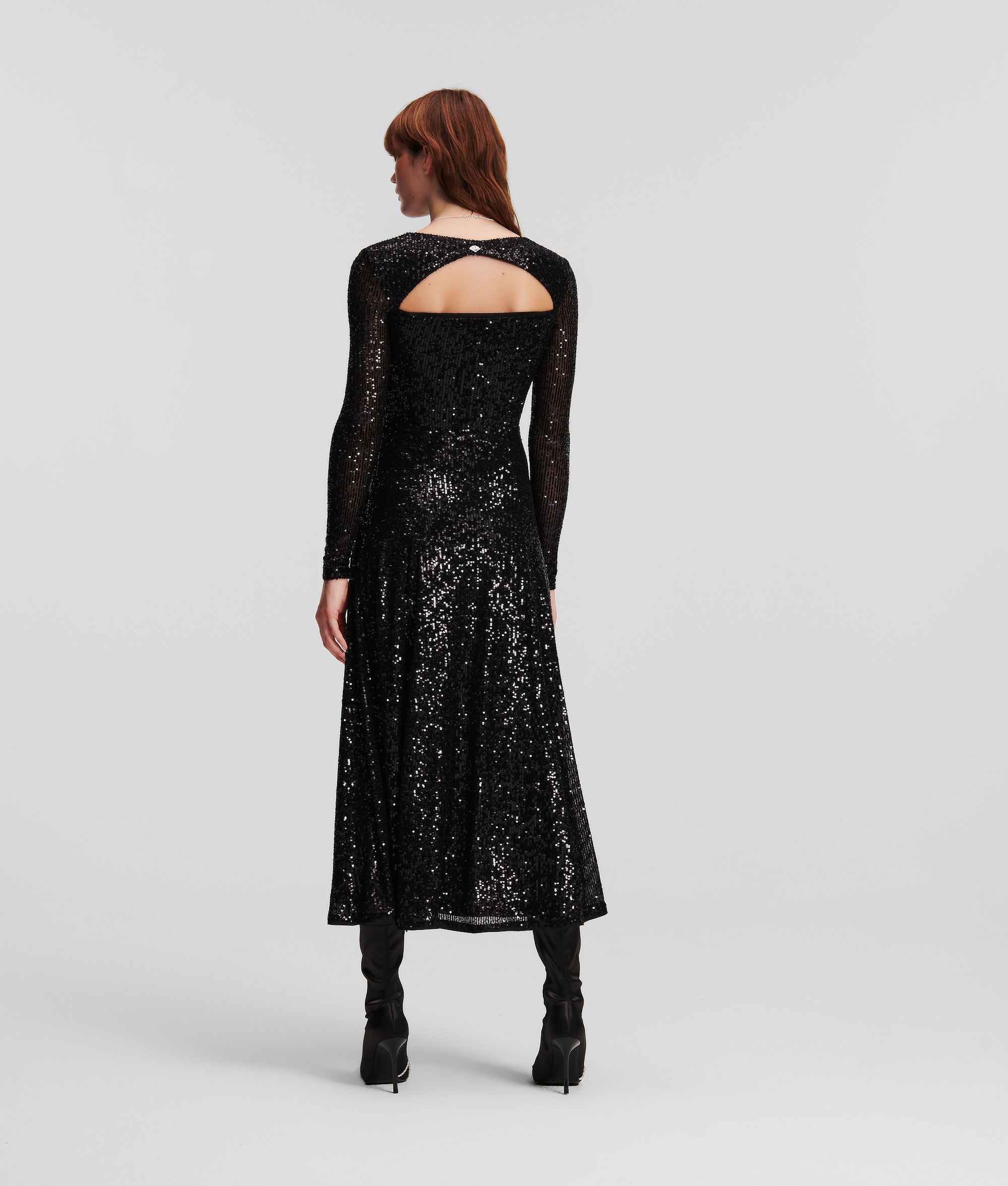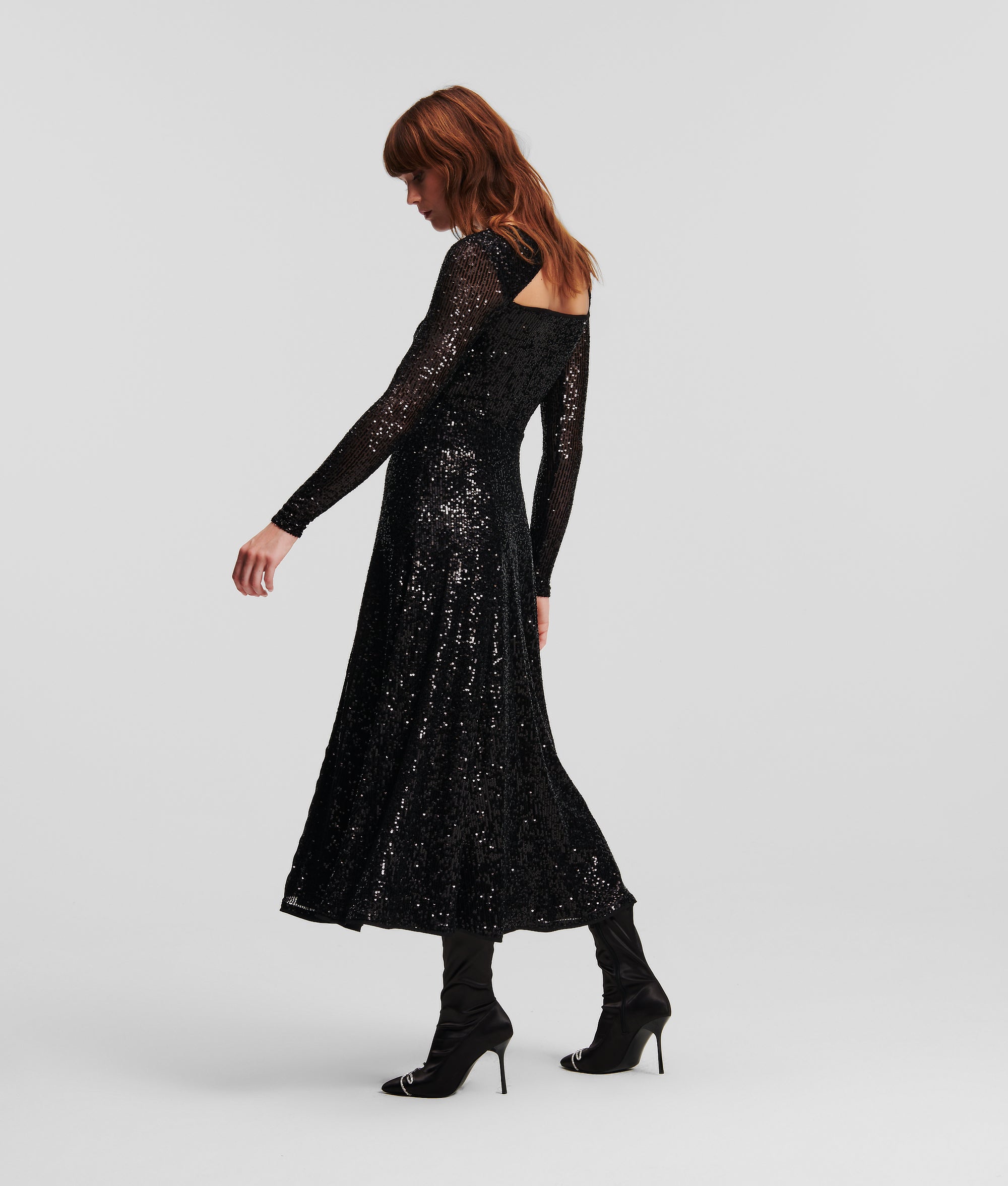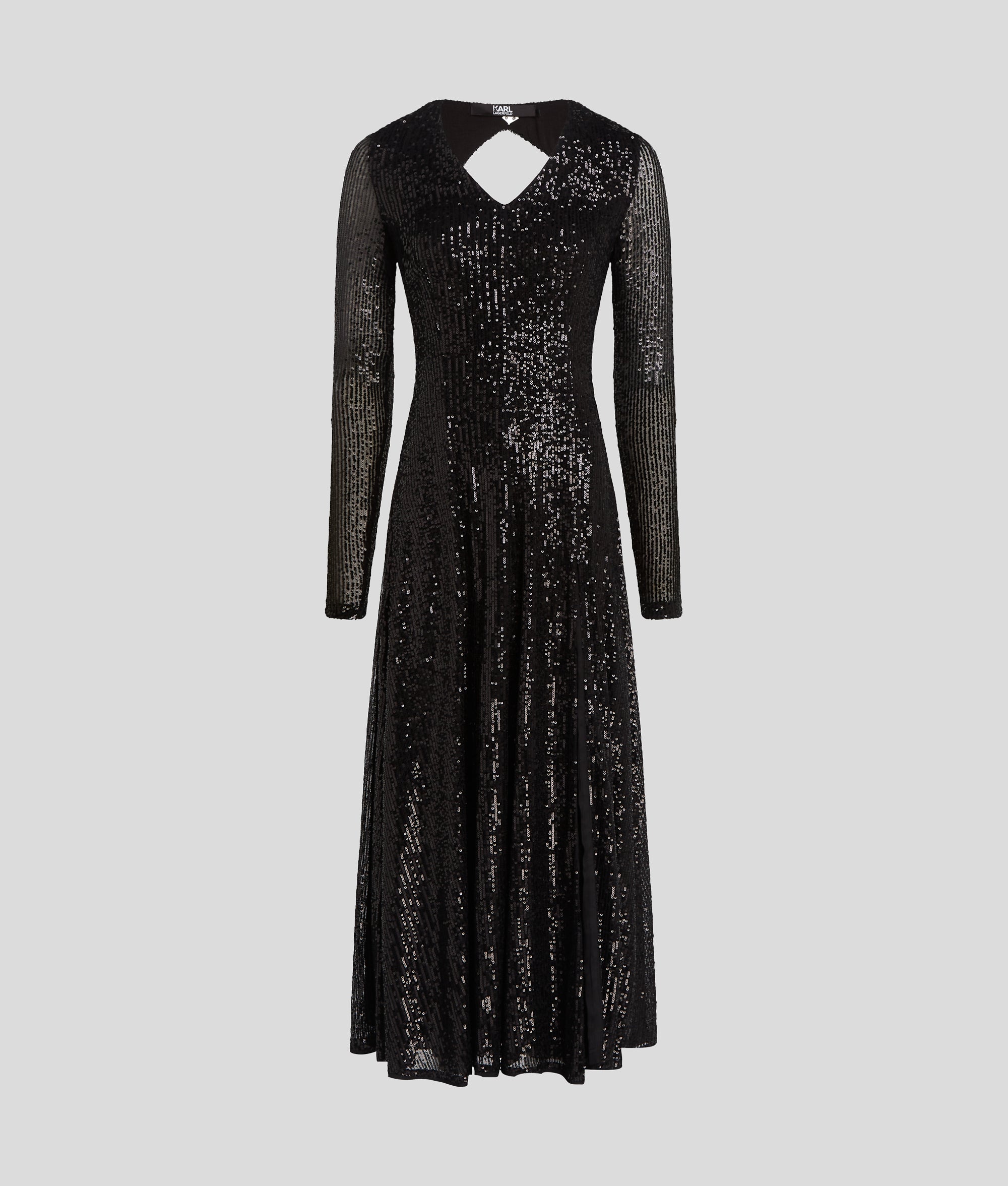 ホリデーシーズンのヒーローアイテム。きらめくスパンコールを散りばめた、床まで広がるシルエットで仕立てられた優美なイブニングドレス。エレガントな扇の飾りと大胆な背中のカッティングが印象的なガウン。