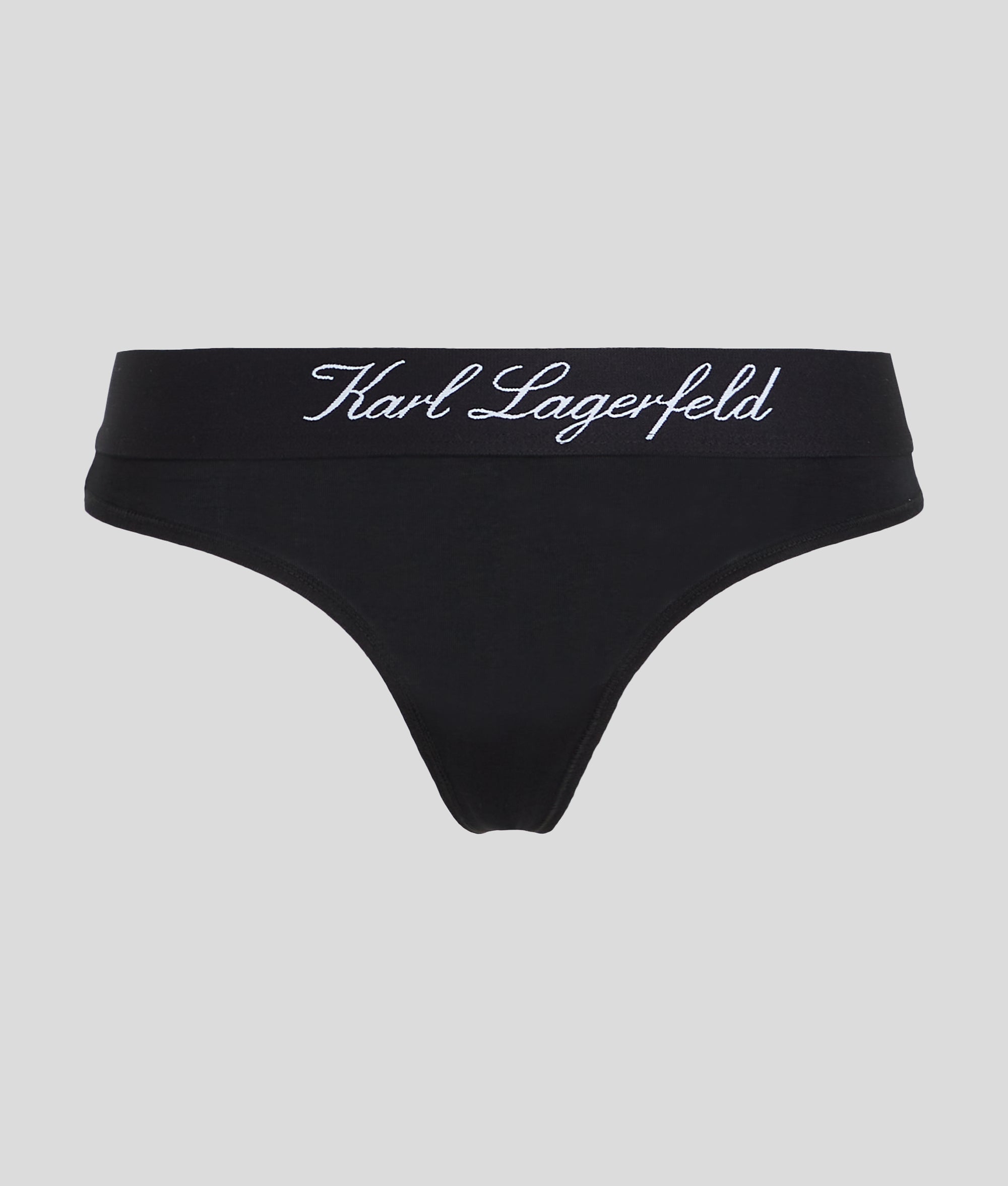 オーガニックコットン・エラスタンを贅沢に使用した洗練されたTバック。快適なローライズウエストのクラシックなシルエットで、アイコニックなHotel KARLのロゴがエレガントなアクセントに。