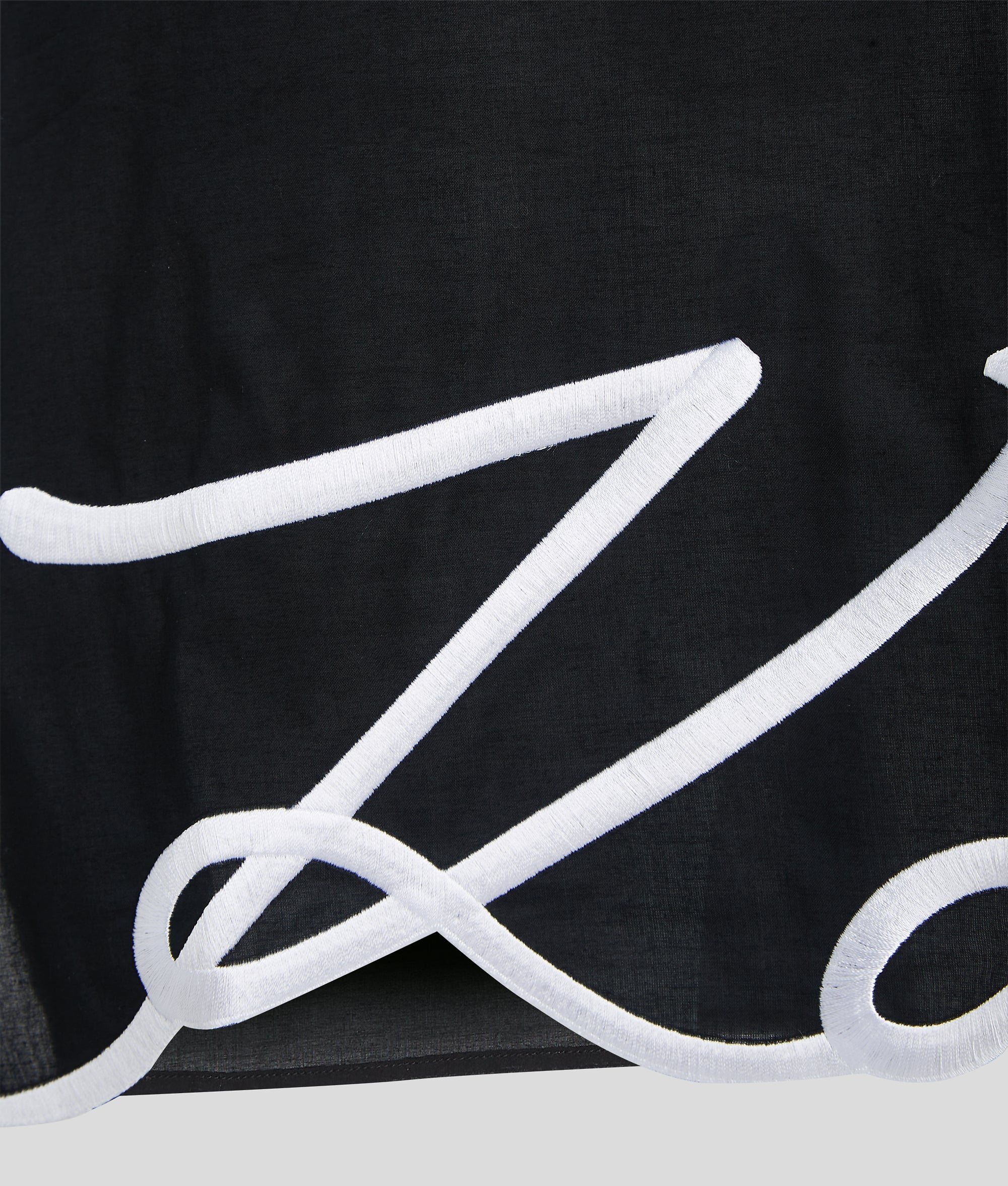 エレガントなクラシックなシャツドレススタイルで、ビーチを闊歩。ウエストを絞るベルト、サイドスリット、裾に施されたKARL Signature刺繍が特徴のフェミニンなフォルム。