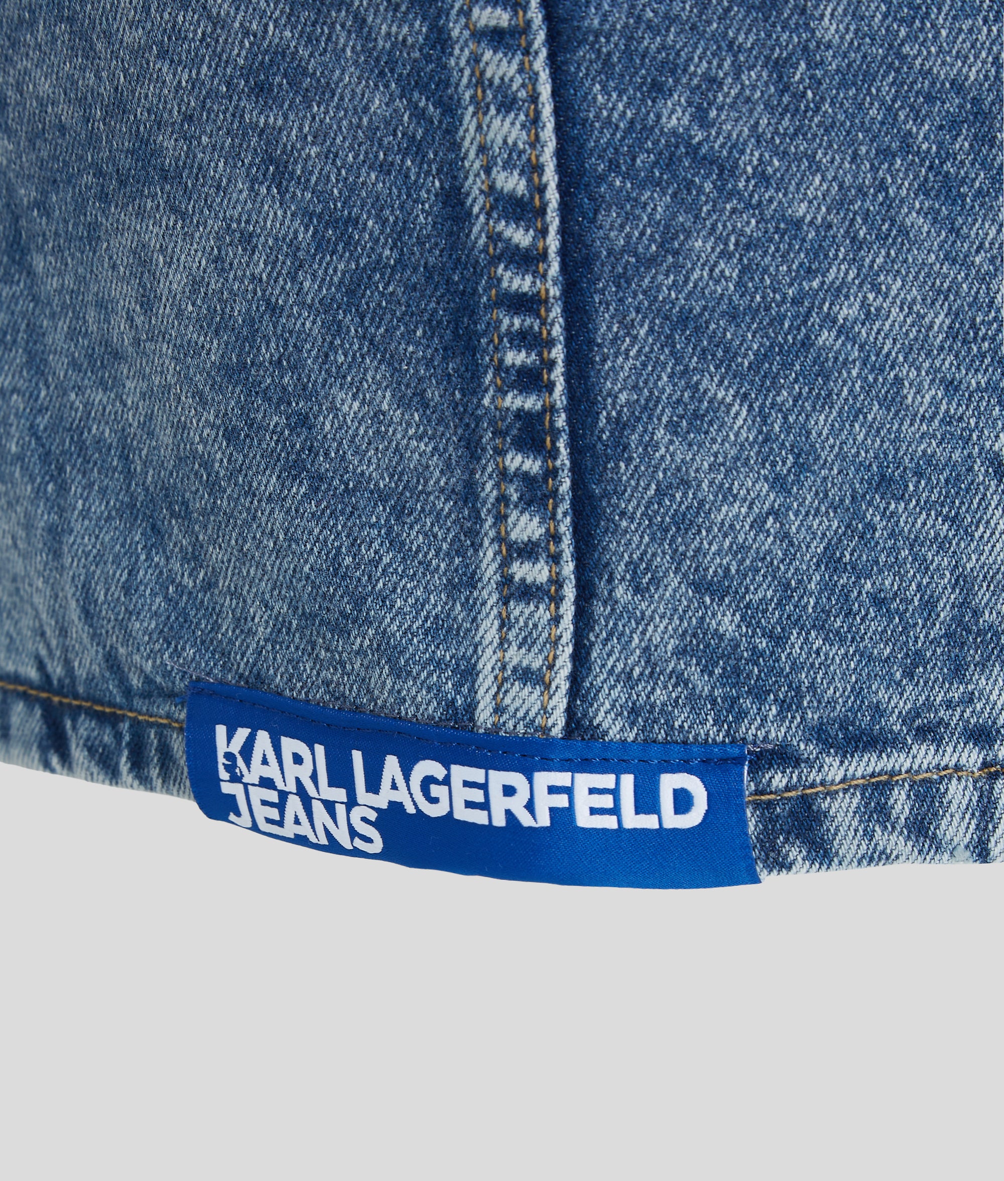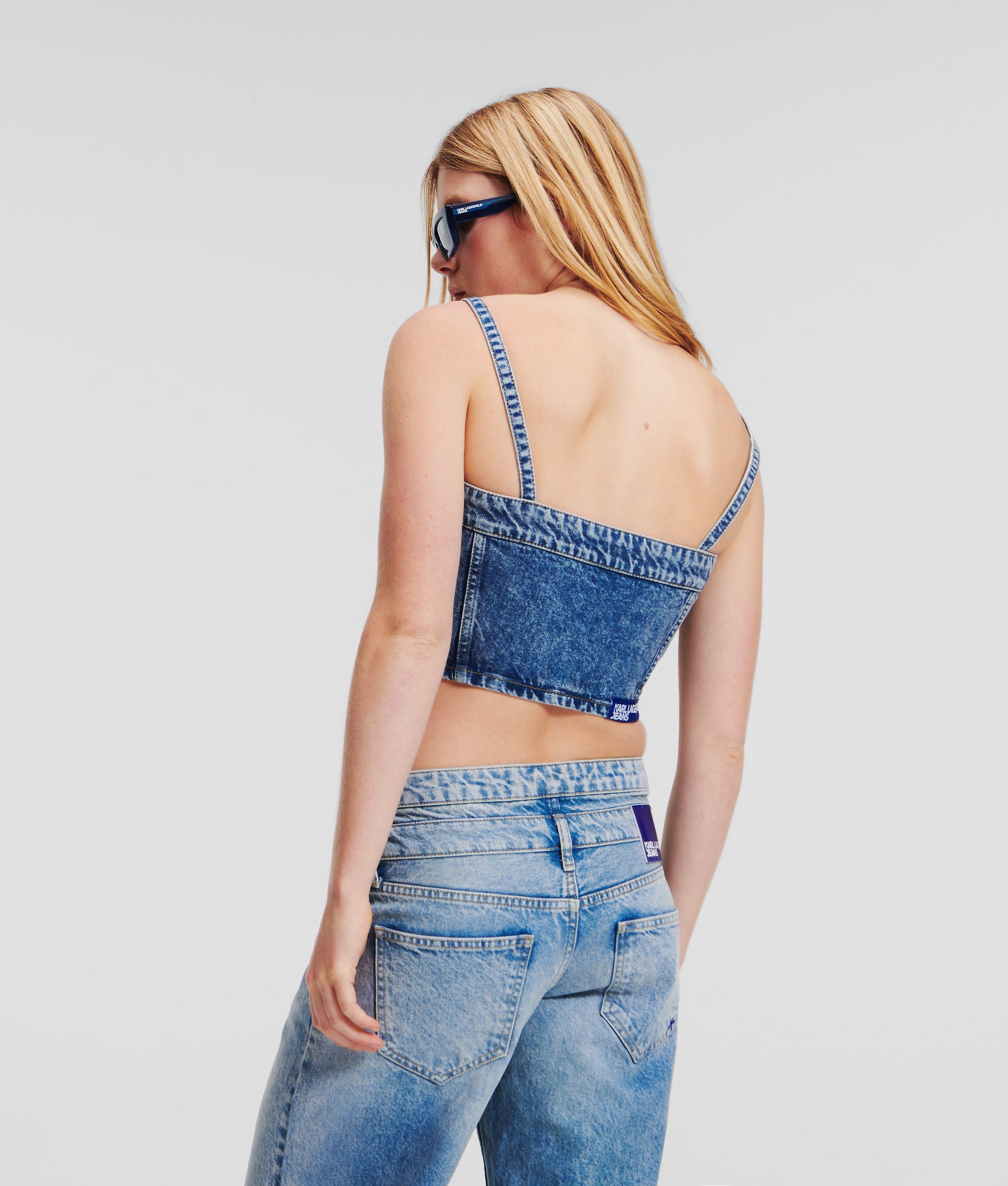 ブランドロゴ入りのメタルボタンとKARL LAGERFELD JEANSの織りラベルが特徴的な、クロップドシルエットのバンドゥートップス。