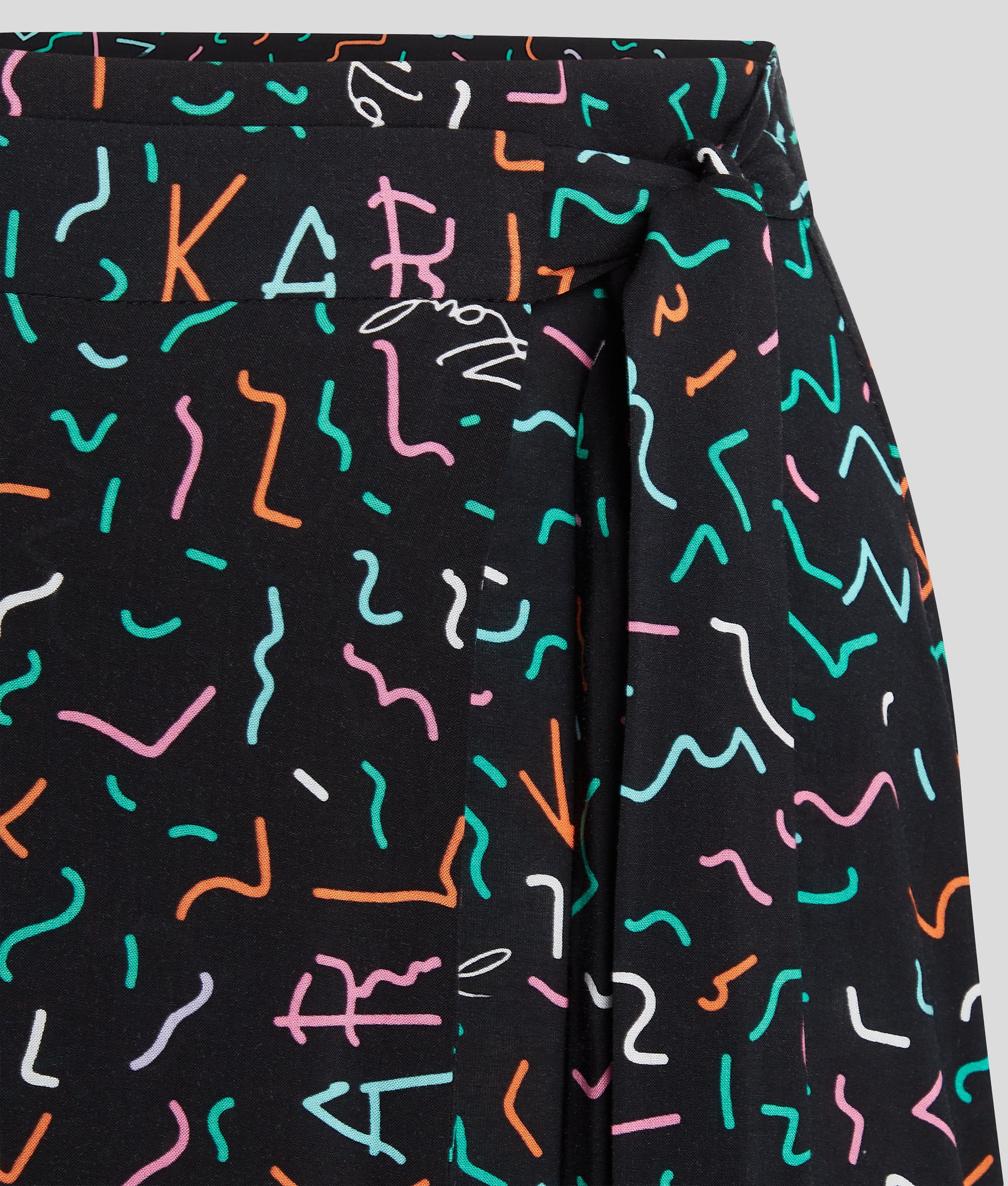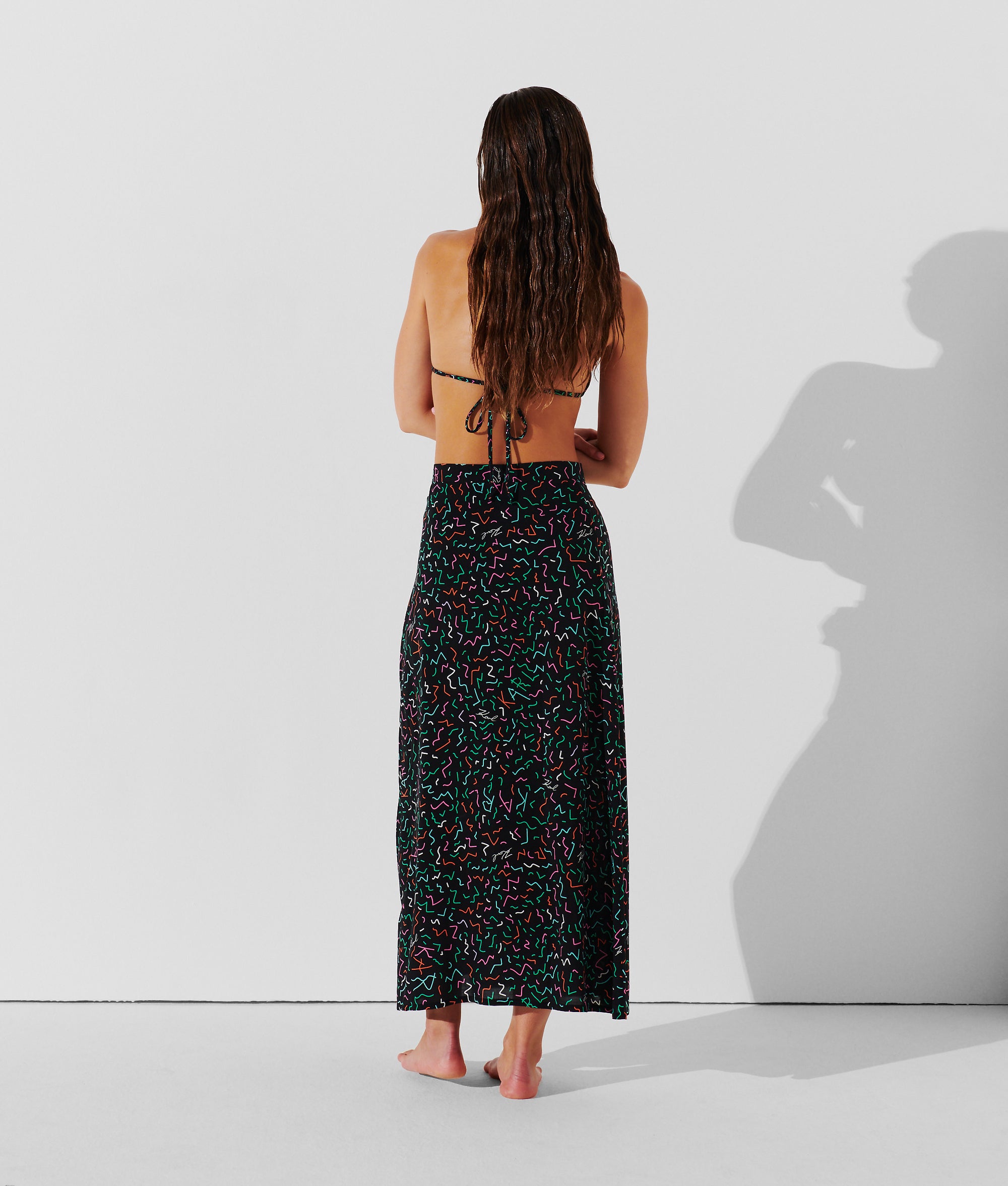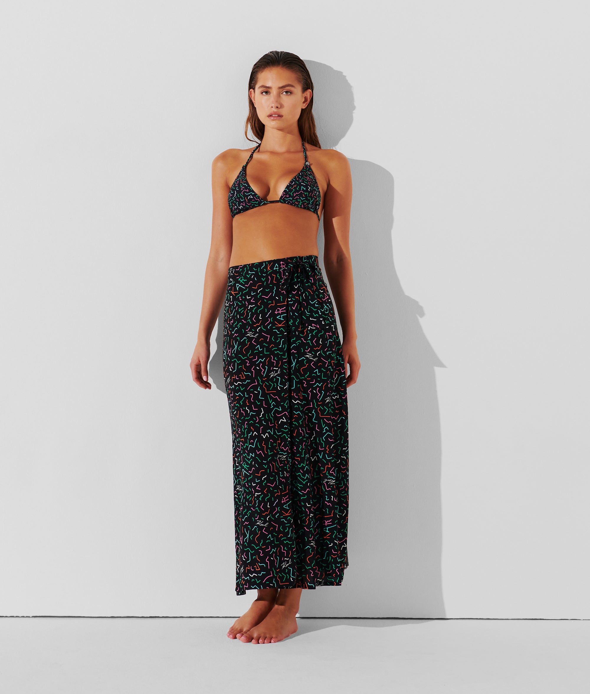 ビスコース織りのビーチパレオで、都会的なシックに身を包んで。サイドの紐で開閉する、マキシ丈の美しいラップオーバーシルエット。全体にあしらったKARLジオメトリックプリントが夏スタイルに遊び心とモダンなひねりを添える一着。