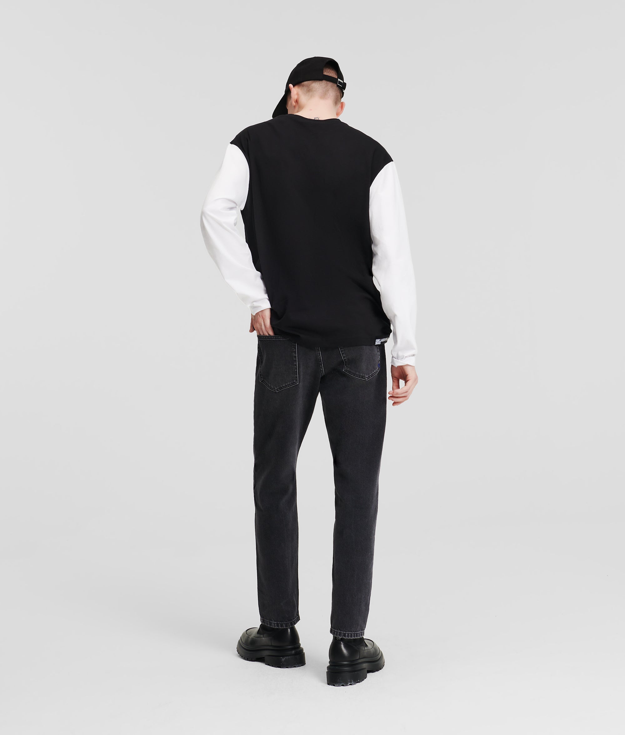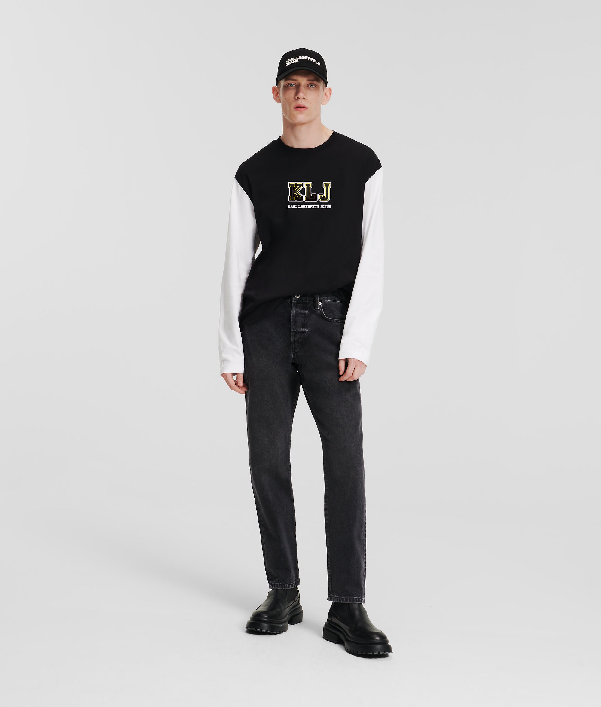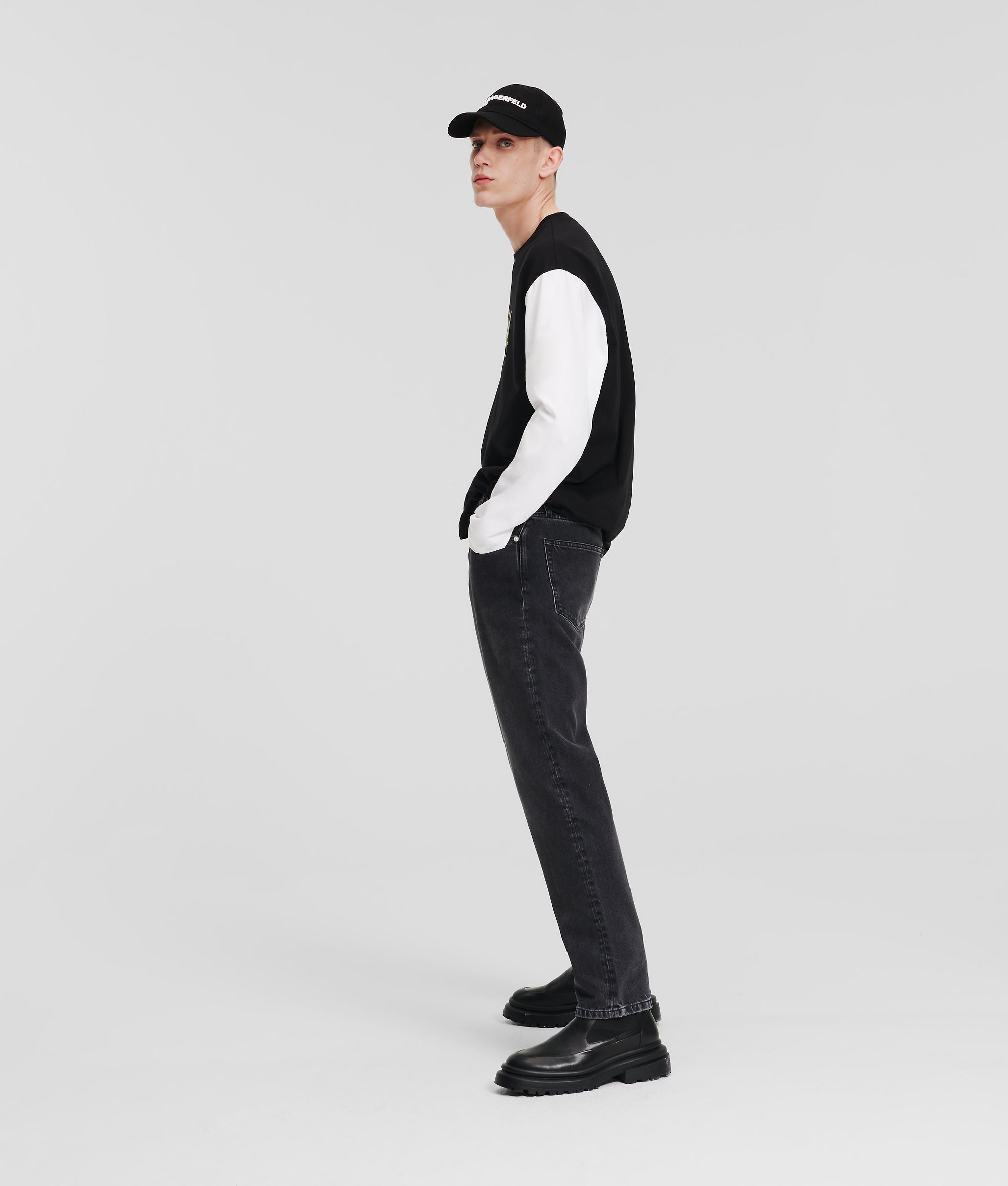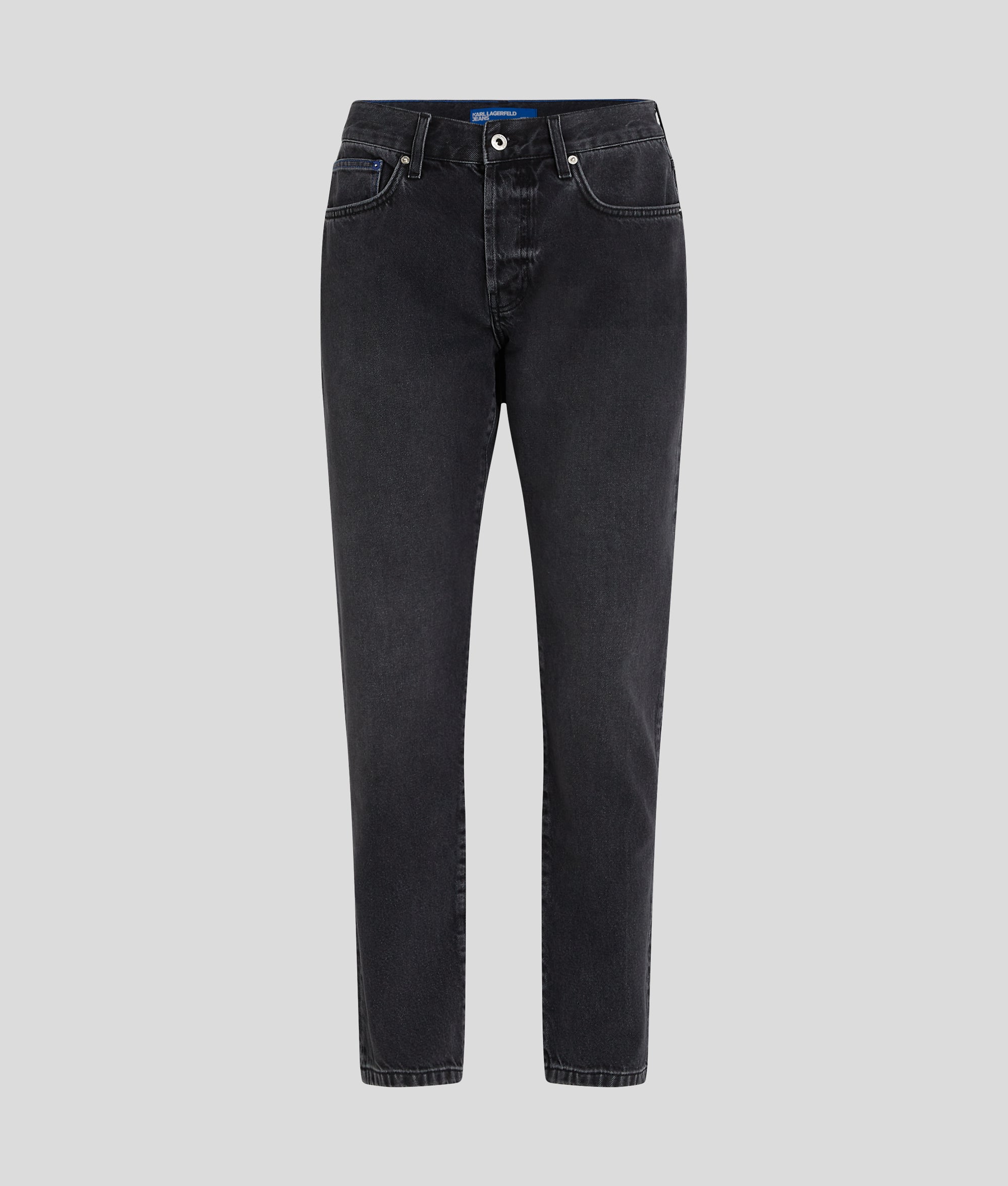 幅広いスタイリングを可能にするテーパードジーンズ。5ポケットのデザインに、KARL LAGERFELD JEANSのシグネチャーレザーパッチとKイニシャルの刺繍がエッジをプラス。