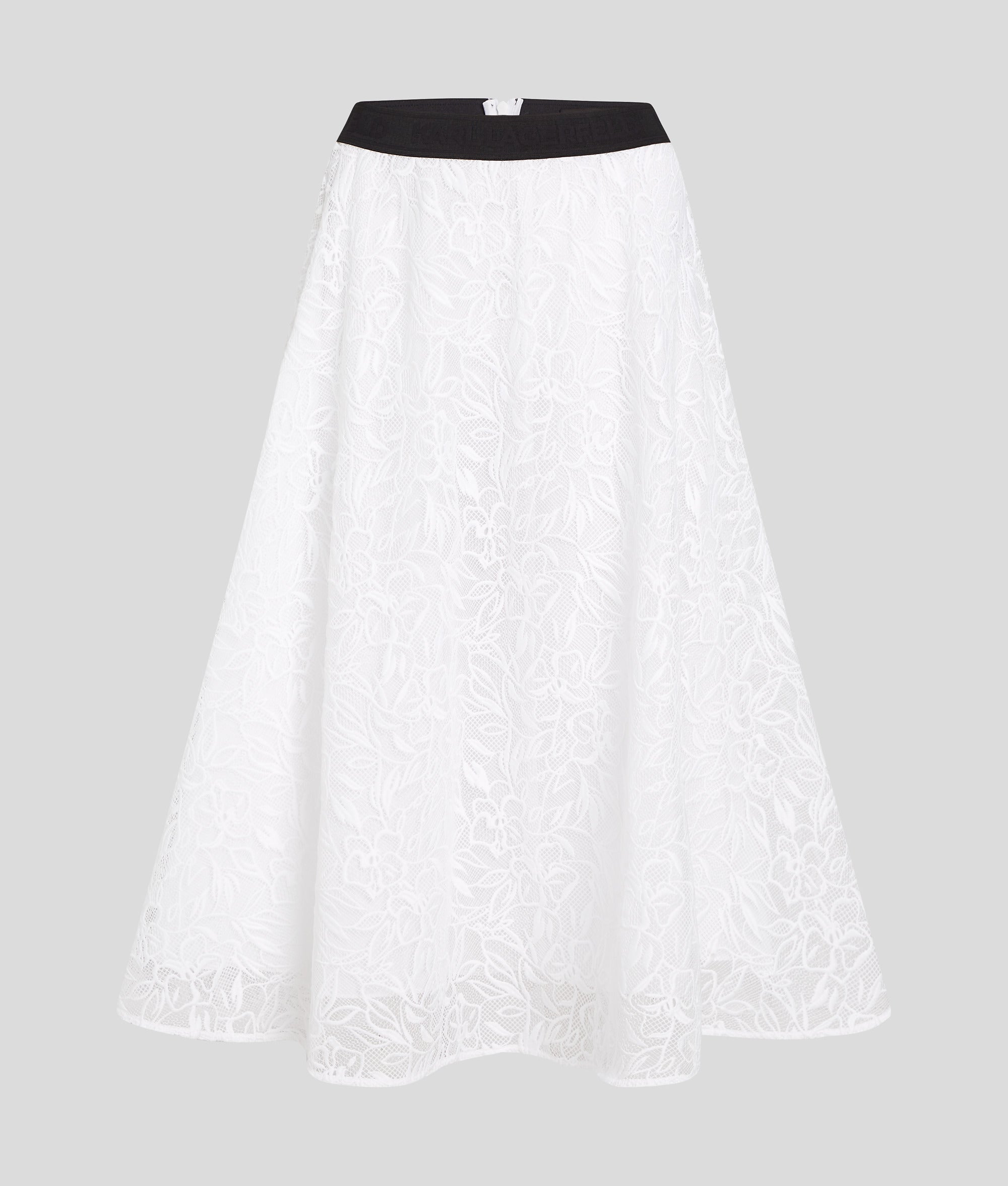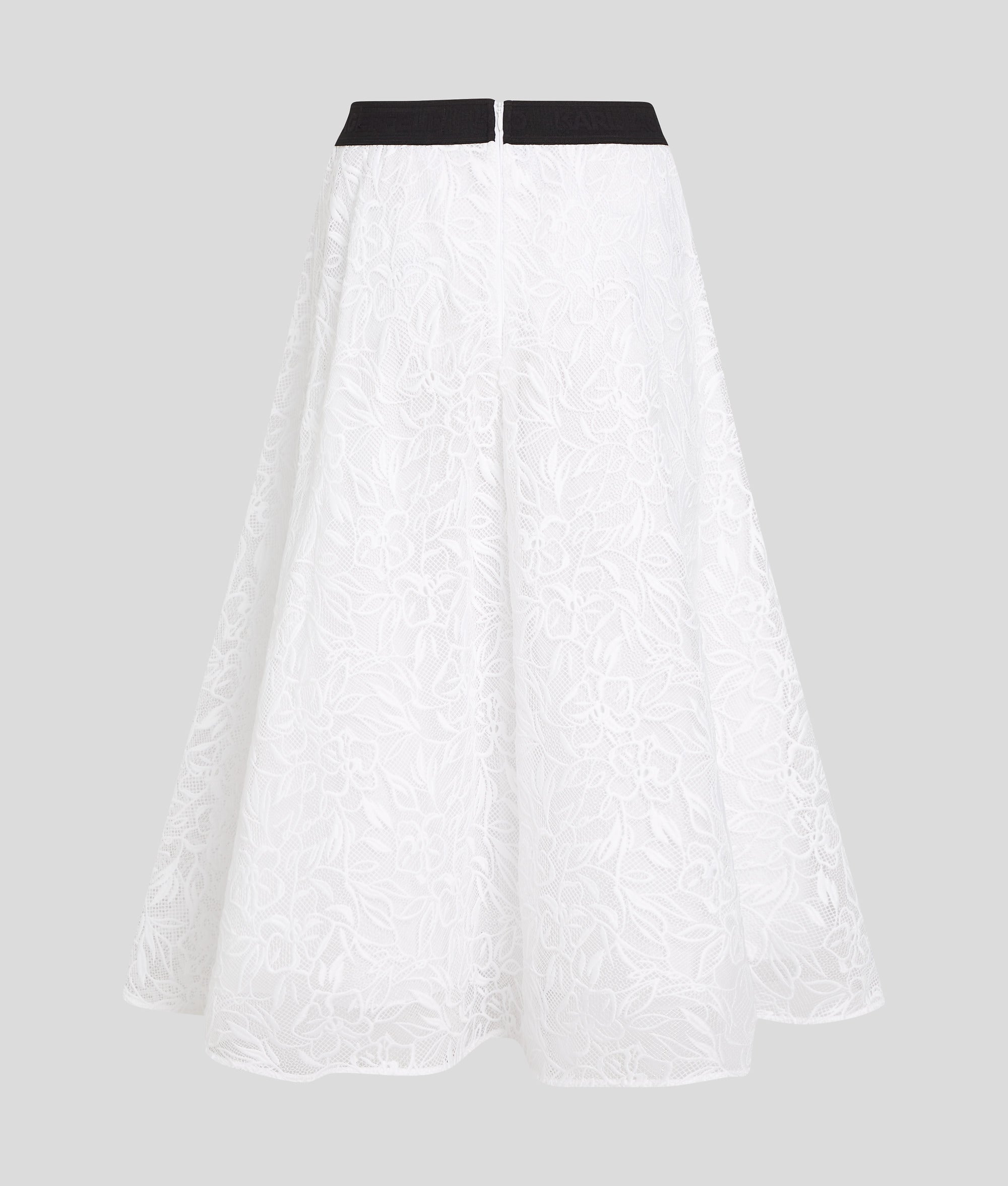 ボリュームのあるAラインのスカートに繊細な蘭の刺繍の装飾。伸縮性のあるウエストにはKARL LAGERFELDのアートワークがさりげなく施され、控えめなファスナー開閉がシームレスなフィット感を実現。ワードローブに加えたいシックなアイテム。