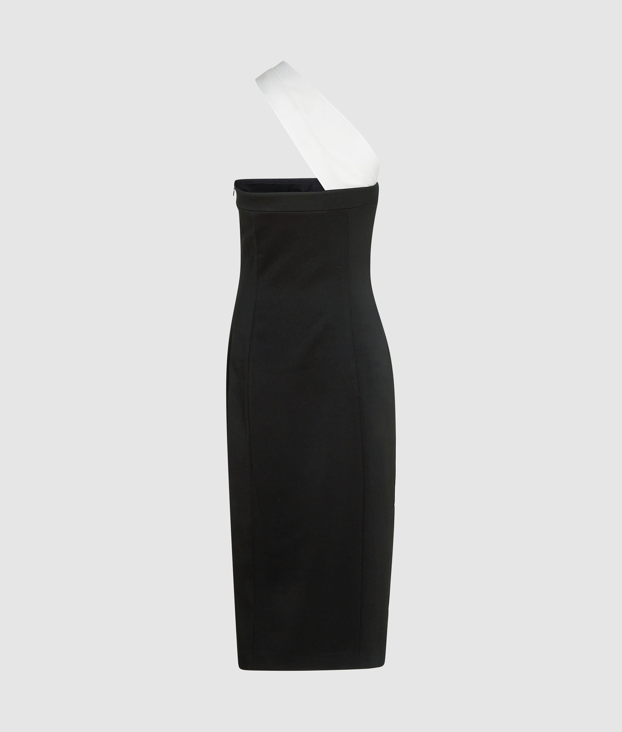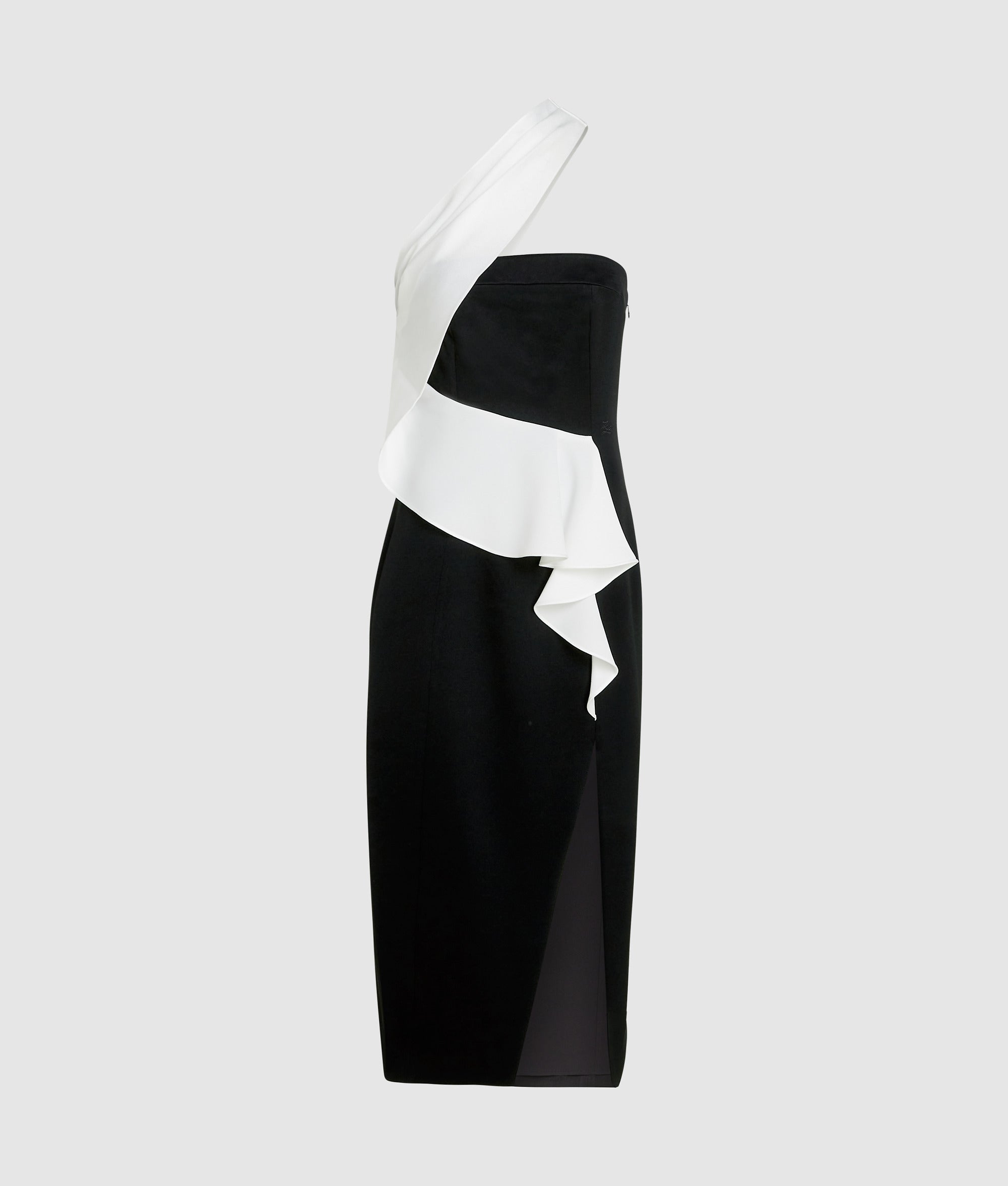ビスチェ風のシルエットでエレガンスを一新させた魅惑的なミディ丈のドレス。コントラストを効かせたワンショルダーとペプラムのディテールがグラフィックな形を作り出し、コンシールファスナーが継ぎ目の見えないすっきりとしたフィット感を実現。