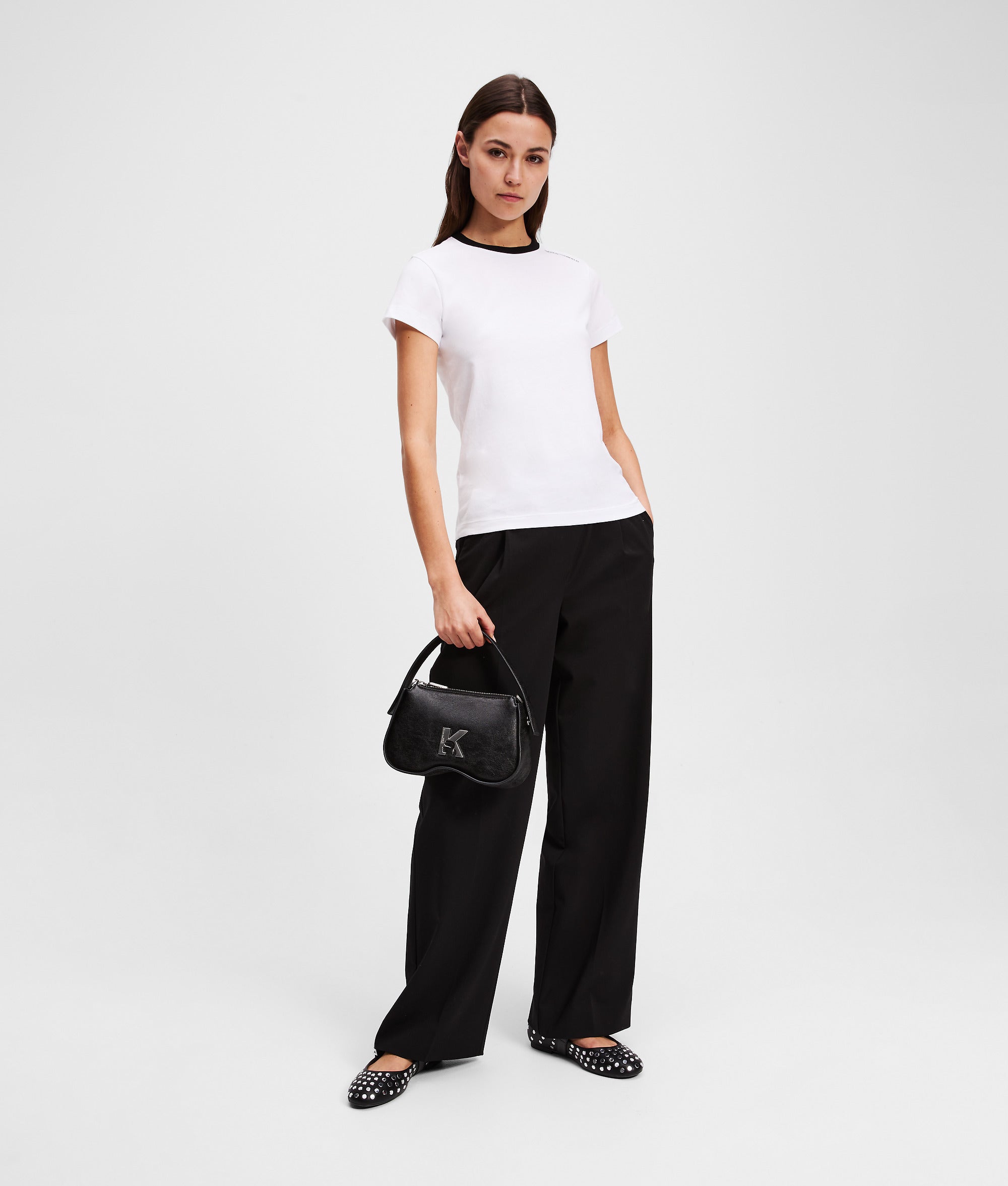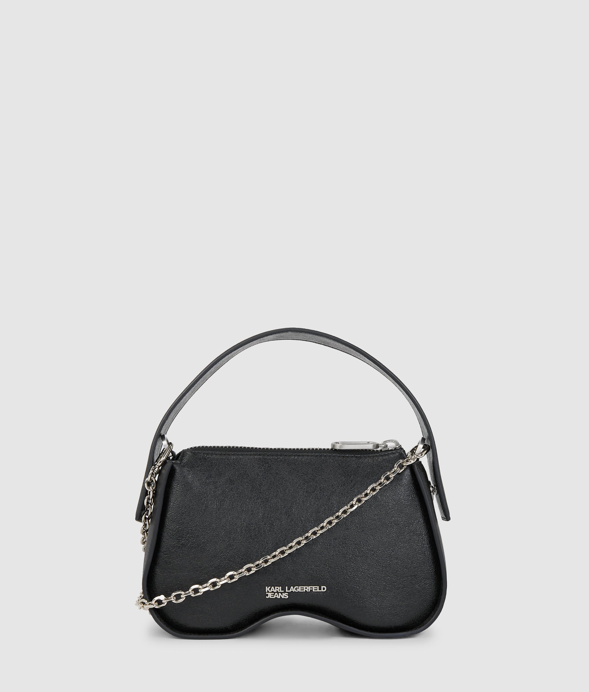 サングラス風のユニークなシルエットで遊び心あふれるデザインのエッセンスを取り入れた、驚くほど美しいトップハンドルのバッグが登場。トップファスナー開閉で持ち物の安全性を確保し、さまざまな使い方ができるトップハンドルとチェーンのクロスボディストラップで、簡単にスタイリングを楽しめます。正面には大胆なKのロゴ金具、背面にはすっきりとしたKARL LAGERFELD JEANSのロゴをあしらったバッグは、あらゆるシーンで活躍する存在感のあるアイテム。