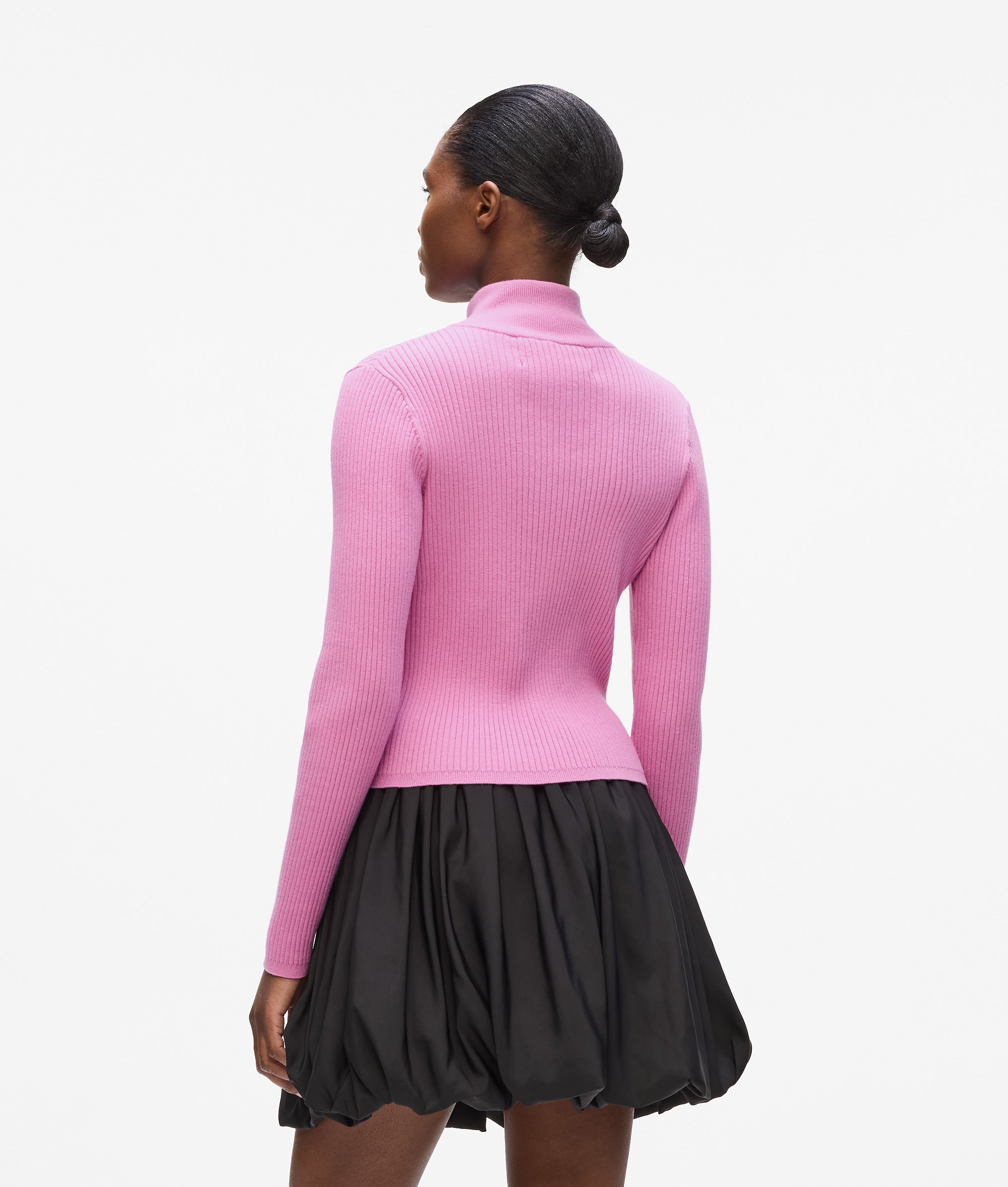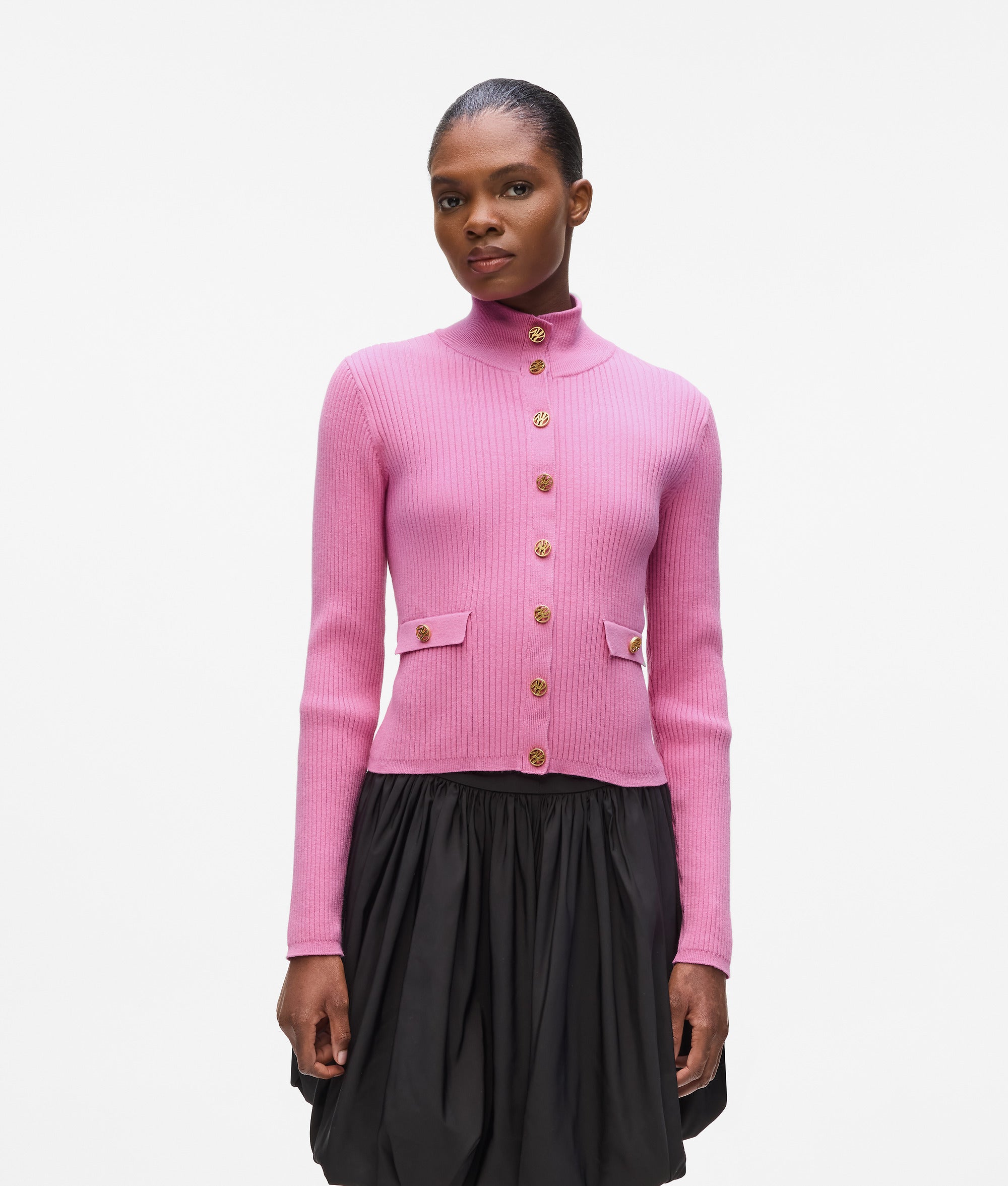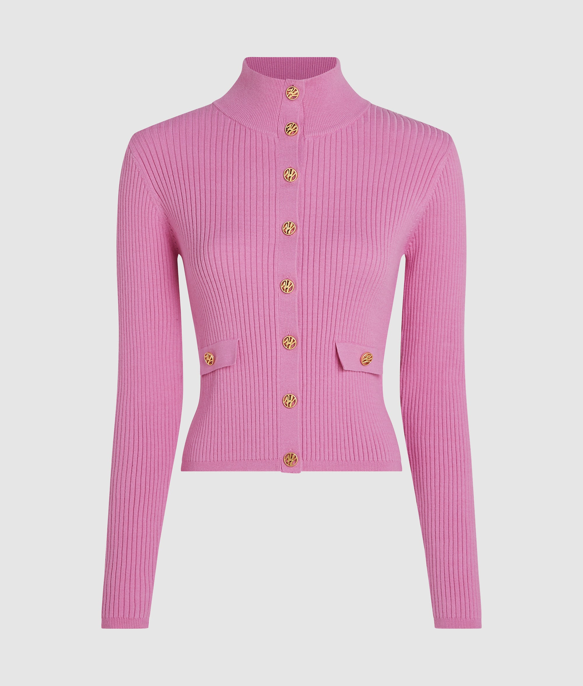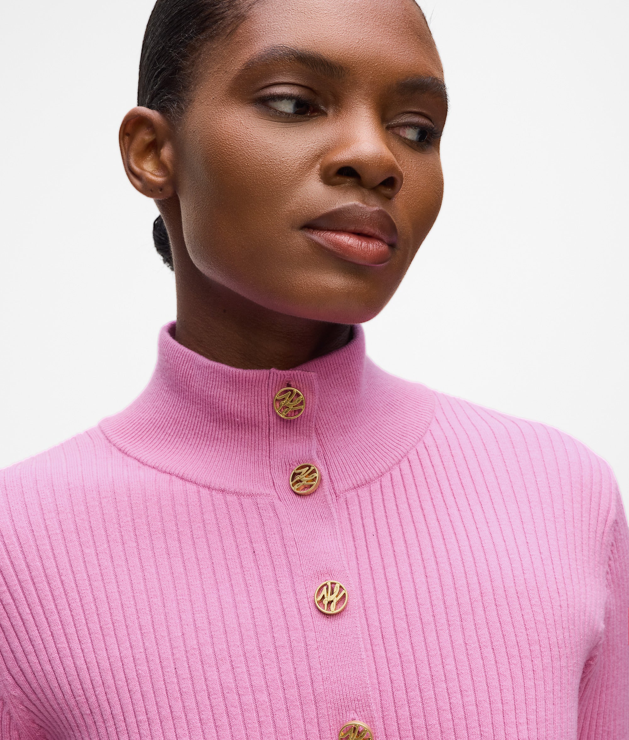 すっきりとしたタートルネックとゴールド系のボタンが特徴のカーディガン。すべての冬のワードローブに加えたいとてもシックなアイテム。ボタンを留めて着用すれば、美しいシルエットが強調される一枚。